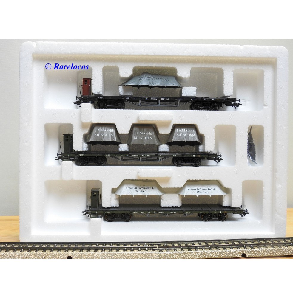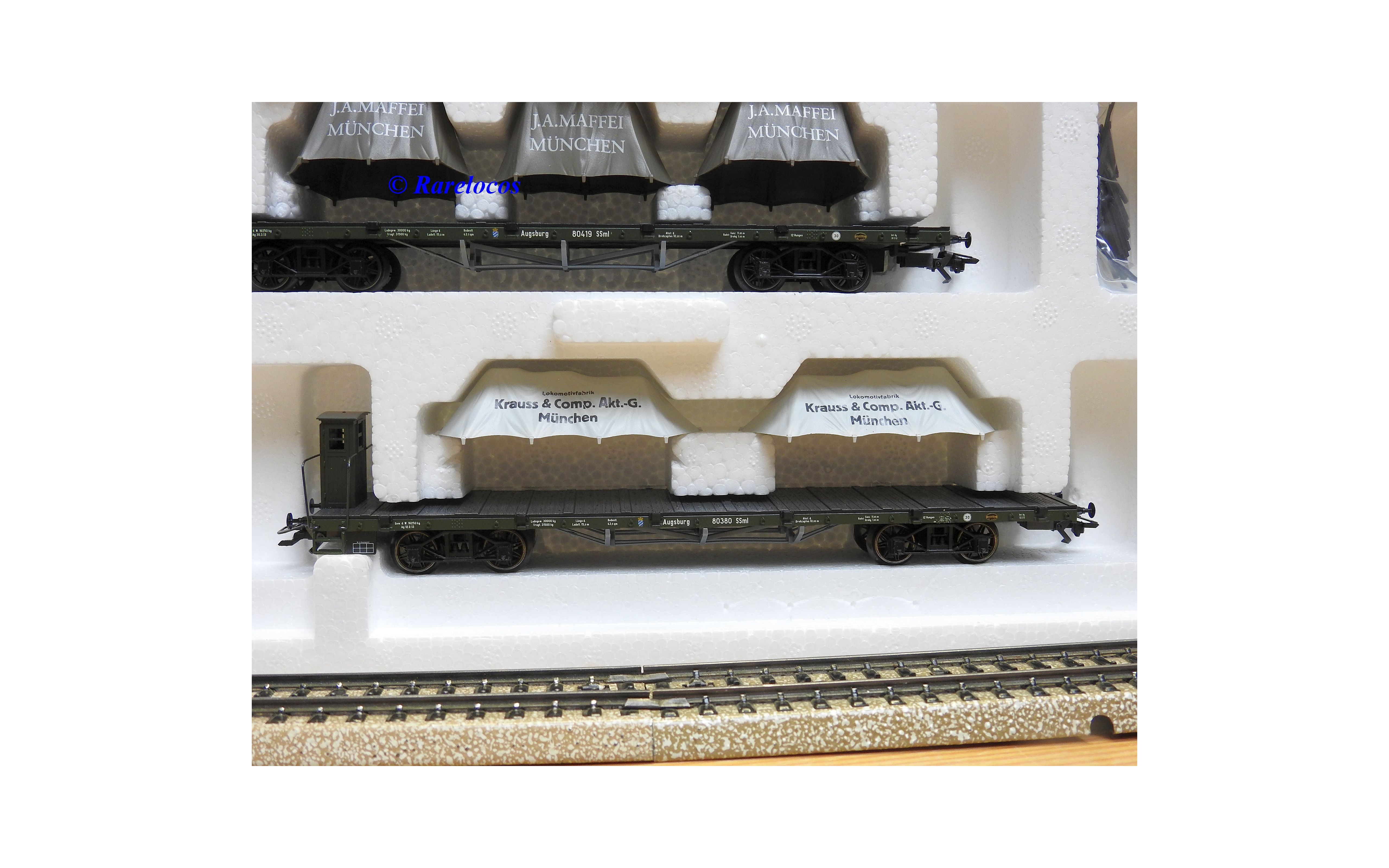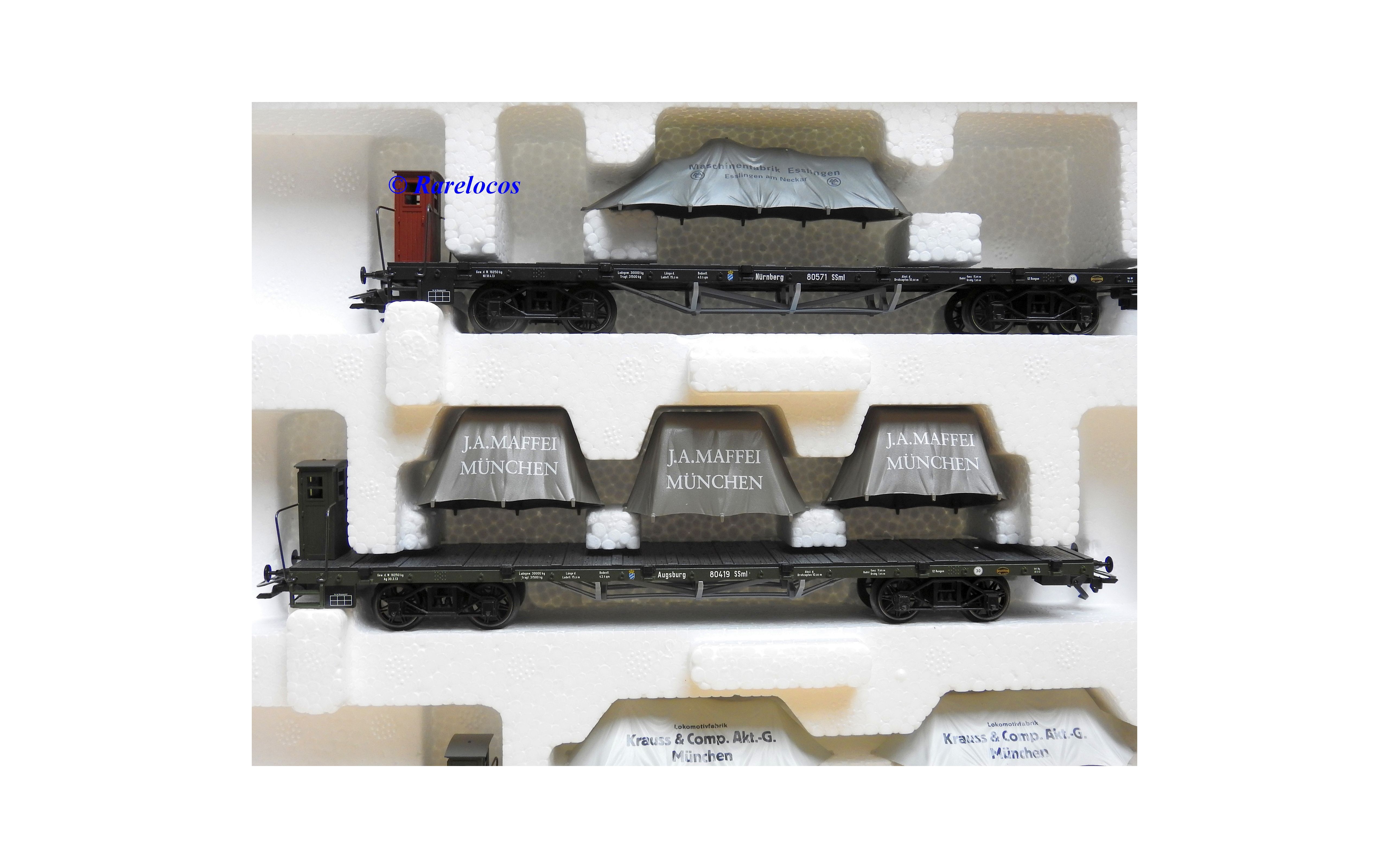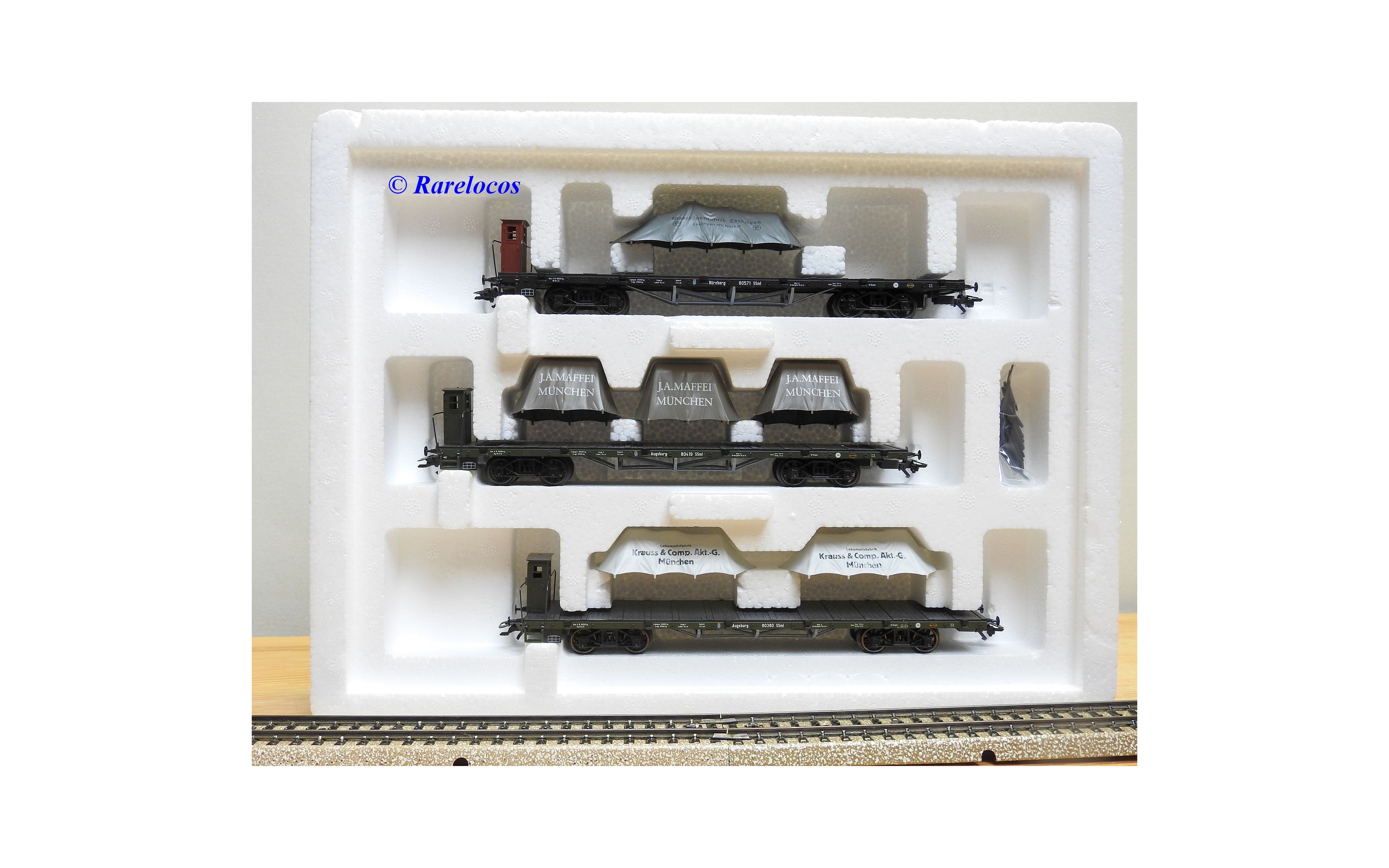 Coffret représentant une rame de transport de pièces de locomotives de 3 wagons plats à ranchers doubles type Ssml des chemins de fer allemands ( K.B.Sts.B.: chemins de fer bavarois ), attelages à élongation, marquages des bâches : Krauss & Comp., Lokomotivfabrik Esslingen et J.A. Maffei, immatriculations différentes, boîte d'origine en bon état.