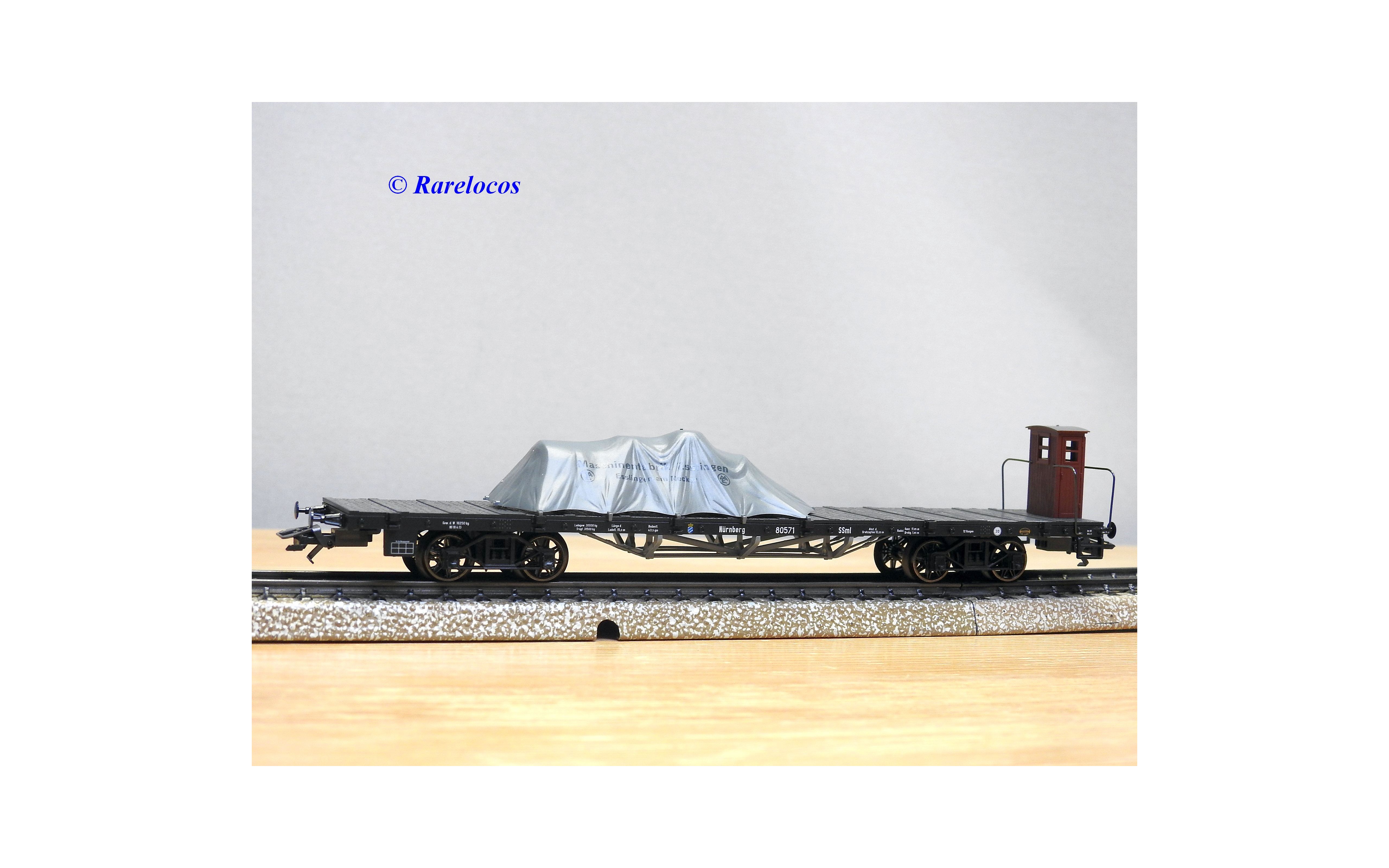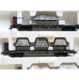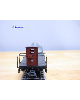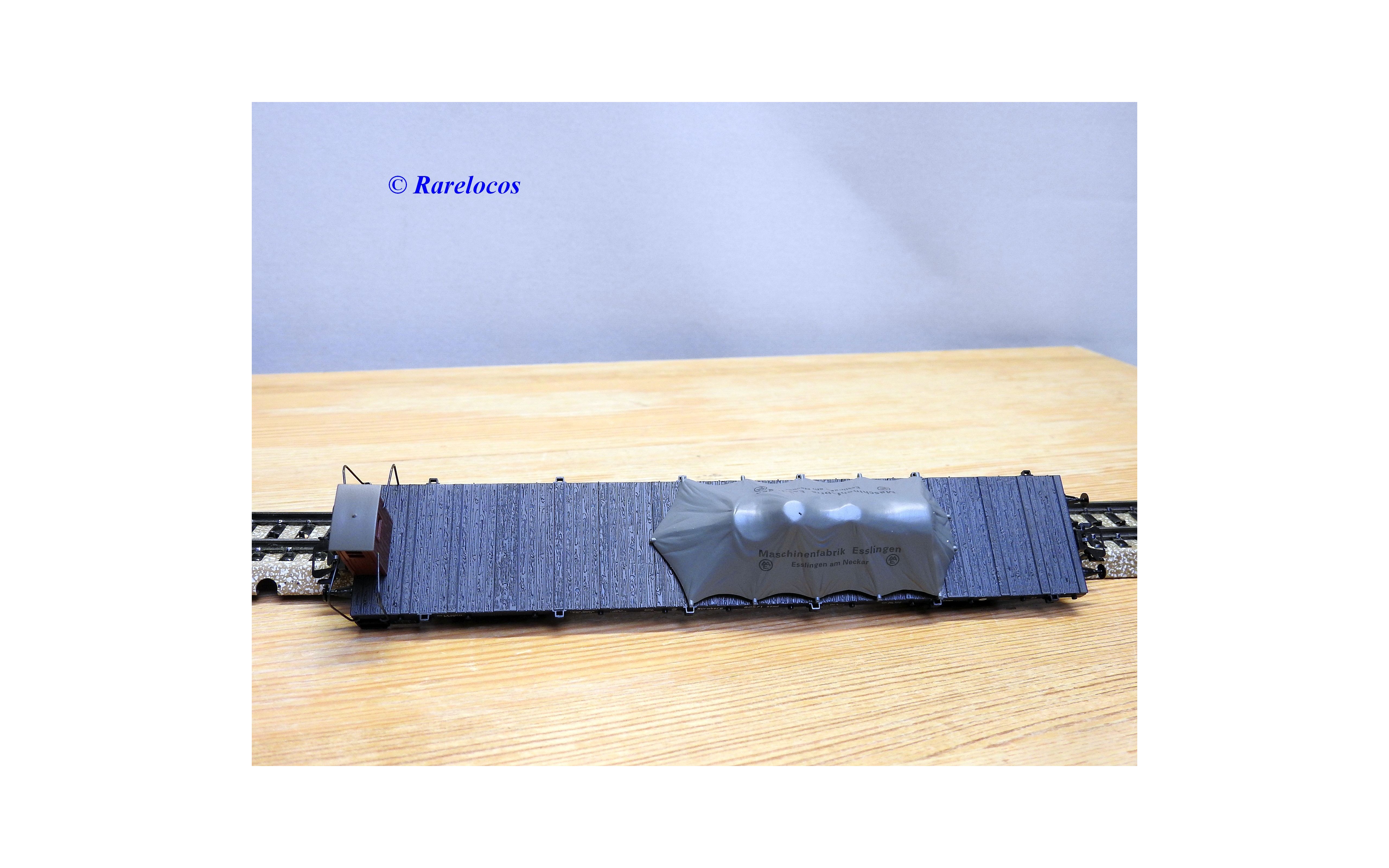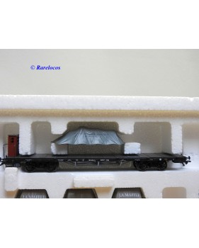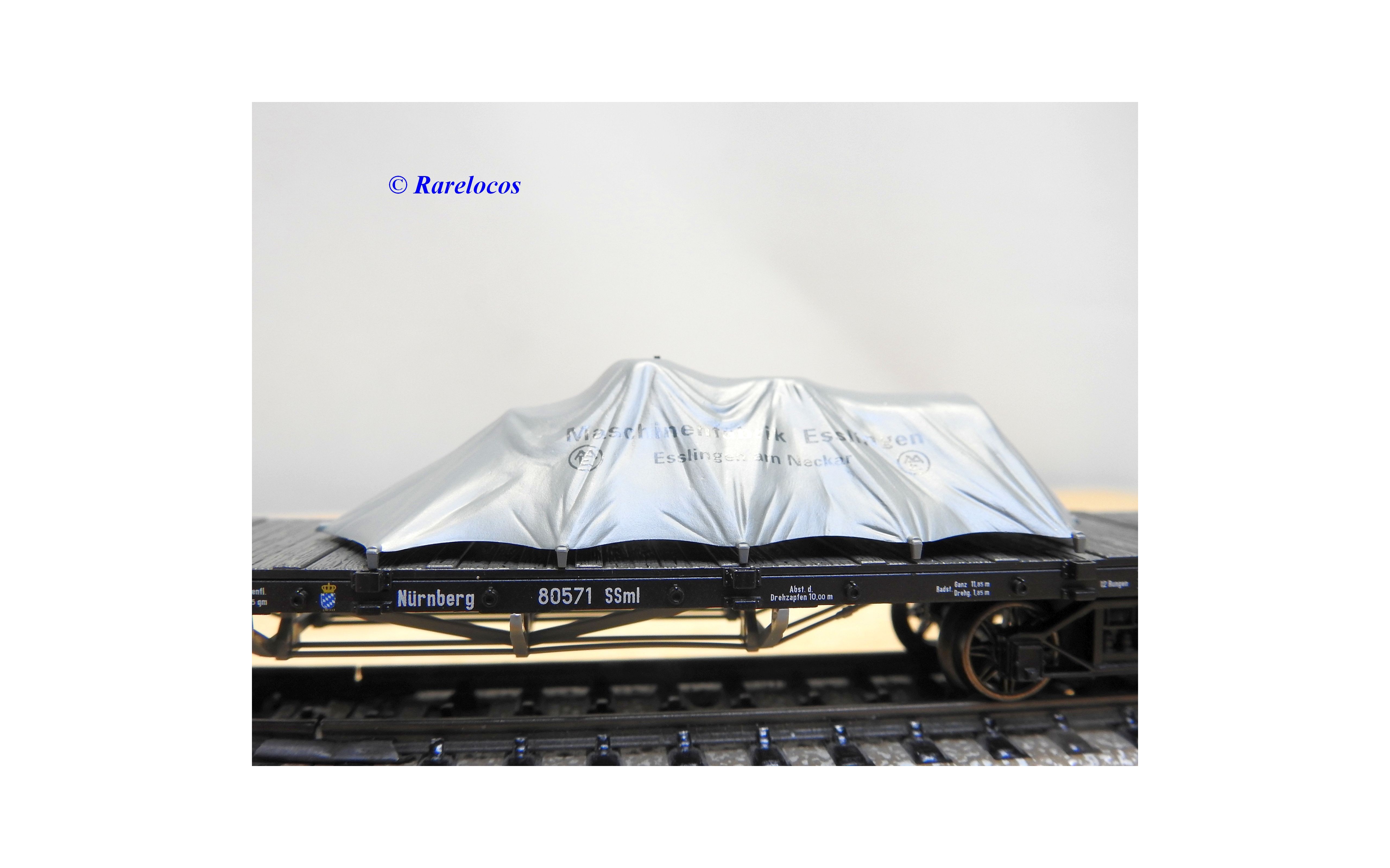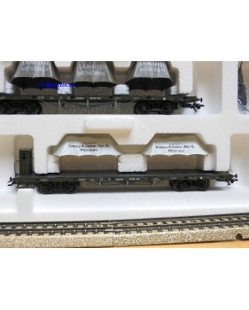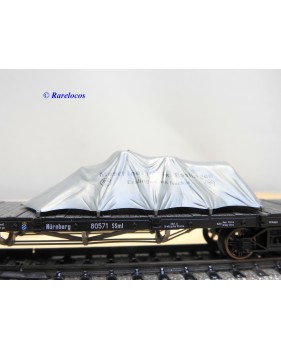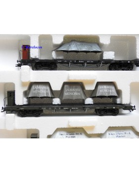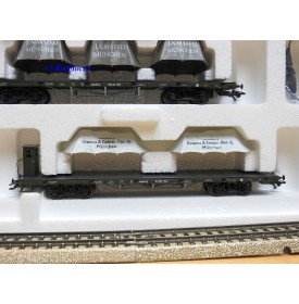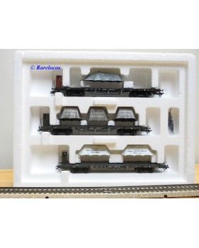 Coffret représentant une rame de transport de pièces de locomotives de 3 wagons plats à ranchers doubles type Ssml des chemins de fer allemands ( K.B.Sts.B.: chemins de fer bavarois ), attelages à élongation, marquages des bâches : Krauss & Comp., Lokomotivfabrik Esslingen et J.A. Maffei, immatriculations différentes, boîte d'origine en bon état.