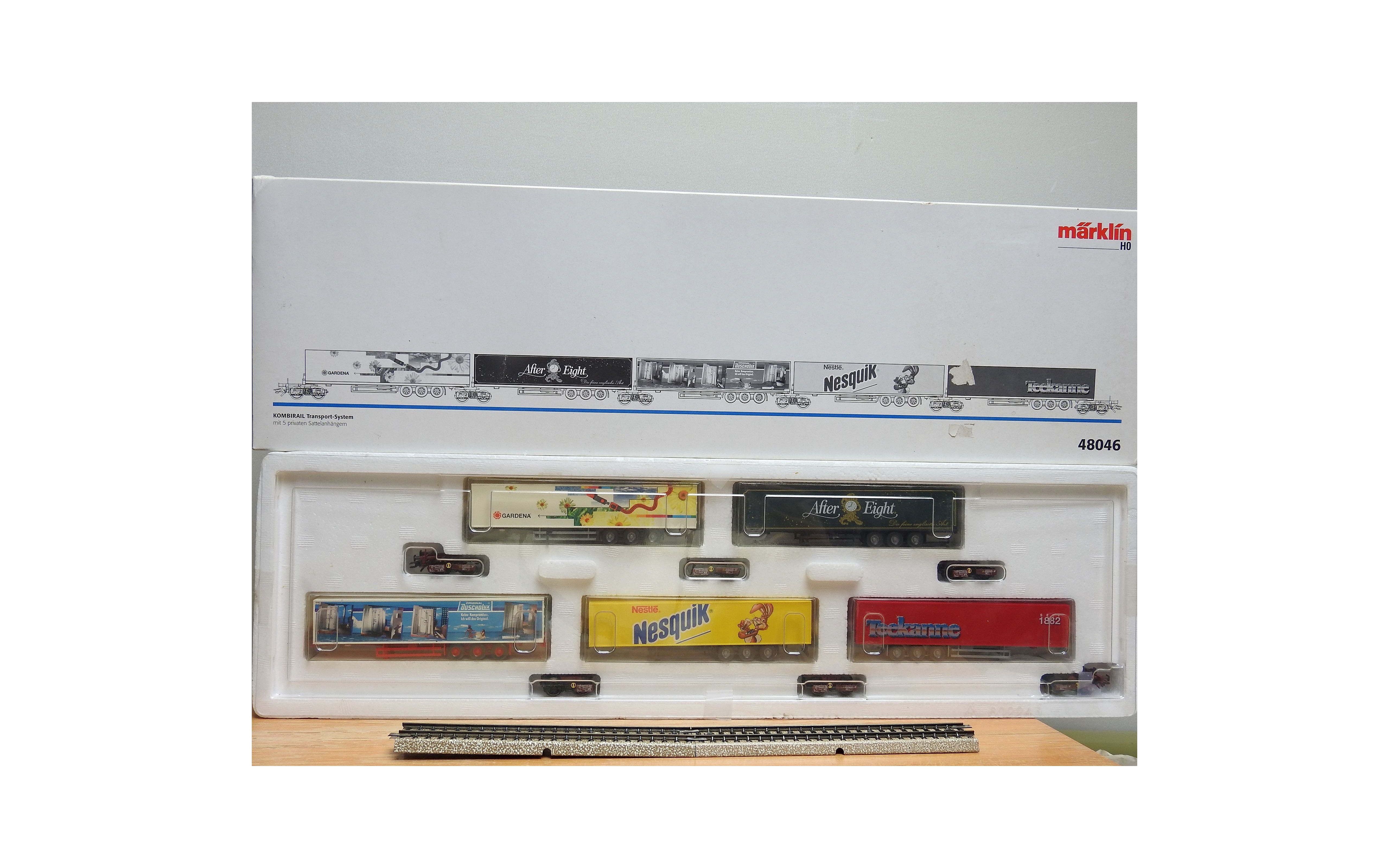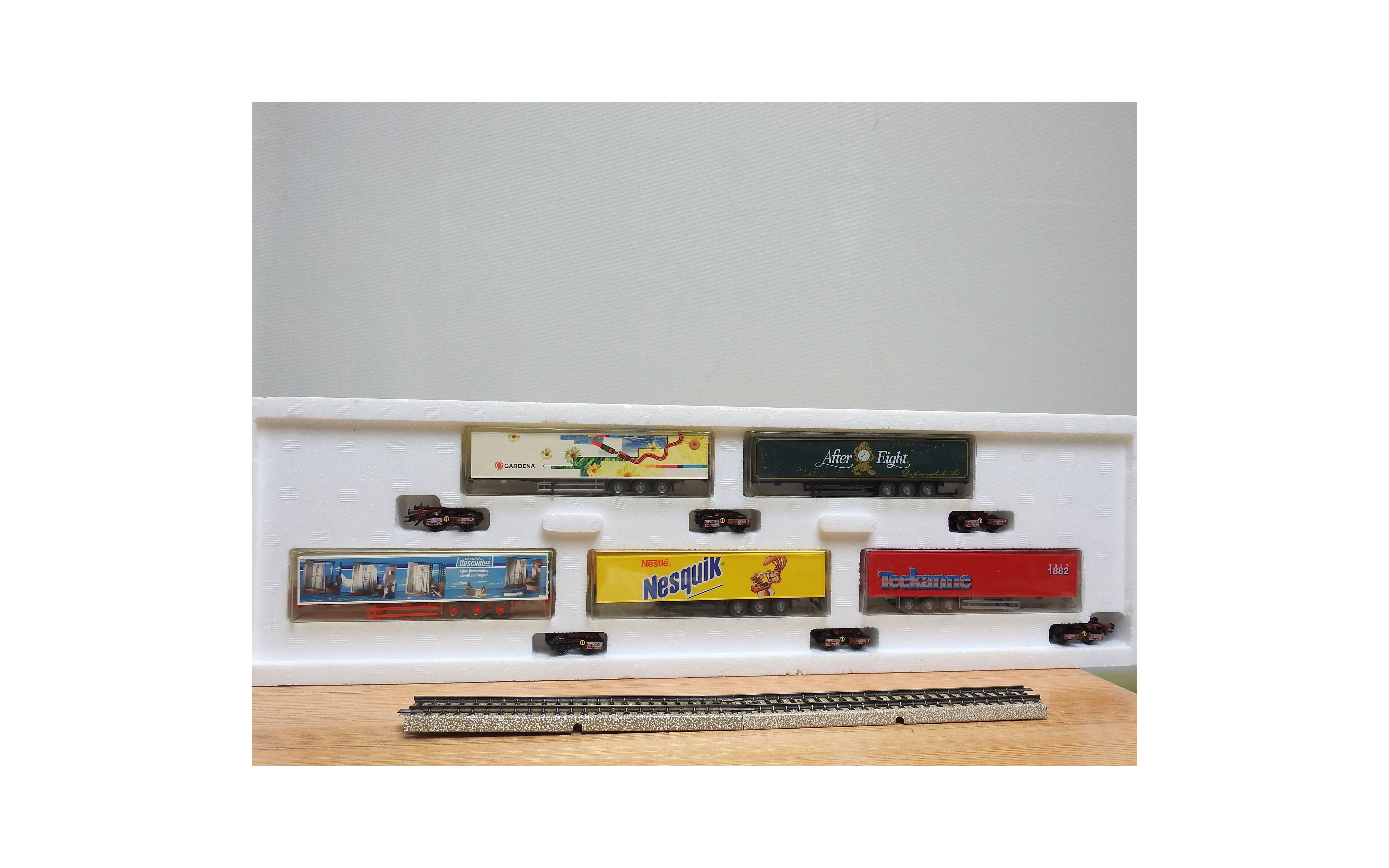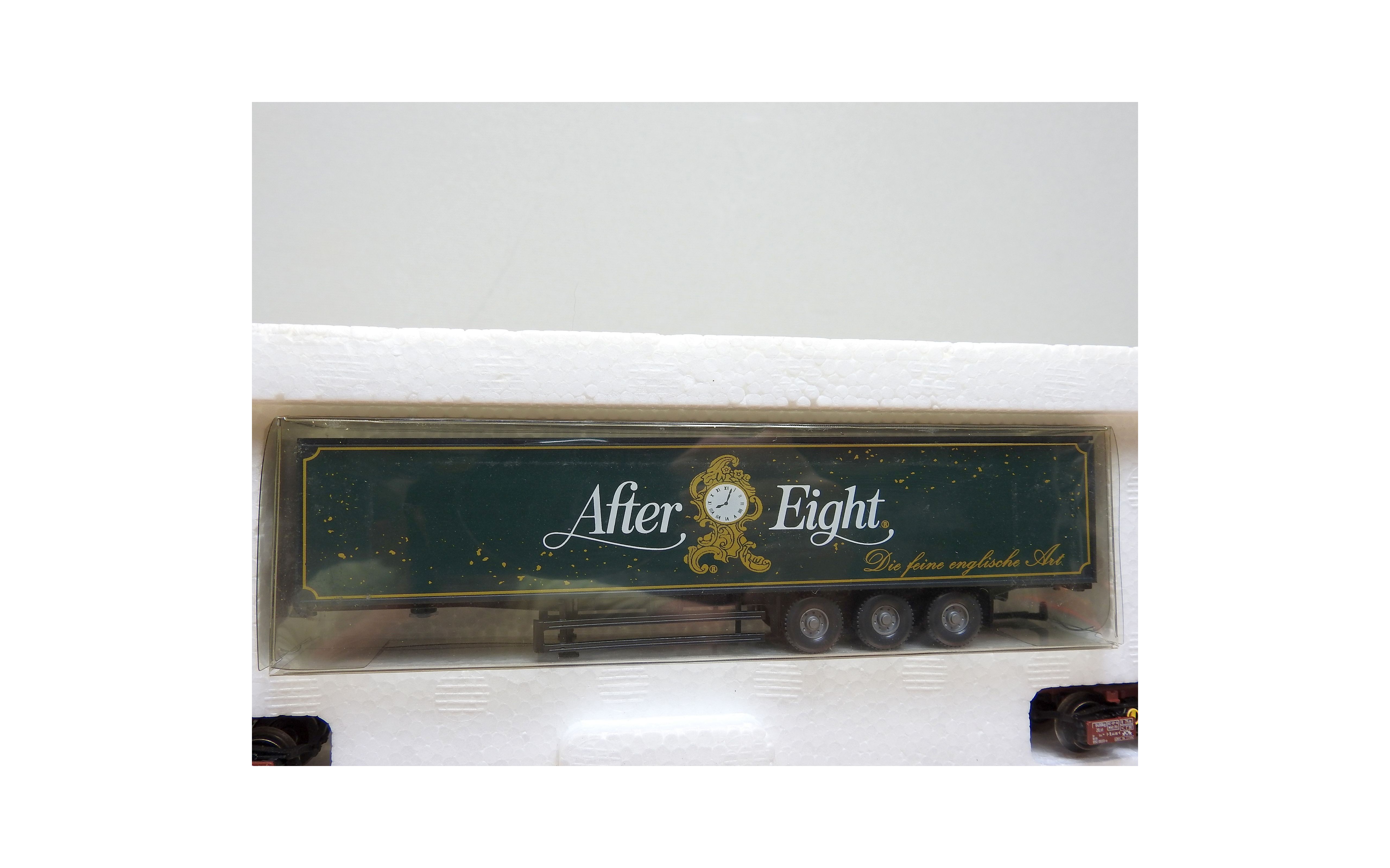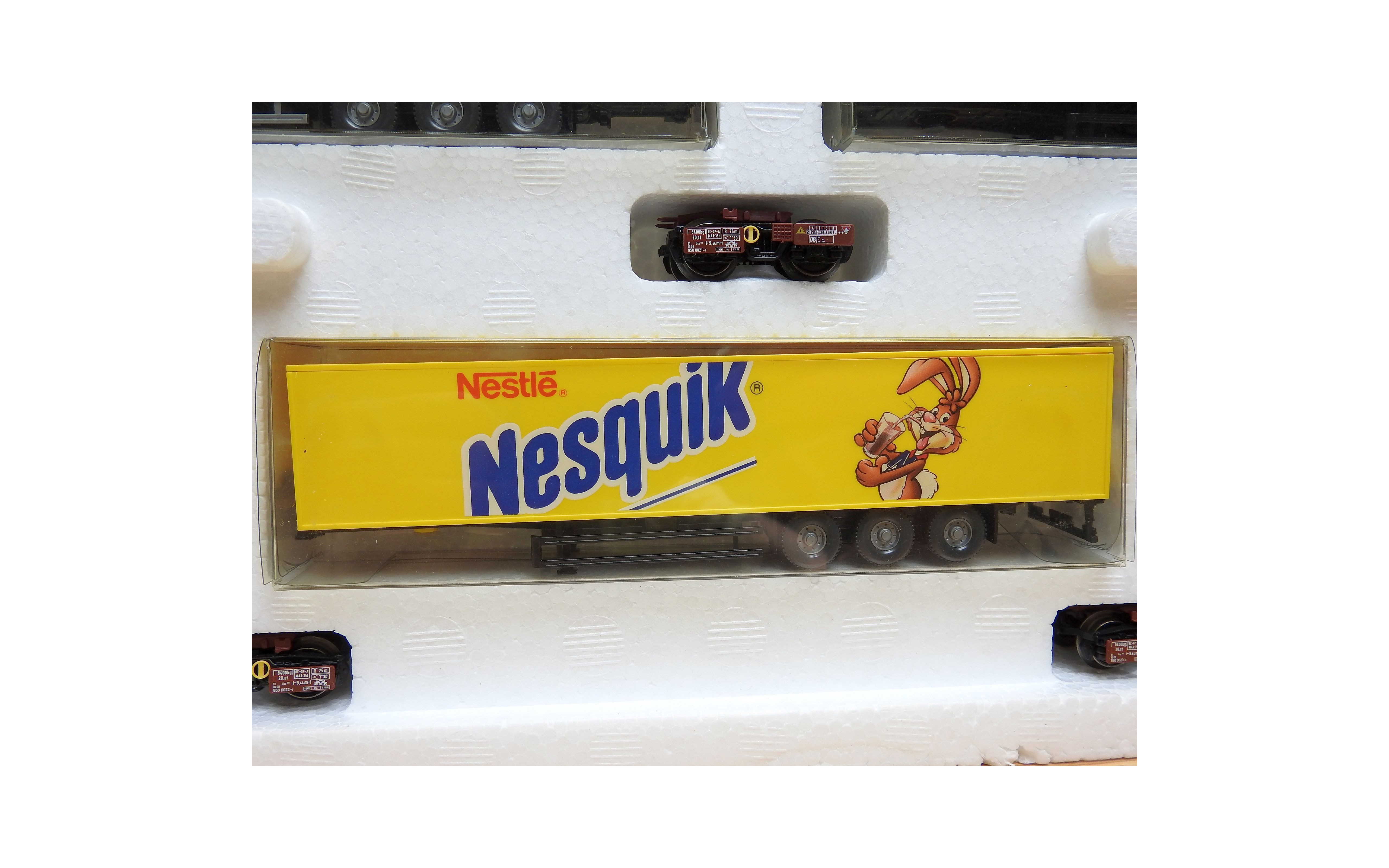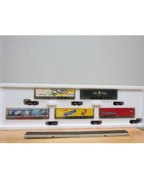 Coffret de 6 bogies et 5 semi remorques type Us 676 des chemins de fer allemands ( DB - AG ), livrée aux couleurs de AFTER EIGHT, GARDENA, DUSCHOLUX, NESQUIK et TEEKANNE, boîte d'origine en très bon état.