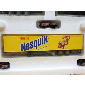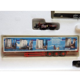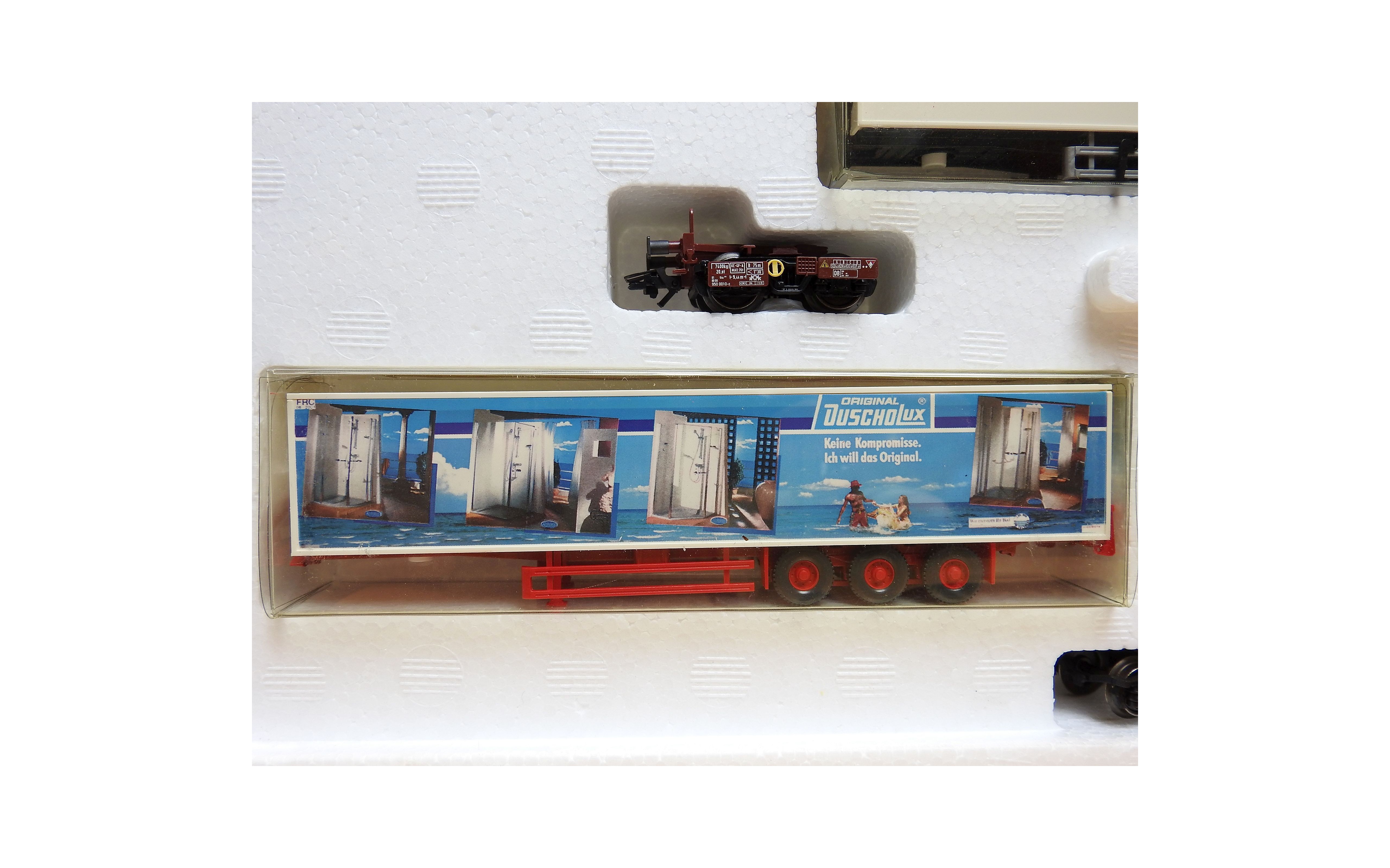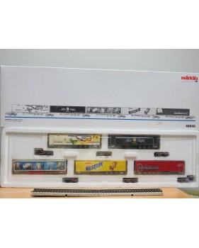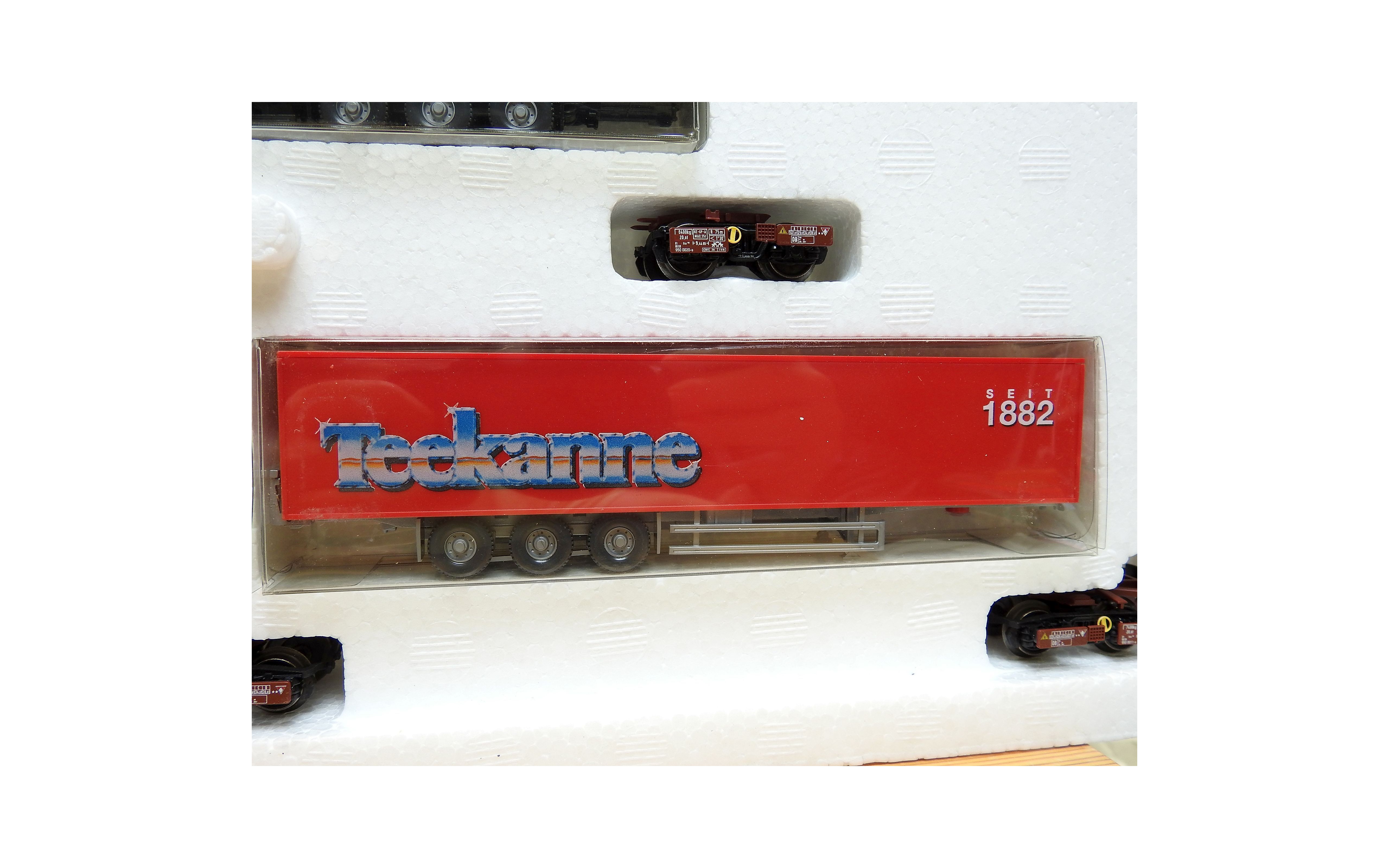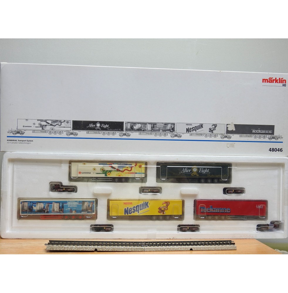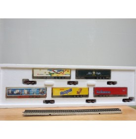 Coffret de 6 bogies et 5 semi remorques type Us 676 des chemins de fer allemands ( DB - AG ), livrée aux couleurs de AFTER EIGHT, GARDENA, DUSCHOLUX, NESQUIK et TEEKANNE, boîte d'origine en très bon état.
