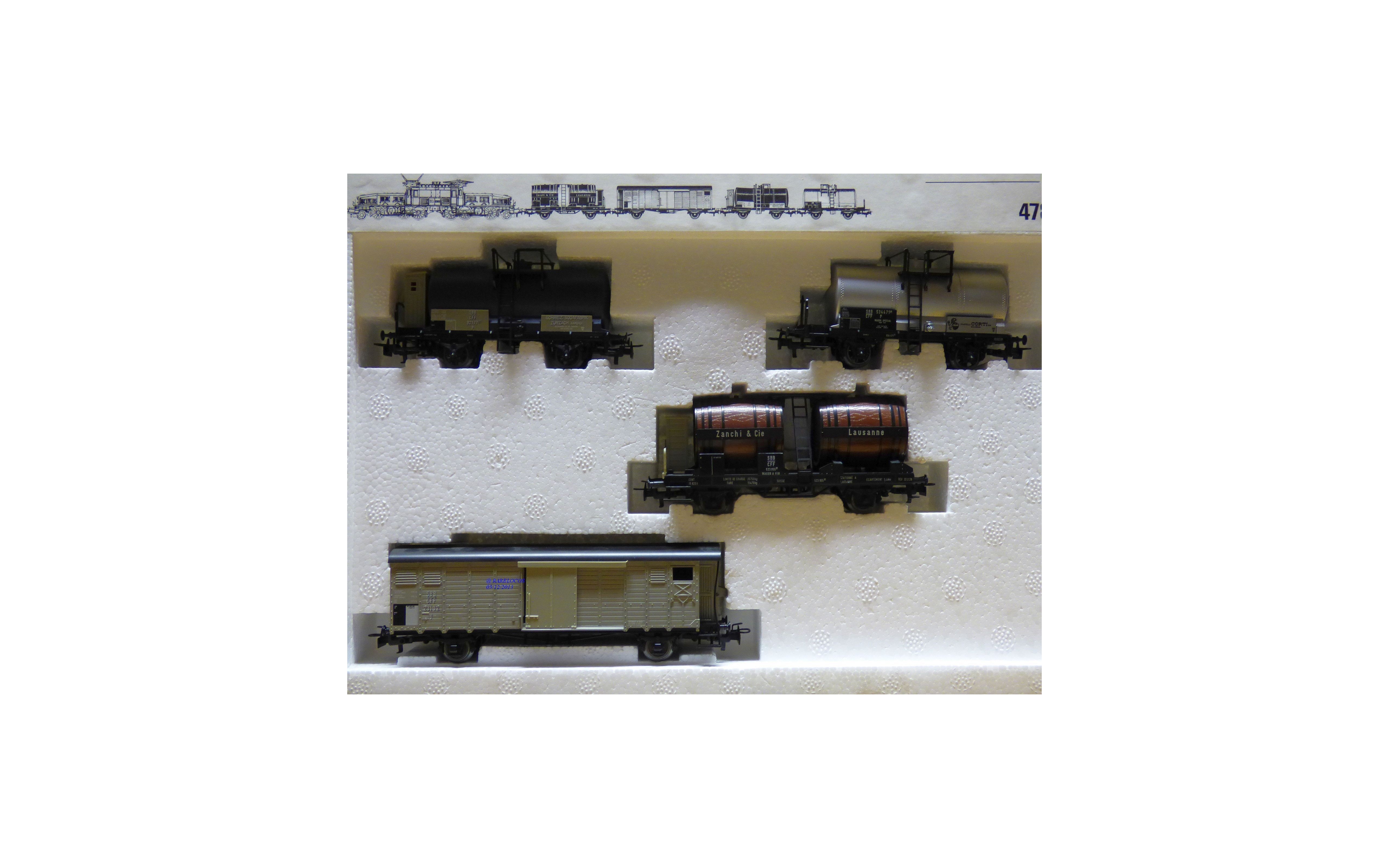 Coffret de 4 wagons Oldtimer des chemins de fer suisses ( SBB/CFF/FFS ), attelages à élongation, boîte d'origine en très bon état.