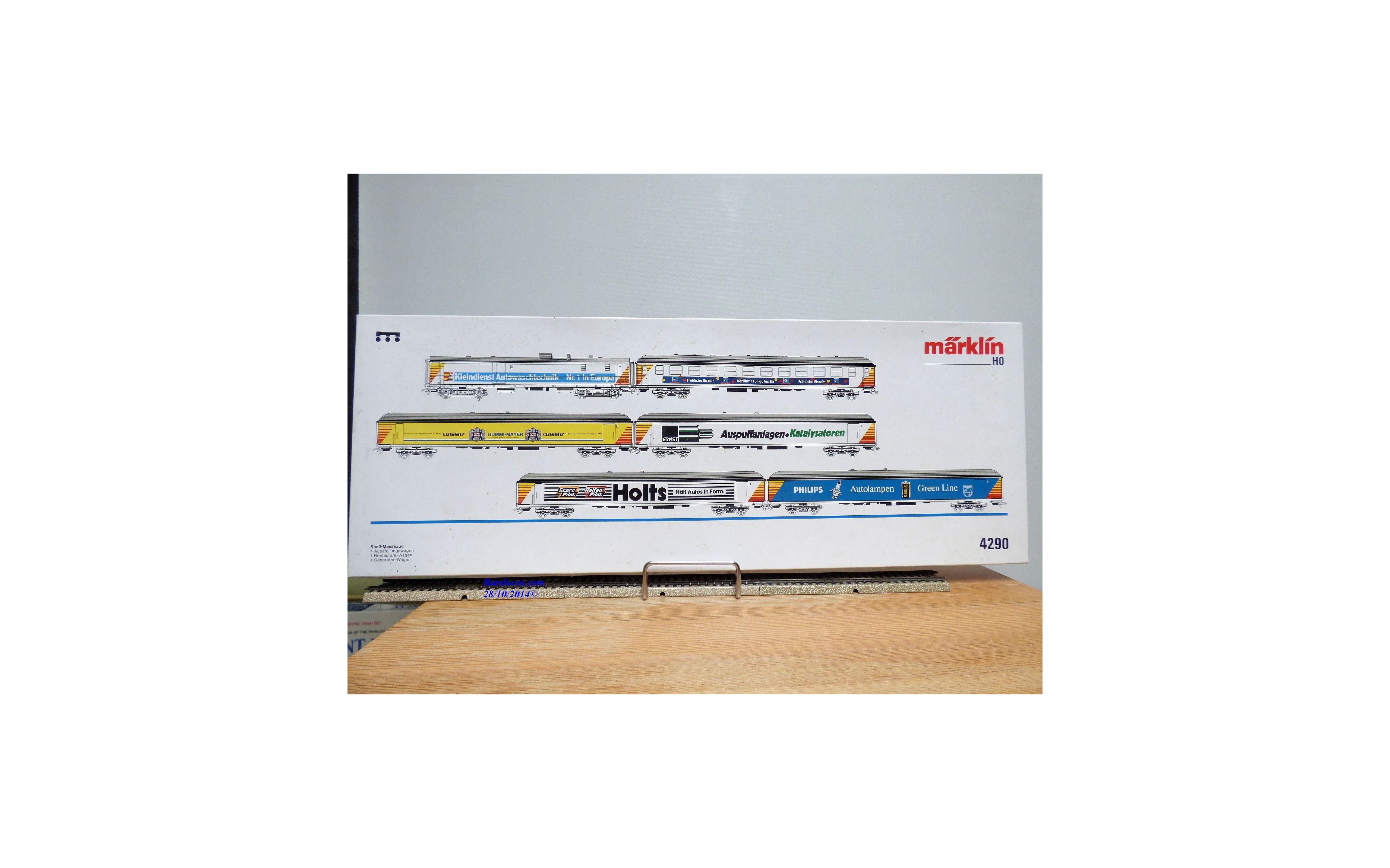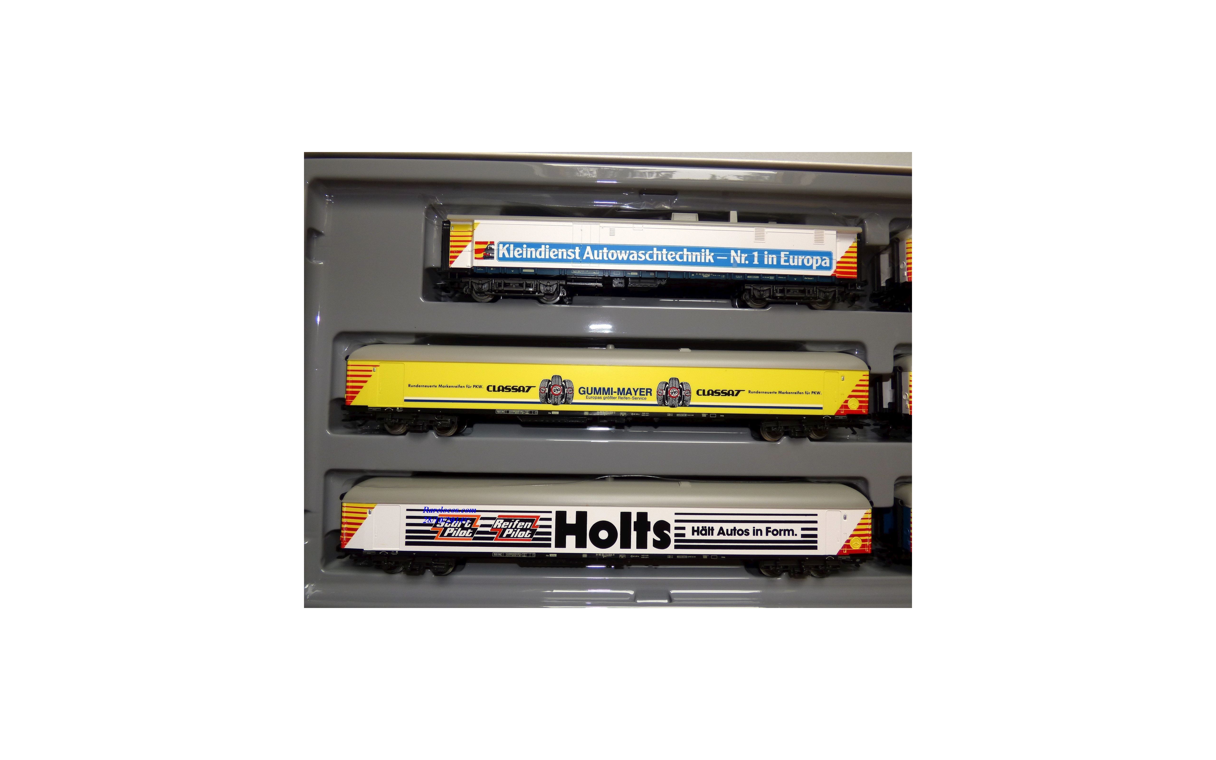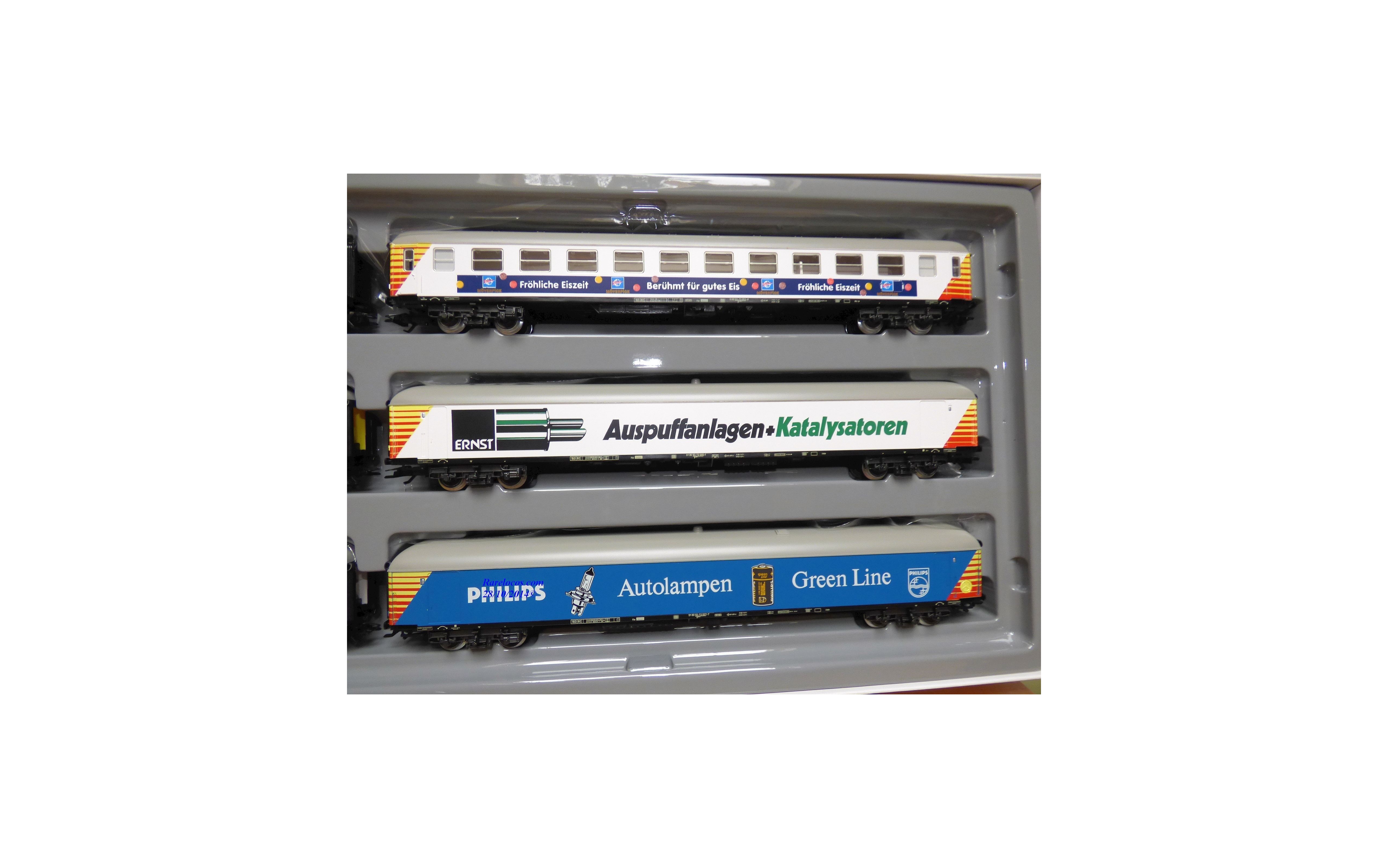 Coffret représentant une rame publicitaire ( SHELL Messezug ) de 5 wagons et 1 voiture des chemins de fer allemands à bogies ( DB ), emballage d'origine en excellent état .