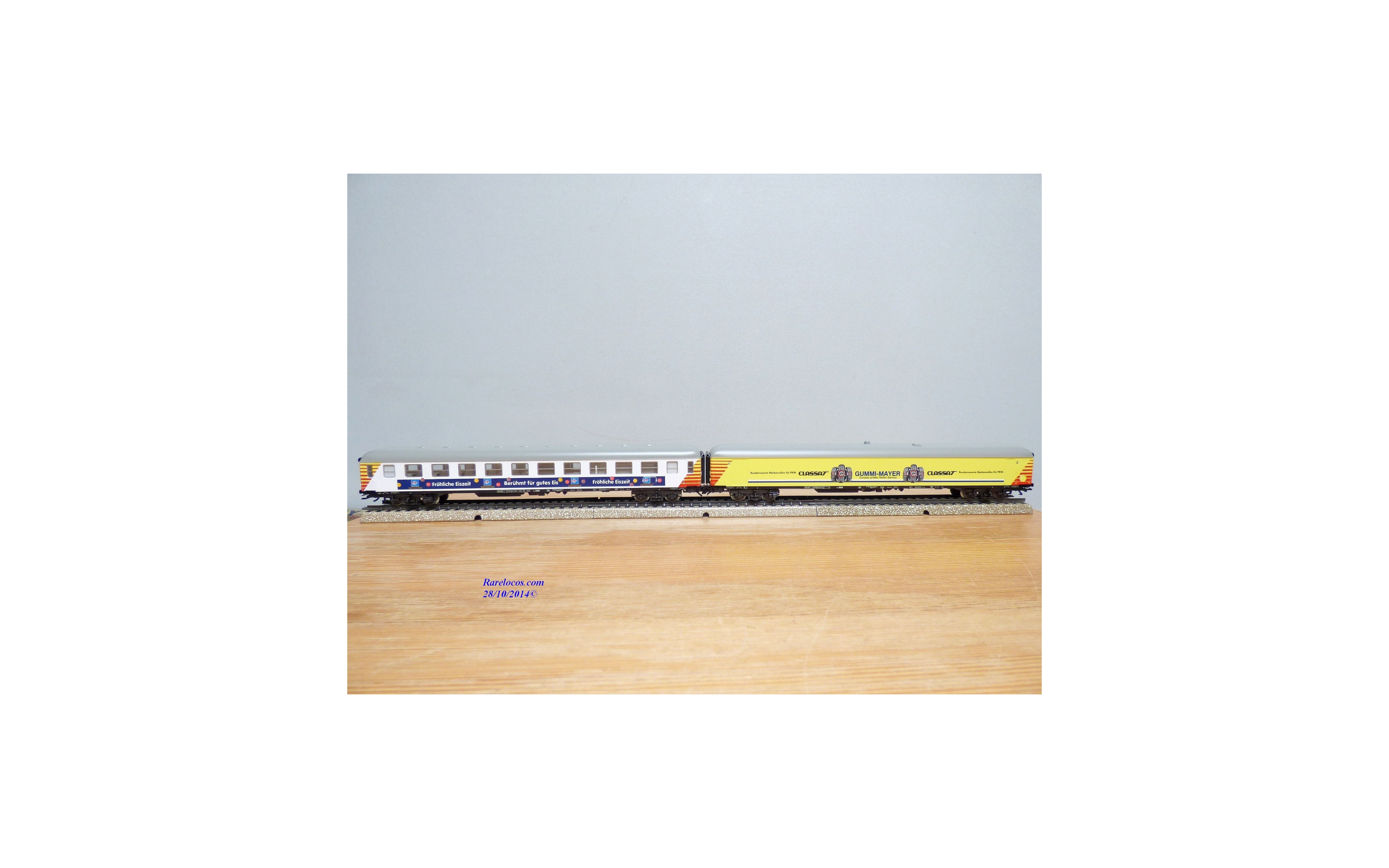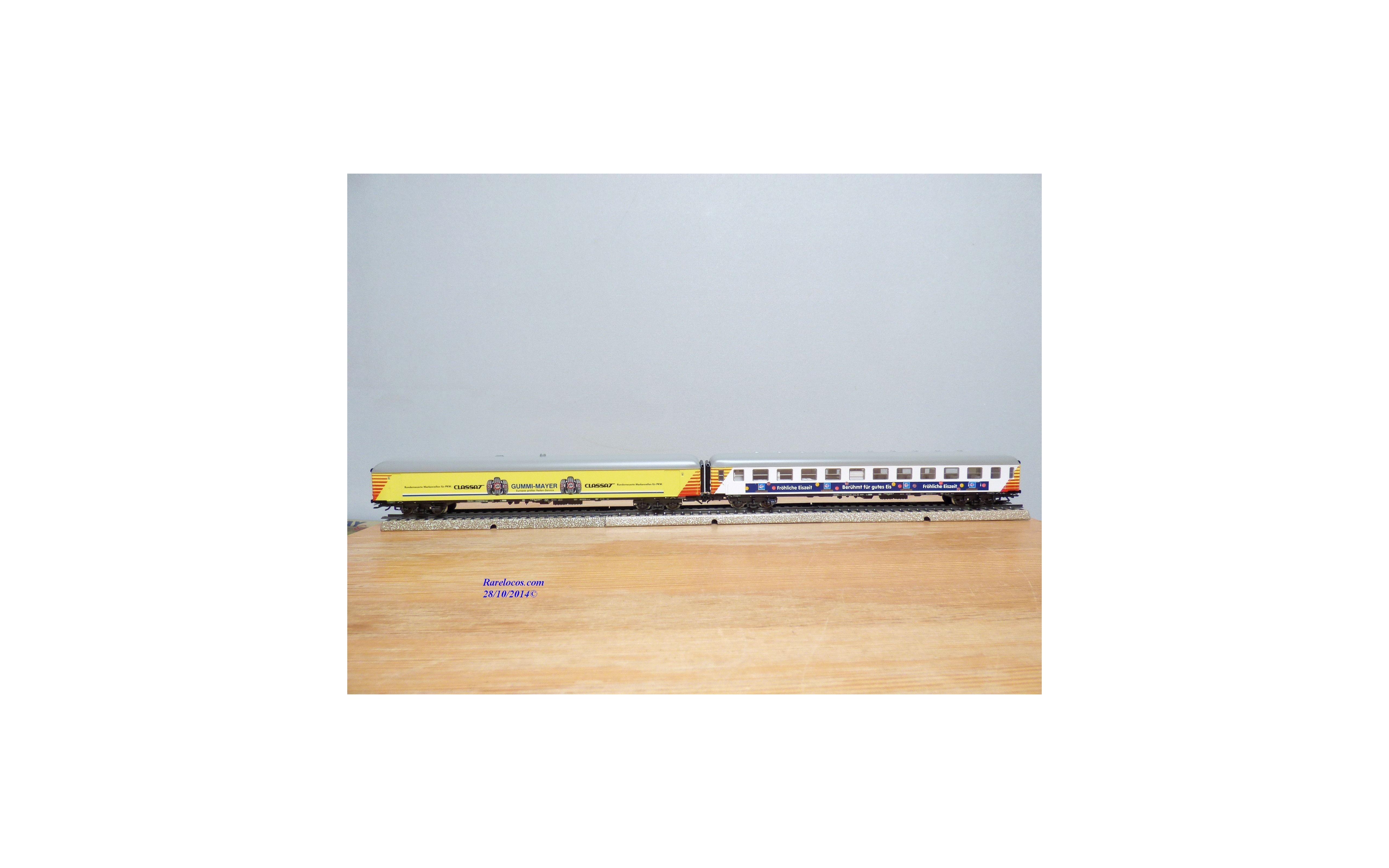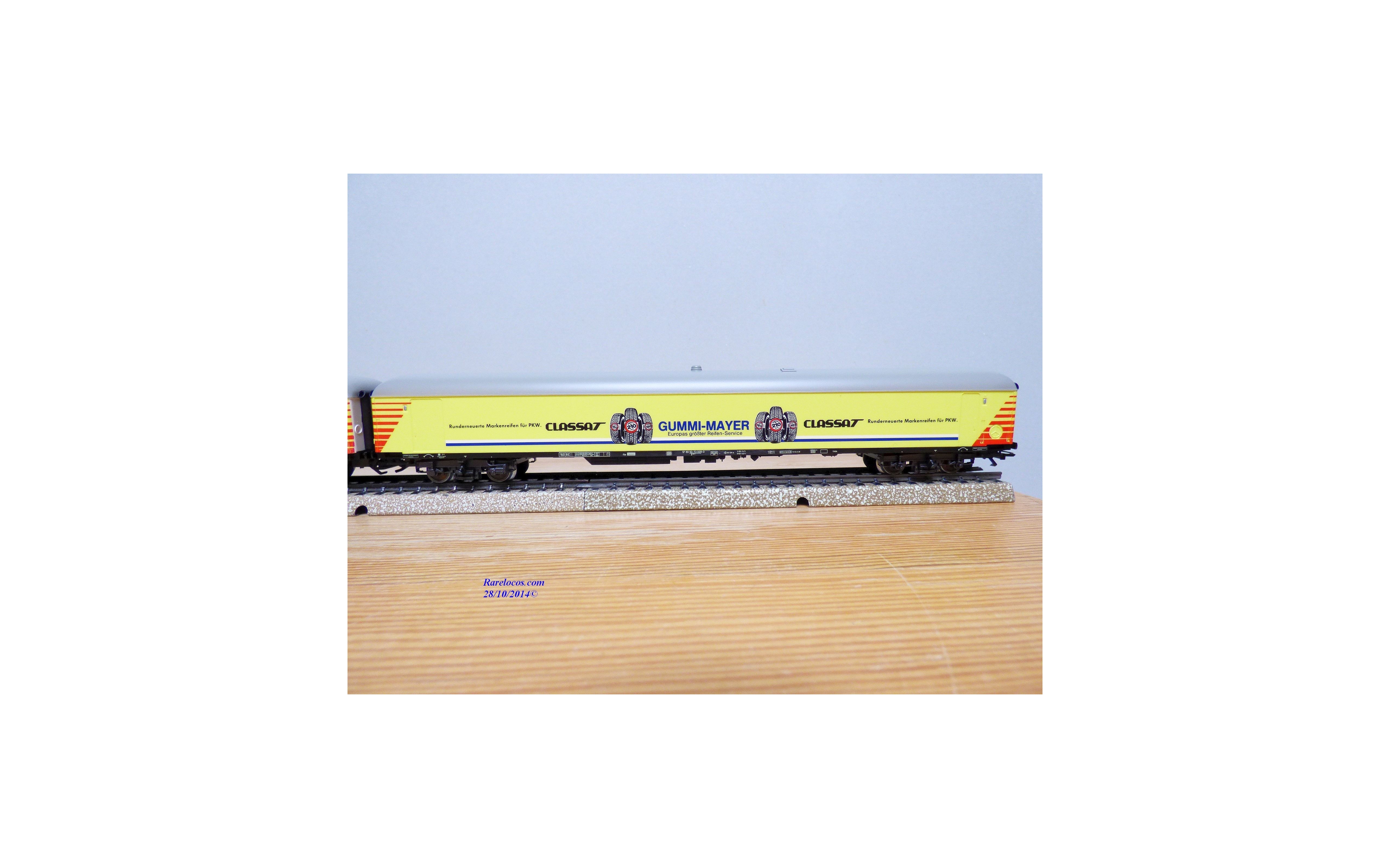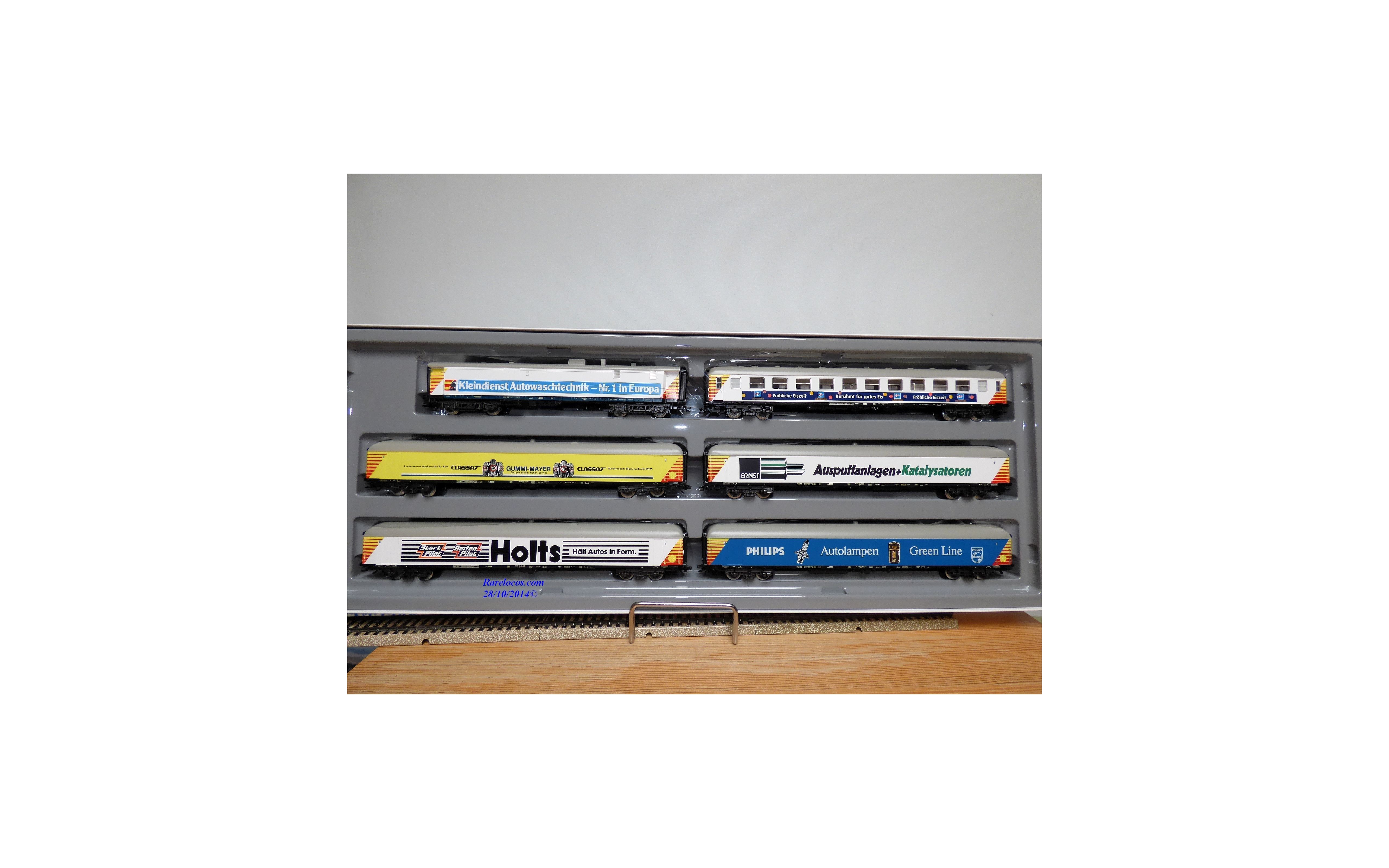Coffret représentant une rame publicitaire ( SHELL Messezug ) de 5 wagons et 1 voiture des chemins de fer allemands à bogies ( DB ), emballage d'origine en excellent état .