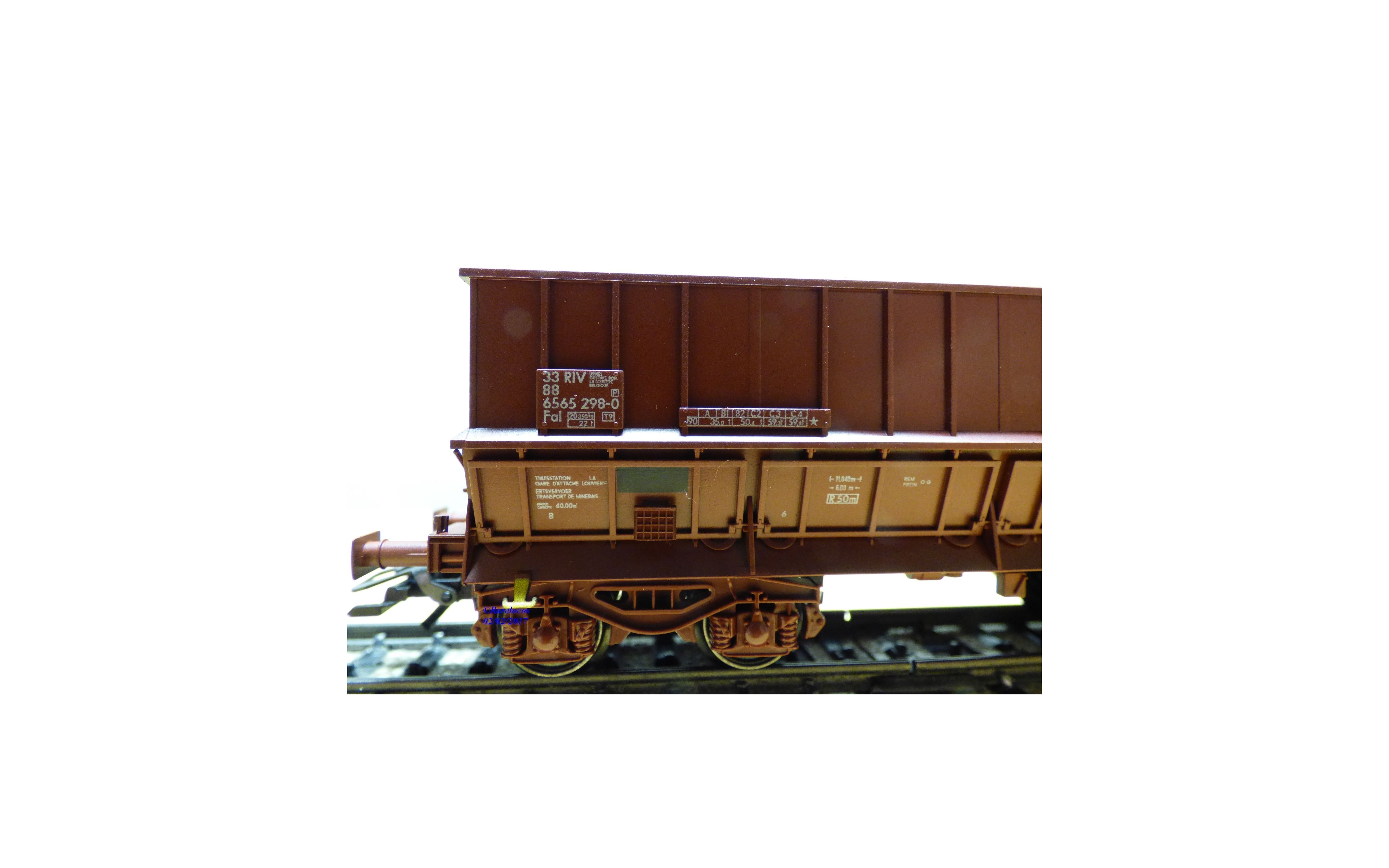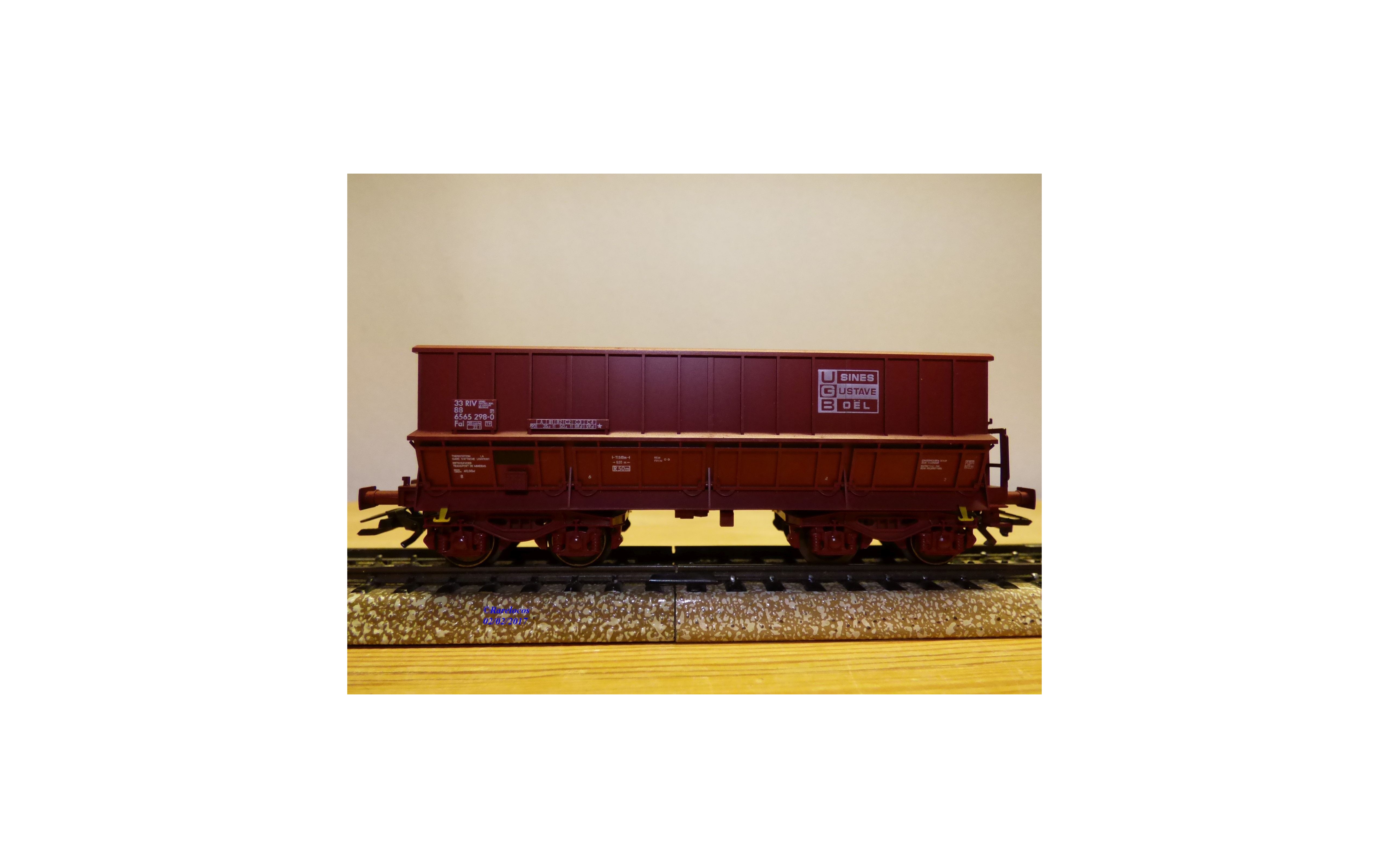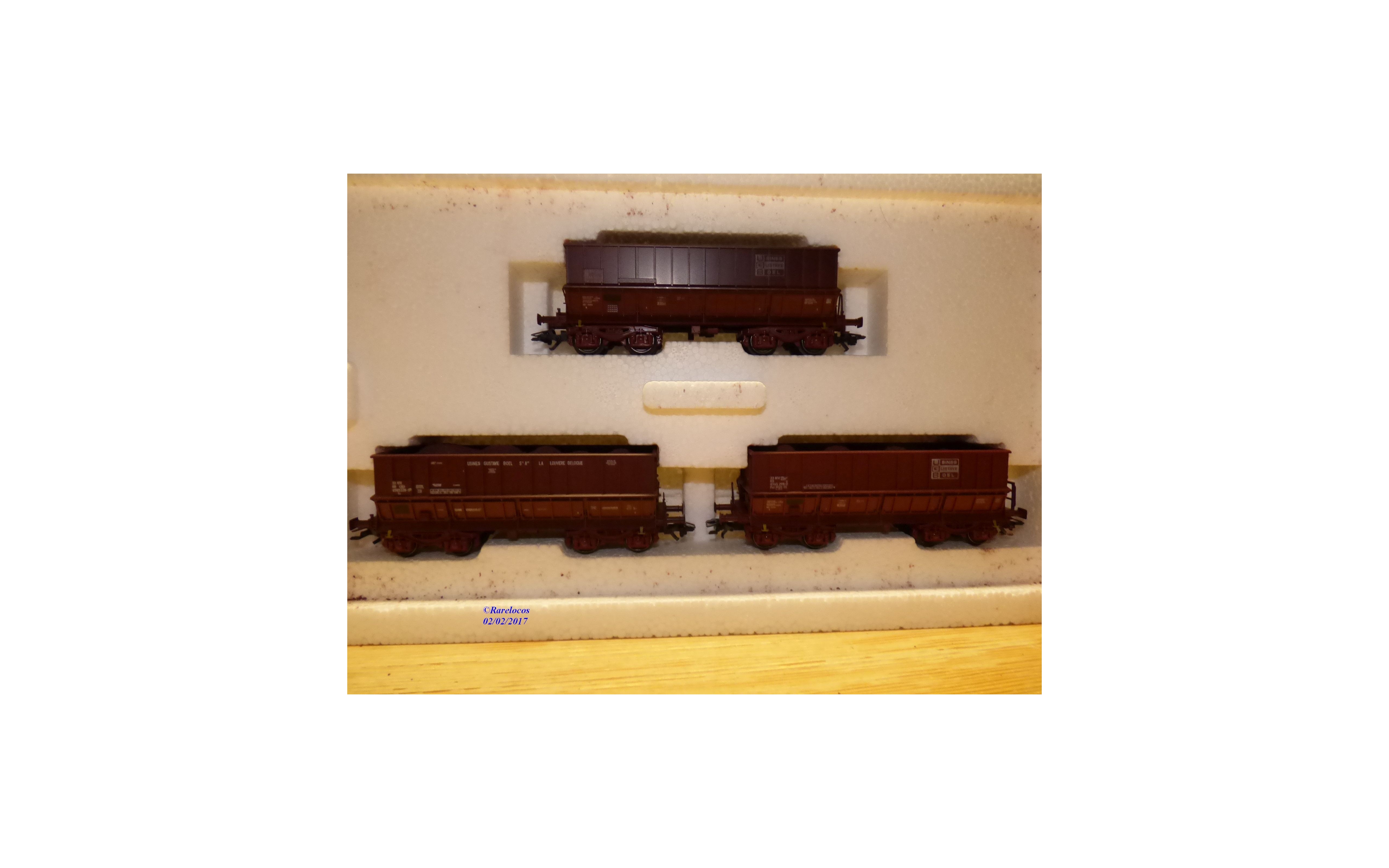 Coffret de 3 wagons trémie minéraliers type Fal à 2 bogies des chemins de fer belges ( SNCB ), chargement simulé, livrée marron avec marquages Usines Gustave Boël, attelages à élongation, immatriculations différentes, boîte d'origine en bon état.