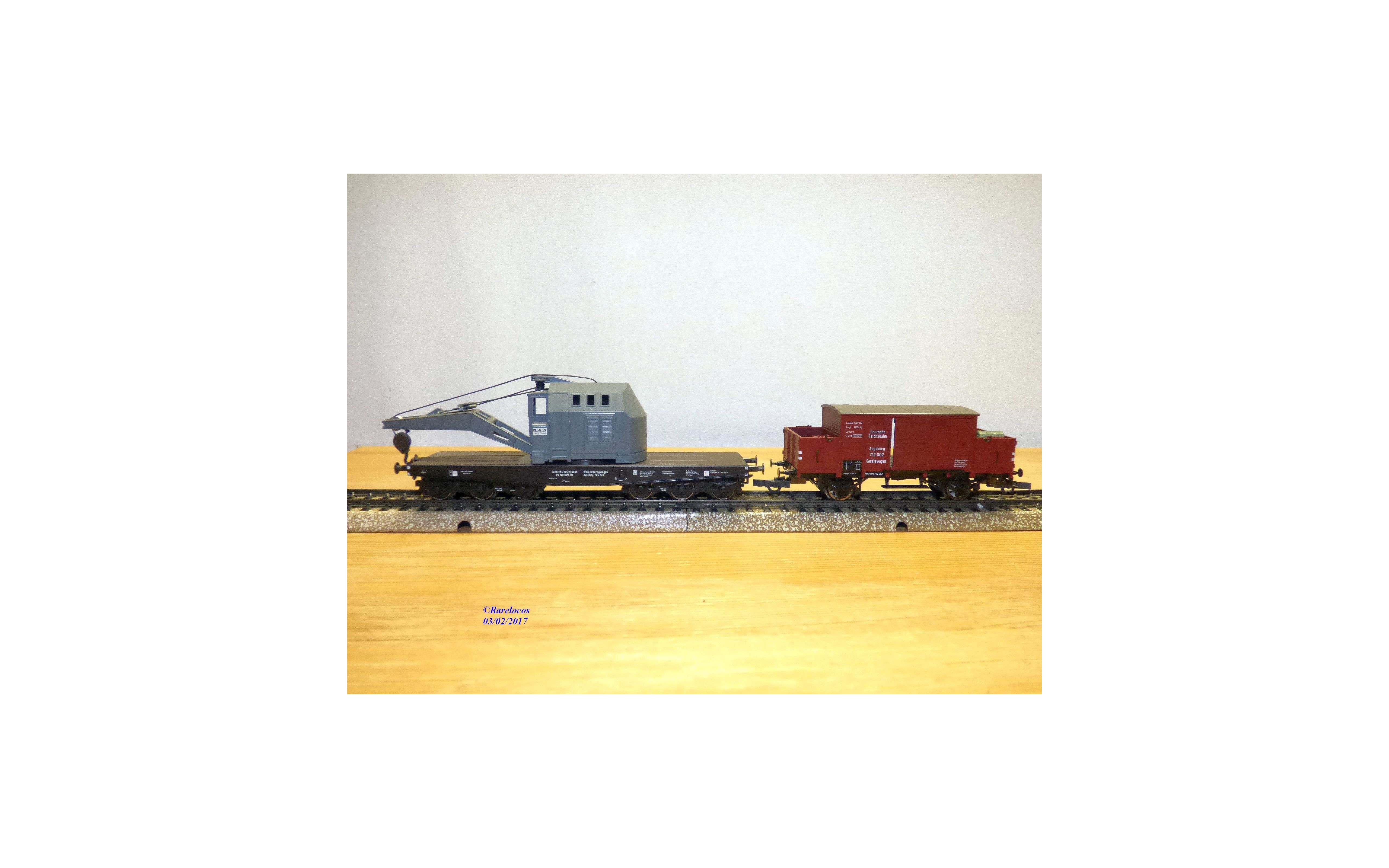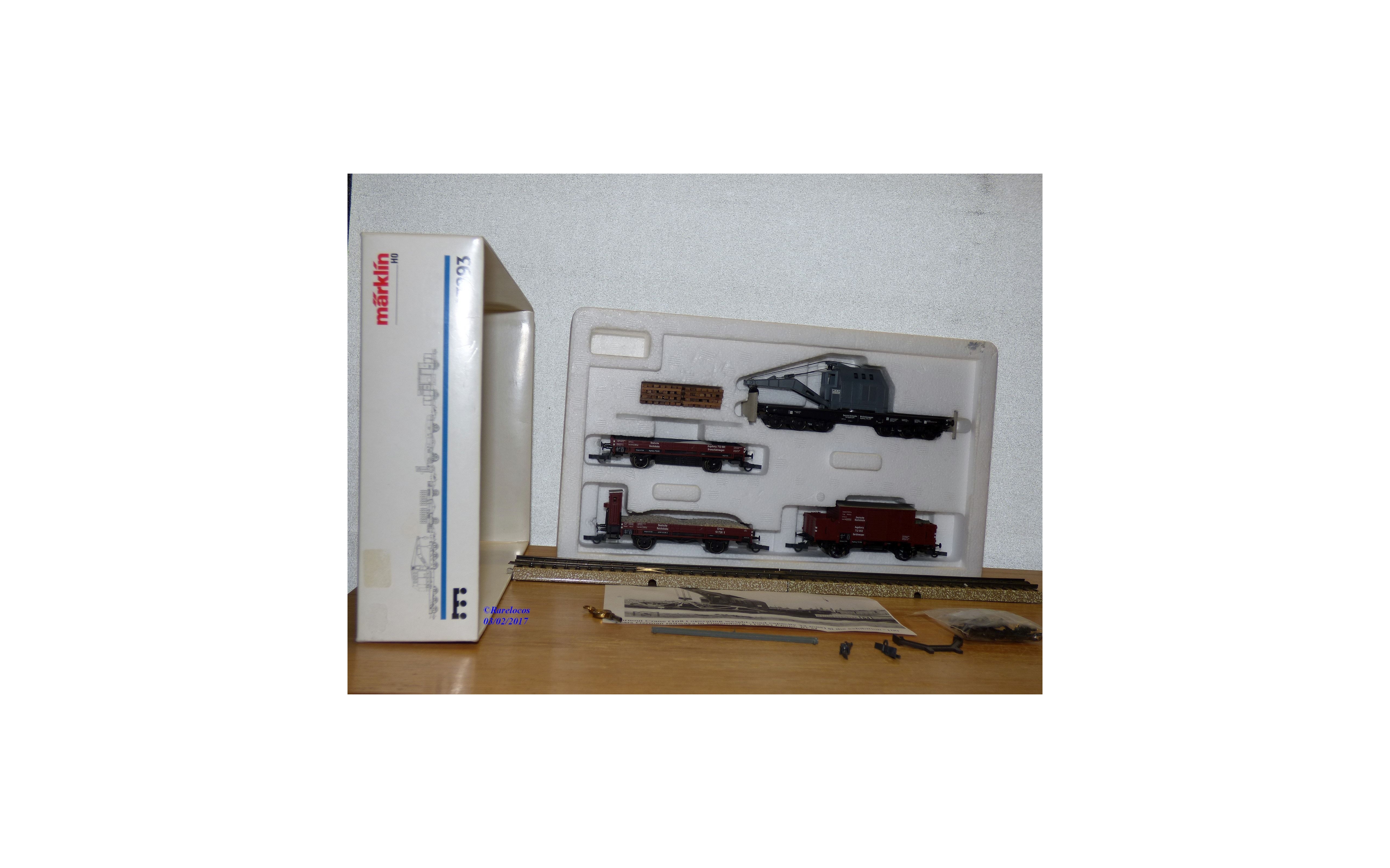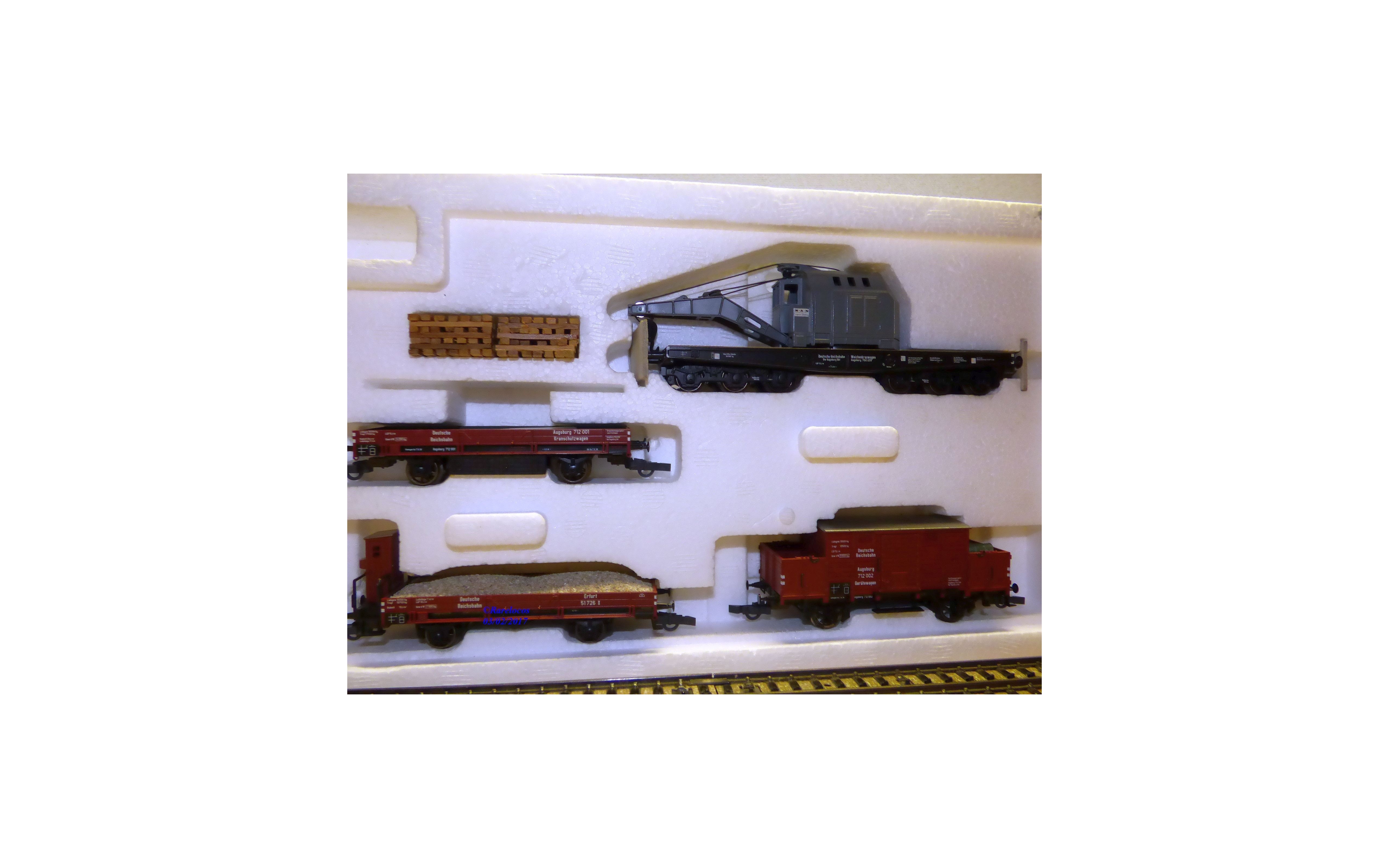 Coffret creprésentant un train de pose de rails ( Gleisbauzug) de type Augsburg comprenant 1 wagon grue spécifique à 2 bogies de 3 essieux, 1 wagon atelier à portes coulissantes fonctionneles, 1 wagon plat à guérite et 1 wagon plat des chemins de fer allemands ( DRG ), pièces de détaillage encore scellées, boîte d'origine en bon état .