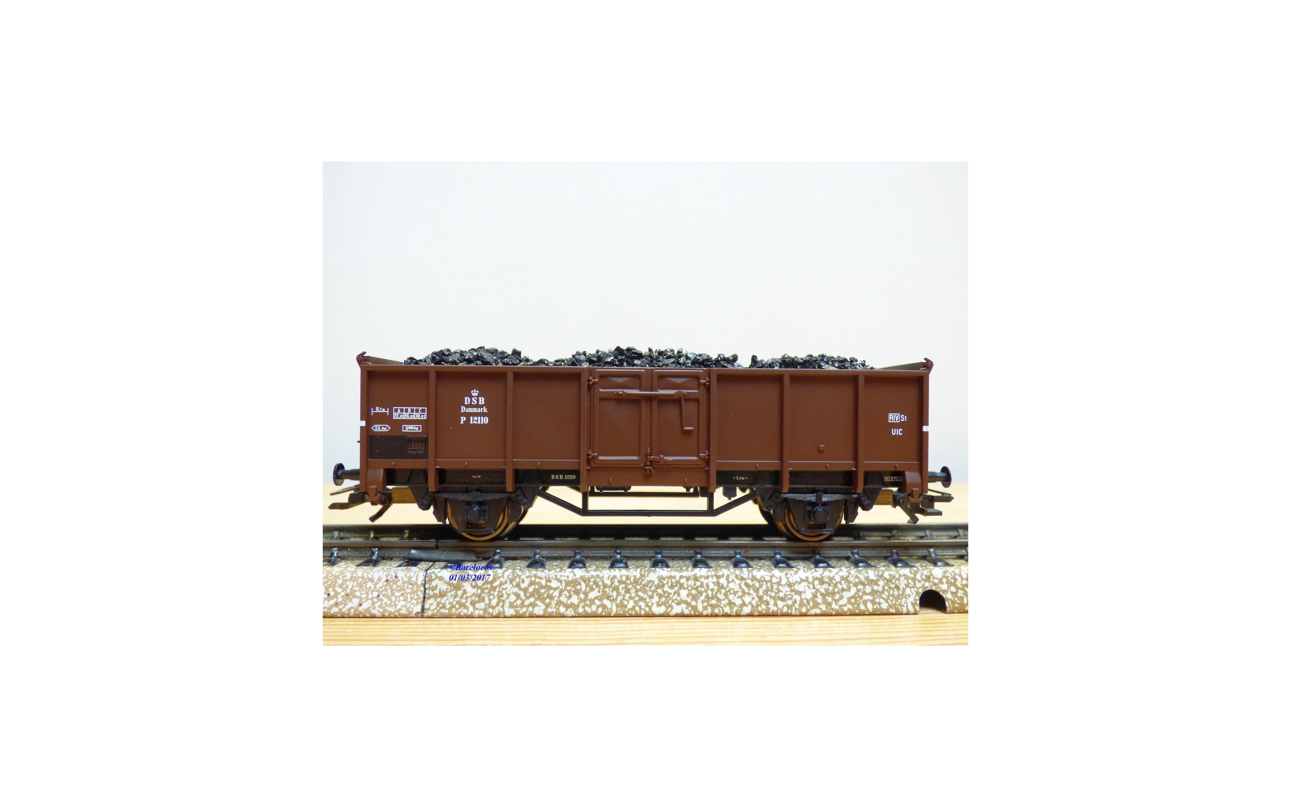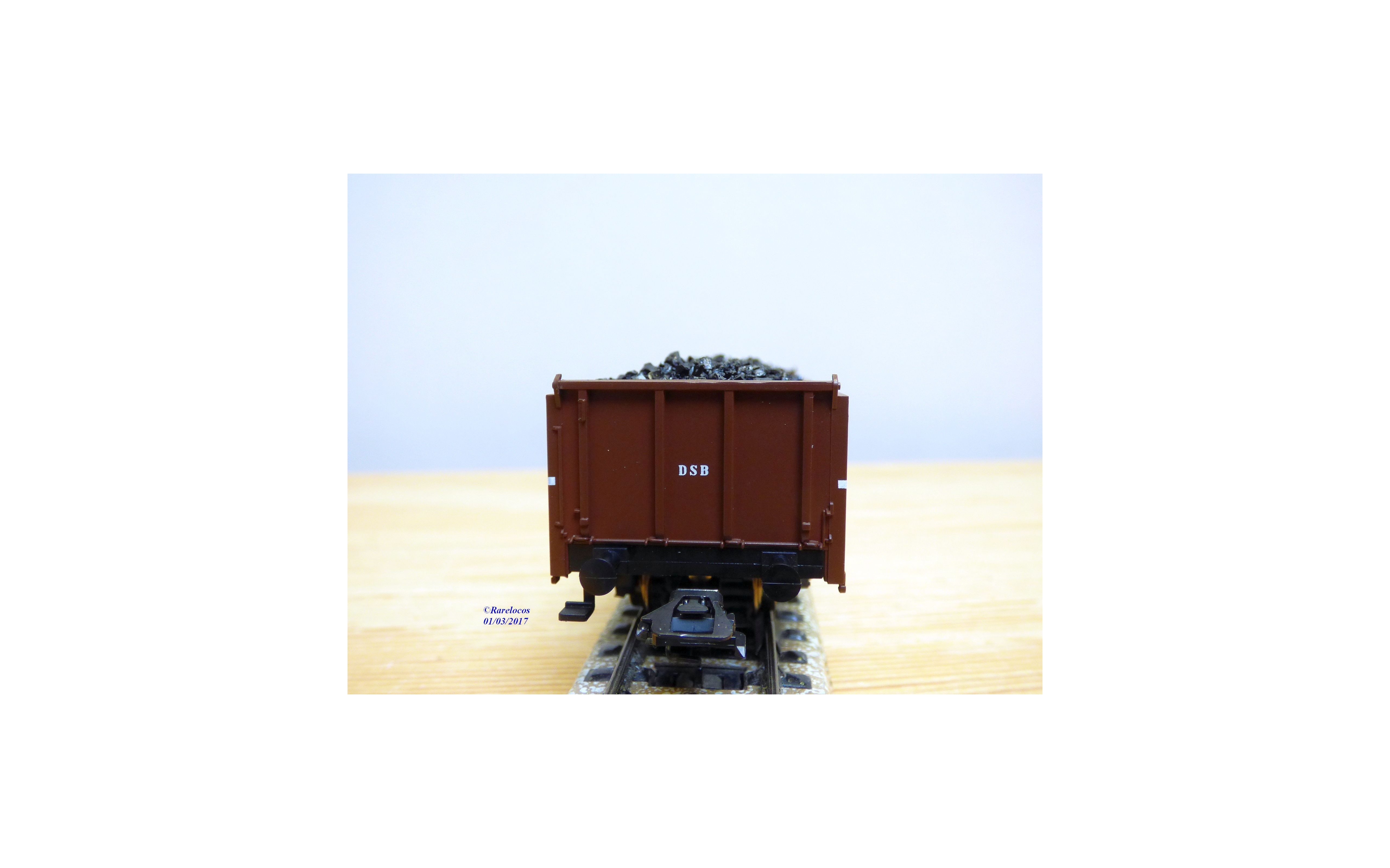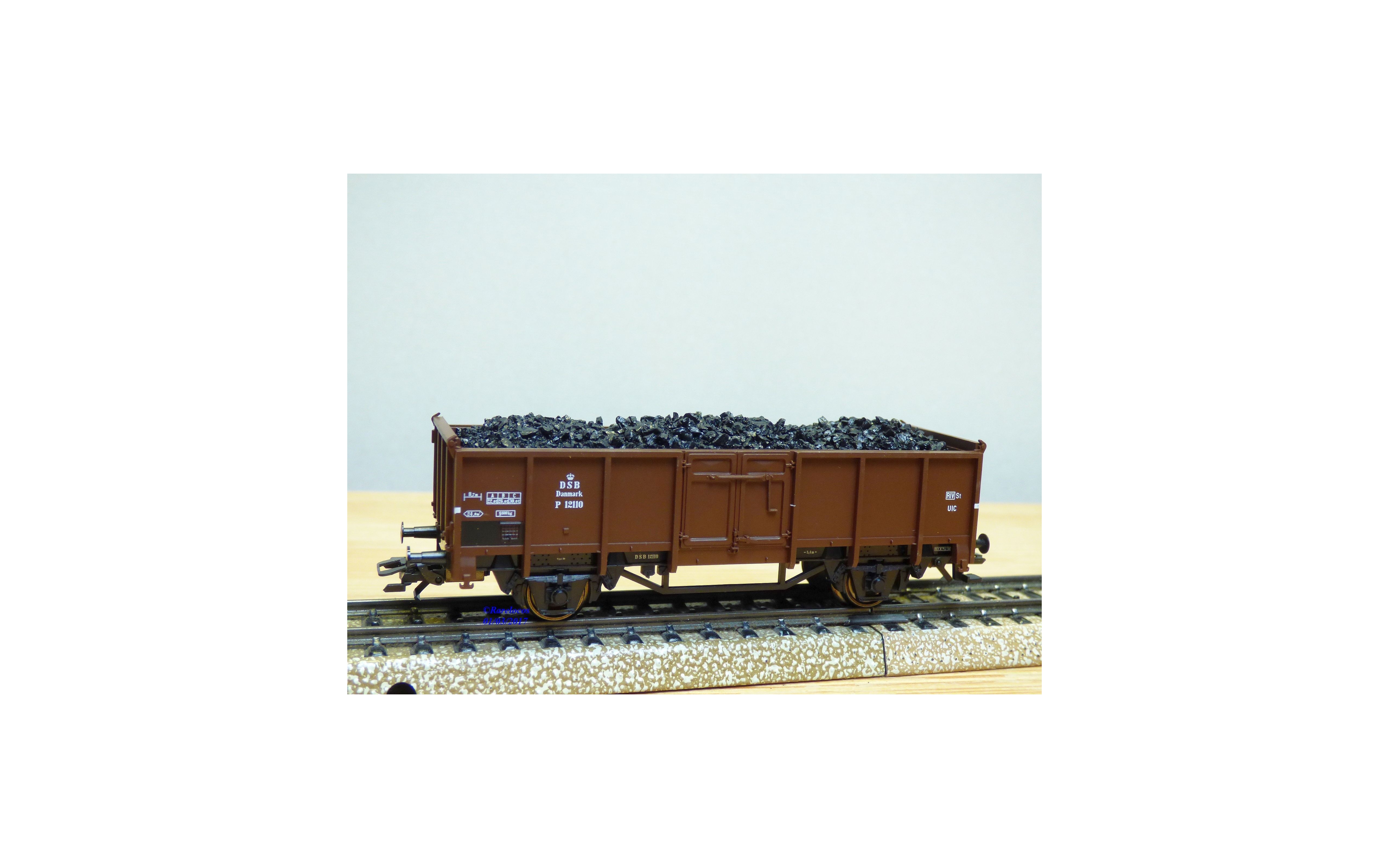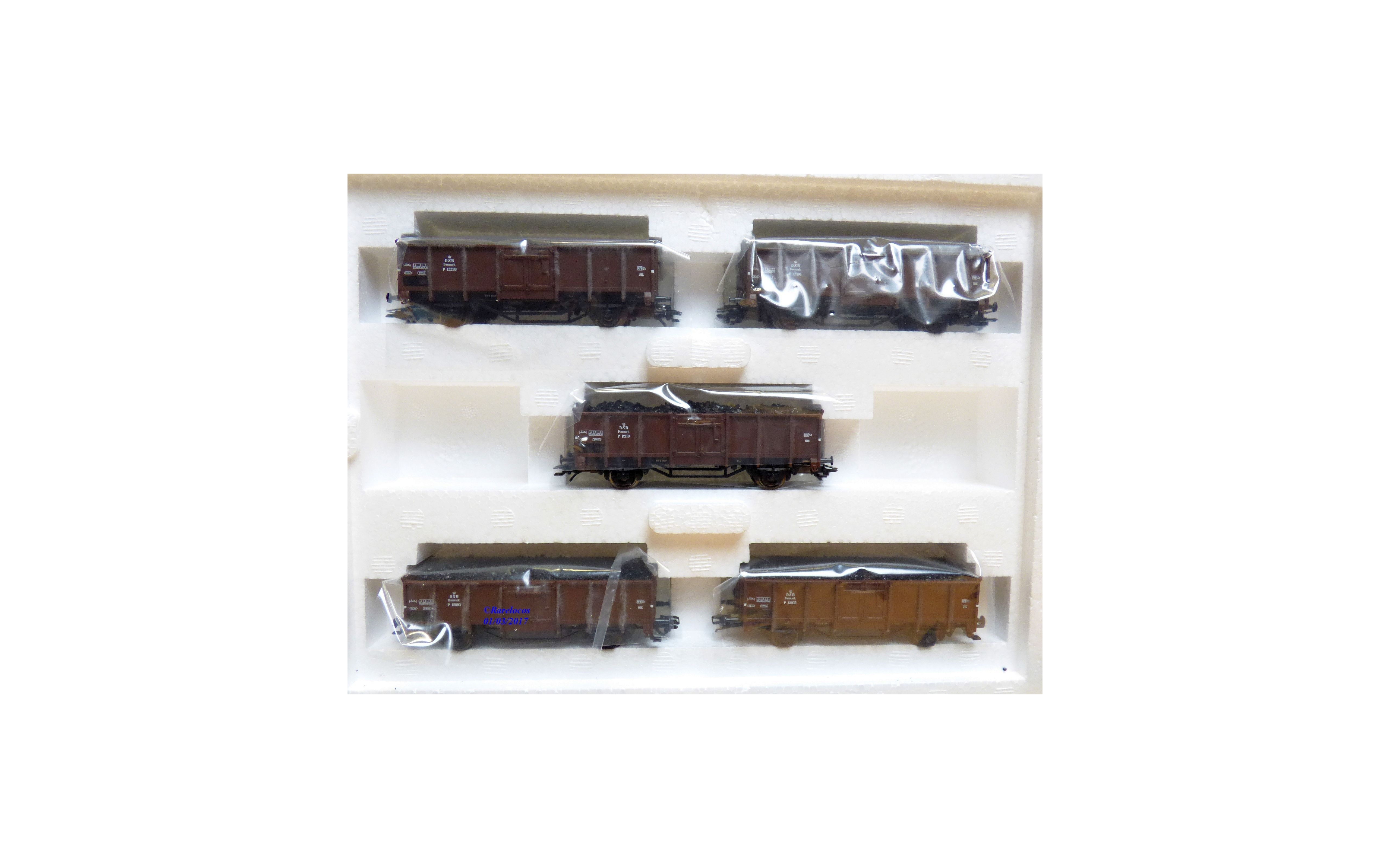 Coffret de 5 wagons tombereaux à 2 essieux type P des chemins de fer danois ( DSB ) chargés de charbon ou de coke, livrée marron, boîte d'origine en très bon état.