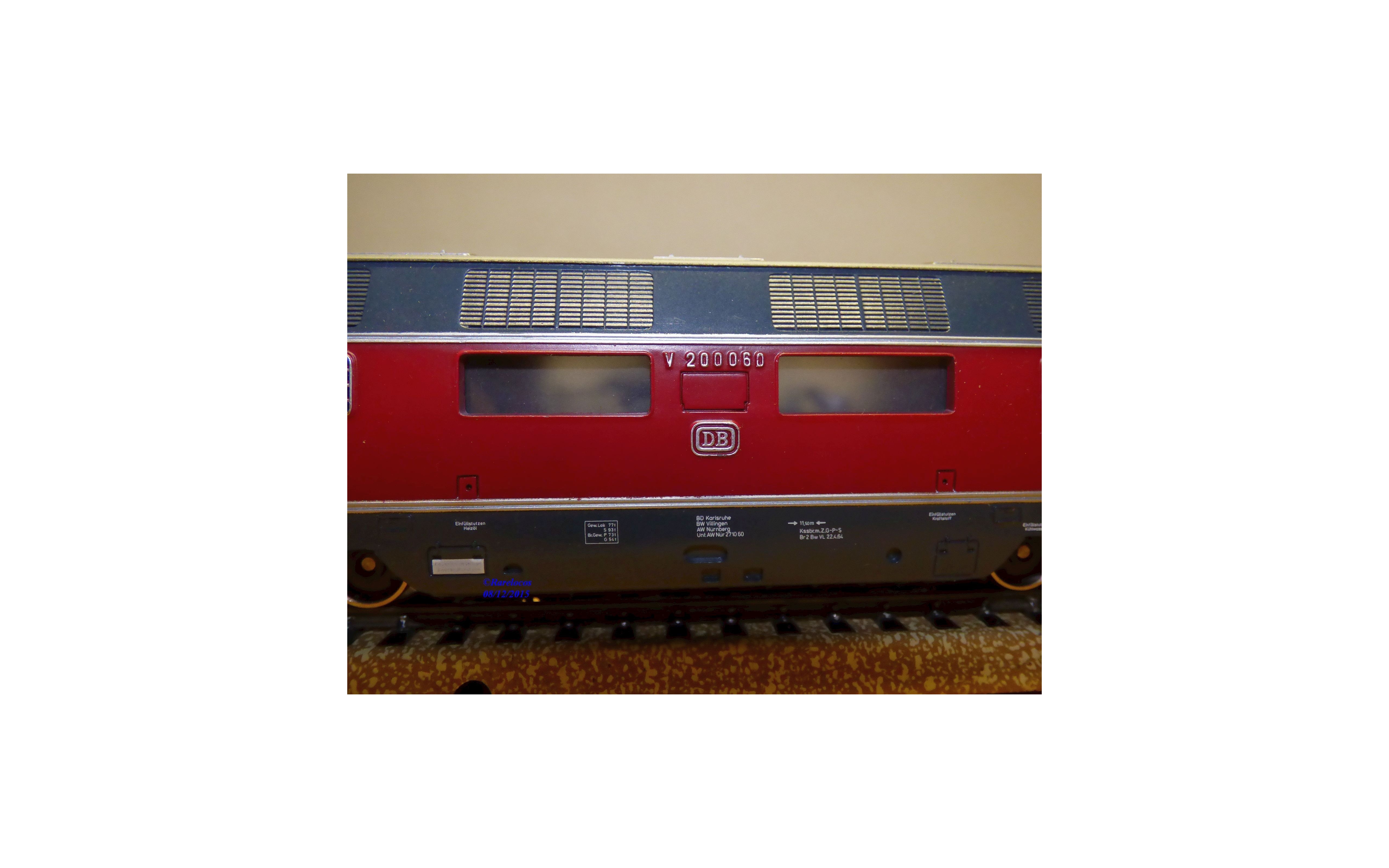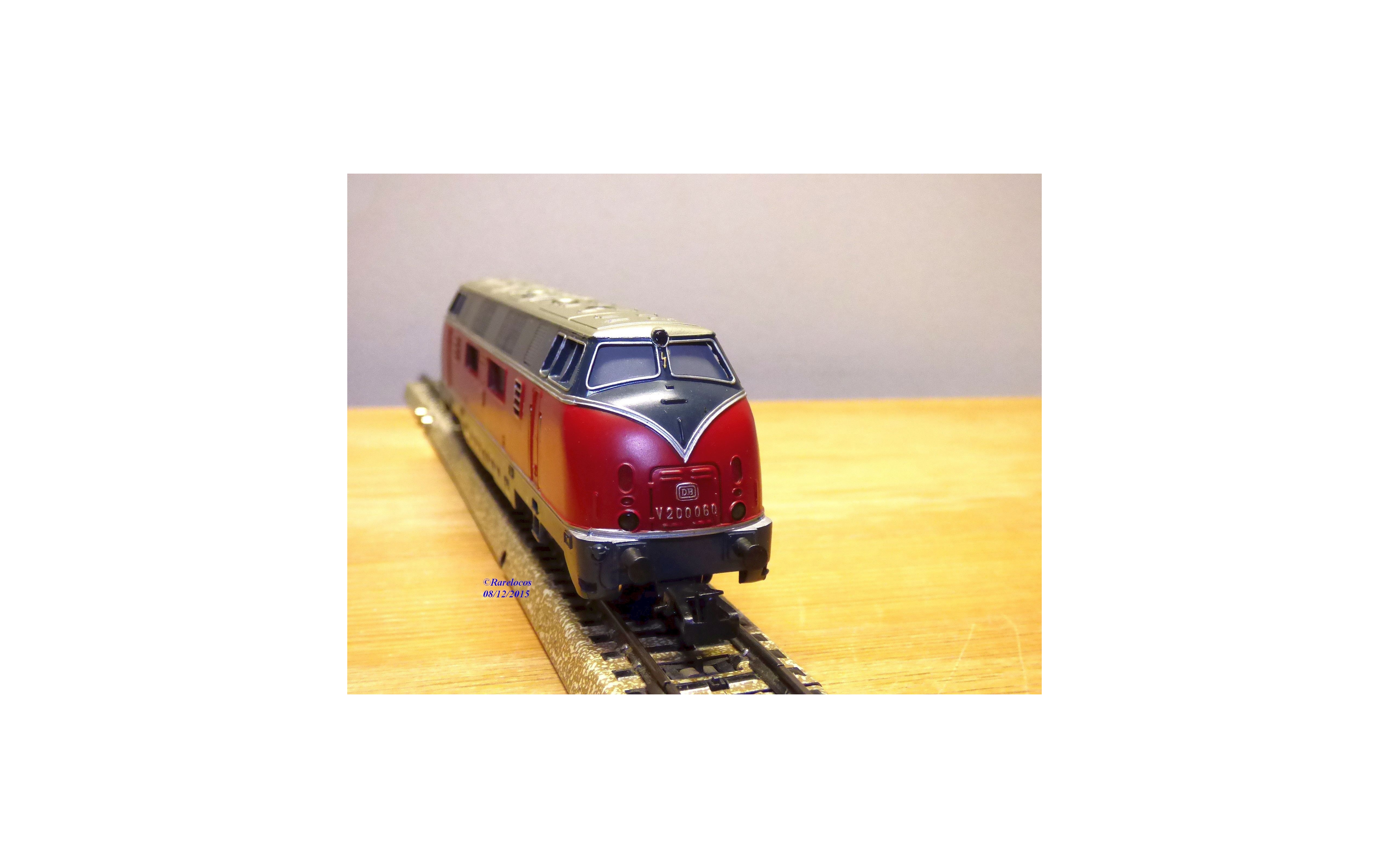 Loco diesel Bo Bo série 220 ( ex V 200 ) des chemins de fer allemands ( DB ) , livrée lie de vin et gris, tout en métal, notice présente, boîte d'origine en état moyen ( rhodoïd de calage bien malade )..