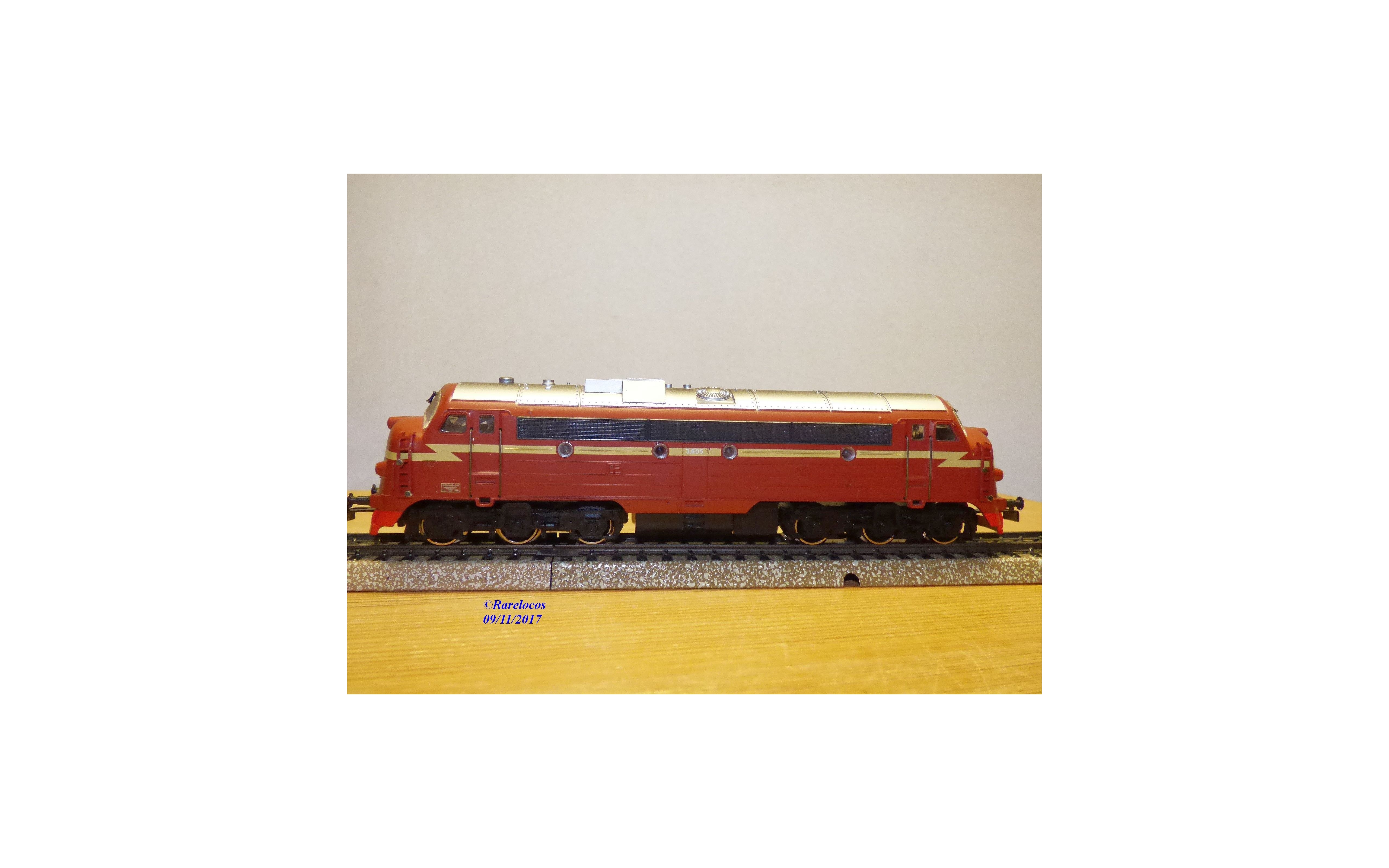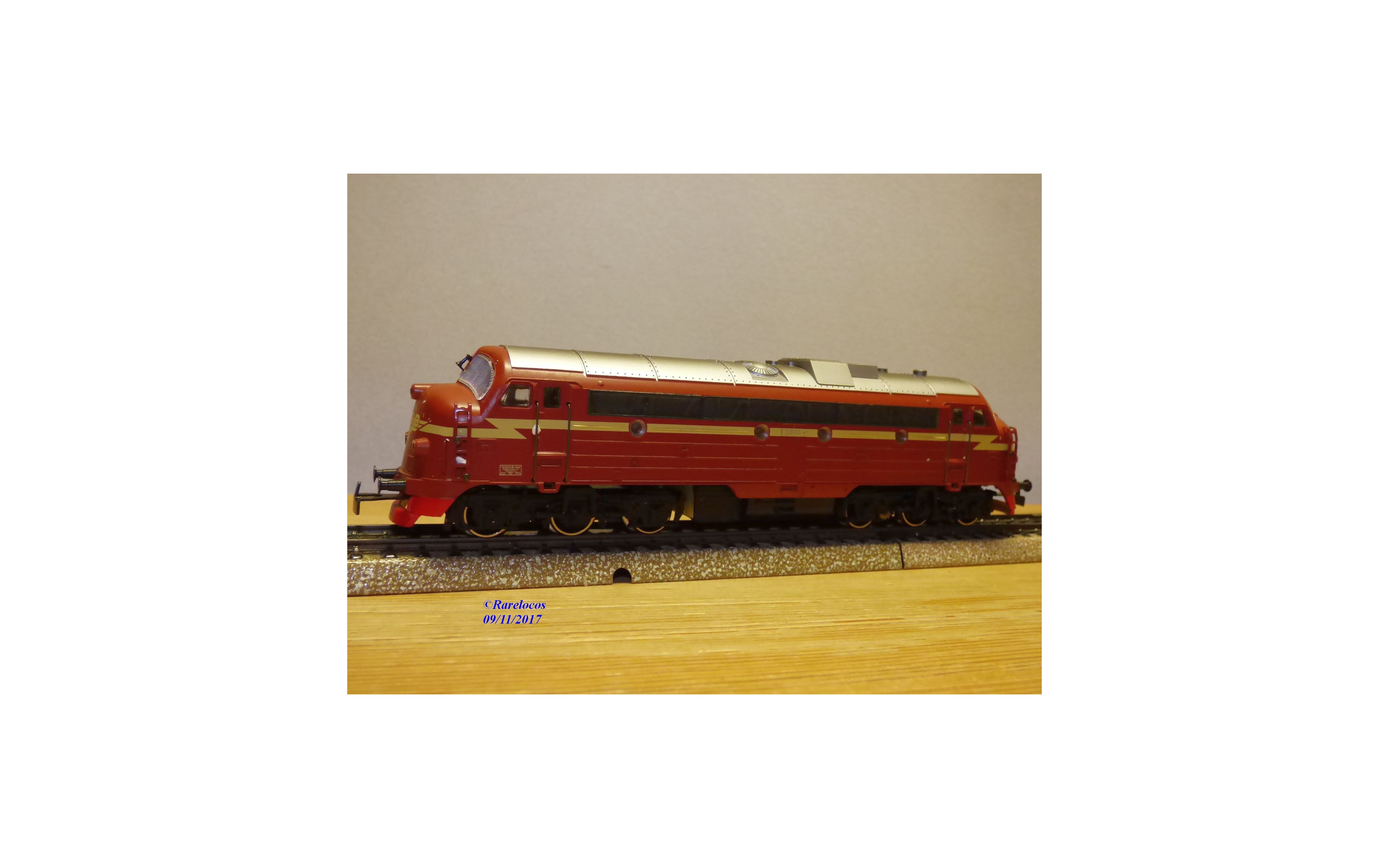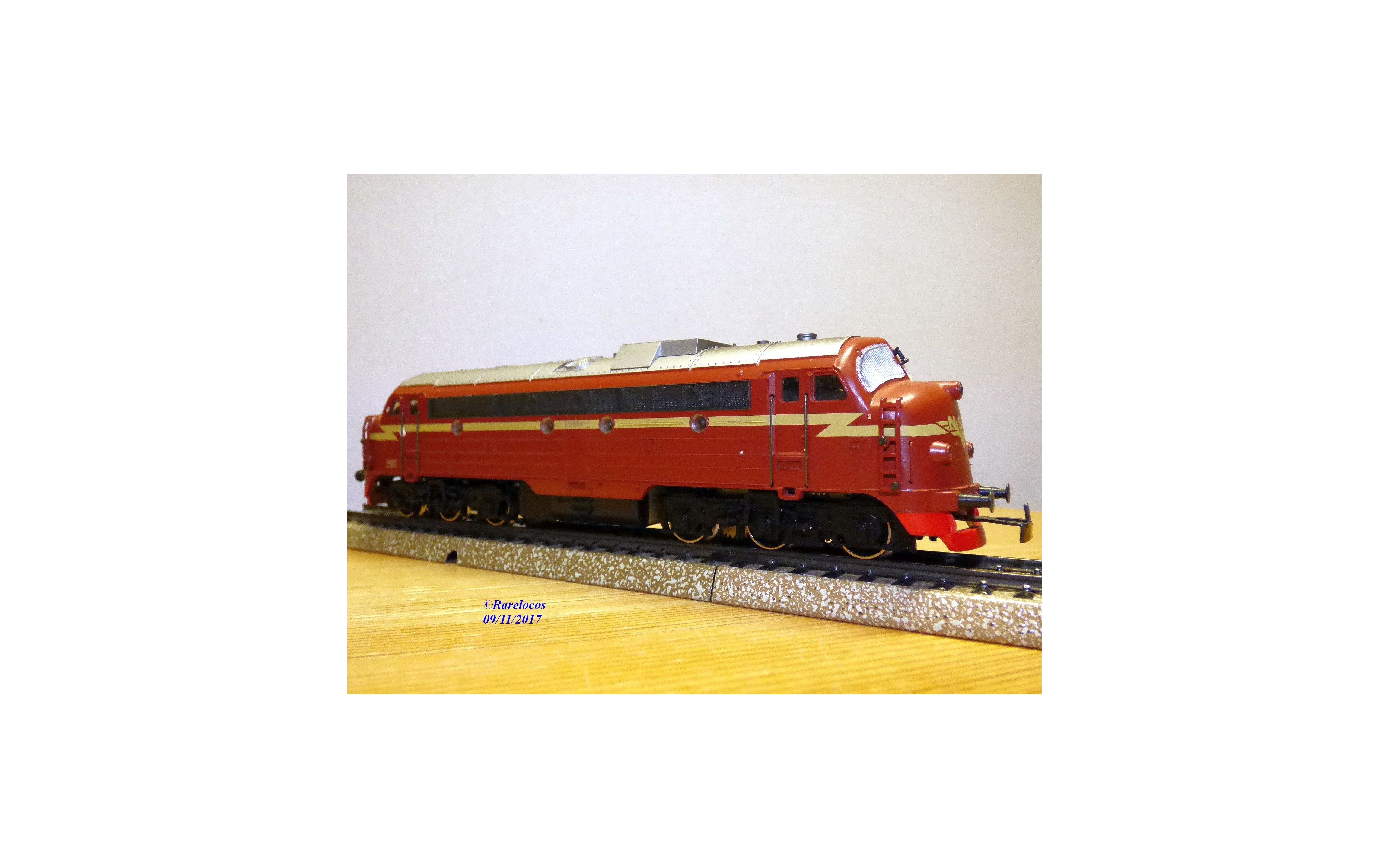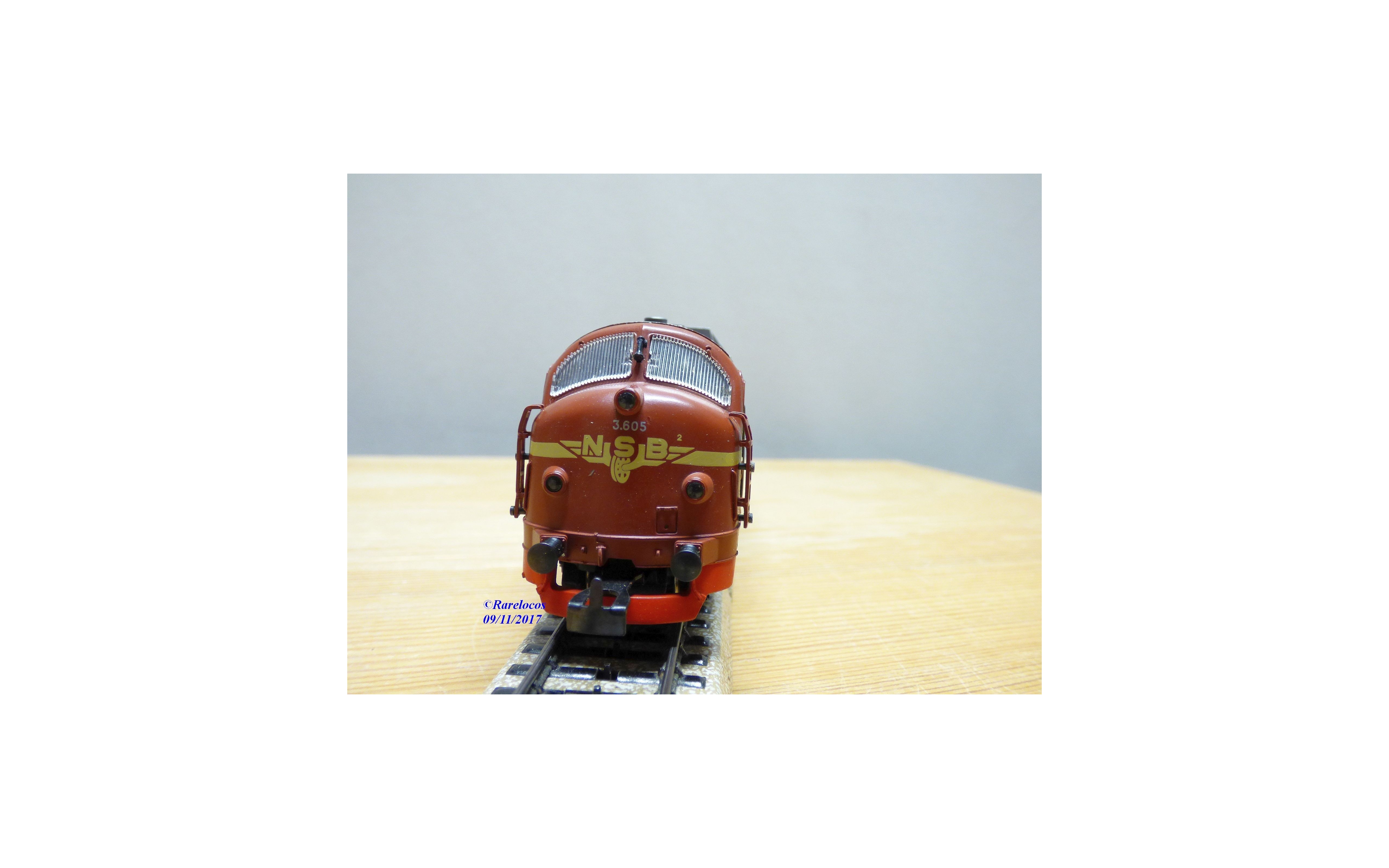 Rare locomotive diesel A1A A1A série Di3 des chemins de fer norvégiens ( NSB ), tout en métal, livrée marron à flèche jaune paille et toit gris argent, immatriculation : 3.605, notice présente, emballage d'origine en excellent état.