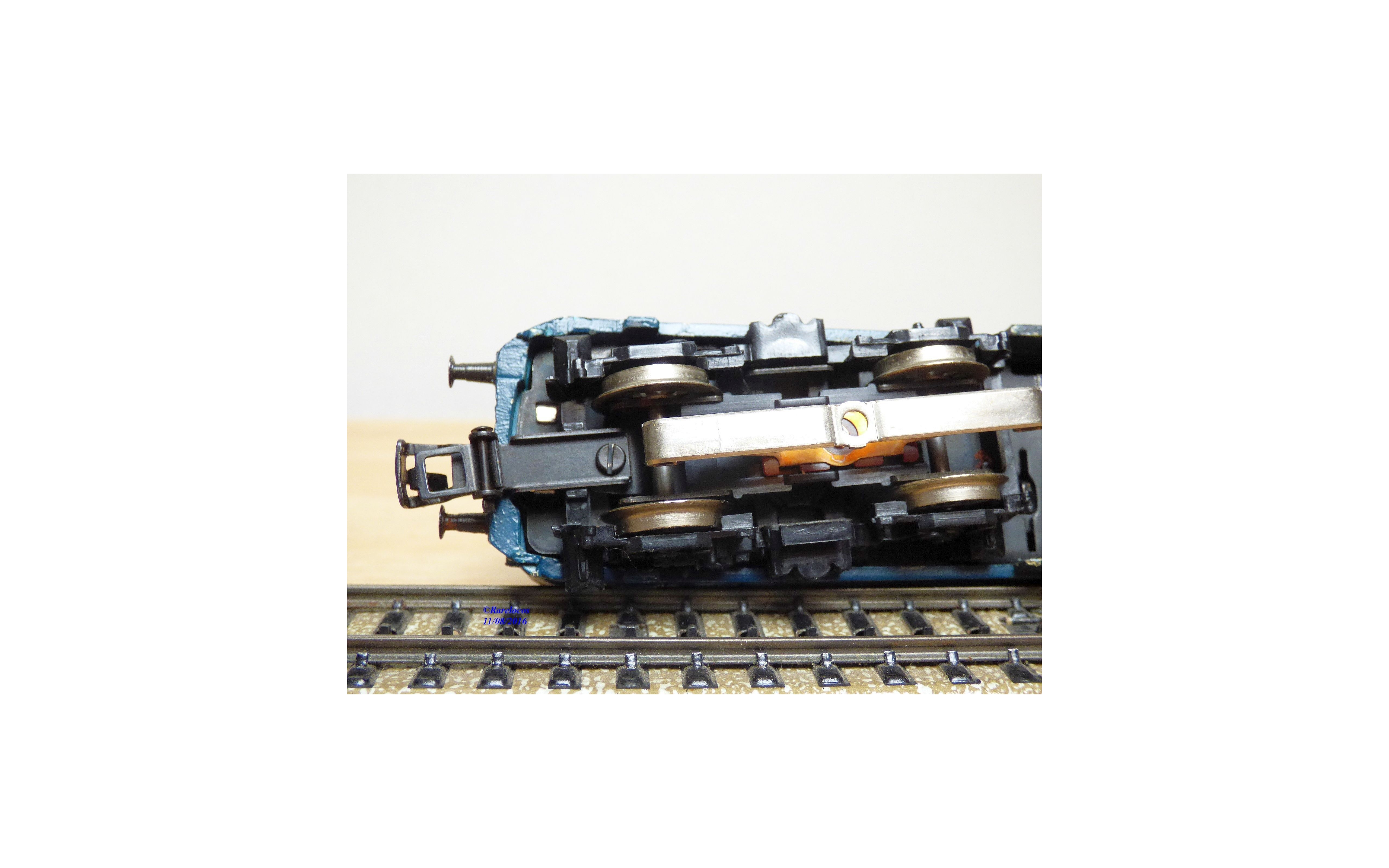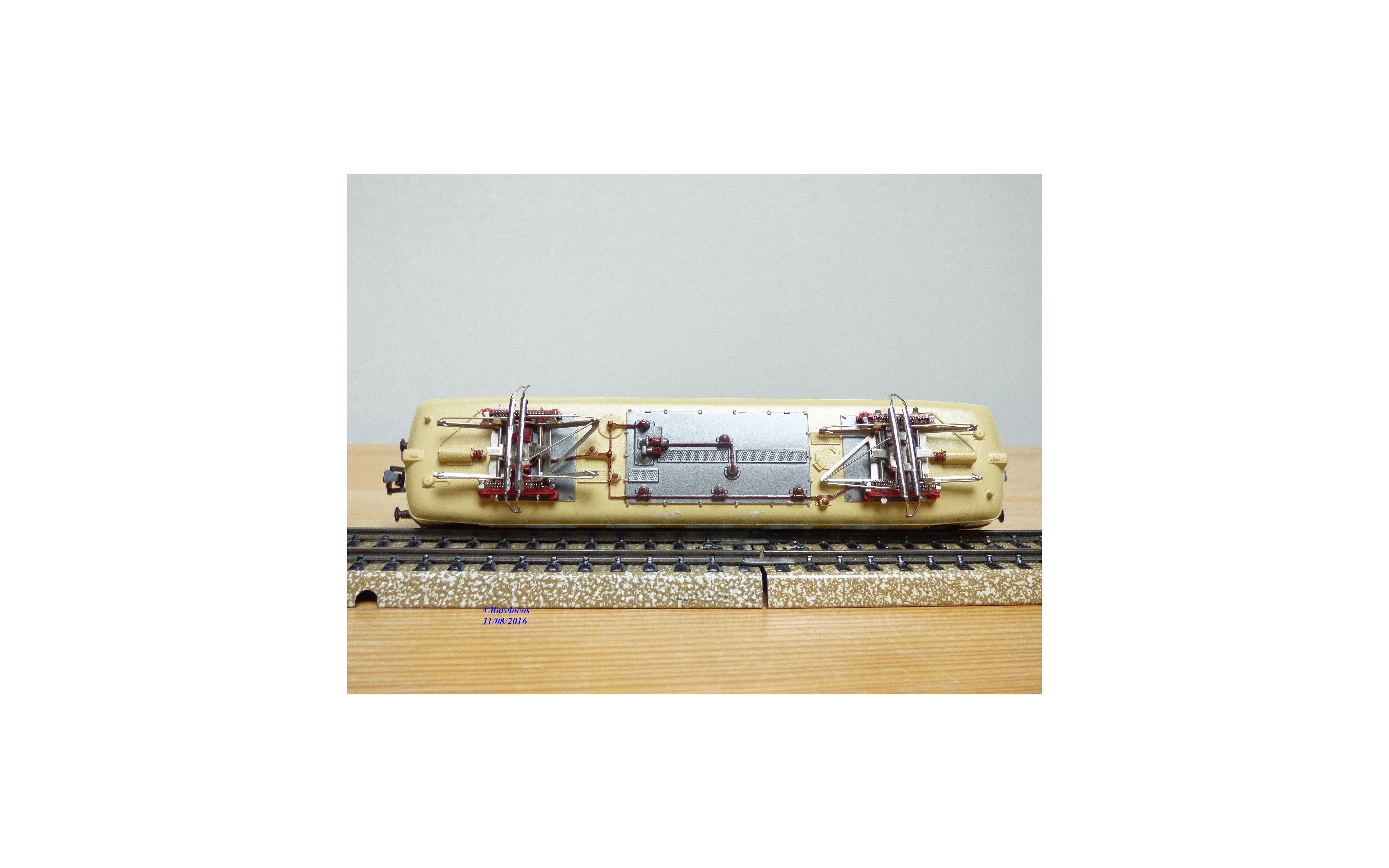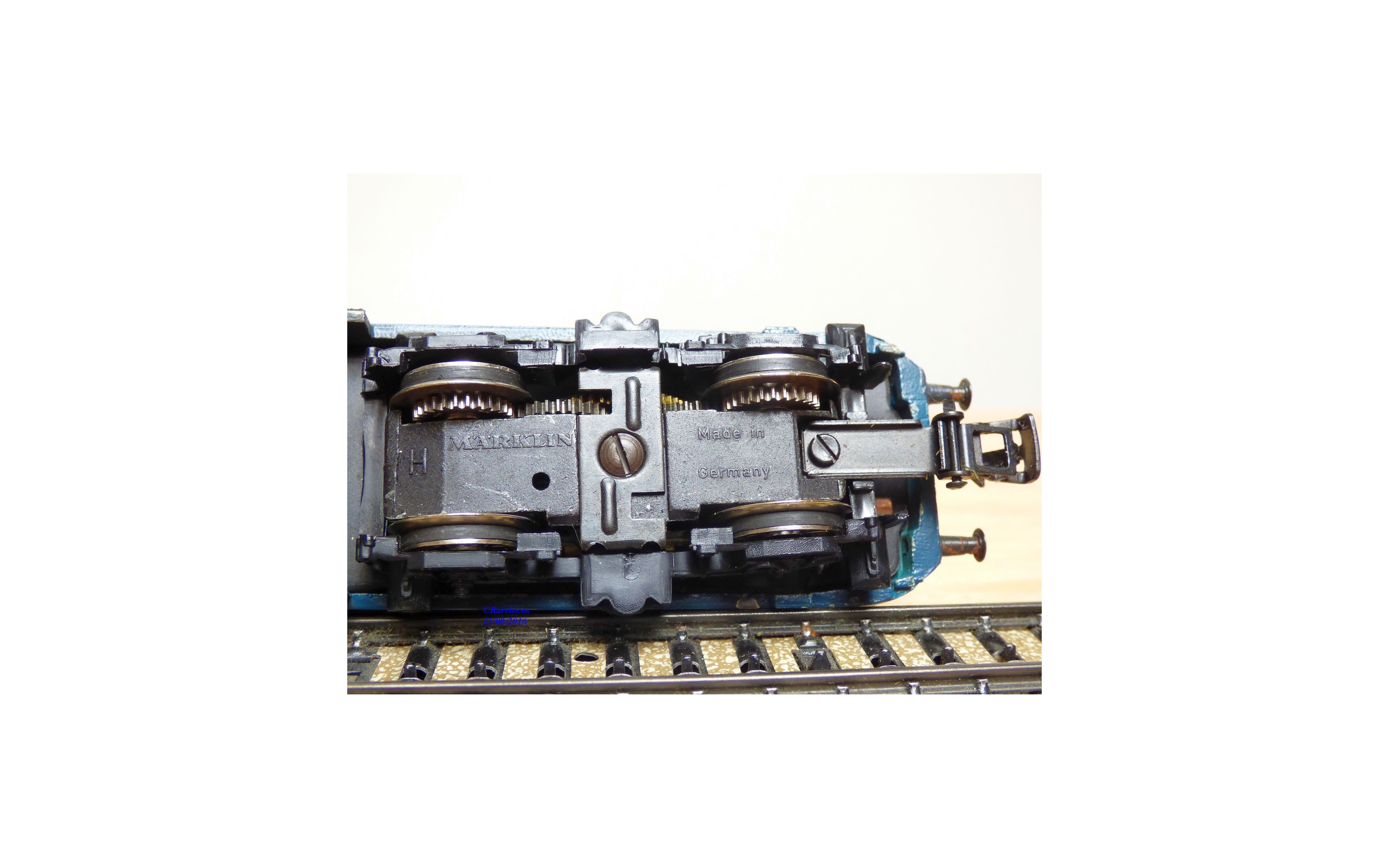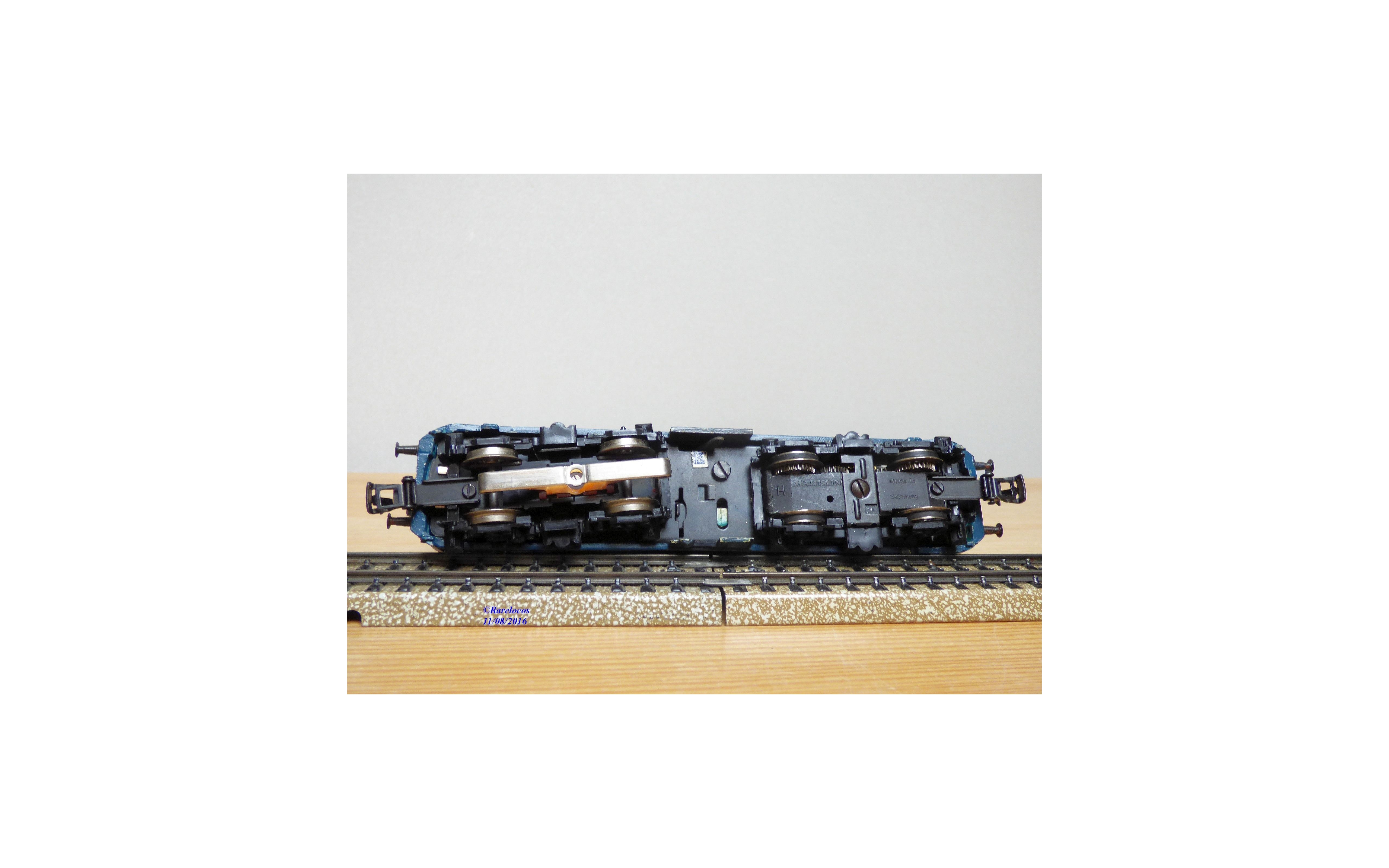 Motrice Bo Bo série 141 ( ex E 41 ) des chemins de fer allemands ( DB ), tout en métal, livrée crême et turquoise, prise de courant par rails ou caténaires ( testée OK ), immatriculation: 141 015-8, notice présente, boîte d' origine en bon état mais, si le calage en polystyrène est adapté à la motrice, l' enveloppe extérieure est celle d' une loco à vapeur ?