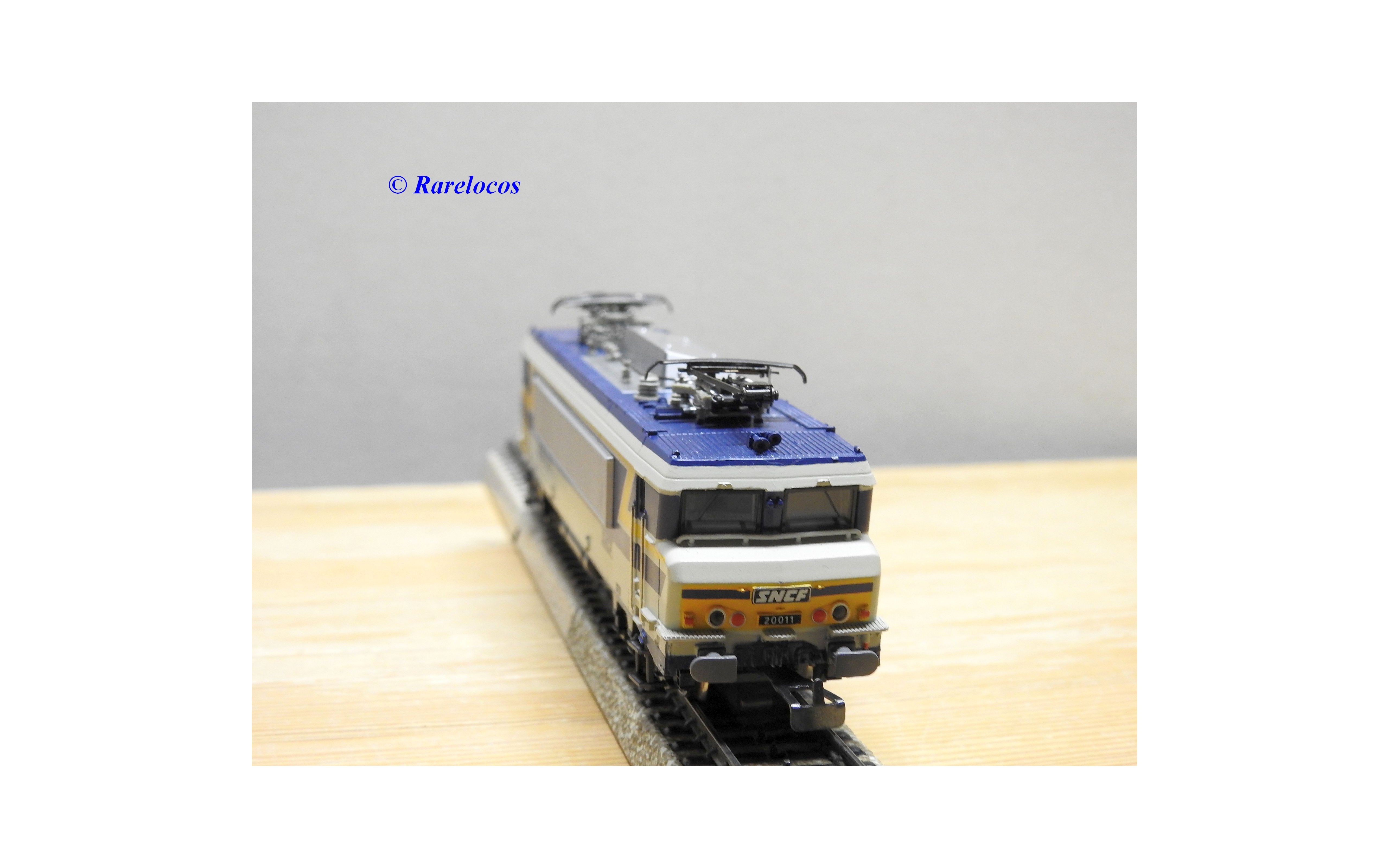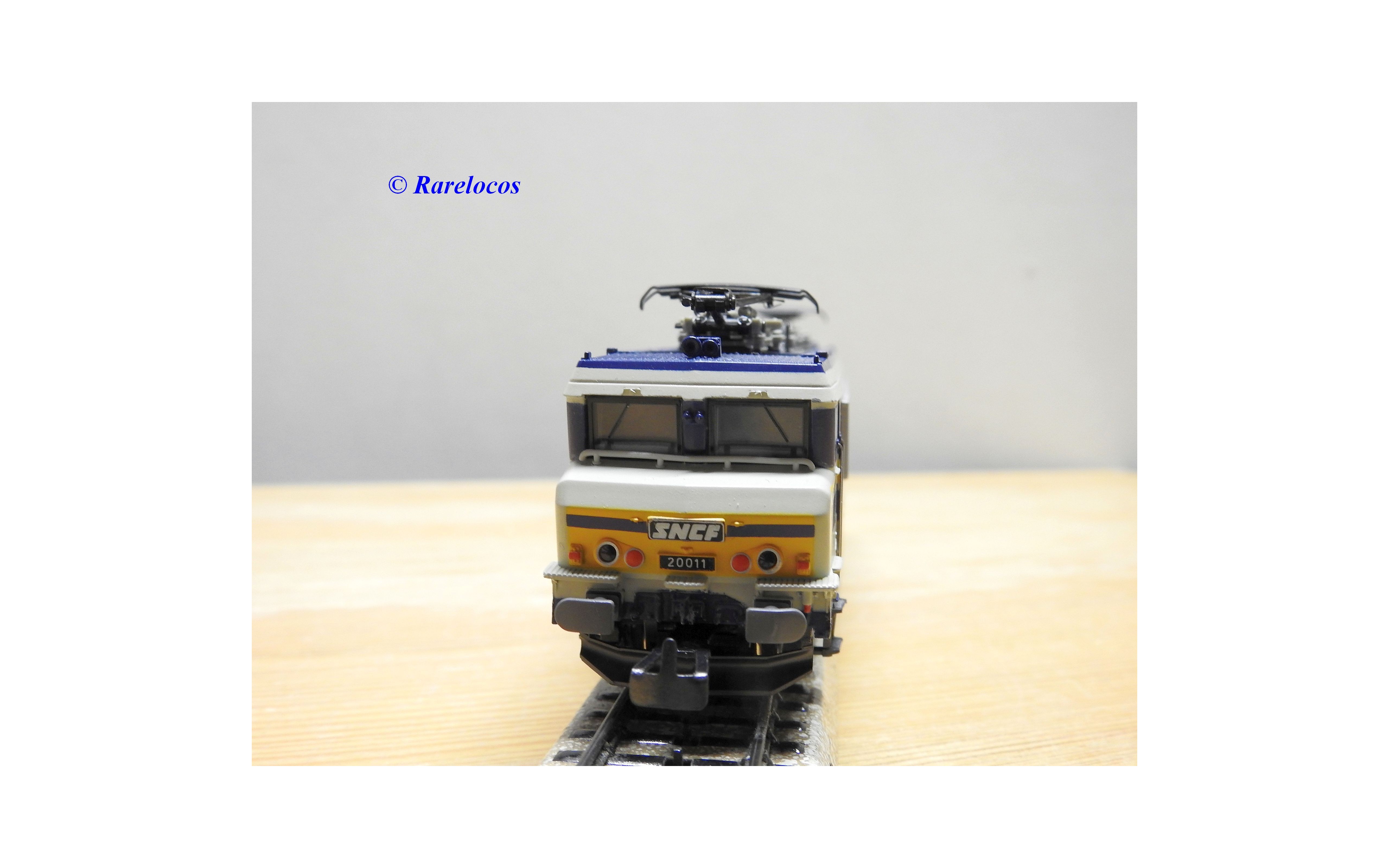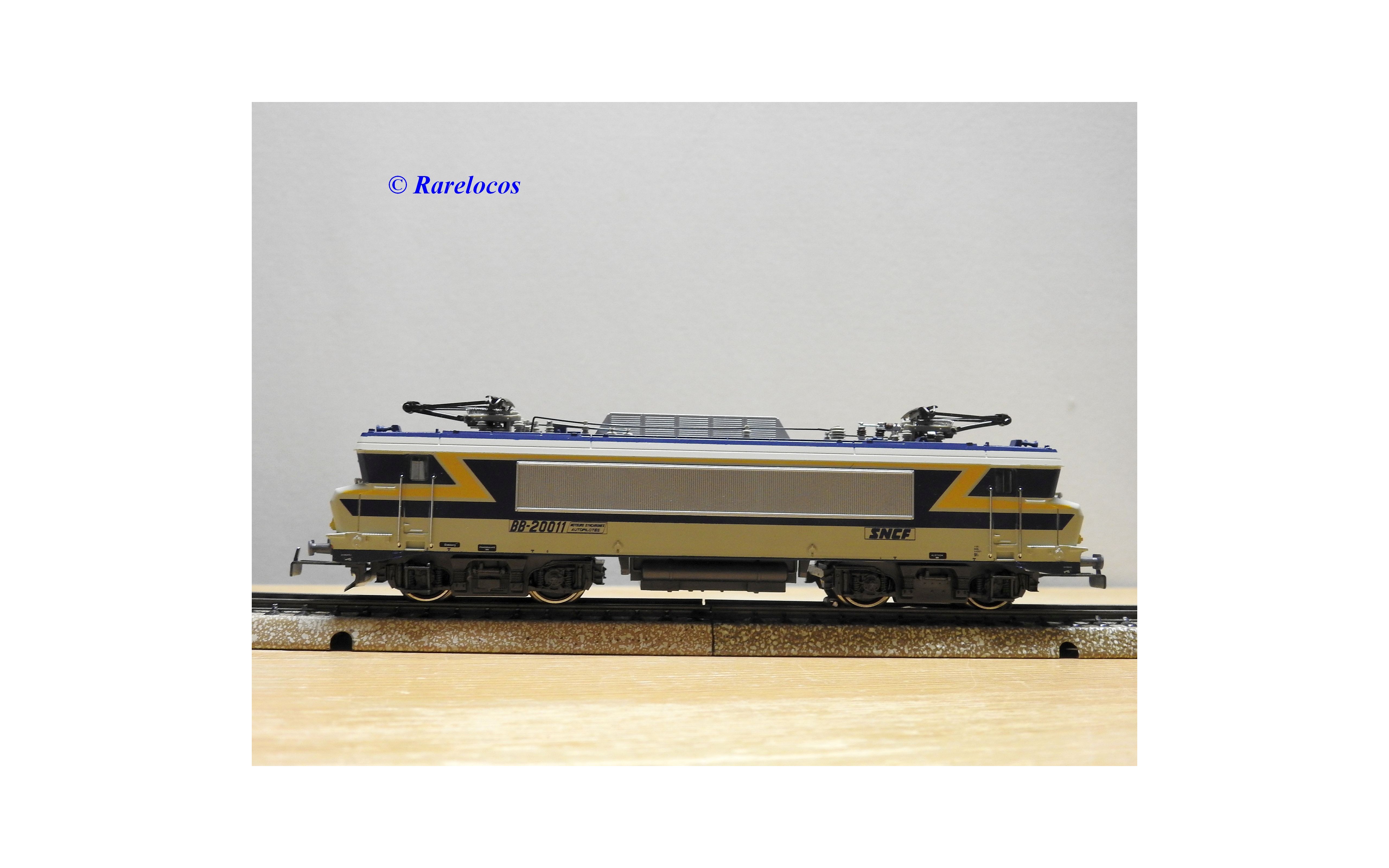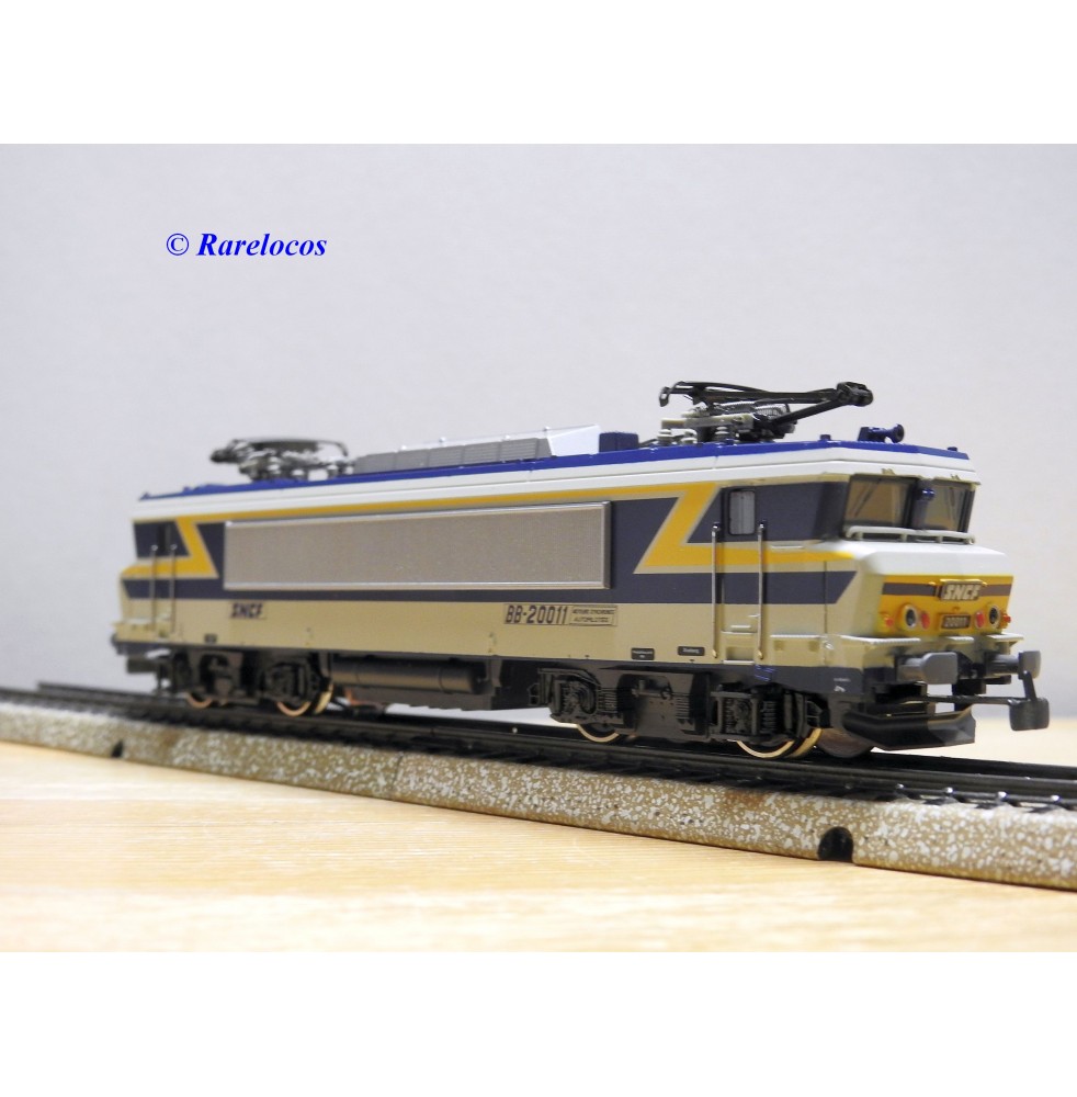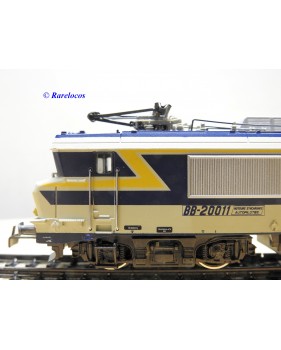 Motrice prototype Bo Bo série BB 20011 des chemins de fer français ( SNCF ), livrée grise, bleue et jaune, en métal, immatriculation : 20011, notice présente, boîte d'origine en très bon état .