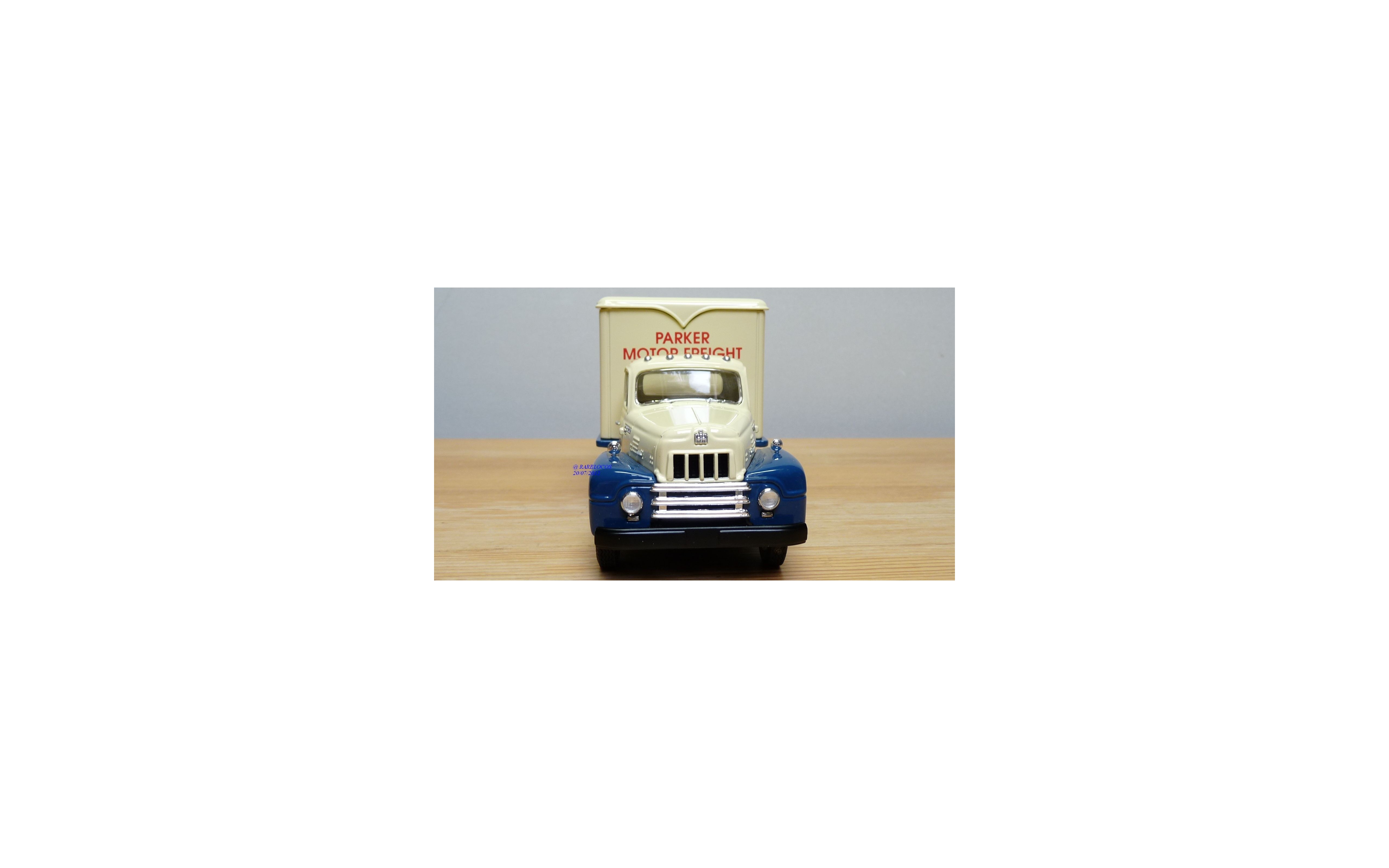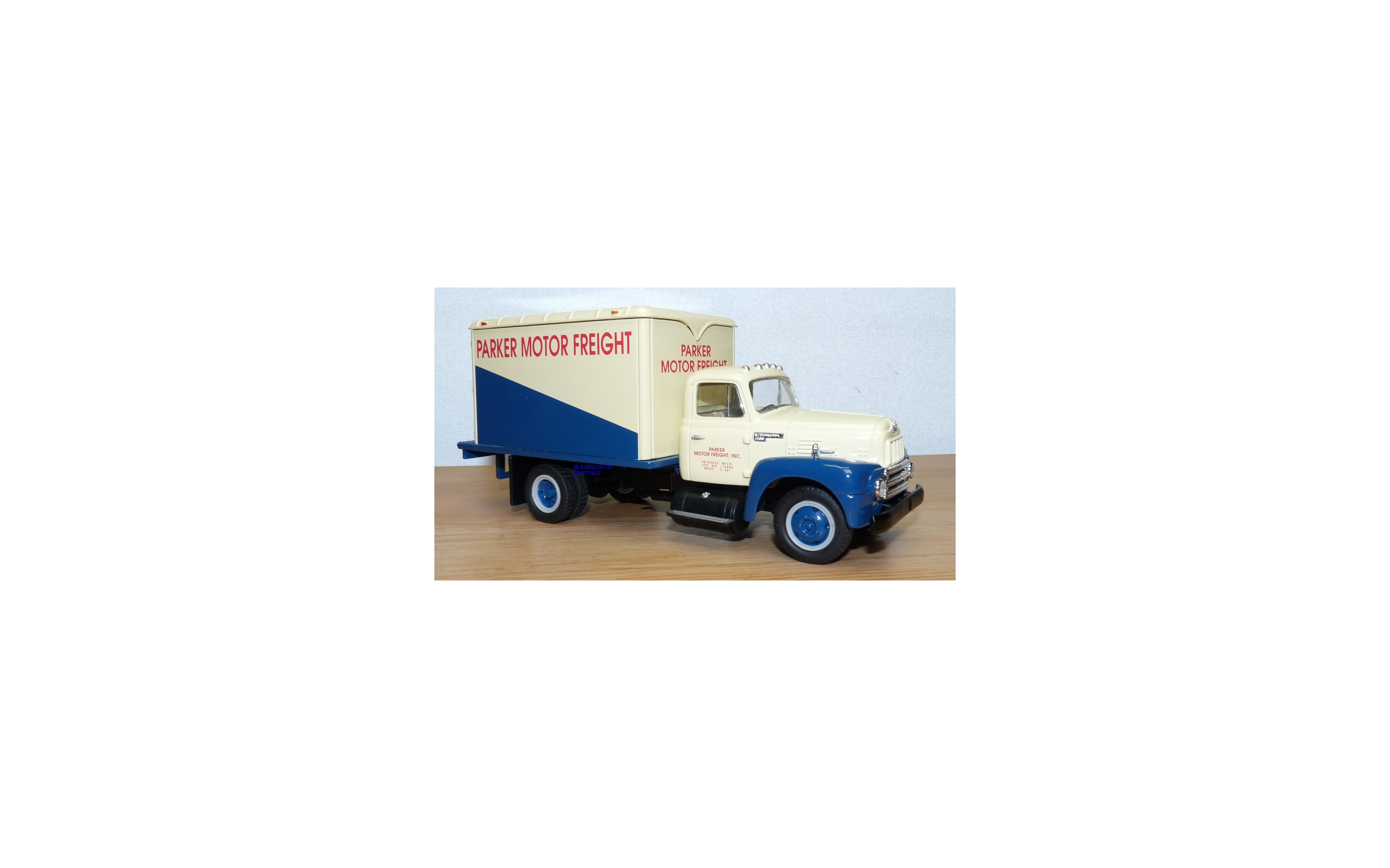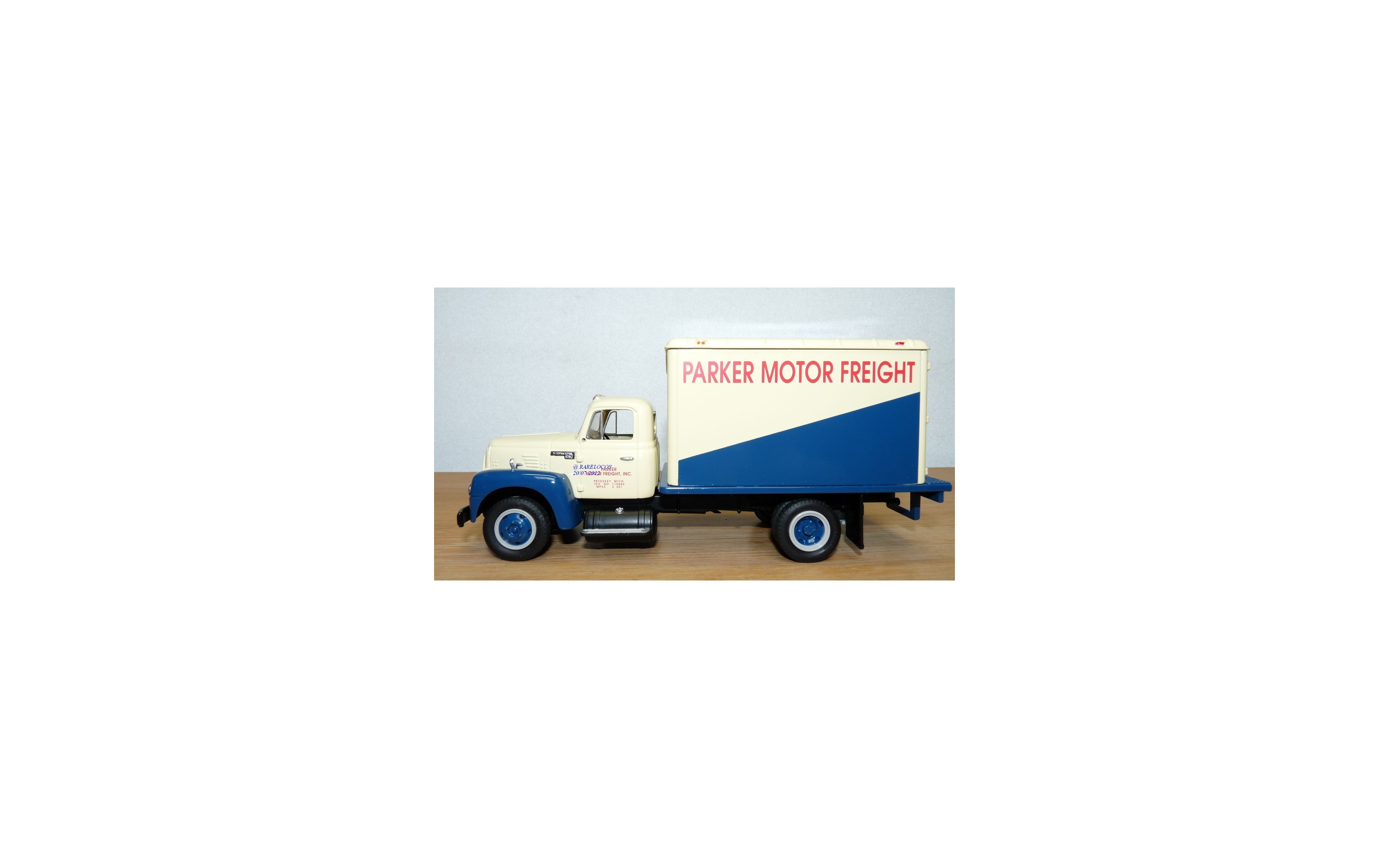 Modèle réduit d'un camion de livraison INTERNATIONAL R-190 de 1957 aux couleurs de PARKER MOTOR FREIGHT, tout en métal, boîte d'origine en état neuf.