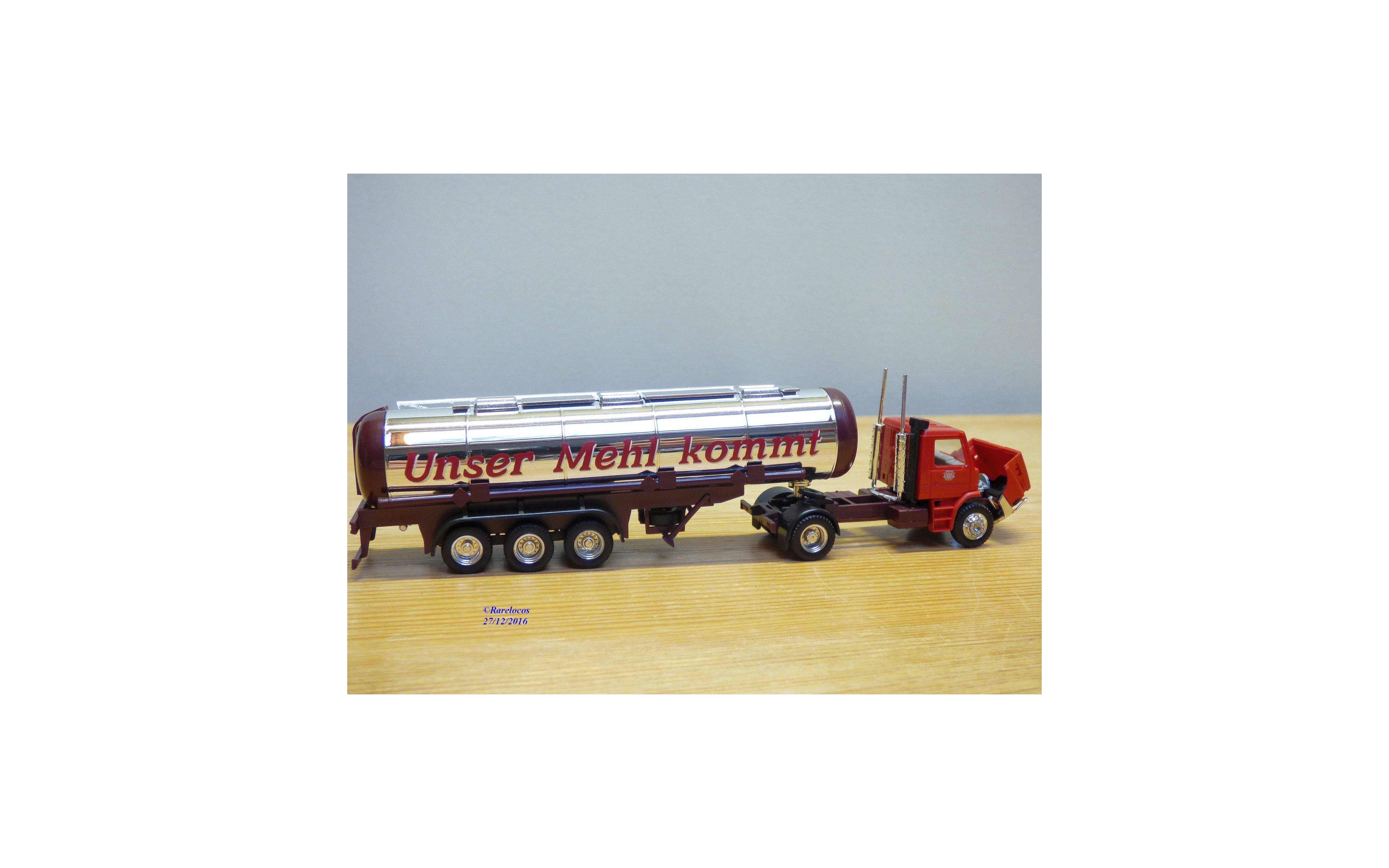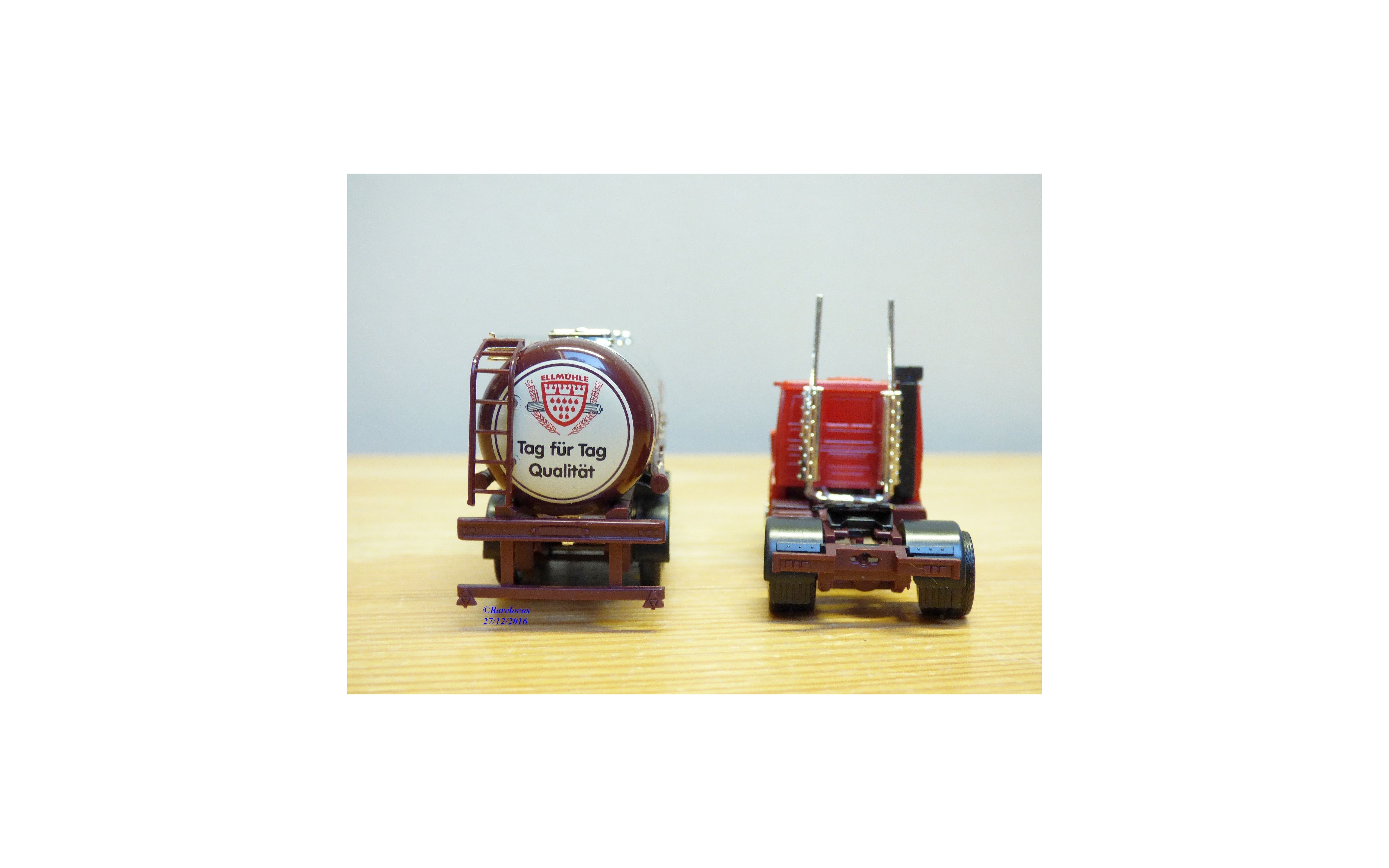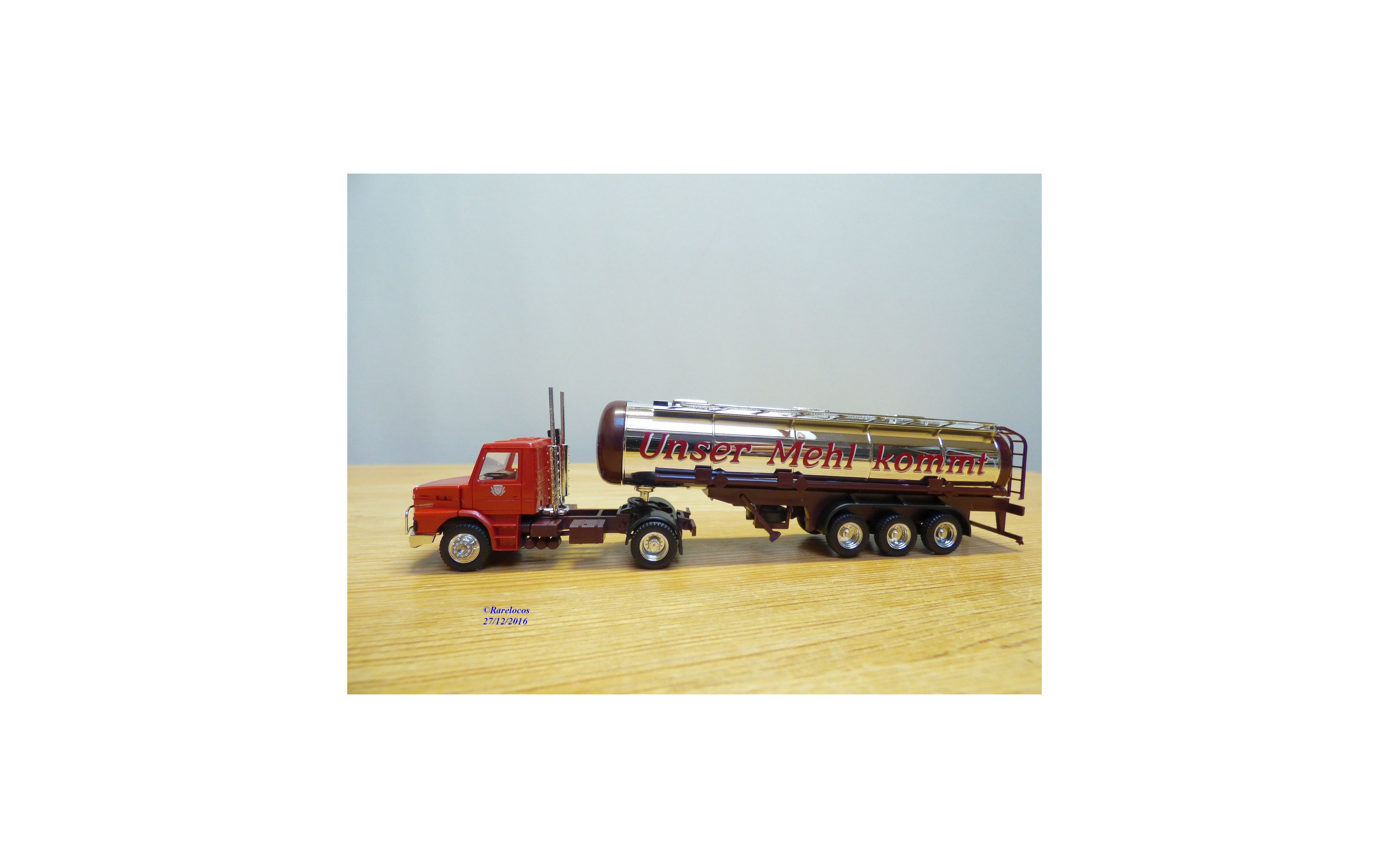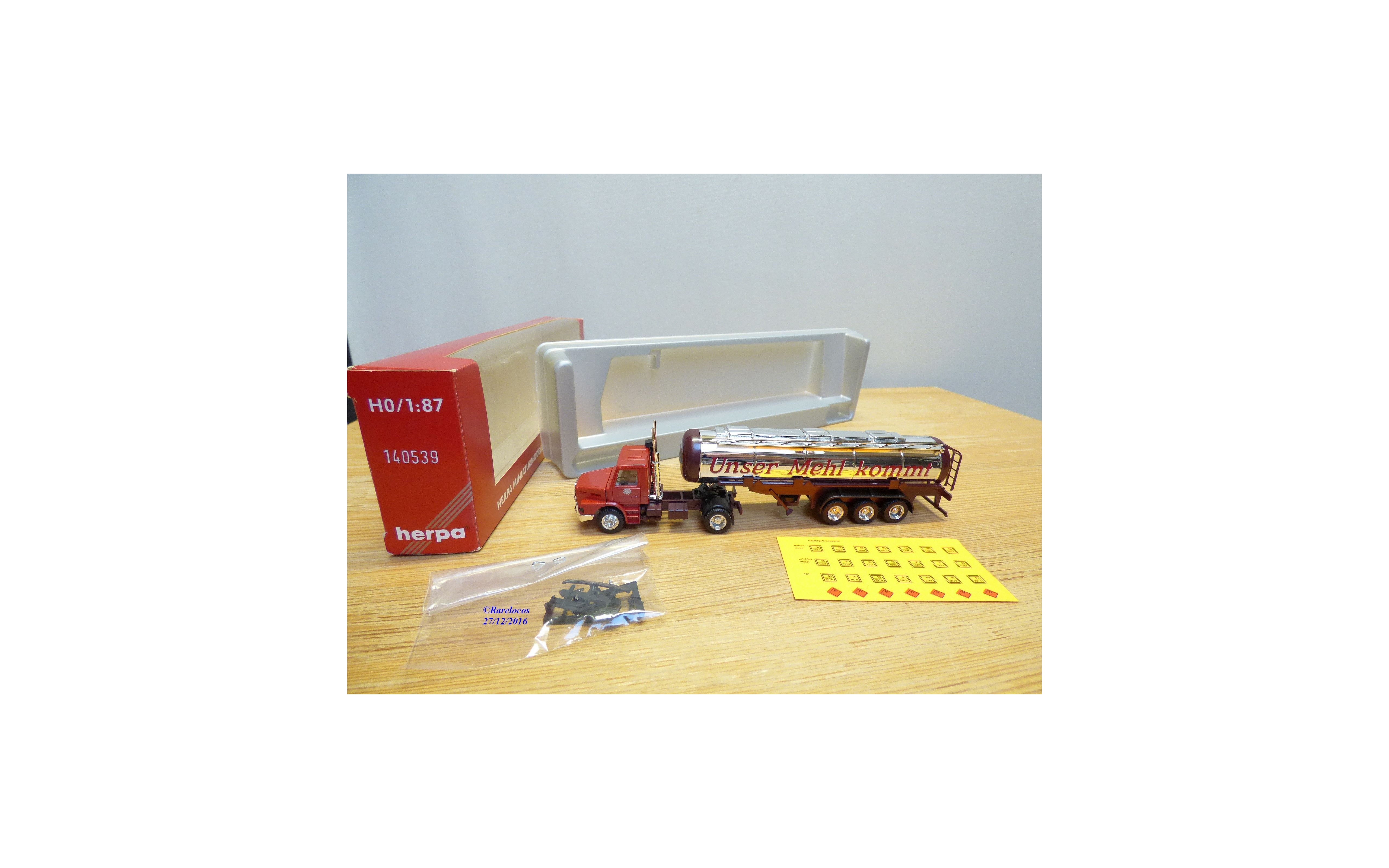 Rare modèle réduit au 1/87 ème ( HO ) d'un tracteur SCANIA et d'une semi remorque citerne à 3 essieux avec marquages ELLMÜHLE Unser Mehl kommt , pièces de détaillage encore scellées, décalcomanies intactes, boîte d'origine en excellent état.