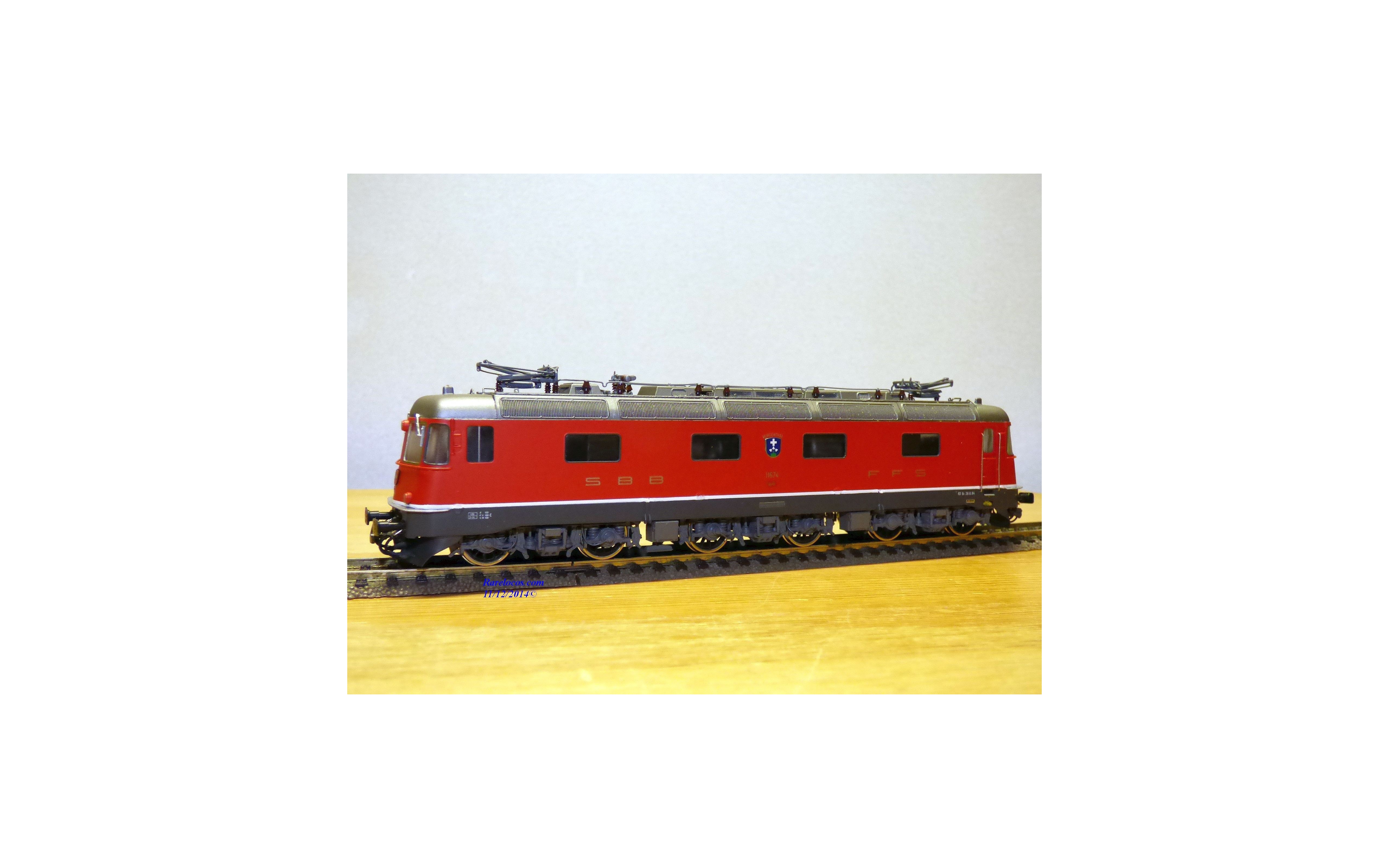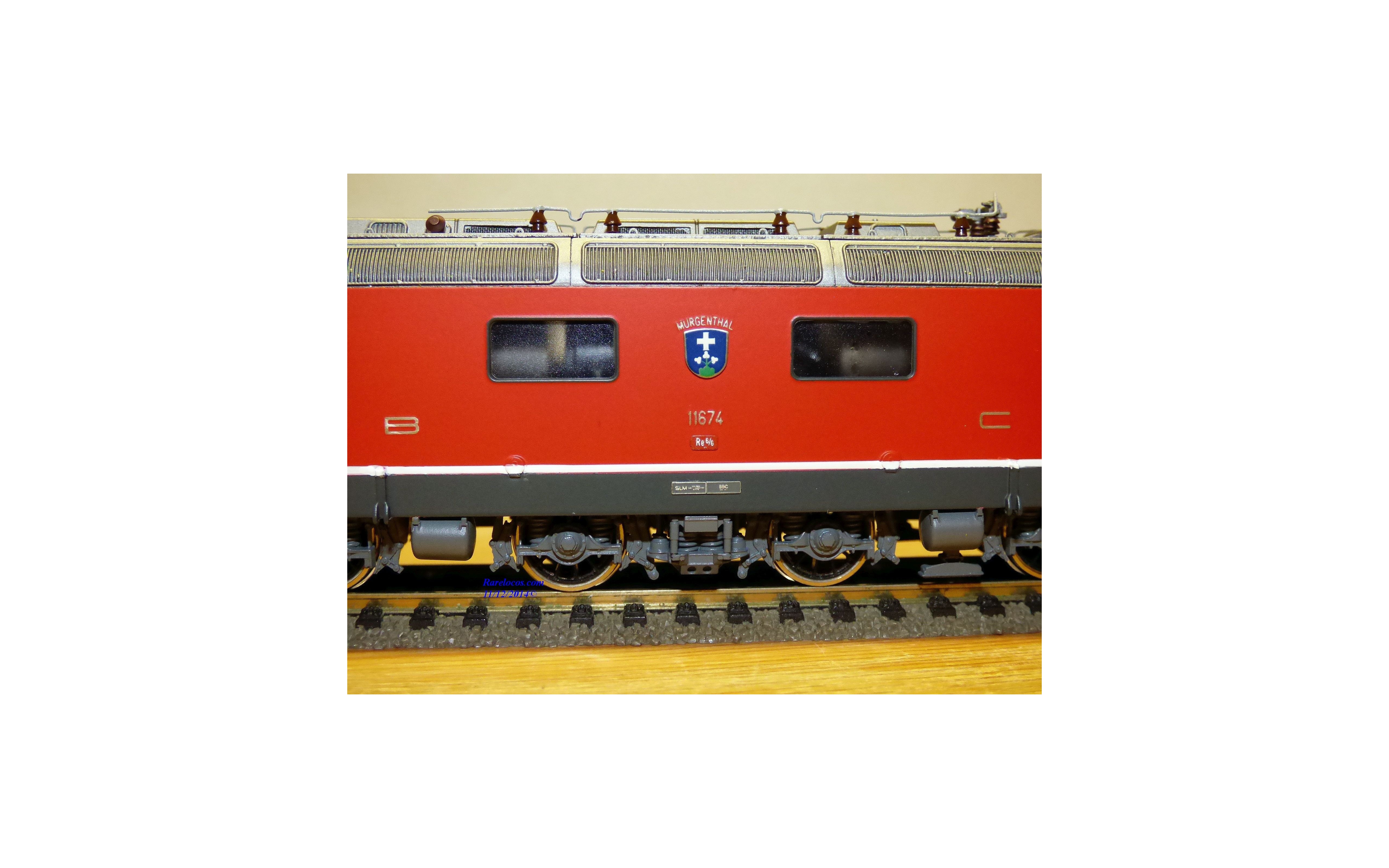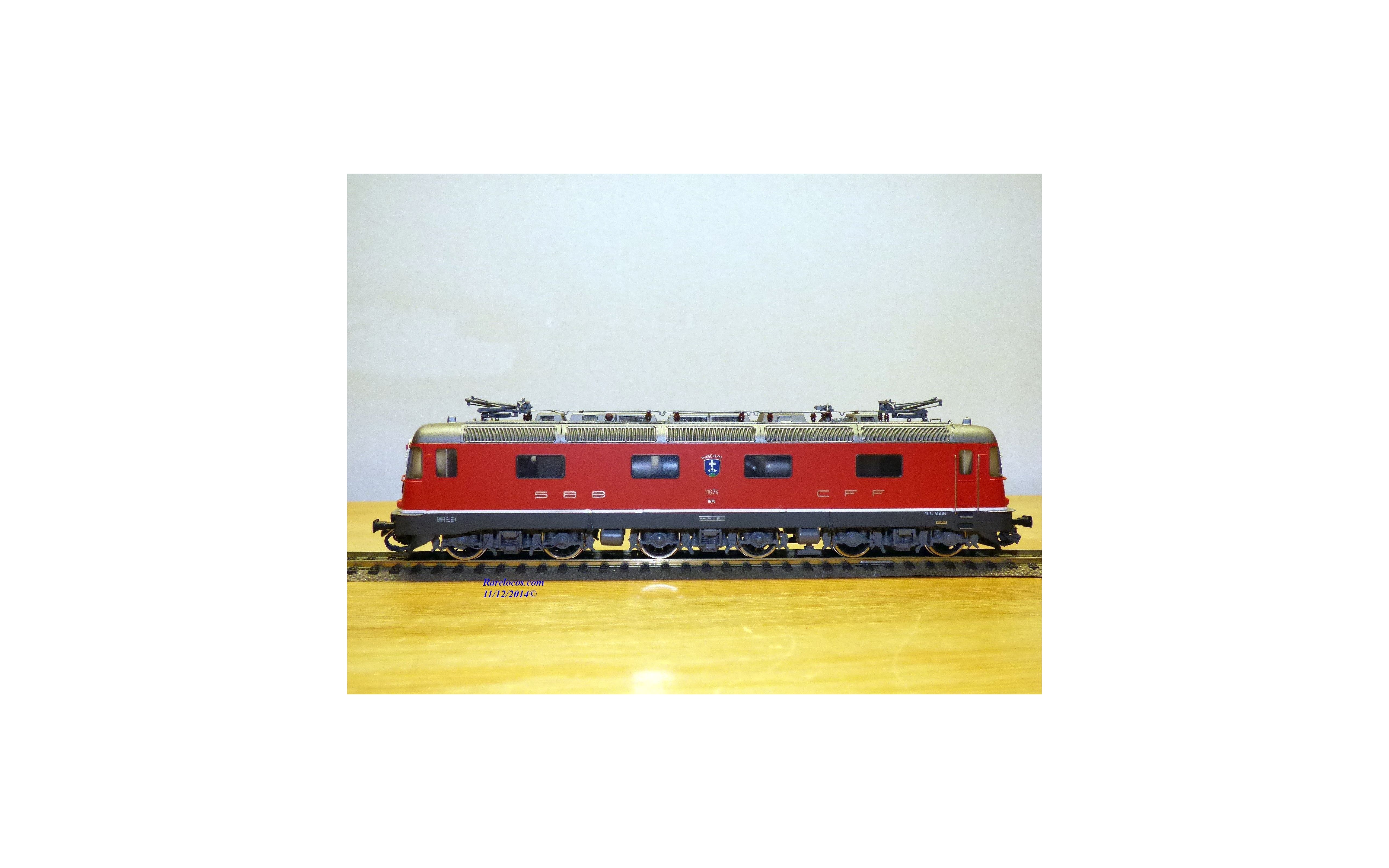 Rare motrice Bo Bo Bo série Re 6/6 des chemins de fer suisses ( SBB/CFF/FFS), laiton peint, livrée rouge vif , immatriculation : 11674 avec blason de la ville de Murgenthal, pièces de détaillage présentes, notice présente, boîte d'origine en excellent état.