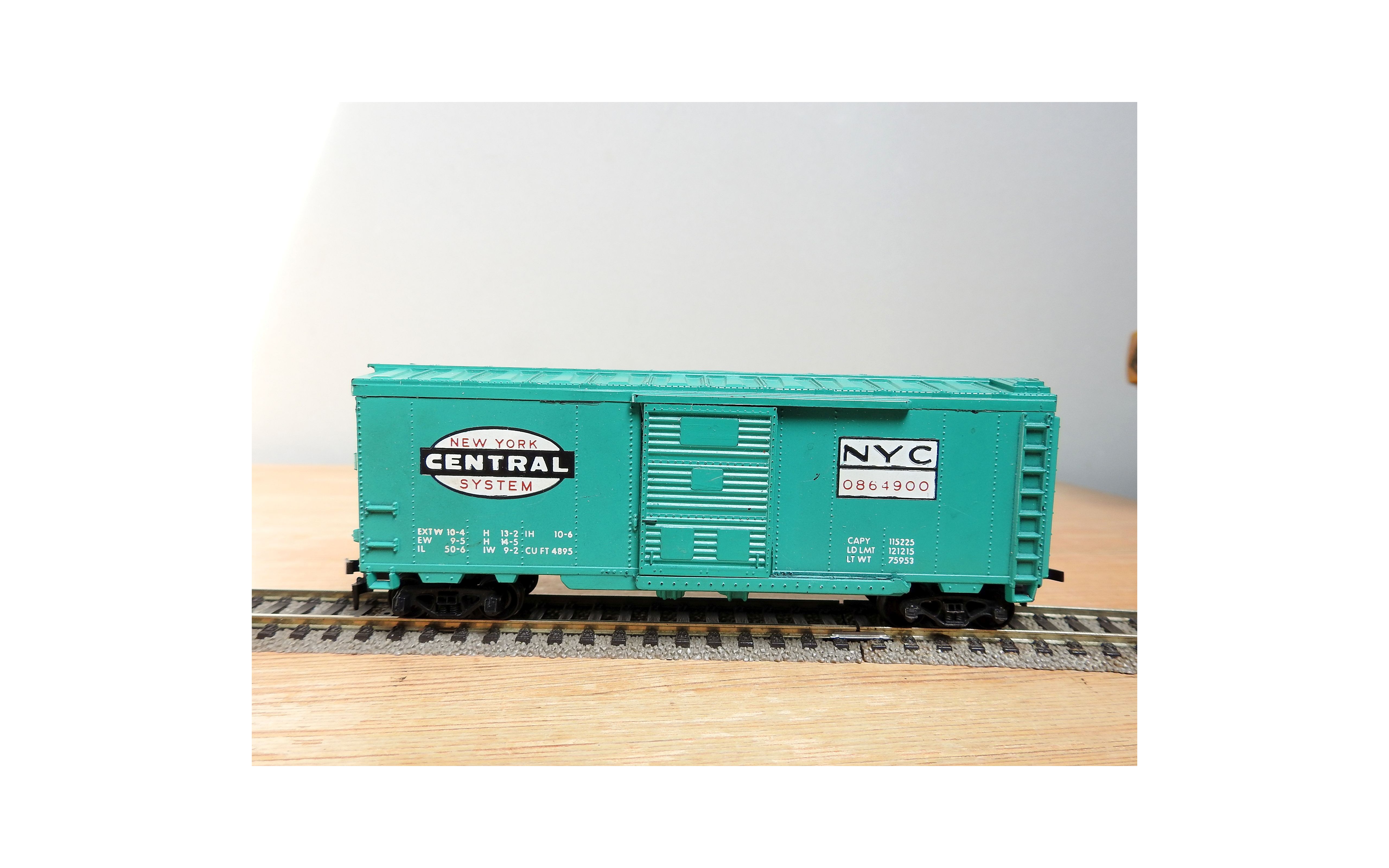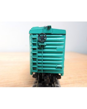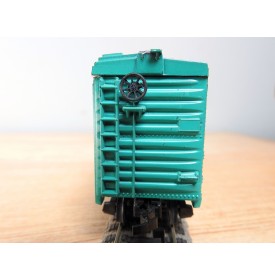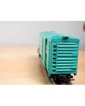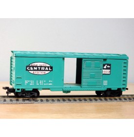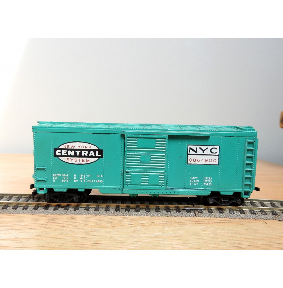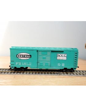 Modèle réduit à l' échelle HO d'un wagon couvert américain ( steel boxcar ) du New York Central, portes coulissantes fonctionnelles, livrée vert pâle, pas de boîte d' origine.