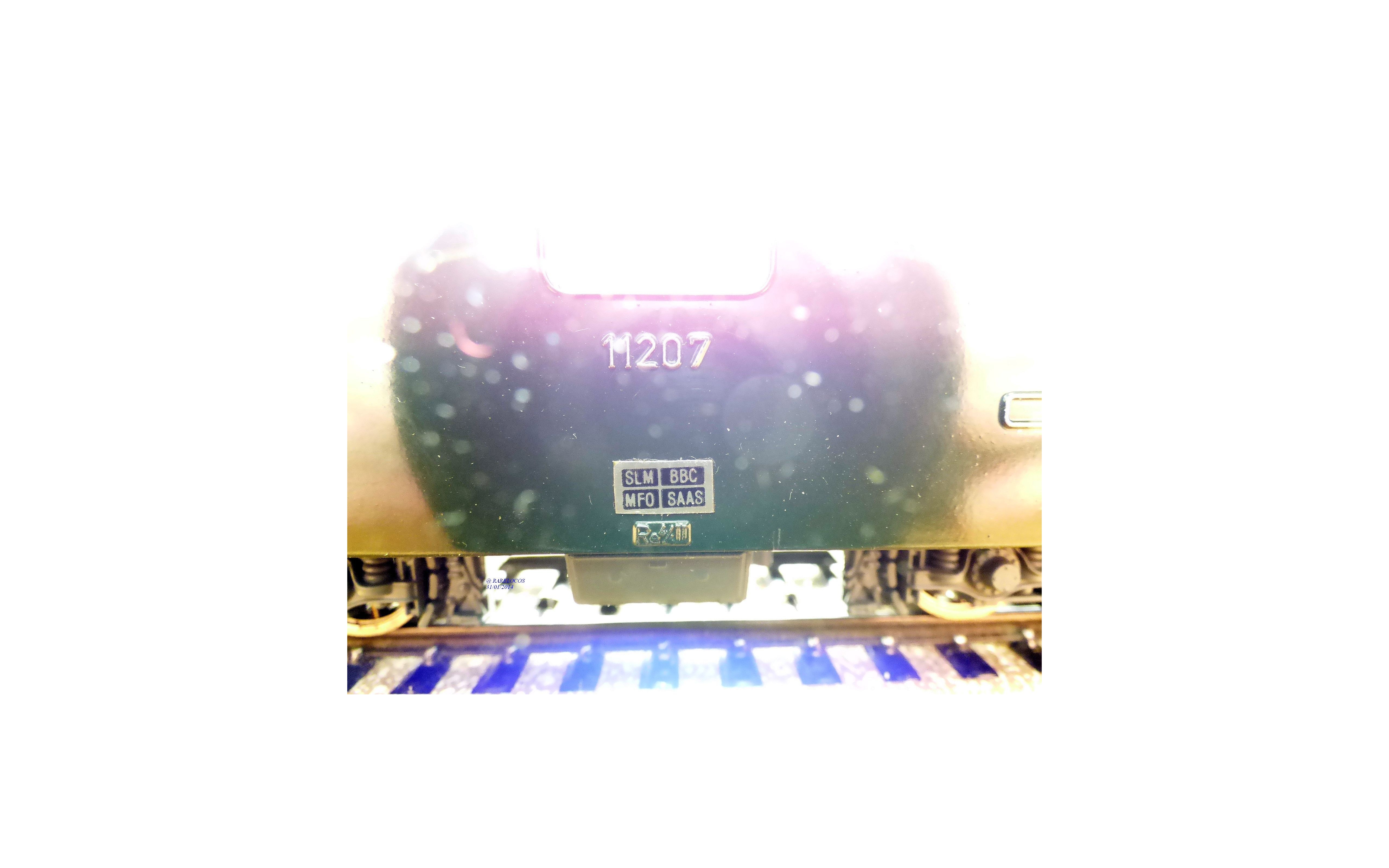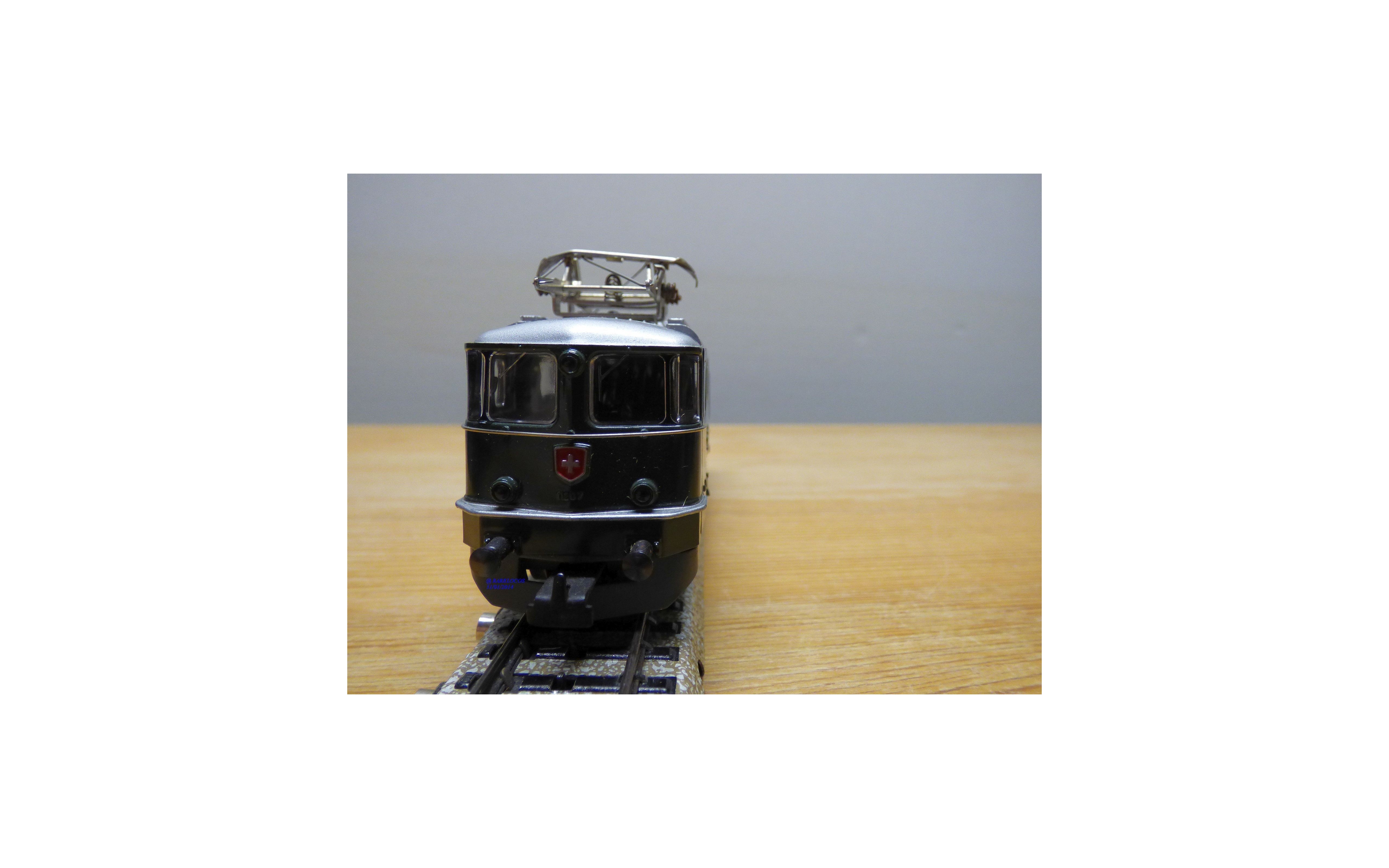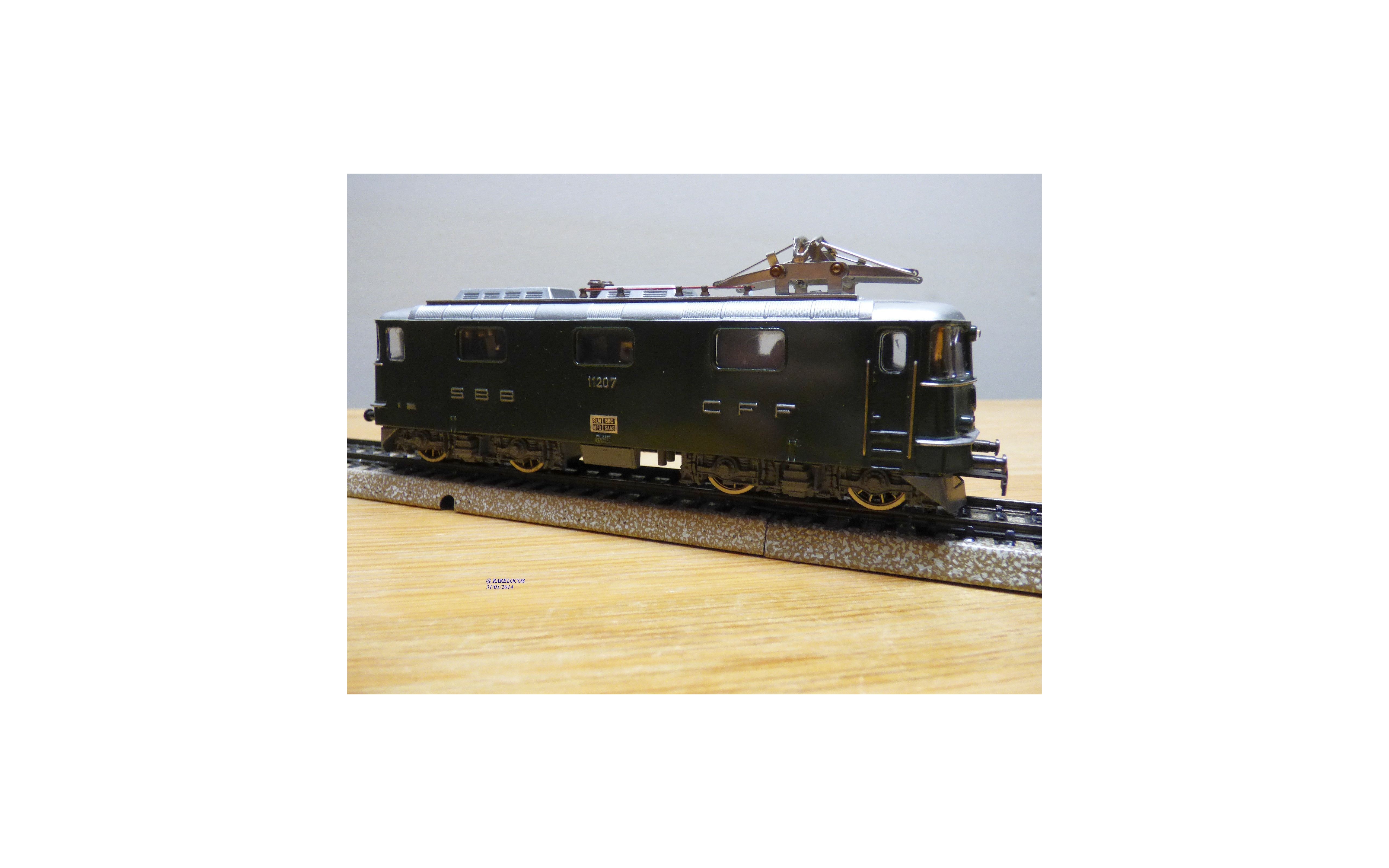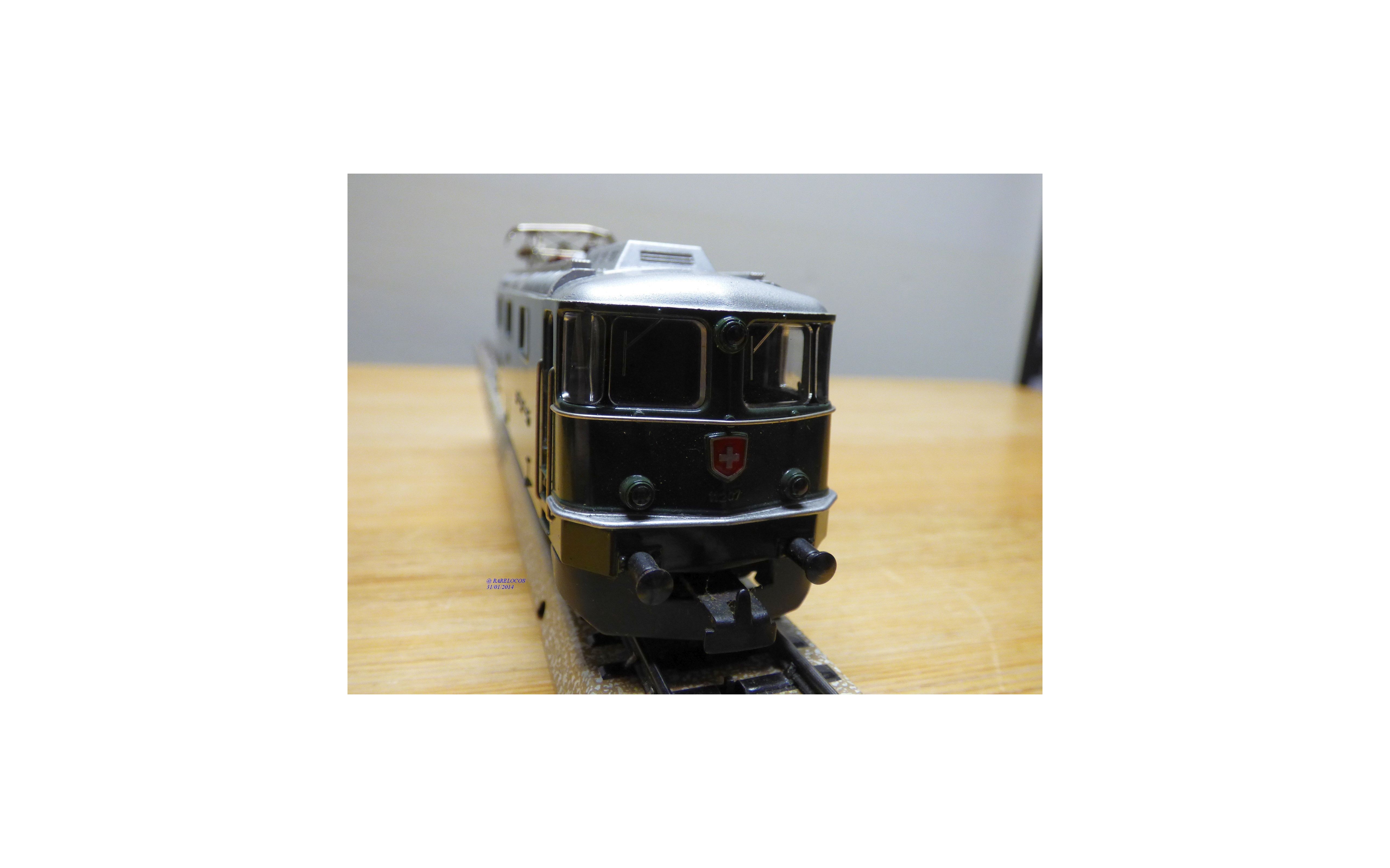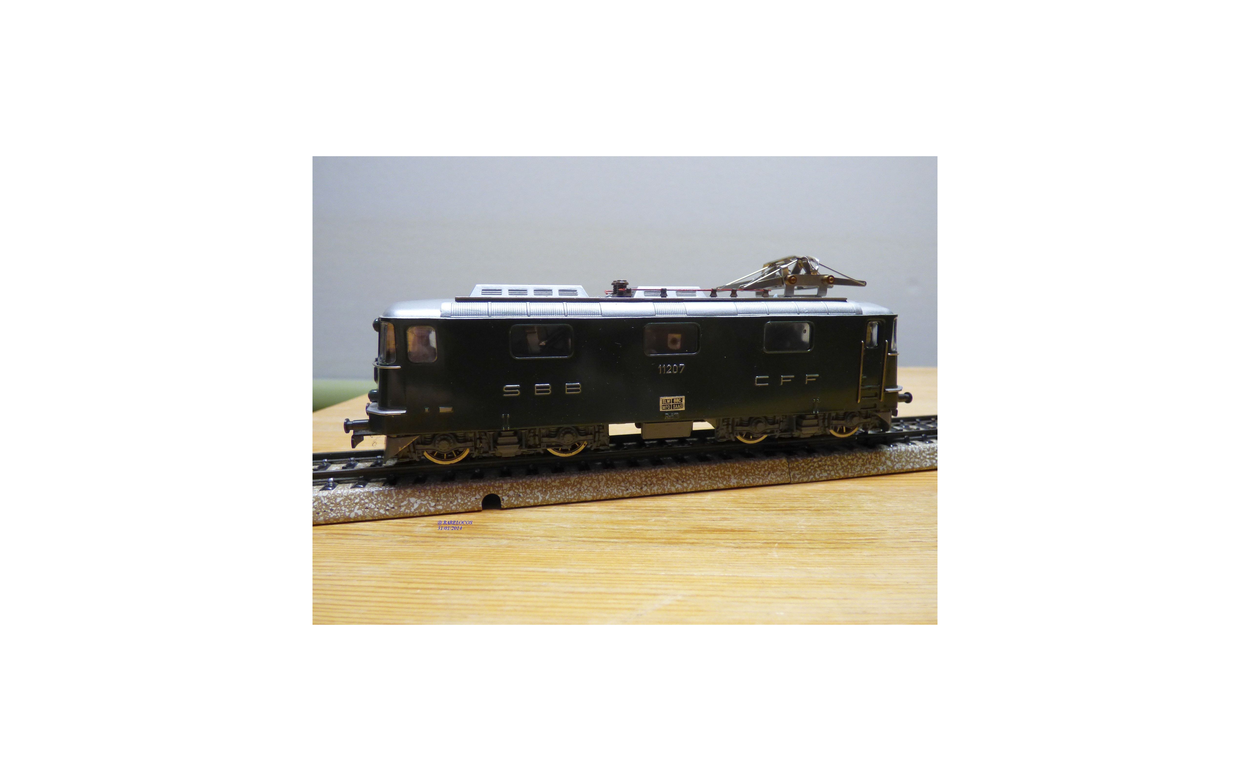 Motrice monopantographe Bo Bo série Re 4/4 II des chemins de fer suisses ( SBB/CFF/FFS), tout en métal, prise de courant par rails et caténaires testée OK, livrée vert sapin à toit gris argent, immatriculation : 11207, boîte d'origine en état neuf.