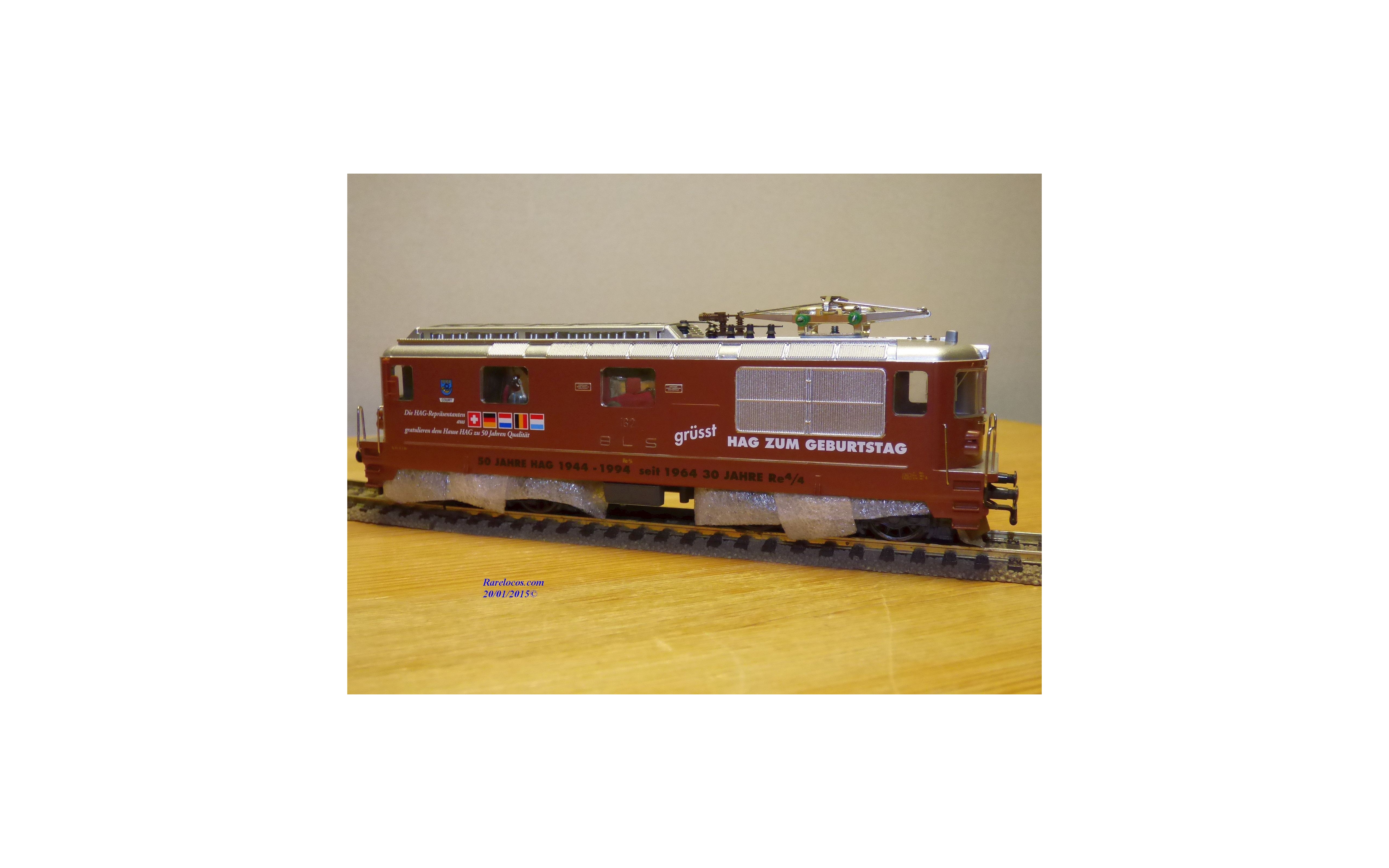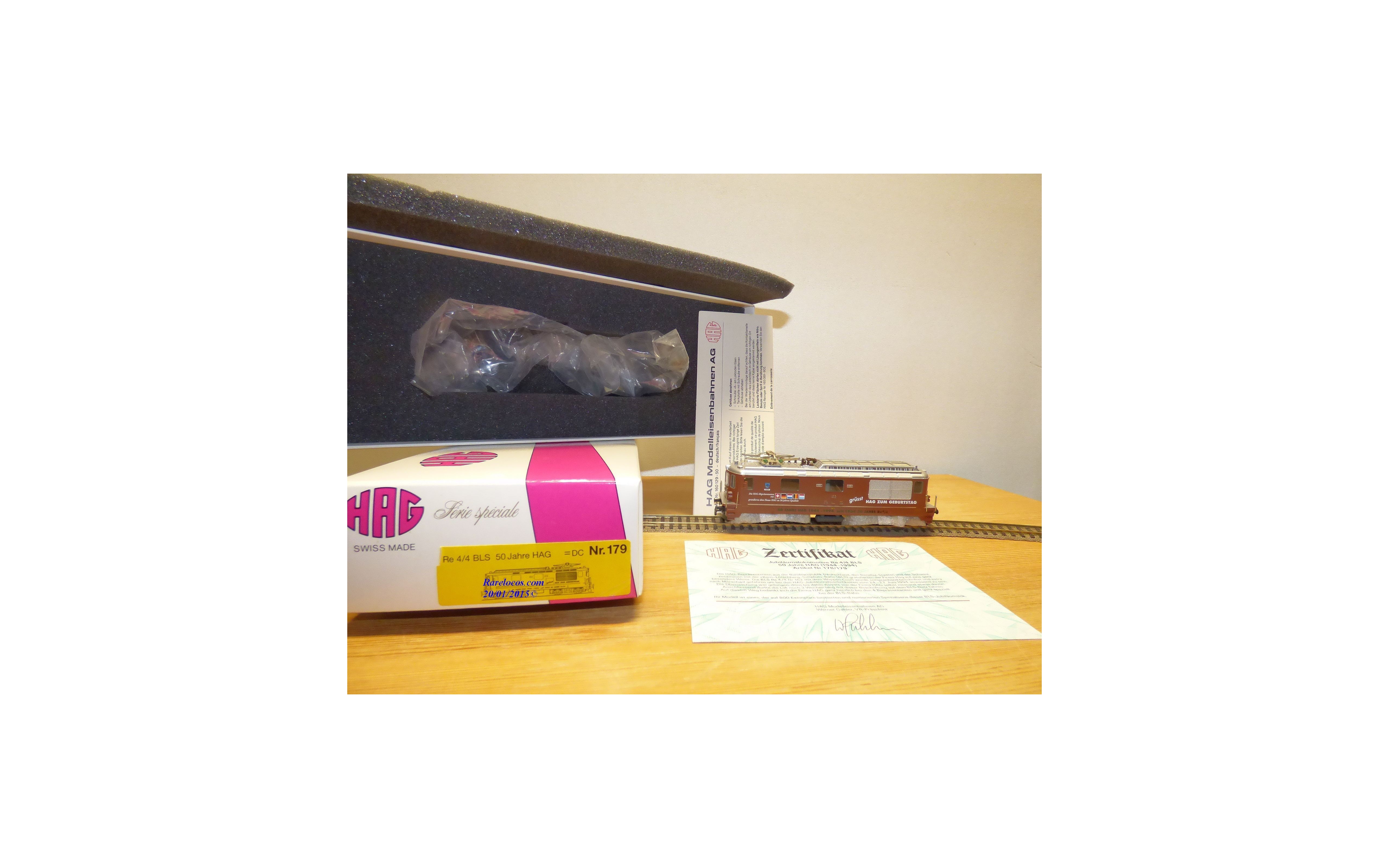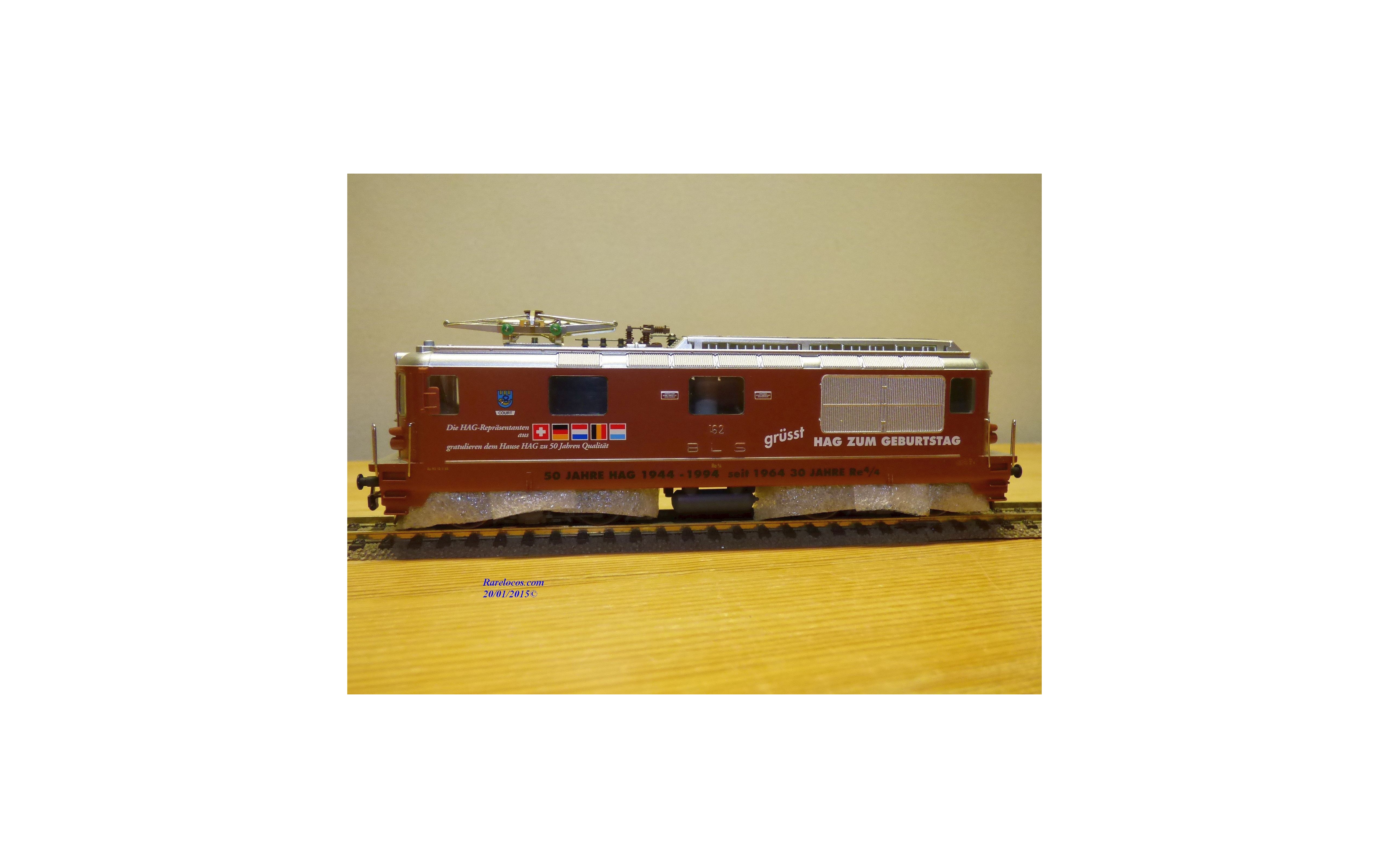 Motrice Bo Bo monopantographe série Re 4/4 des chemins de fer suisses ( BLS : Bern Lötschberg Simplon), tout en métal, livrée brune à toit gris argent, décoration spécifique à l'occasion du cinquantenaire de HAG, prise de courant par rails ou caténaires, immatriculation : 162, blason de la ville de Court, notice et certificat présents, boîte d'origine en état neuf.