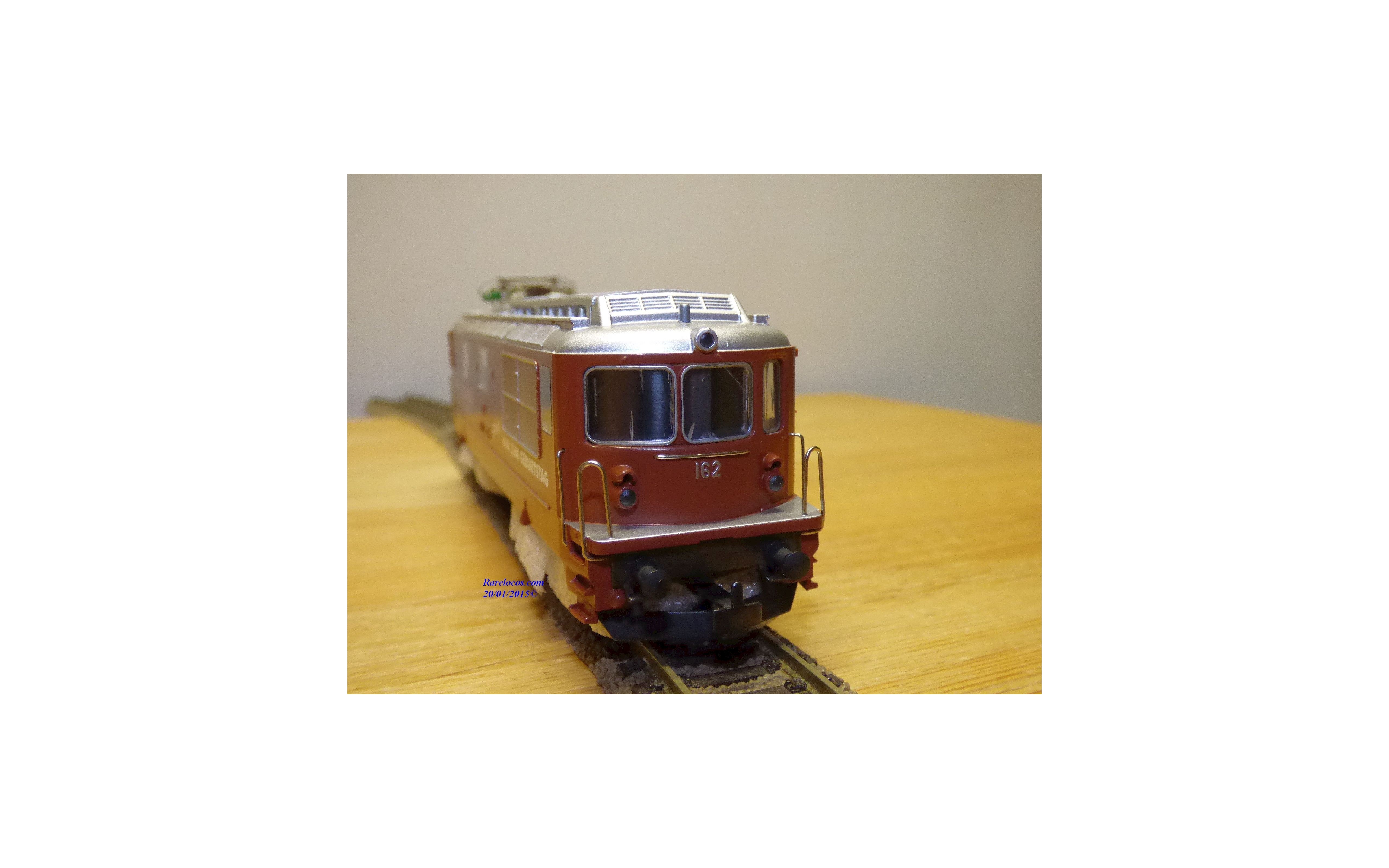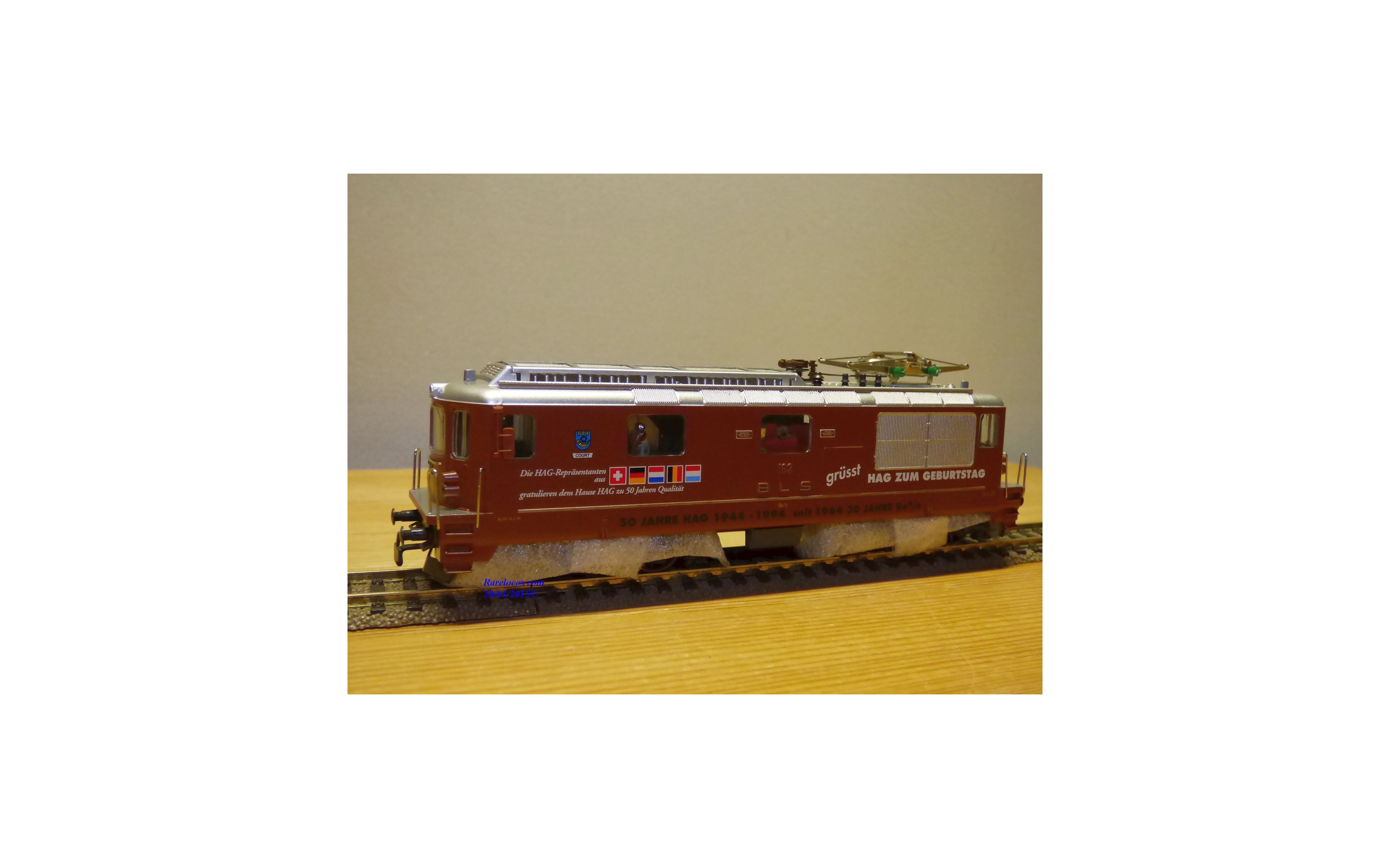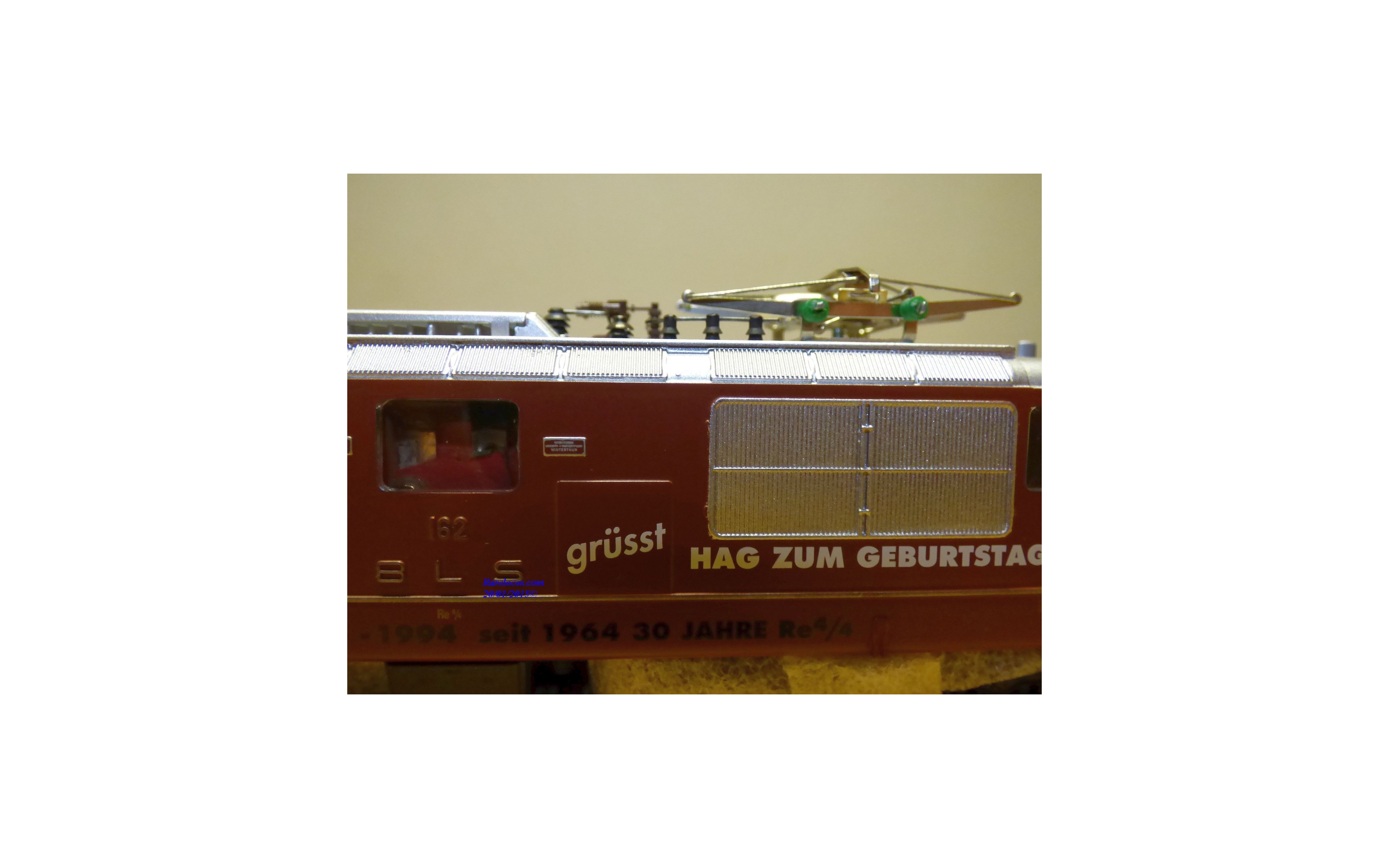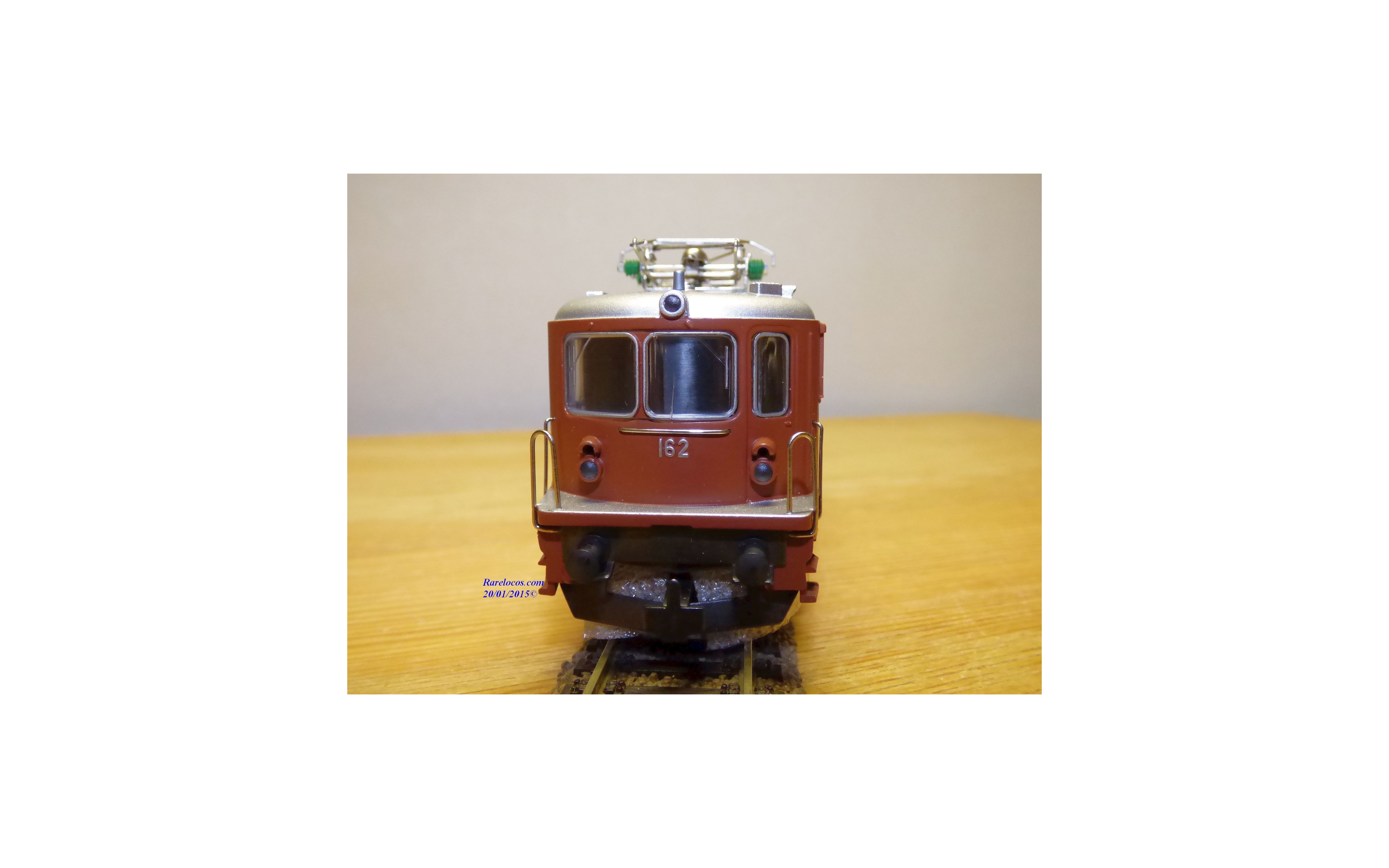 Motrice Bo Bo monopantographe série Re 4/4 des chemins de fer suisses ( BLS : Bern Lötschberg Simplon), tout en métal, livrée brune à toit gris argent, décoration spécifique à l'occasion du cinquantenaire de HAG, prise de courant par rails ou caténaires, immatriculation : 162, blason de la ville de Court, notice et certificat présents, boîte d'origine en état neuf.