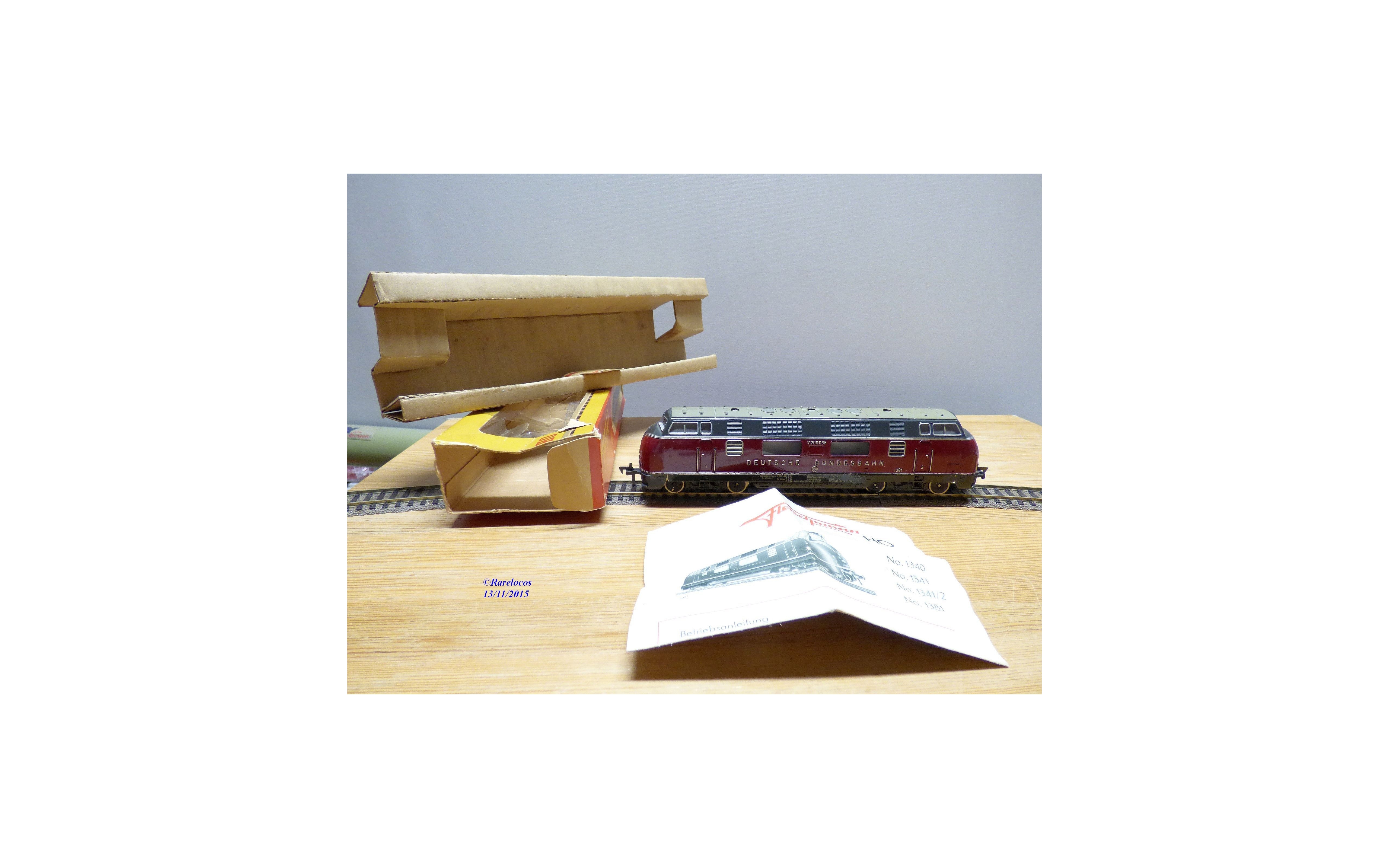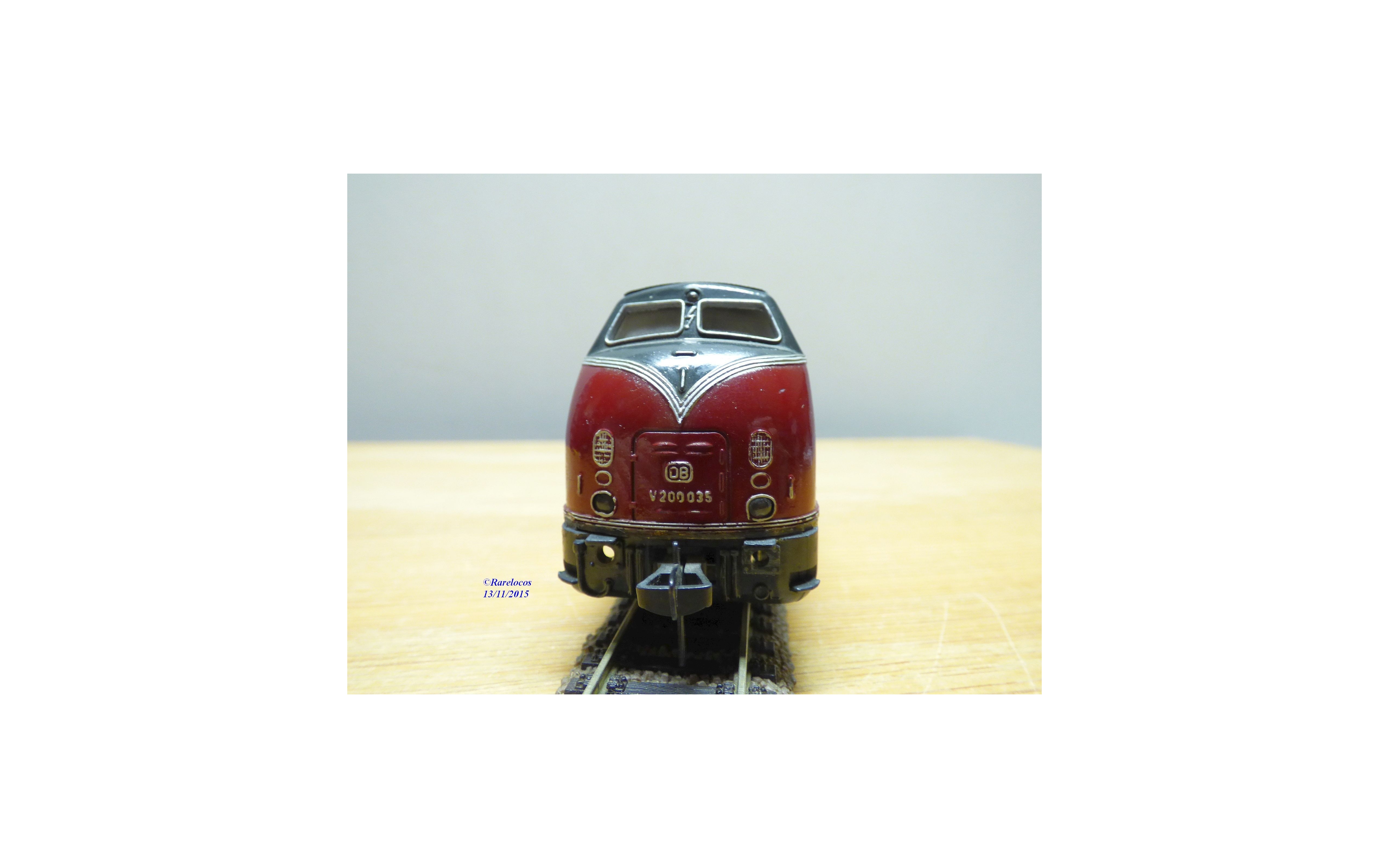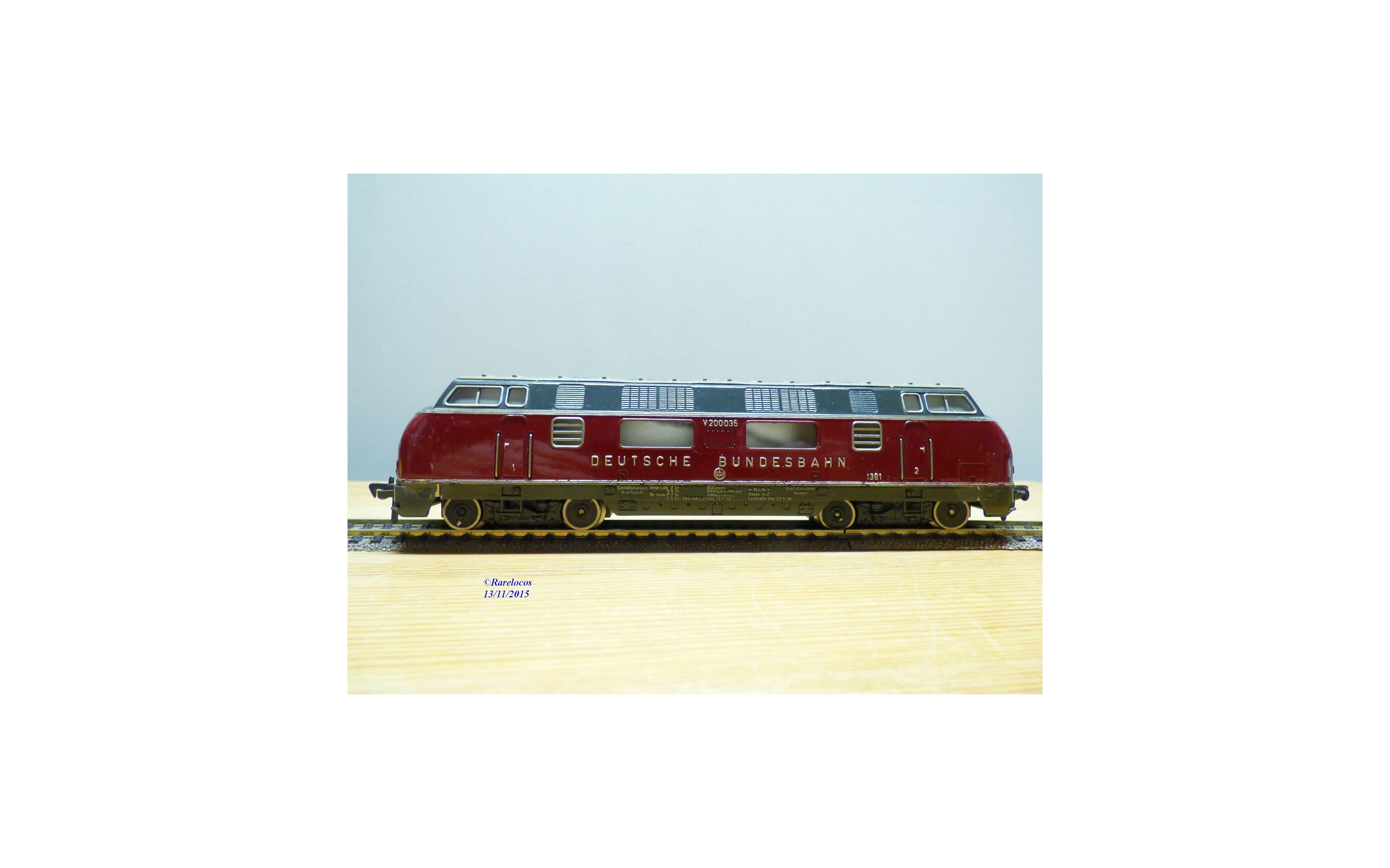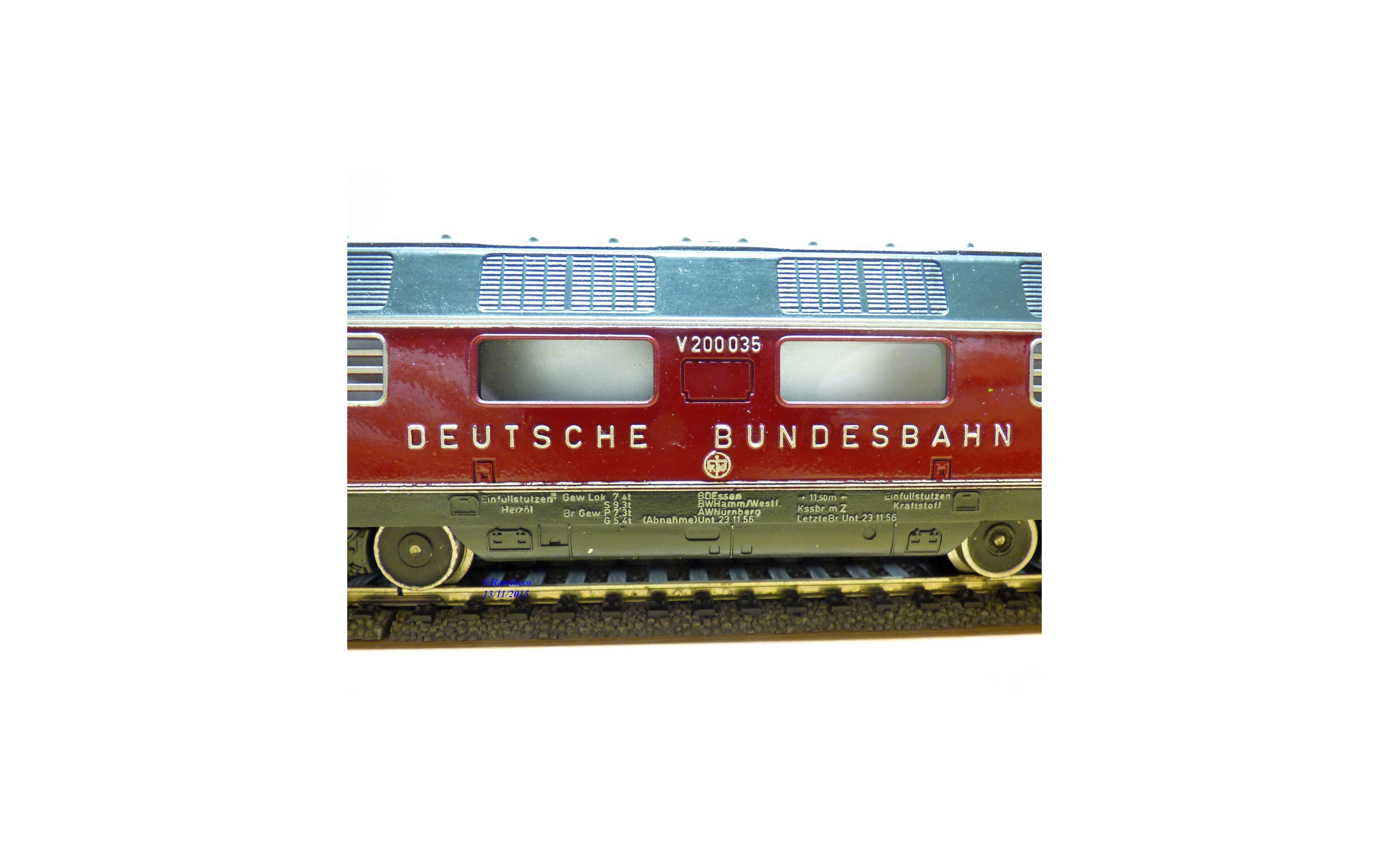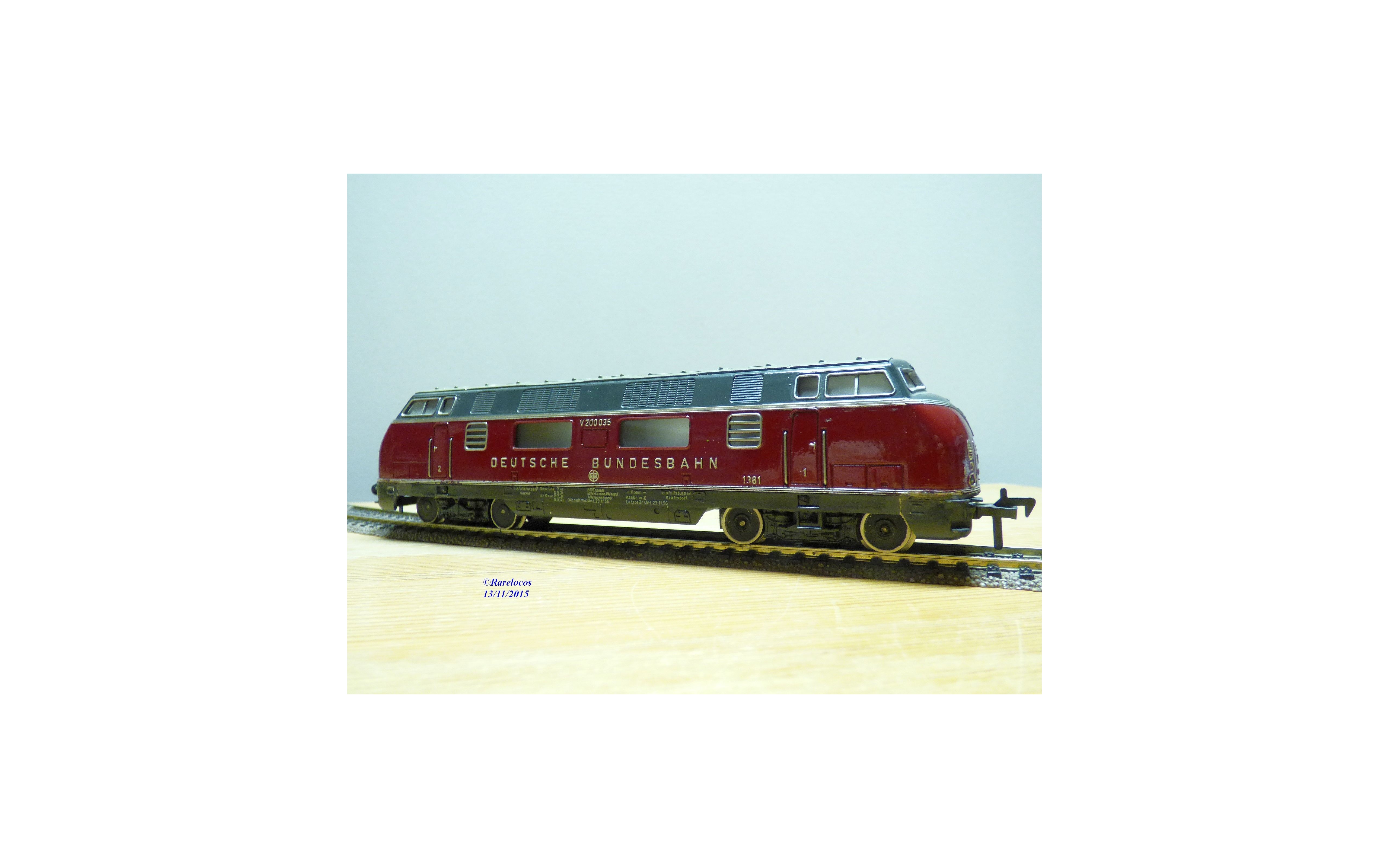 Loco diesel Bo Bo série V 200 des chemins de fer allemands ( DB ), tout en métal, livrée lie de vin et grise à toit jaune, immatriculations : V200035, notice présente, boîte d'origine bien fatiguée ( manque le rabat d'identification) .
