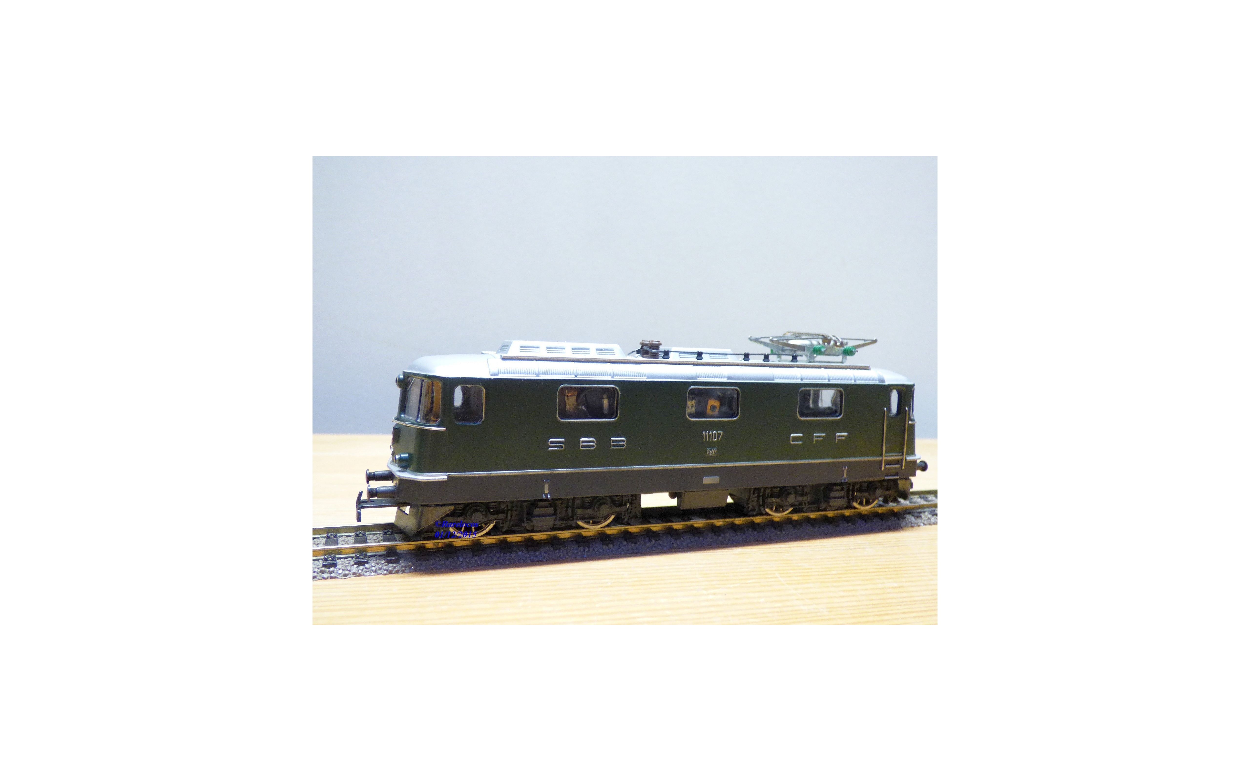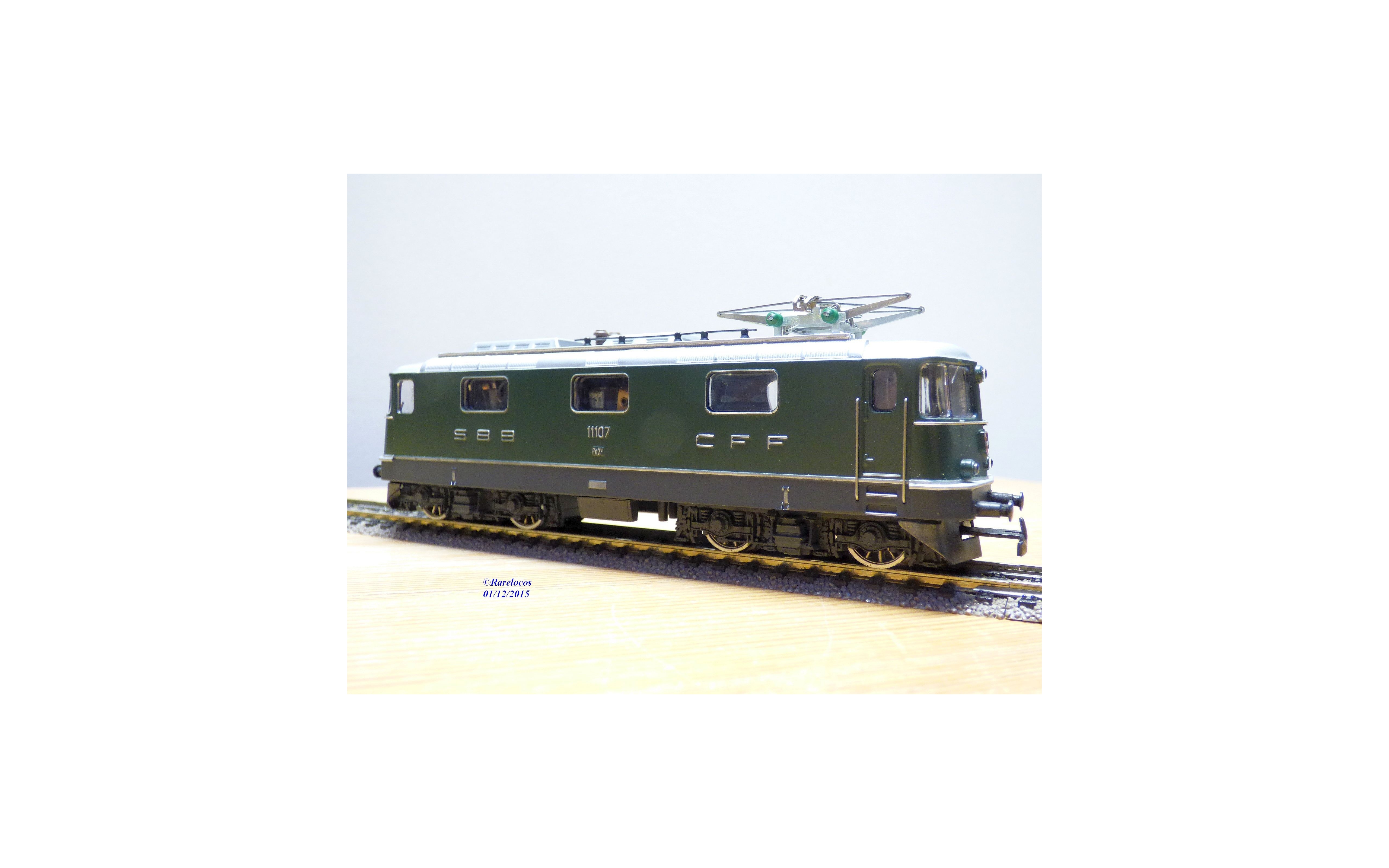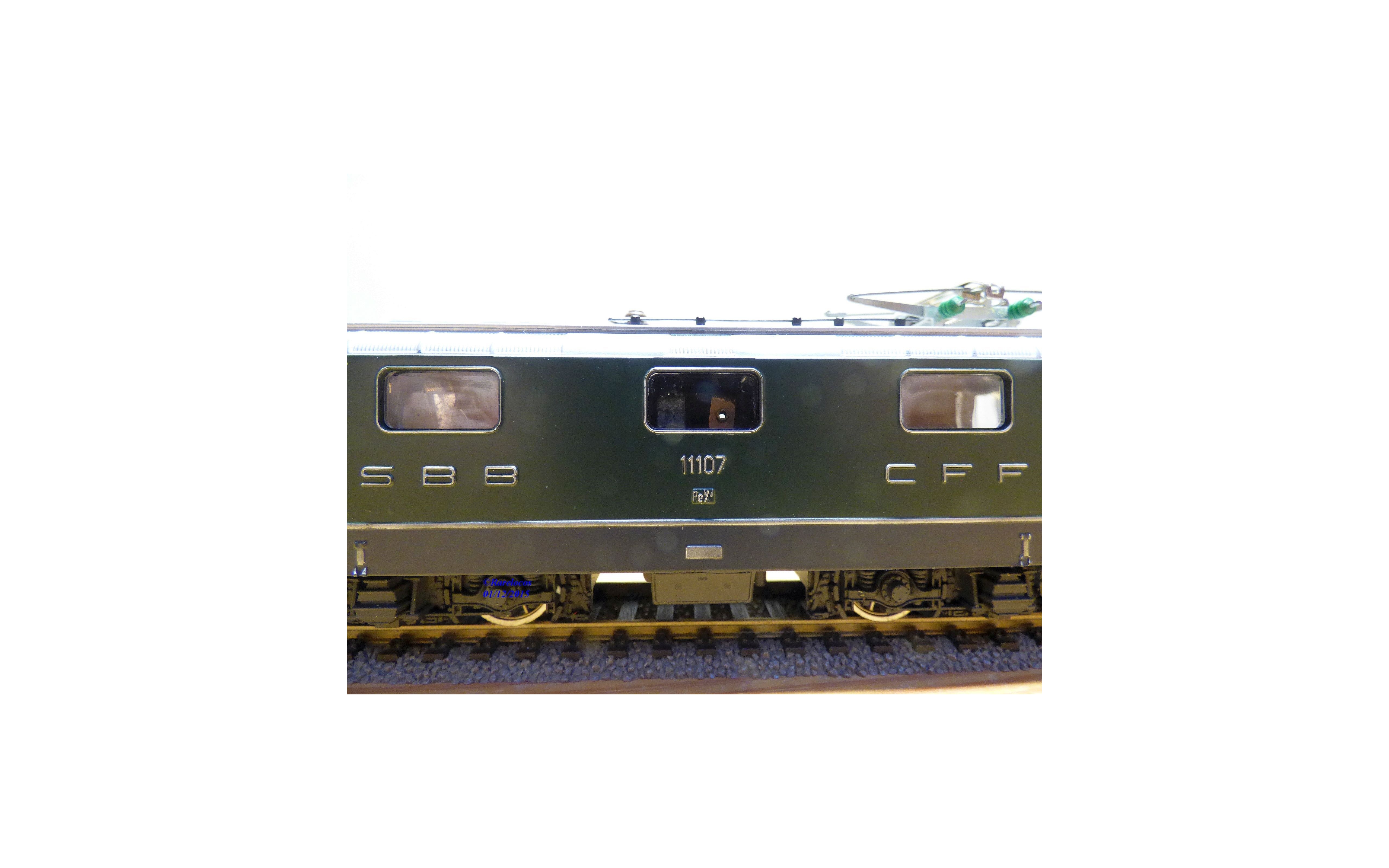 Motrice monopantographe Bo Bo série Re 4/4 II des chemins de fer suisses ( SBB/CFF/FFS), tout en métal, prise de courant par rails et caténaires testée OK, livrée vert sapin à toit gris argent, immatriculation : 11107, boîte d'origine en état neuf.