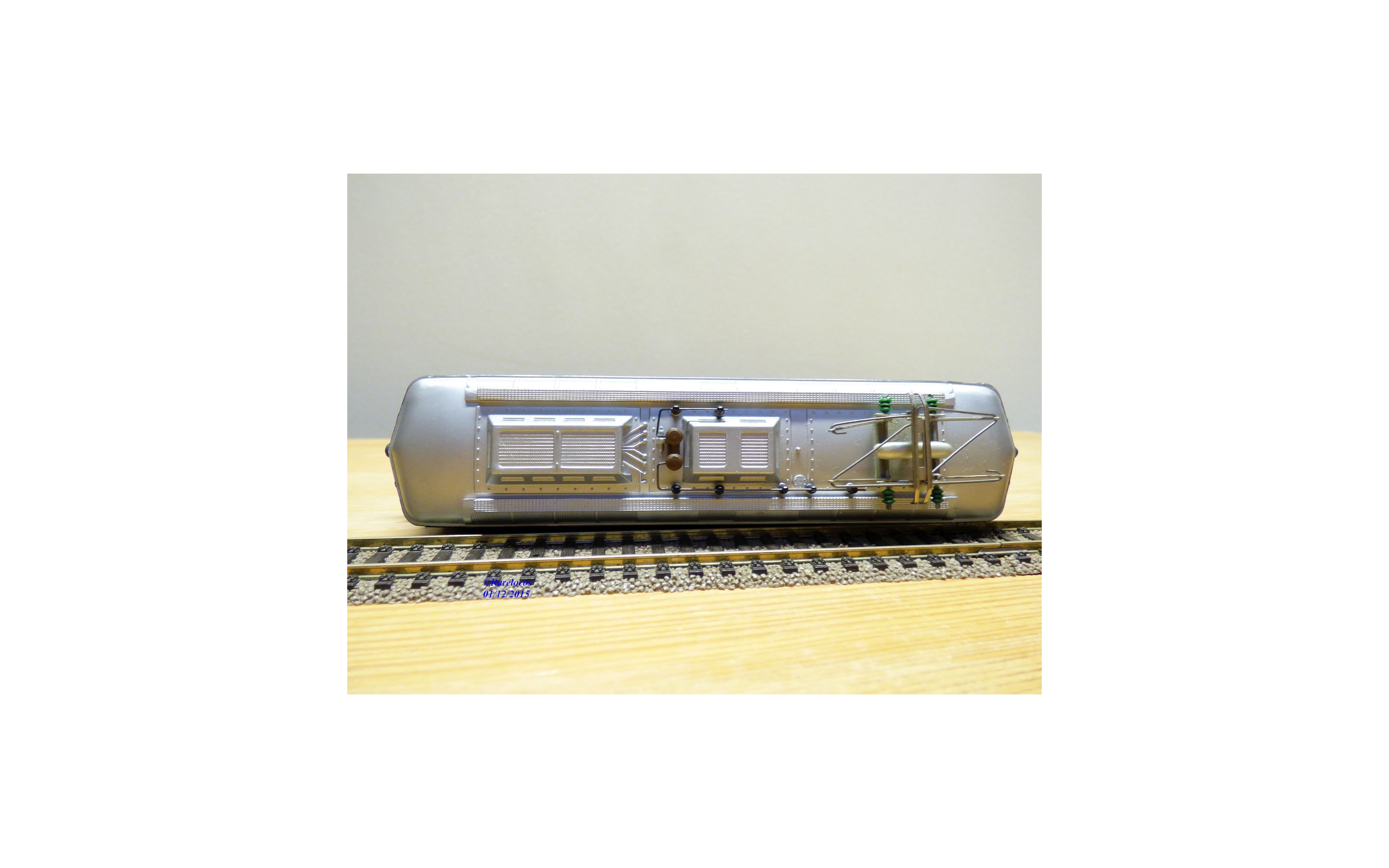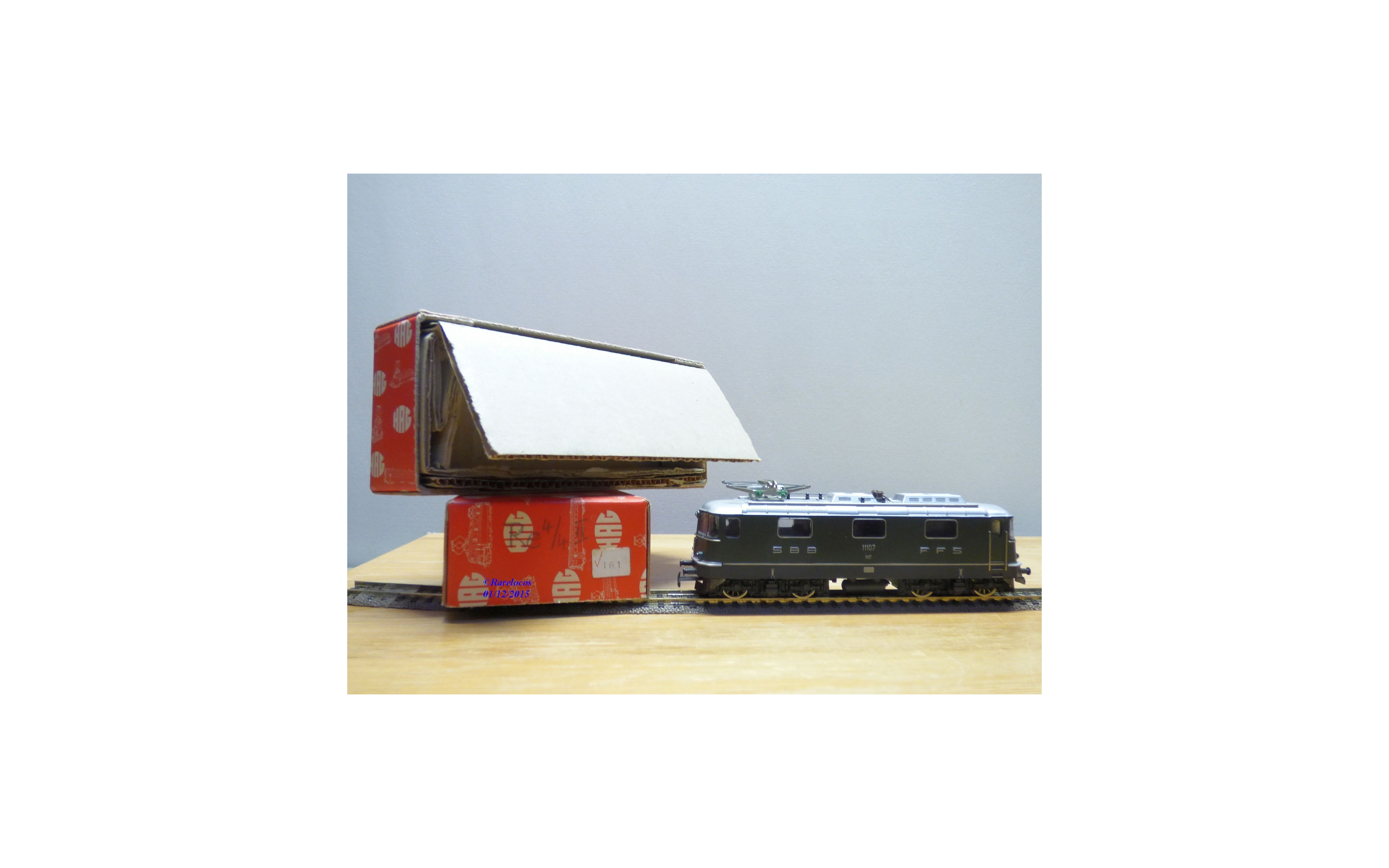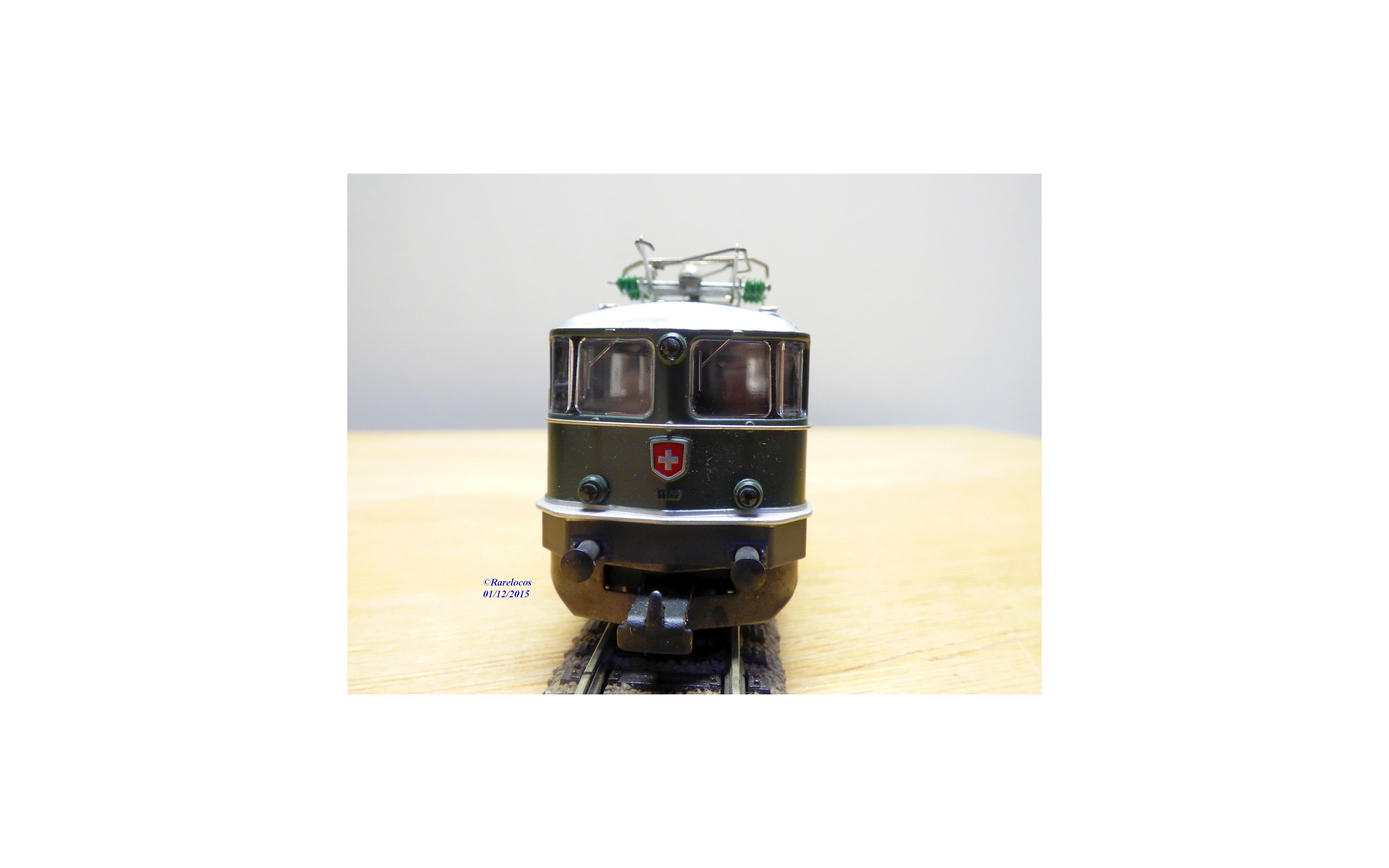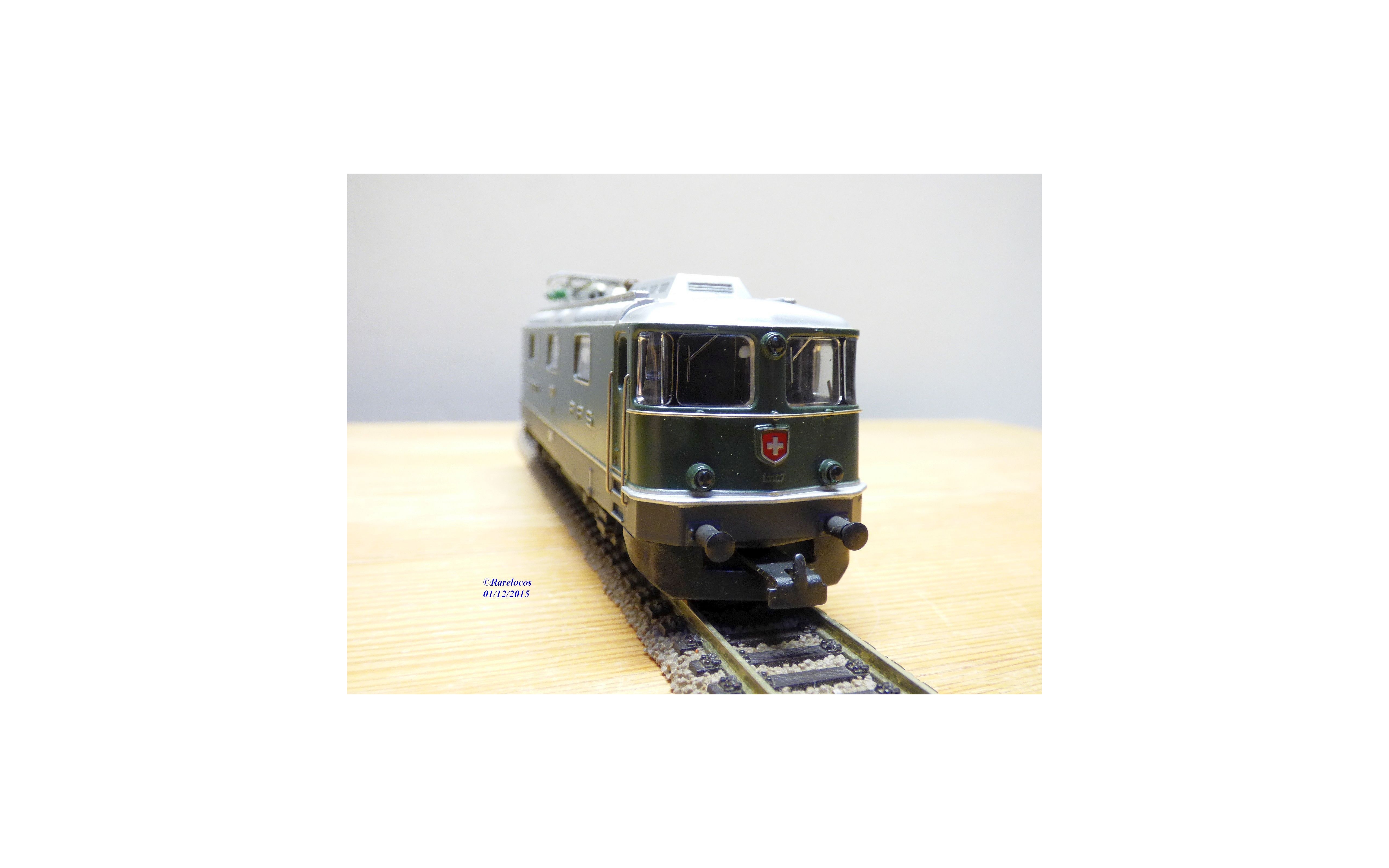 Motrice monopantographe Bo Bo série Re 4/4 II des chemins de fer suisses ( SBB/CFF/FFS), tout en métal, prise de courant par rails et caténaires testée OK, livrée vert sapin à toit gris argent, immatriculation : 11107, boîte d'origine en état neuf.