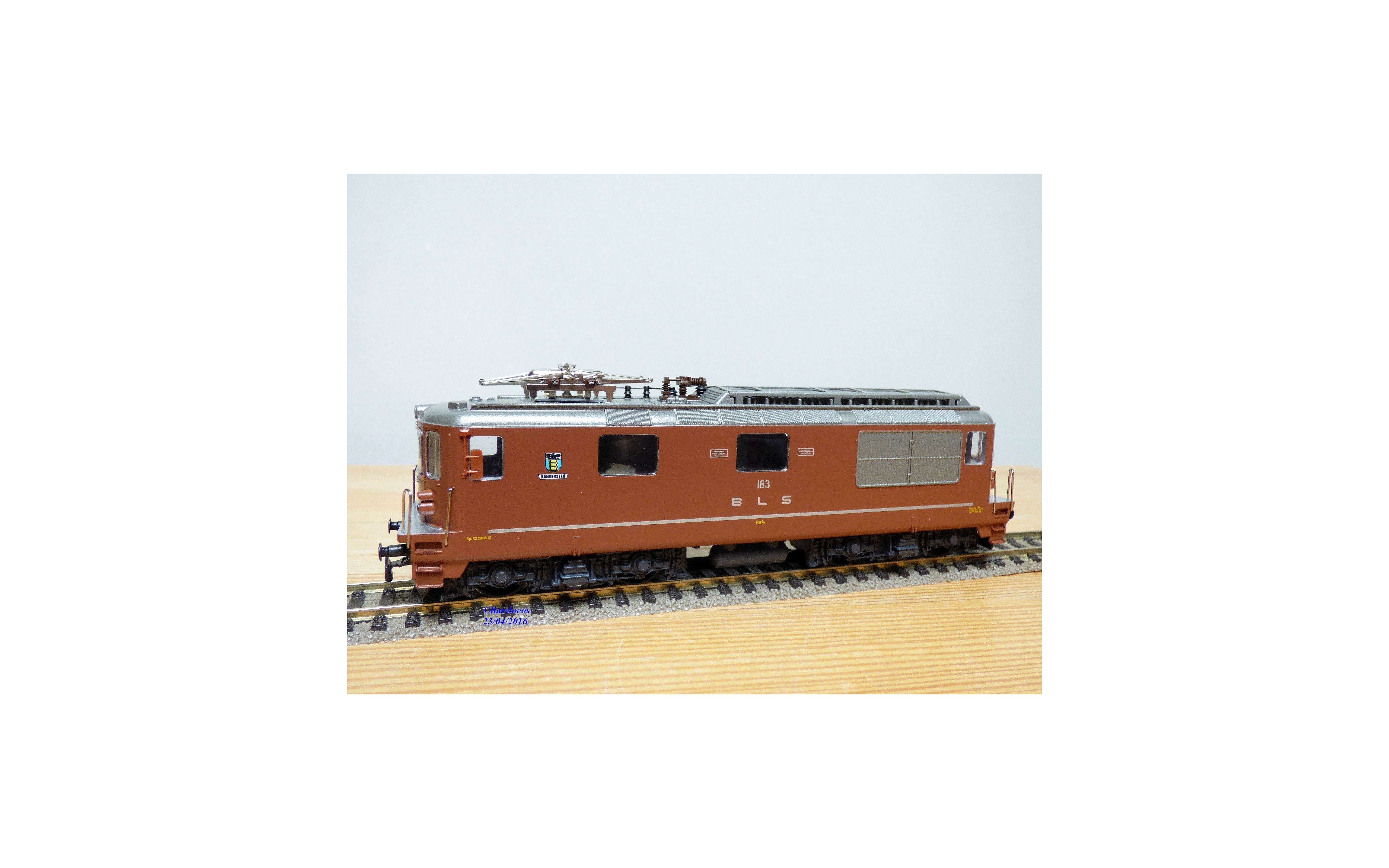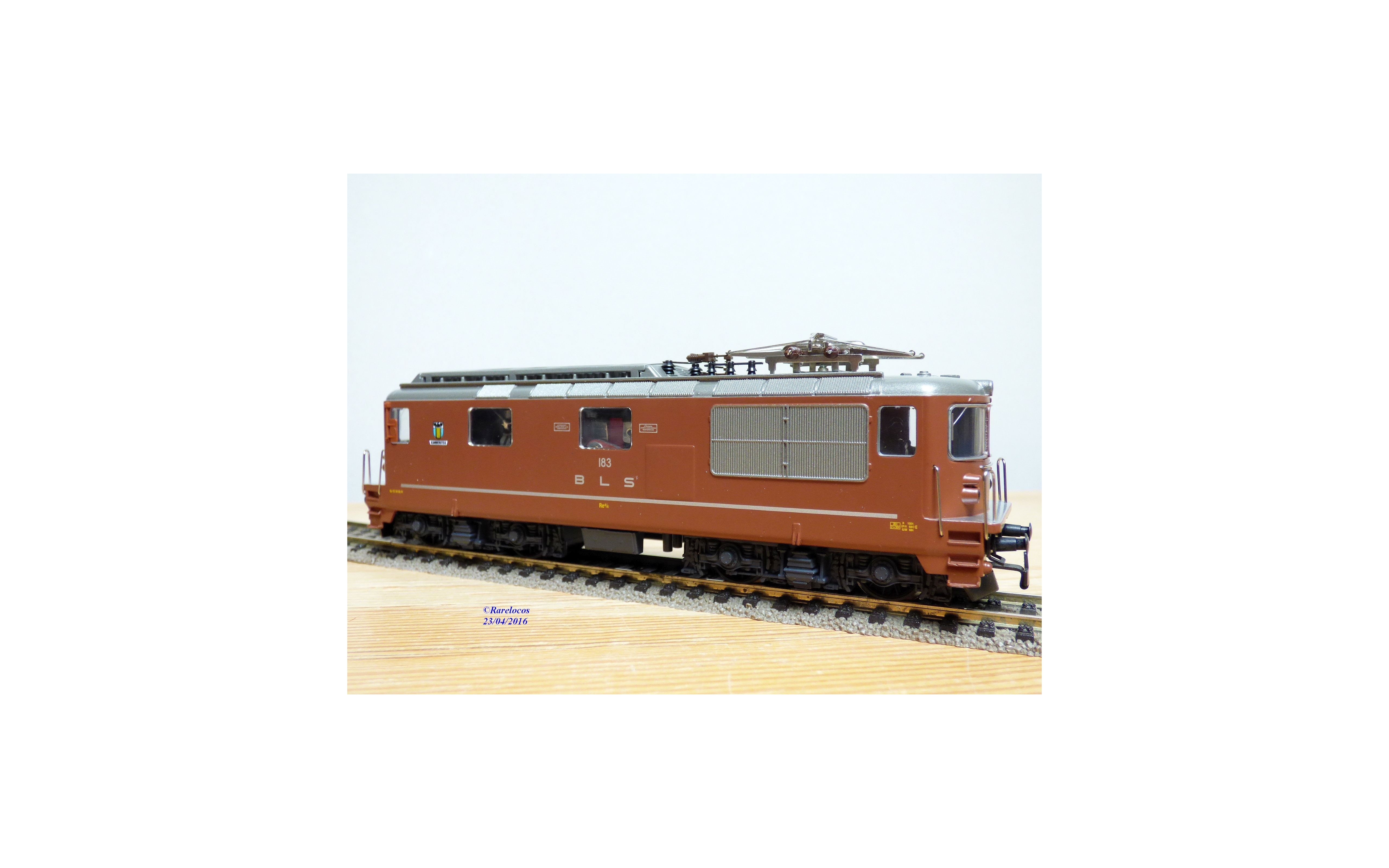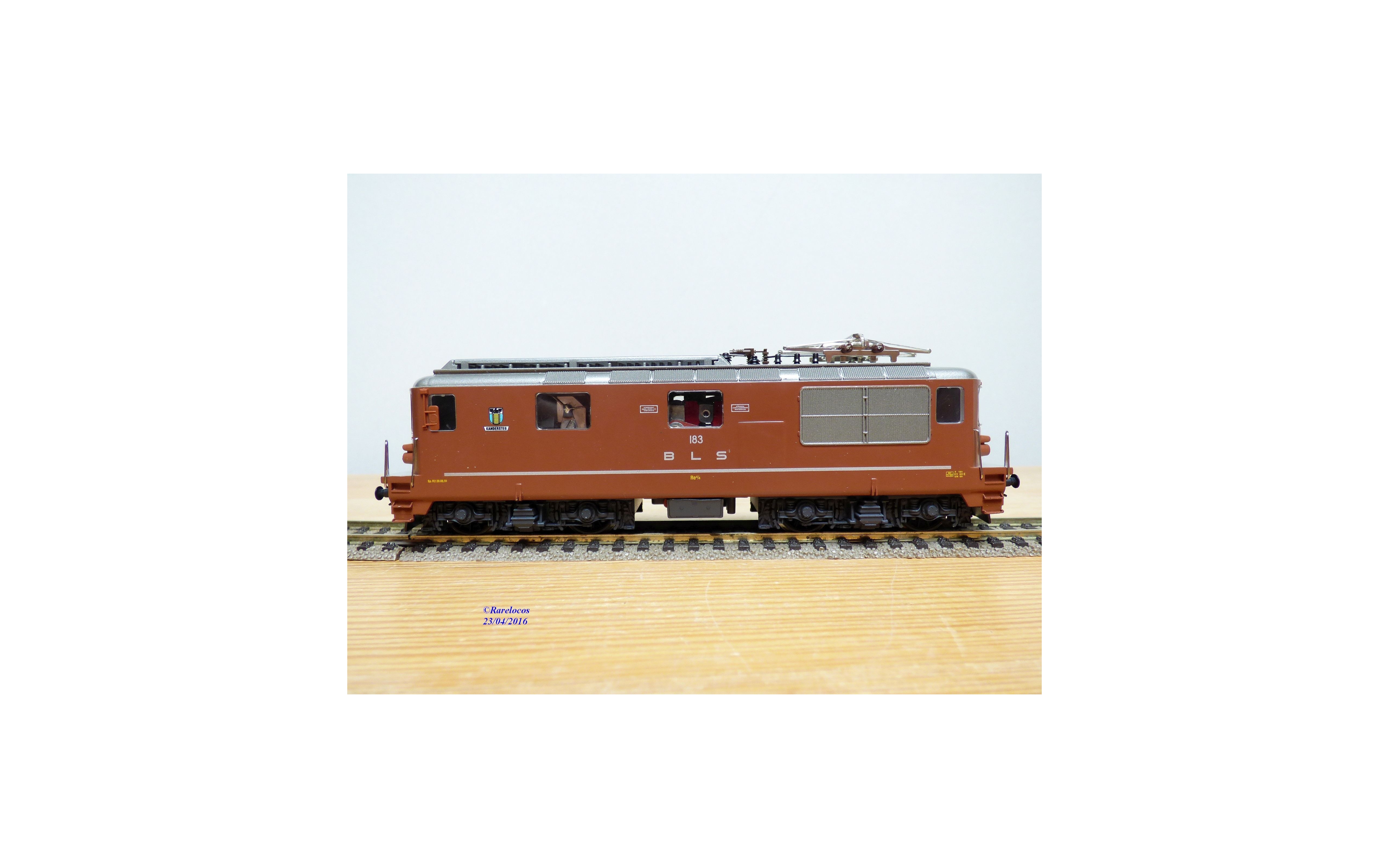 Motrice Bo Bo monopantographe série Re 4/4 des chemins de fer suisses ( BLS : Bern Lötschberg Simplon), tout en métal, équipée d' un décodeur digital, livrée brune à toit gris argent, prise de courant par rails ou caténaires, immatriculation : 183, baptisée KANDERSTEG, notice présente, boîte d'origine en état neuf.