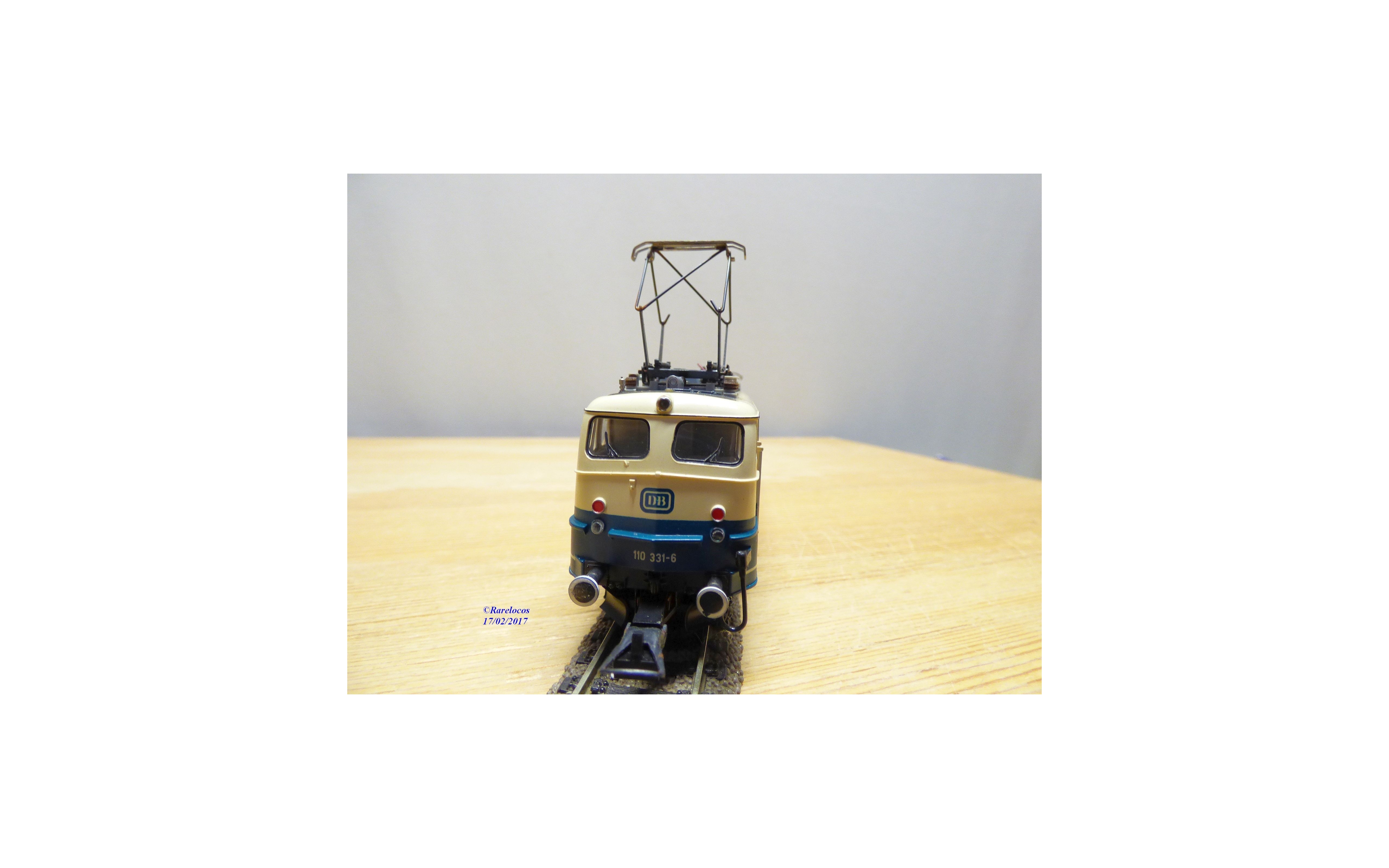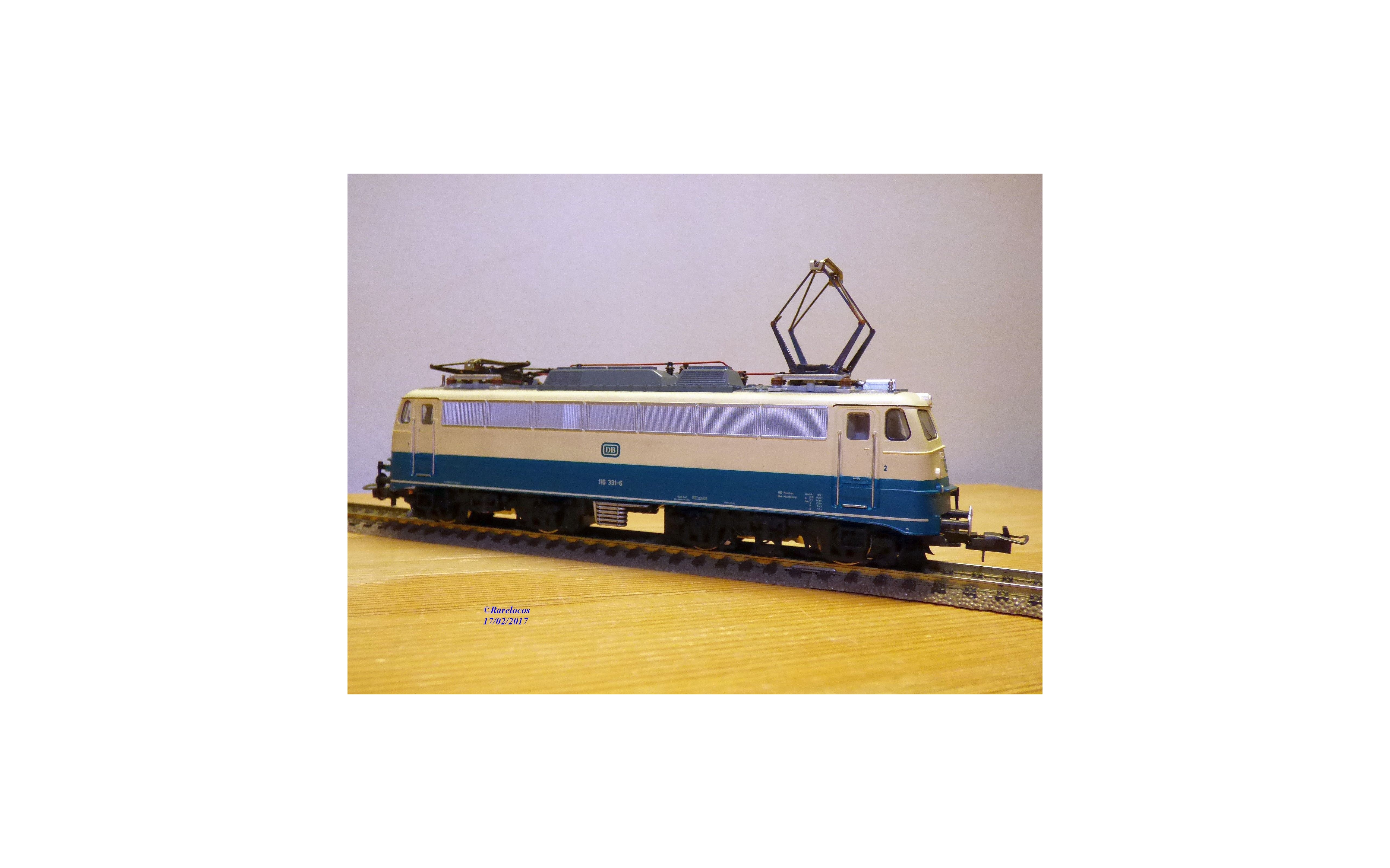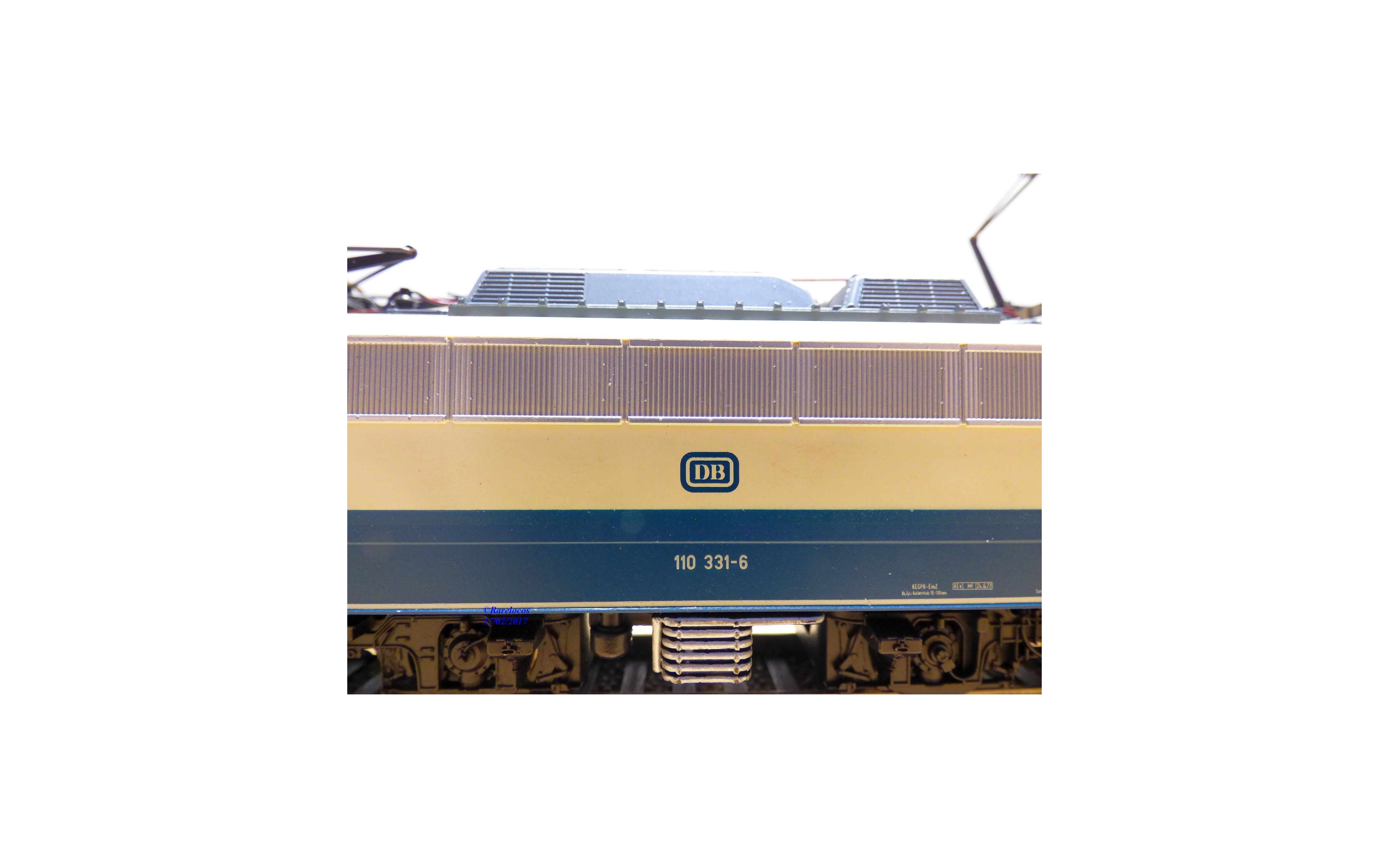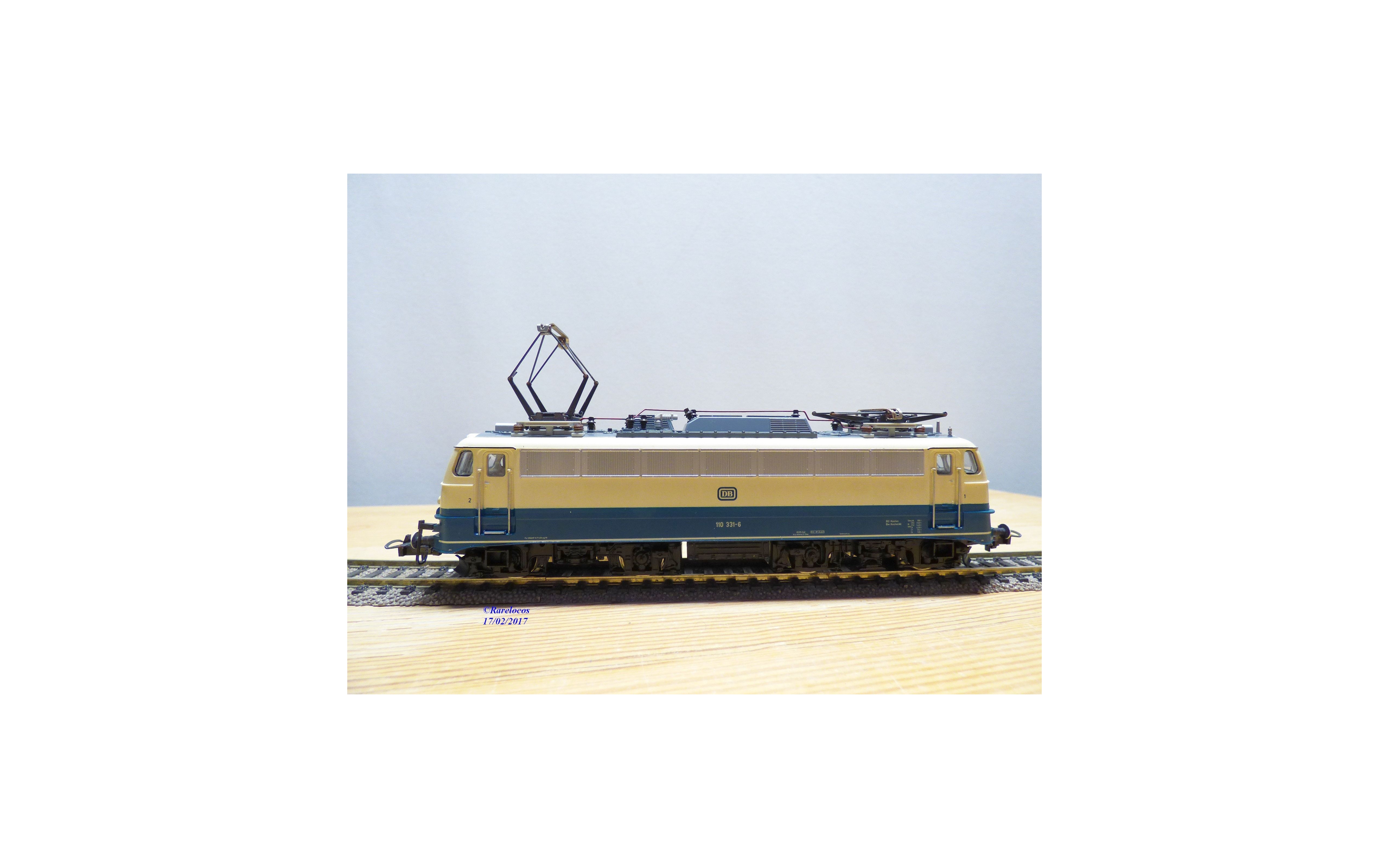Motrice Bo Bo série E 110 des chemins de fer allemands ( DB ), livrée Rheingold turquoise et crême à toit gris argent, prise de courant par rails et caténaires testée OK, immatriculation : 110 331-6, notice présente, boîte d'origine en état neuf..