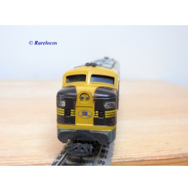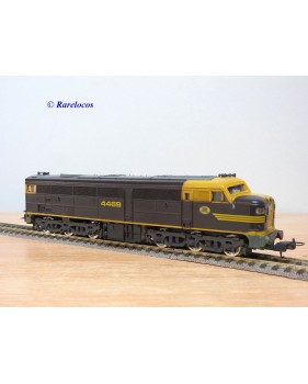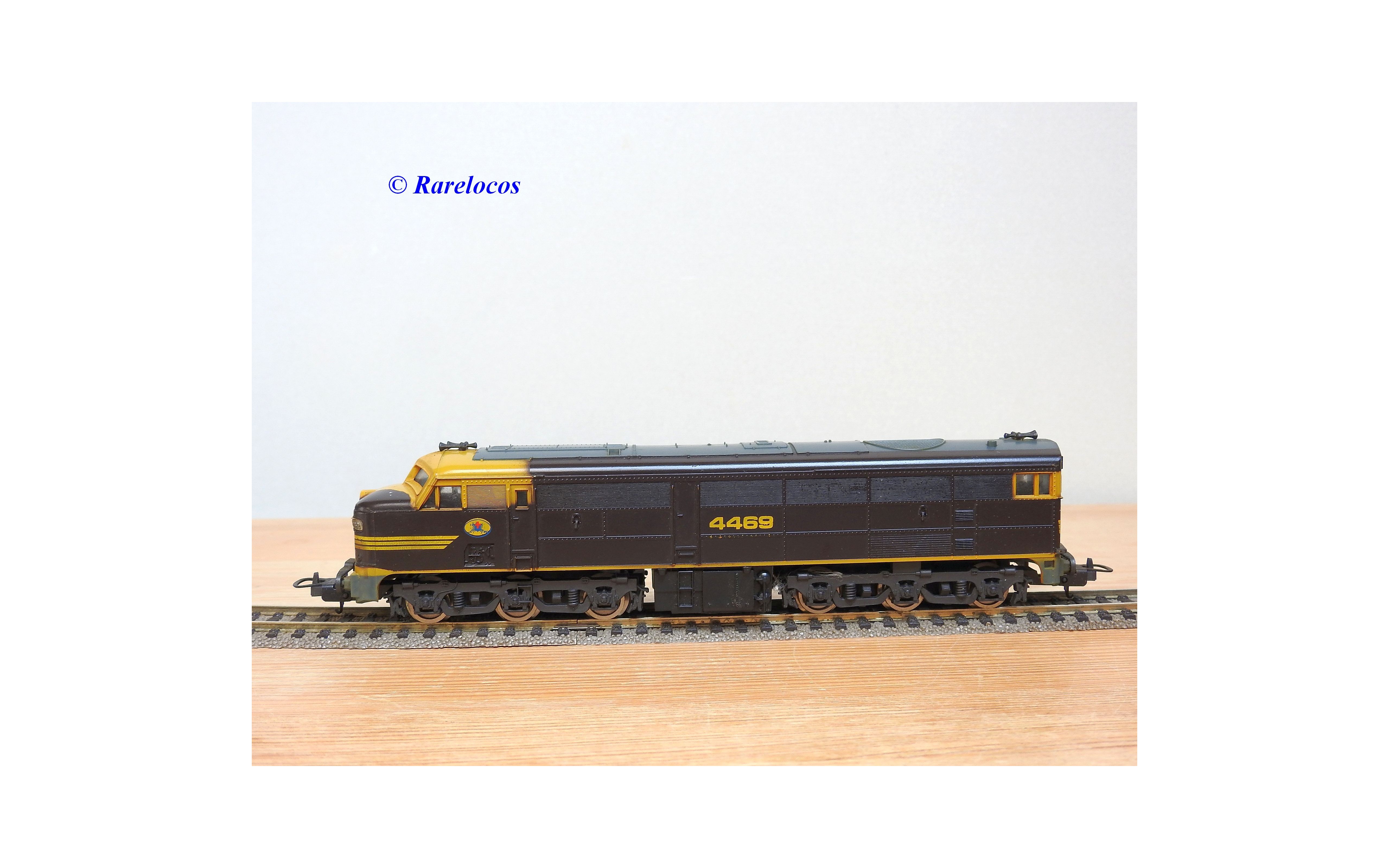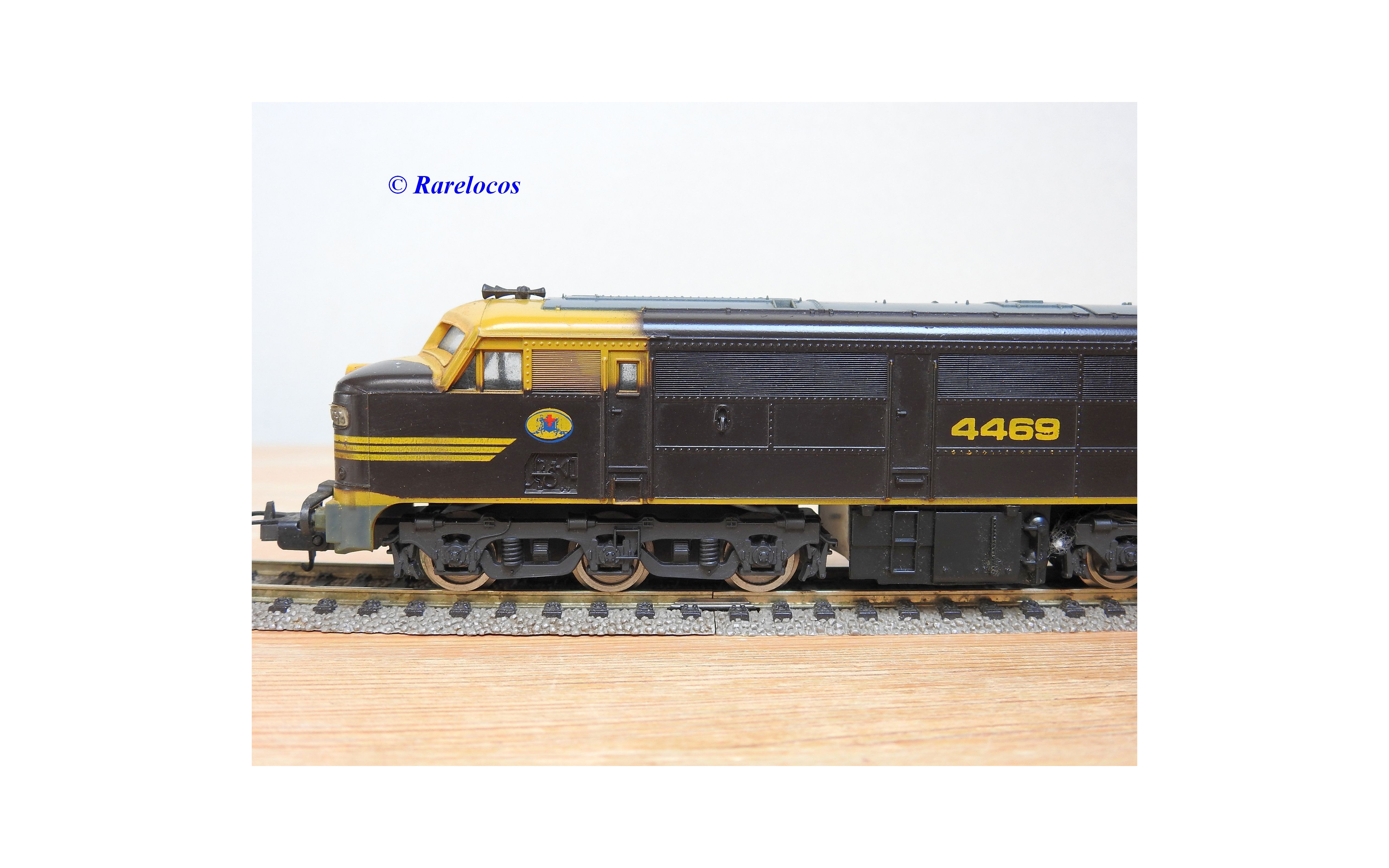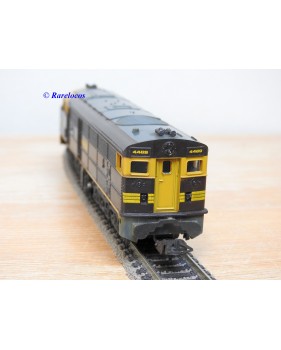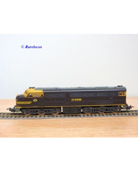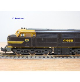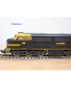 Locomotive diesel Co Co Class ( série ) 42 des chemins de fer australiens ( NSWGR : chemins de fer de Nouvelle Galles du Sud ), construite localement et inspirée des ALCO DL500B américaines, livrée marron et jaune, roues noircies, immatriculation :4469, boîte d' origine en état neuf.