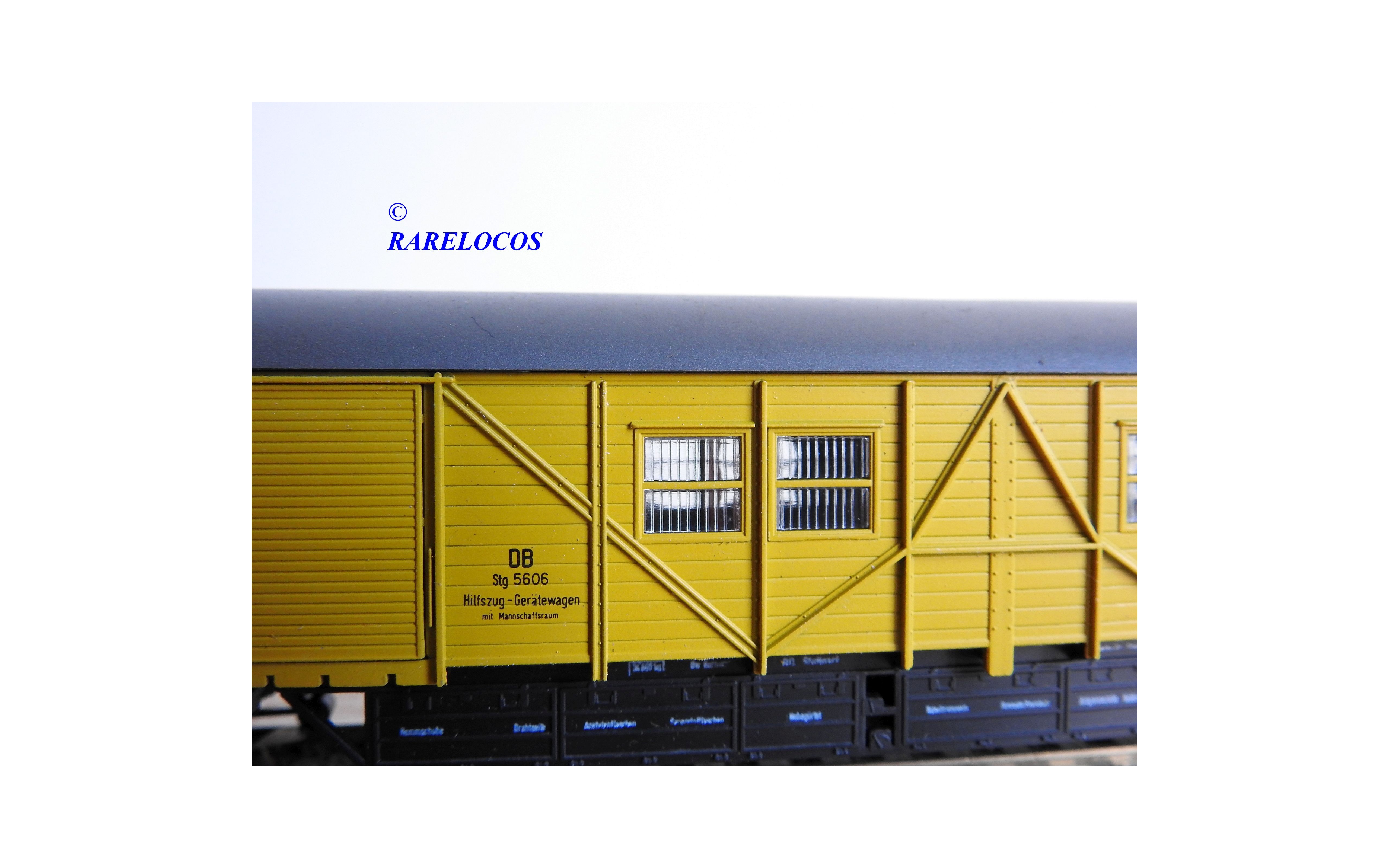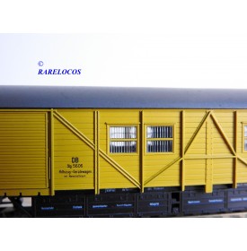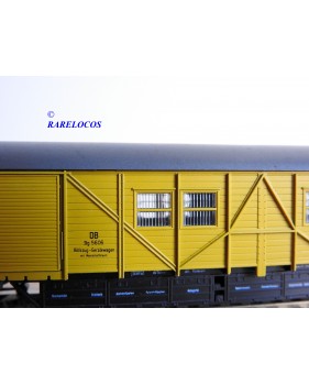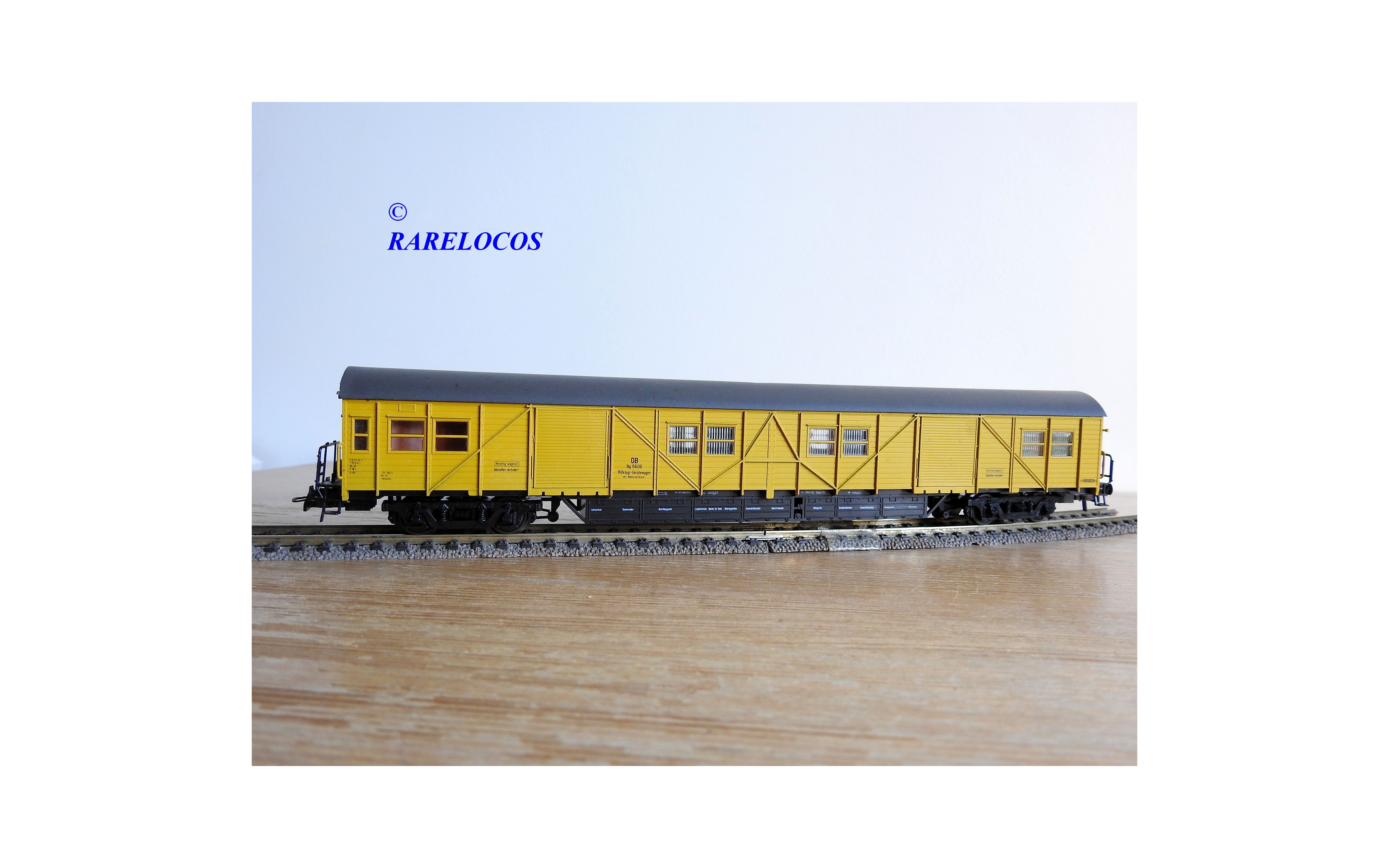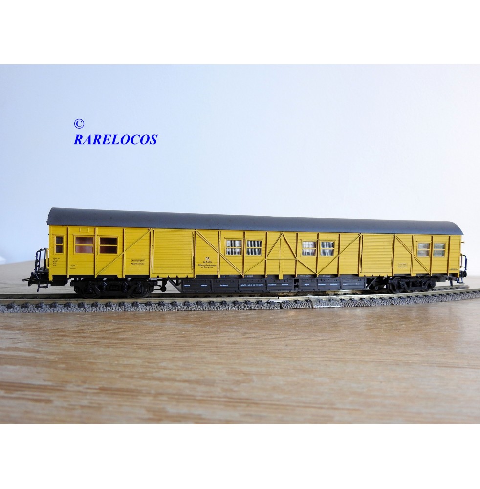 Fourgon atelier pour train de secours avec hébergement de l' équipage à 2 bogies type Stg des chemins de fer allemands ( DB ), livrée jaune à toit gris, pièces de détaillage encore scellées, immatriculation : Stg 5606, boîte d'origine en excellent état.