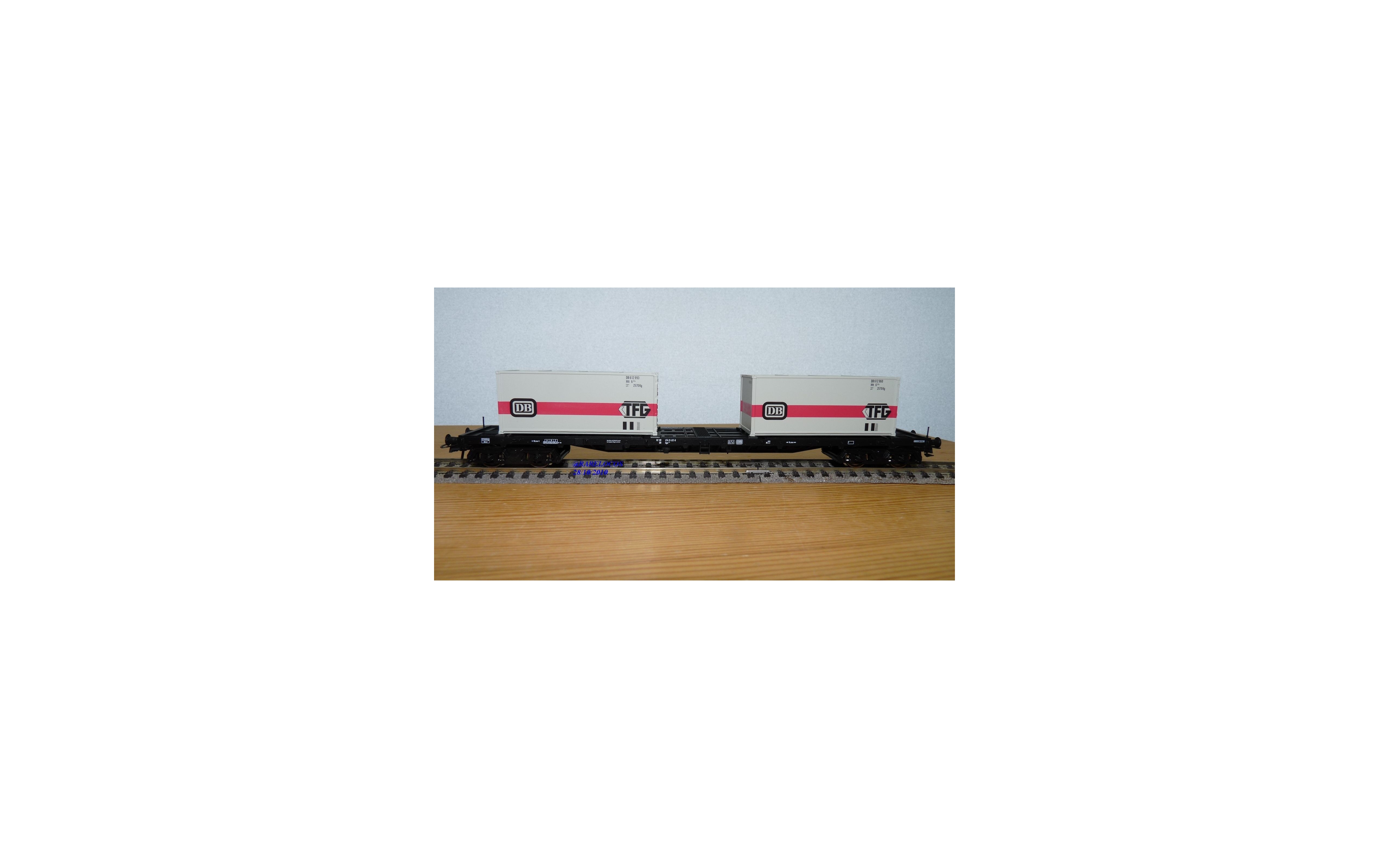 Wagon plat surbaissé à 2 bogies des chemins de fer allemands ( DB ), chargé de deux conteneurs amovibles de 20 ' aux couleurs des chemins de fer allemands ( DB TFG ), attelages à élongation, notice présente, boîte d'origine ouverte pour la première fois pour les photos.