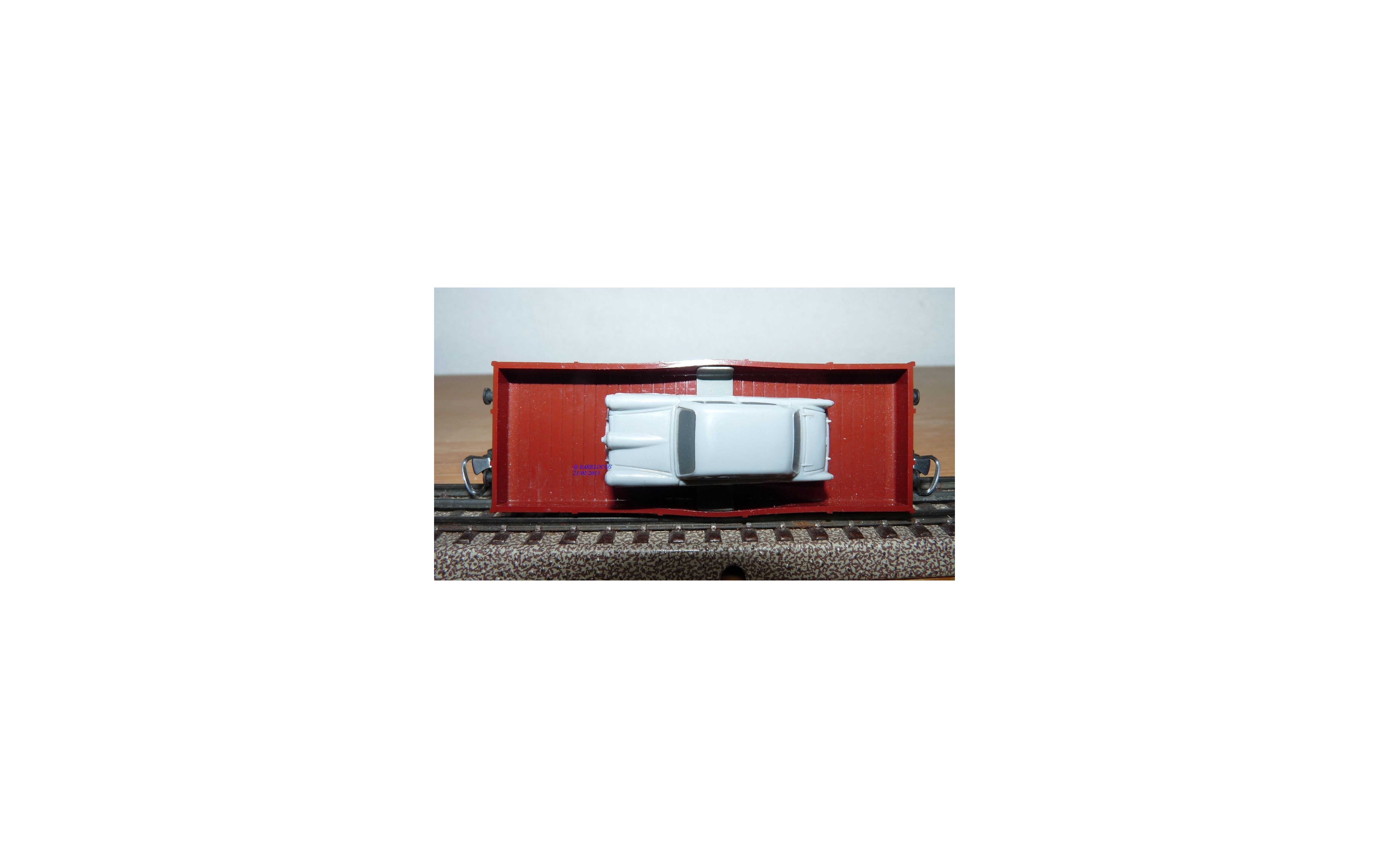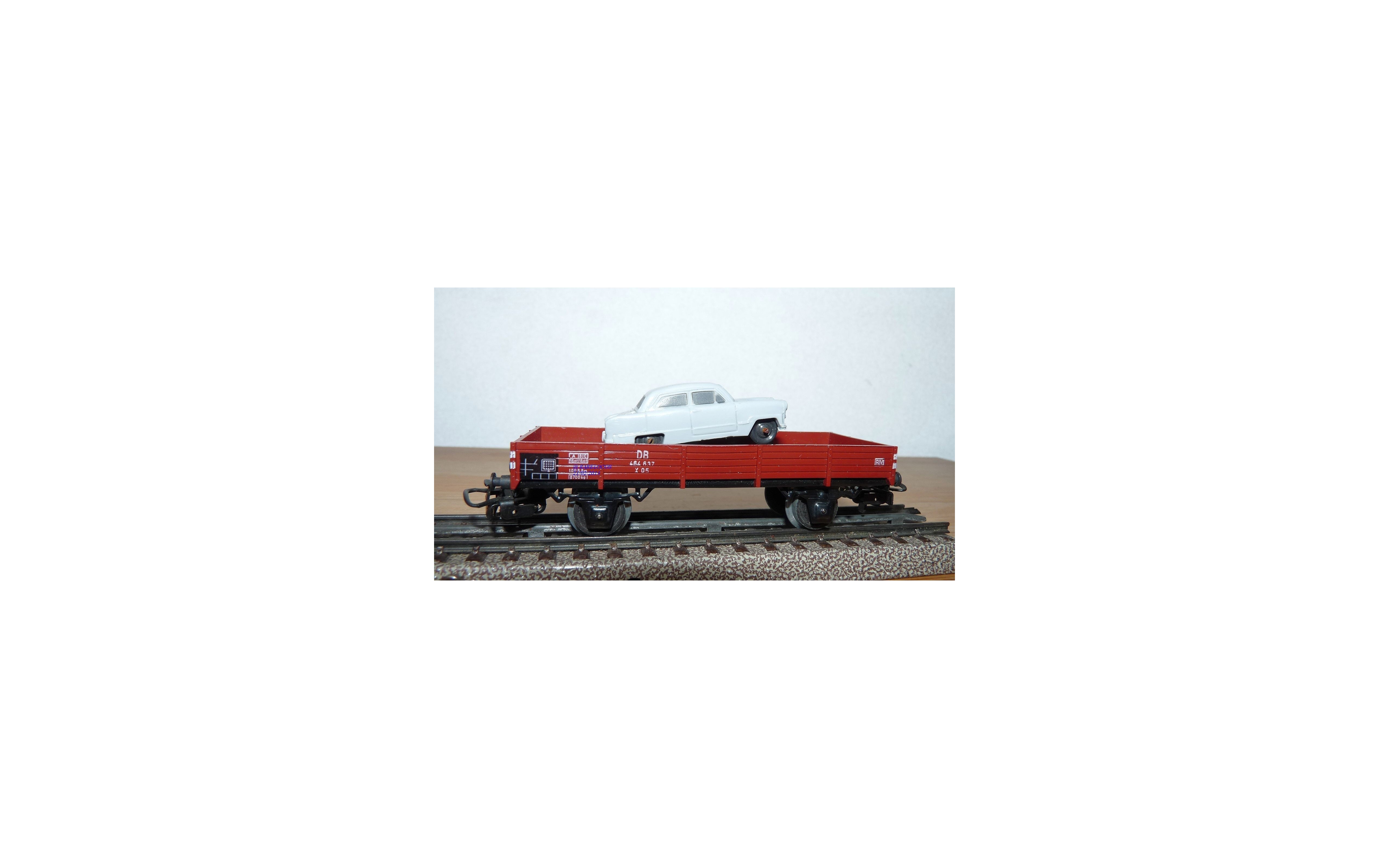 Wagon plat à 2 essieux type X 05 des chemins de fer allemands (DB ), chargé d'une FORD Taunus 17 M grise ( Märklin), emballage d'origine en état neuf.