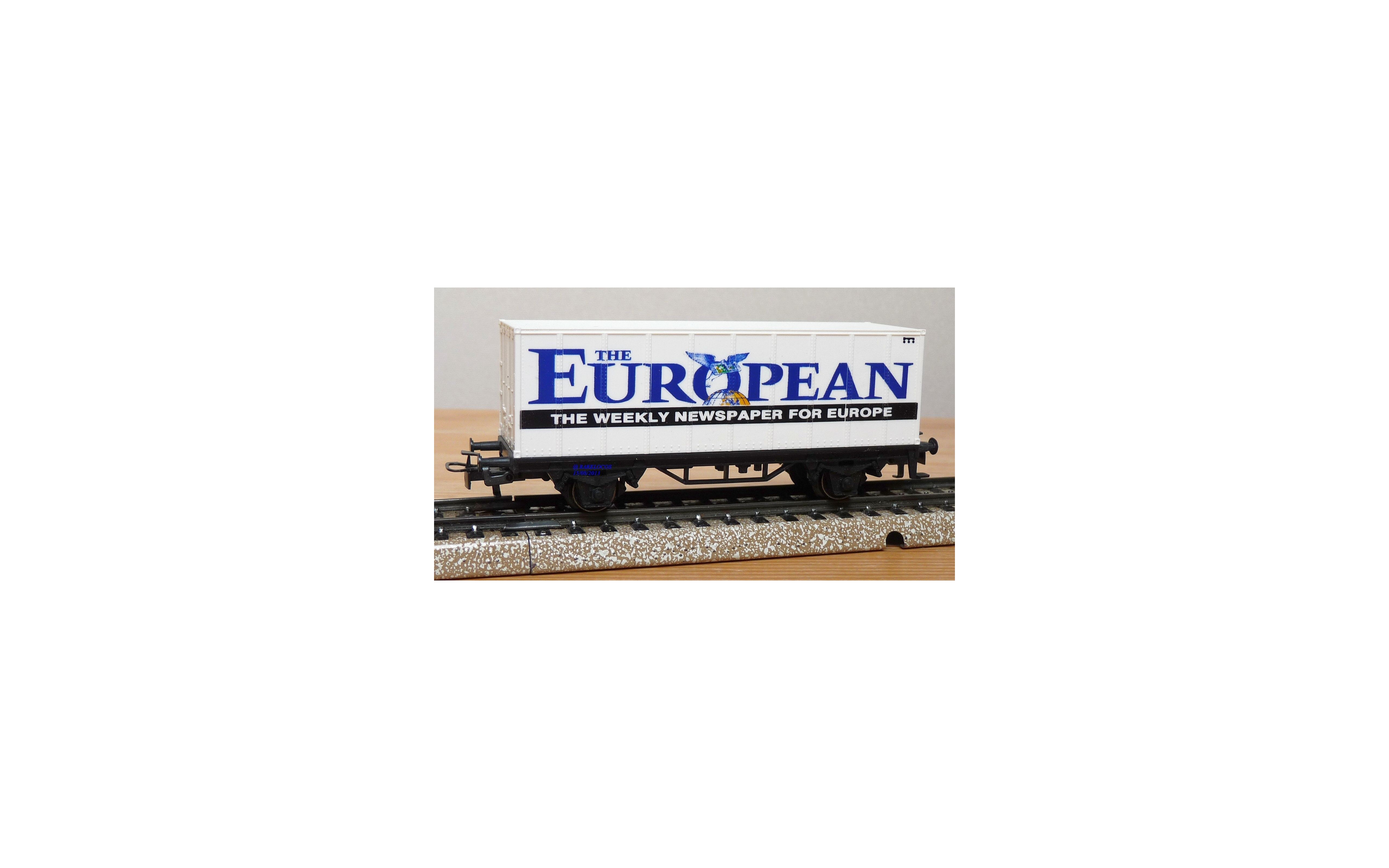 Wagon plat à 2 essieux , livrée noire chargé d'un conteneur de 20 ' blanc avec marquages The European, emballage d'origine en état neuf .