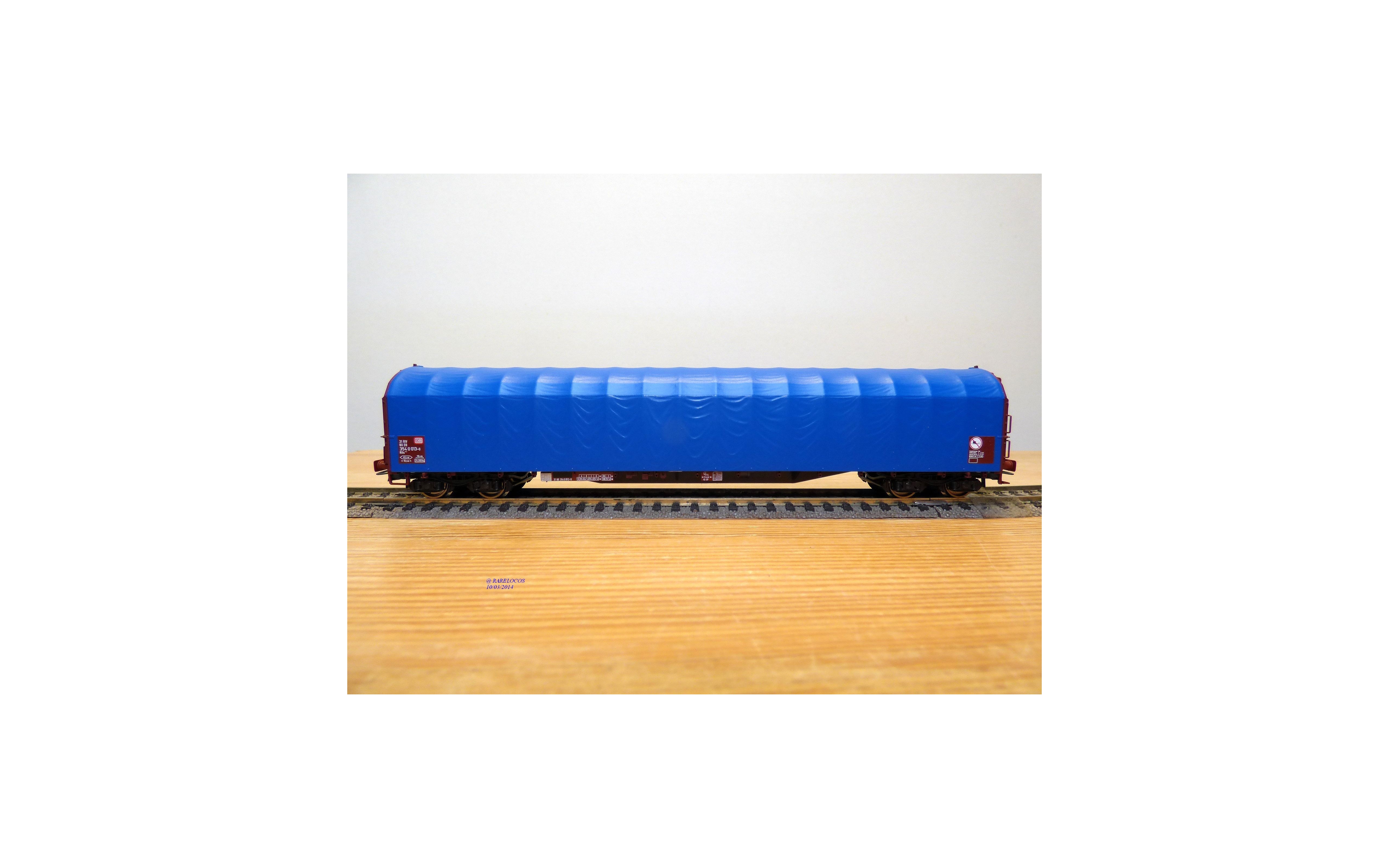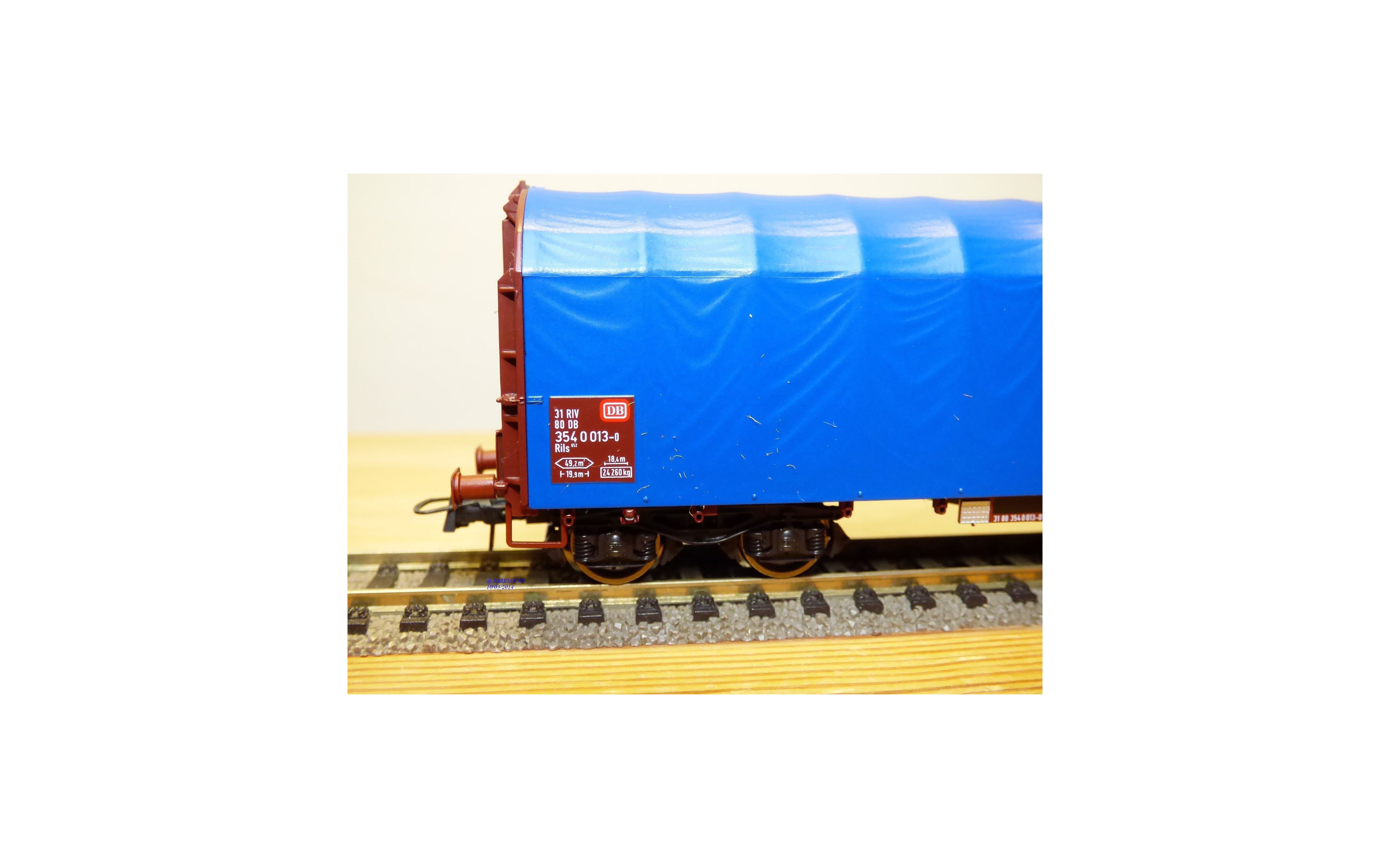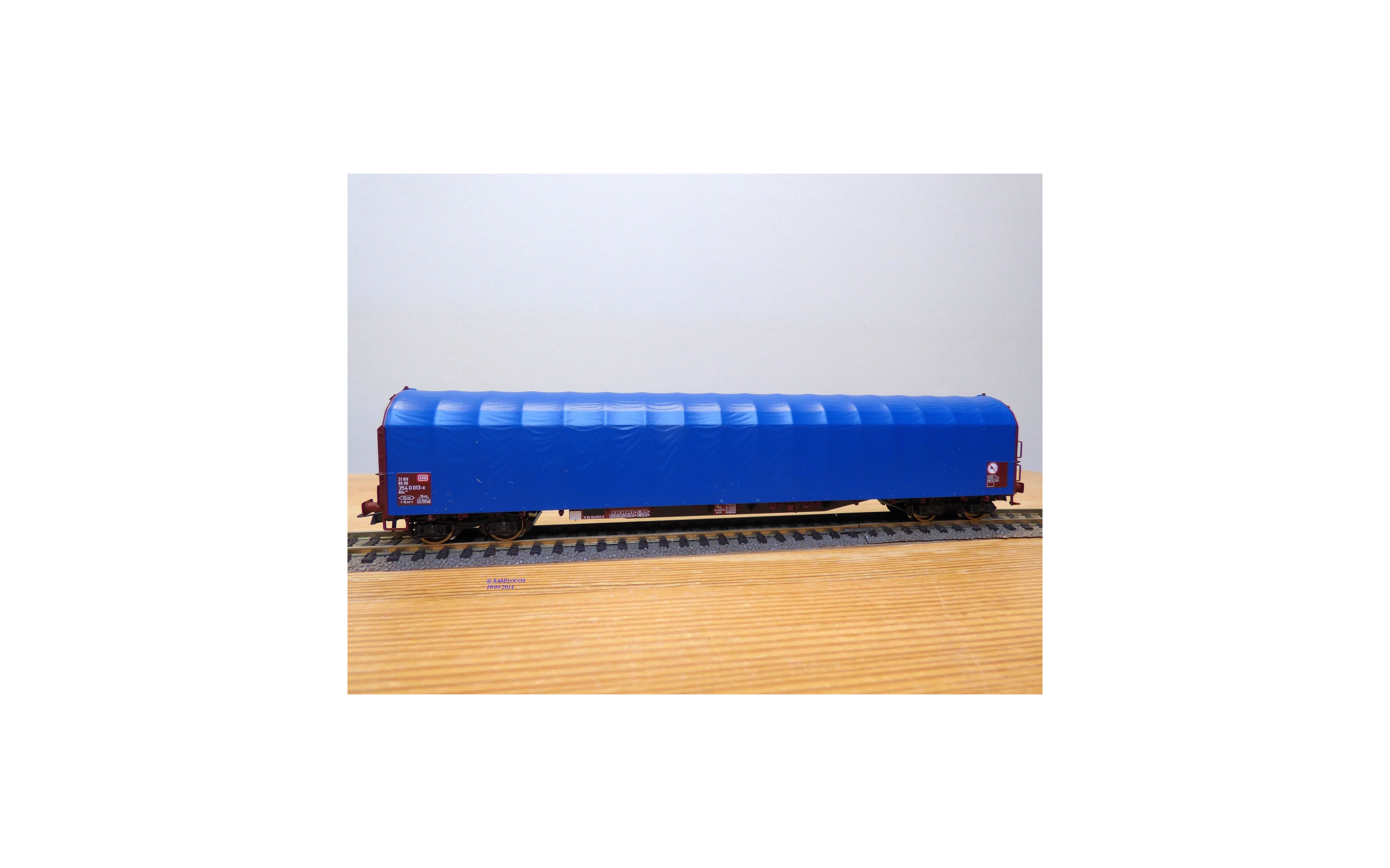 Wagon à parois coulissantes à 2 essieux type Rils 652 des chemins de fer allemands ( DB ), livrée marron à bâche bleue, notice présente, emballage d'origine en excellent état.