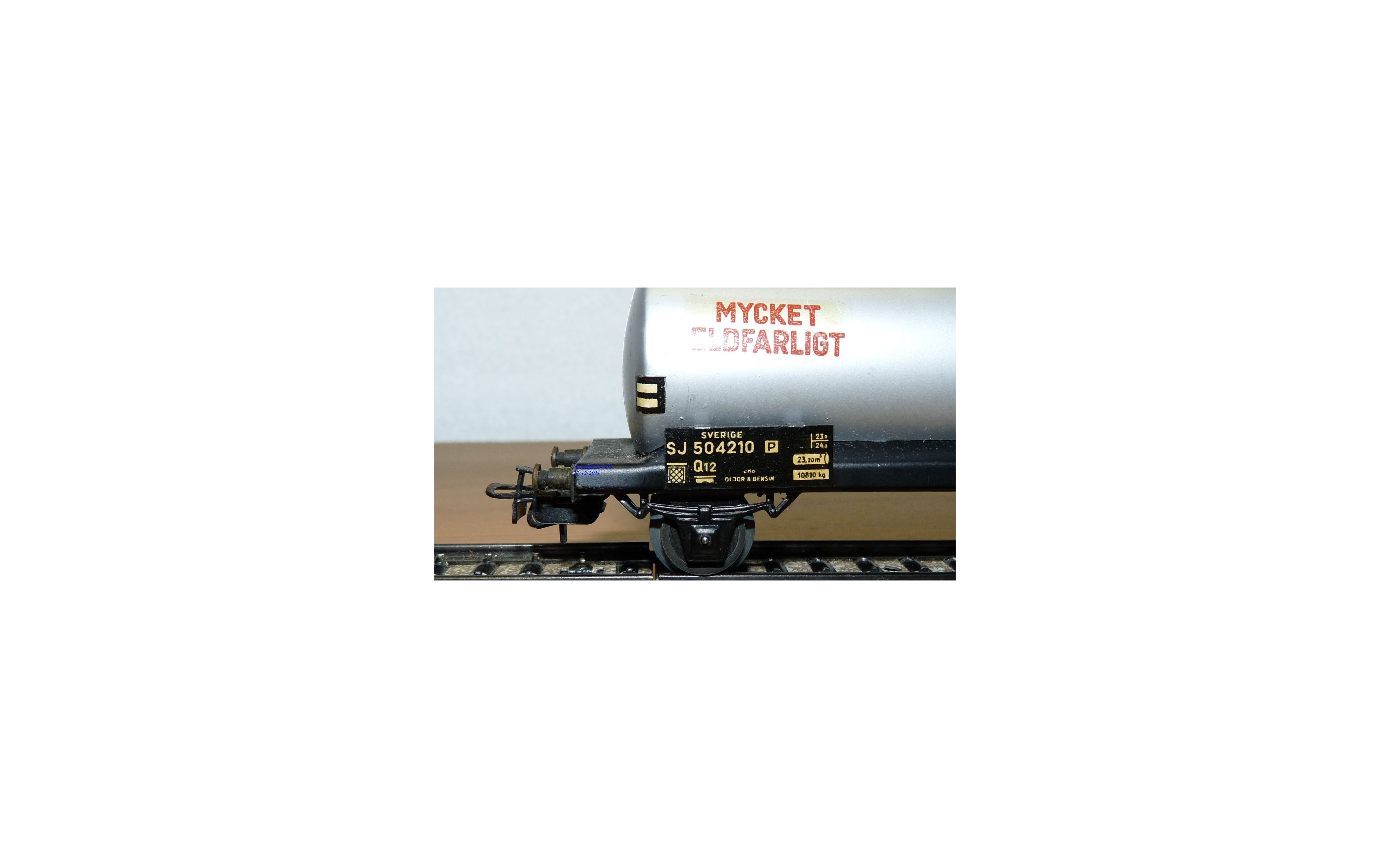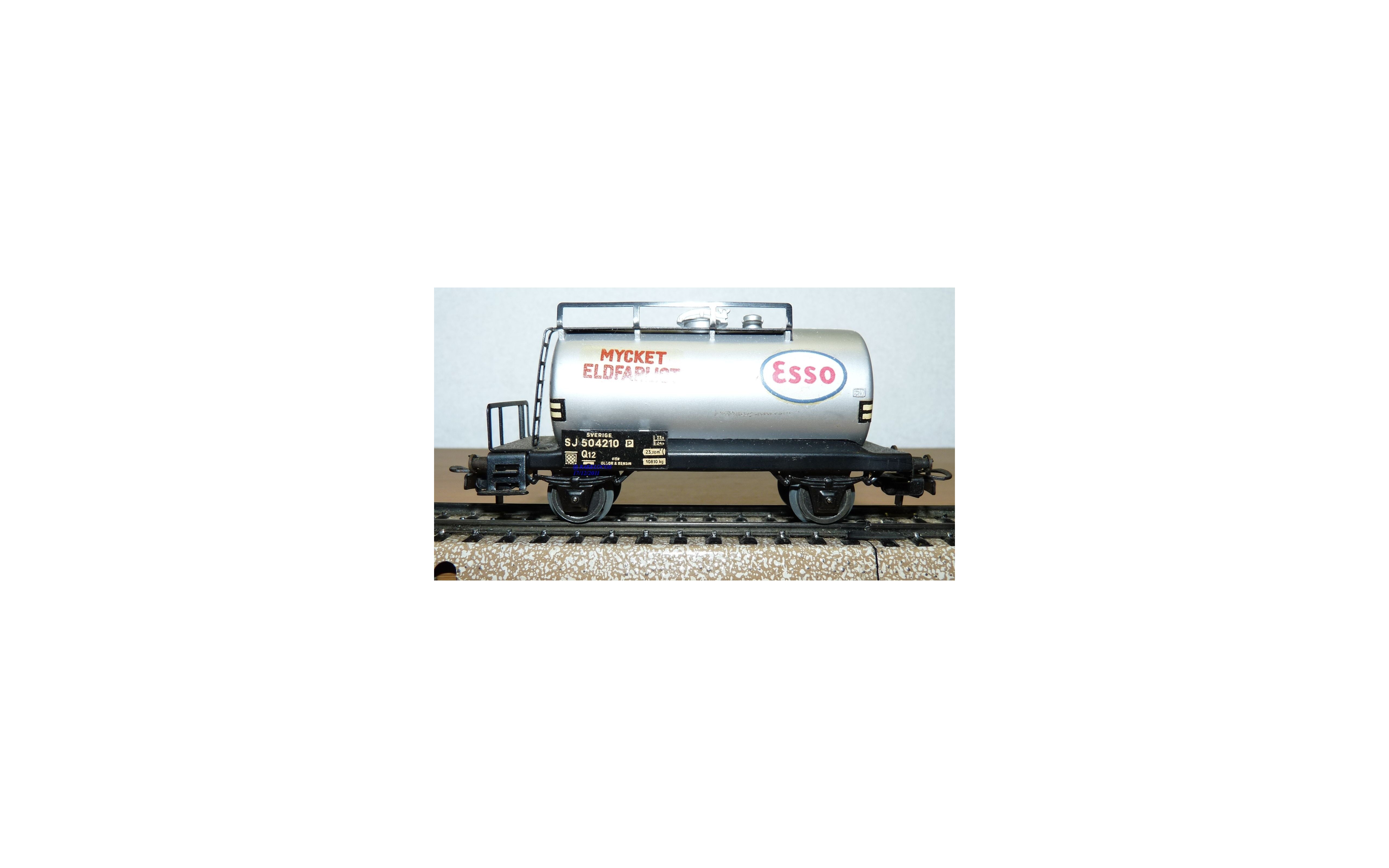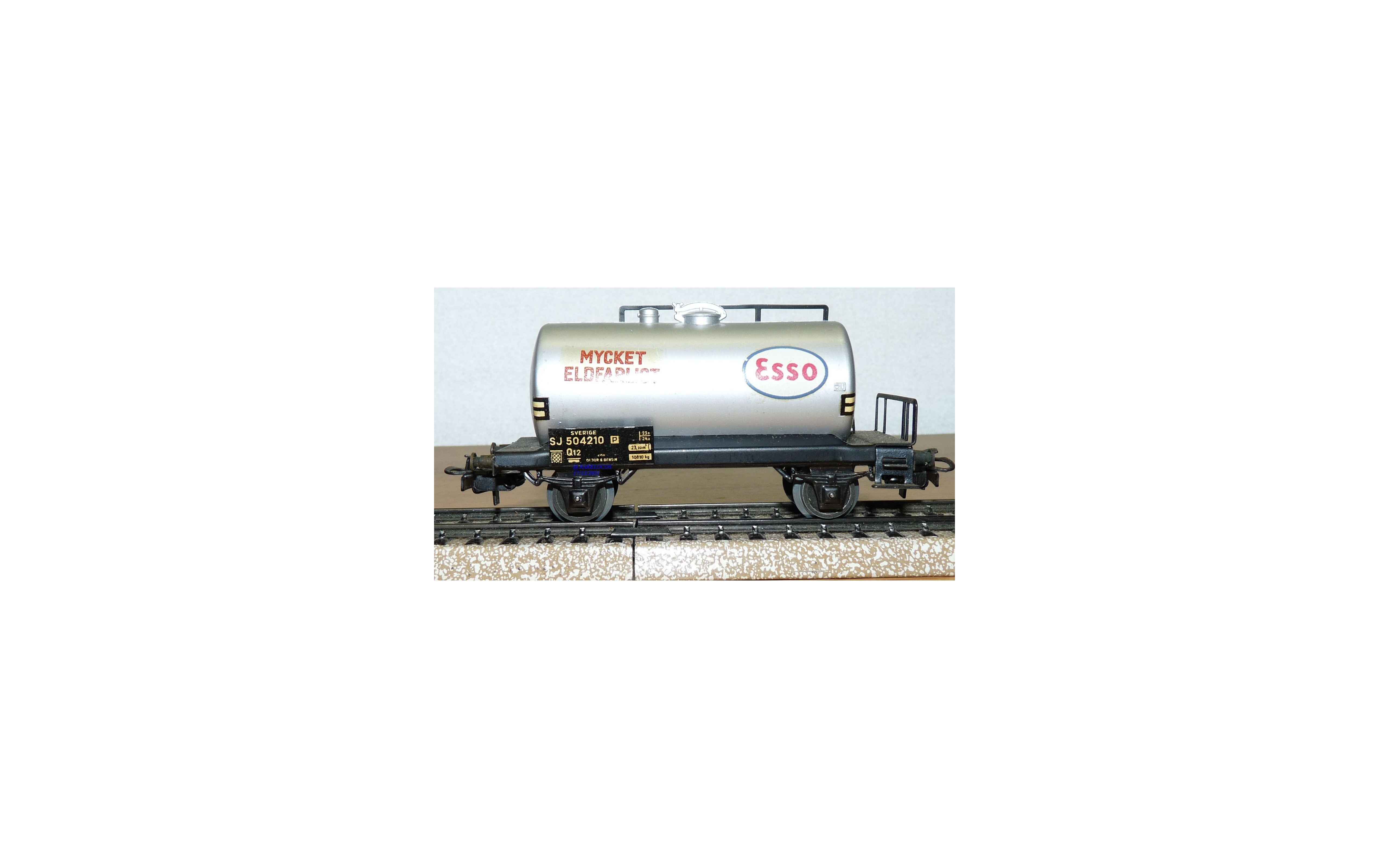 Wagon citerne type Q12 à 2 essieux des chemins de fer suédois (SJ ), livrée grise avec marquages ESSO et MYCKET ELDFARLIGT, pas d' emballage d'origine.