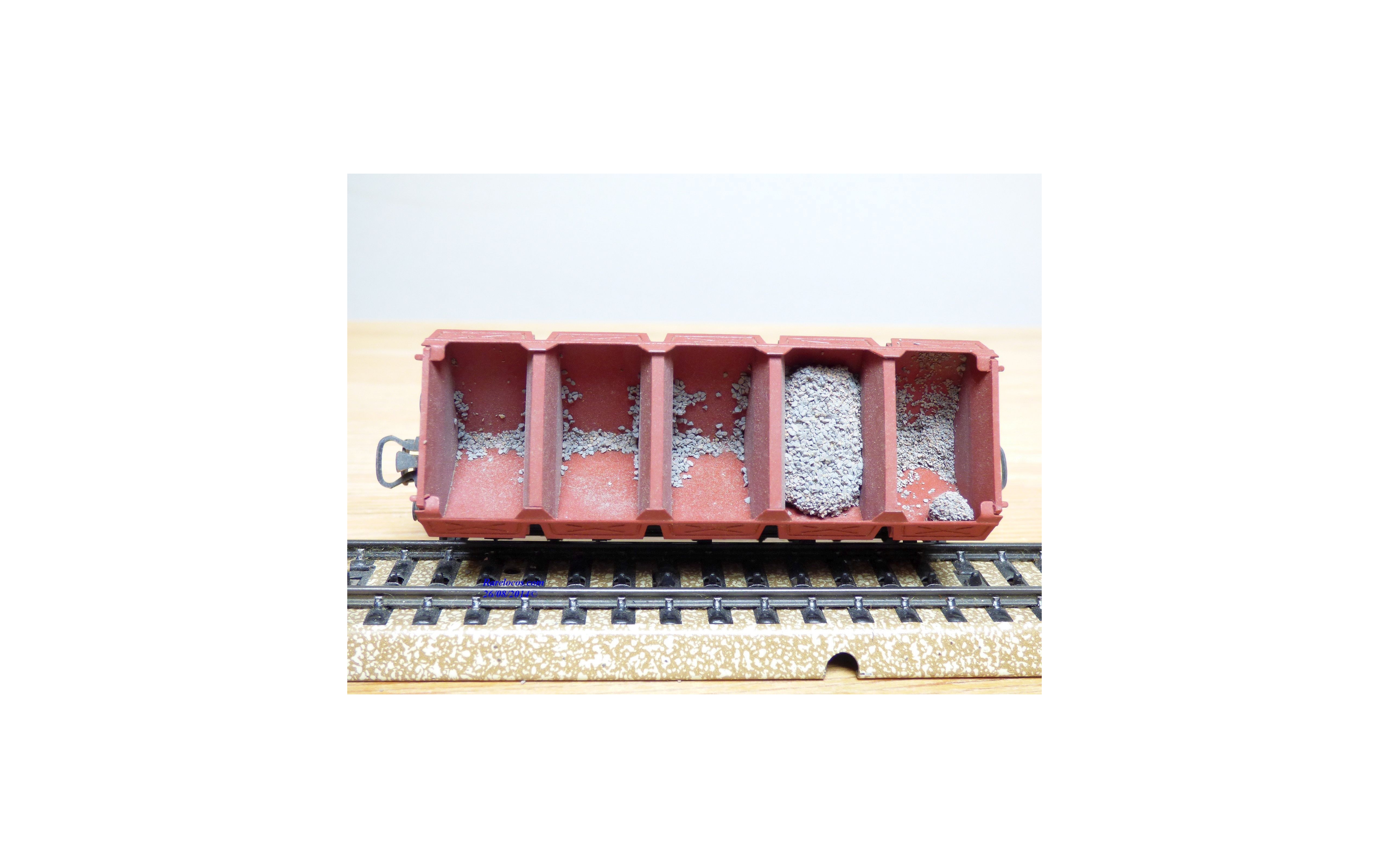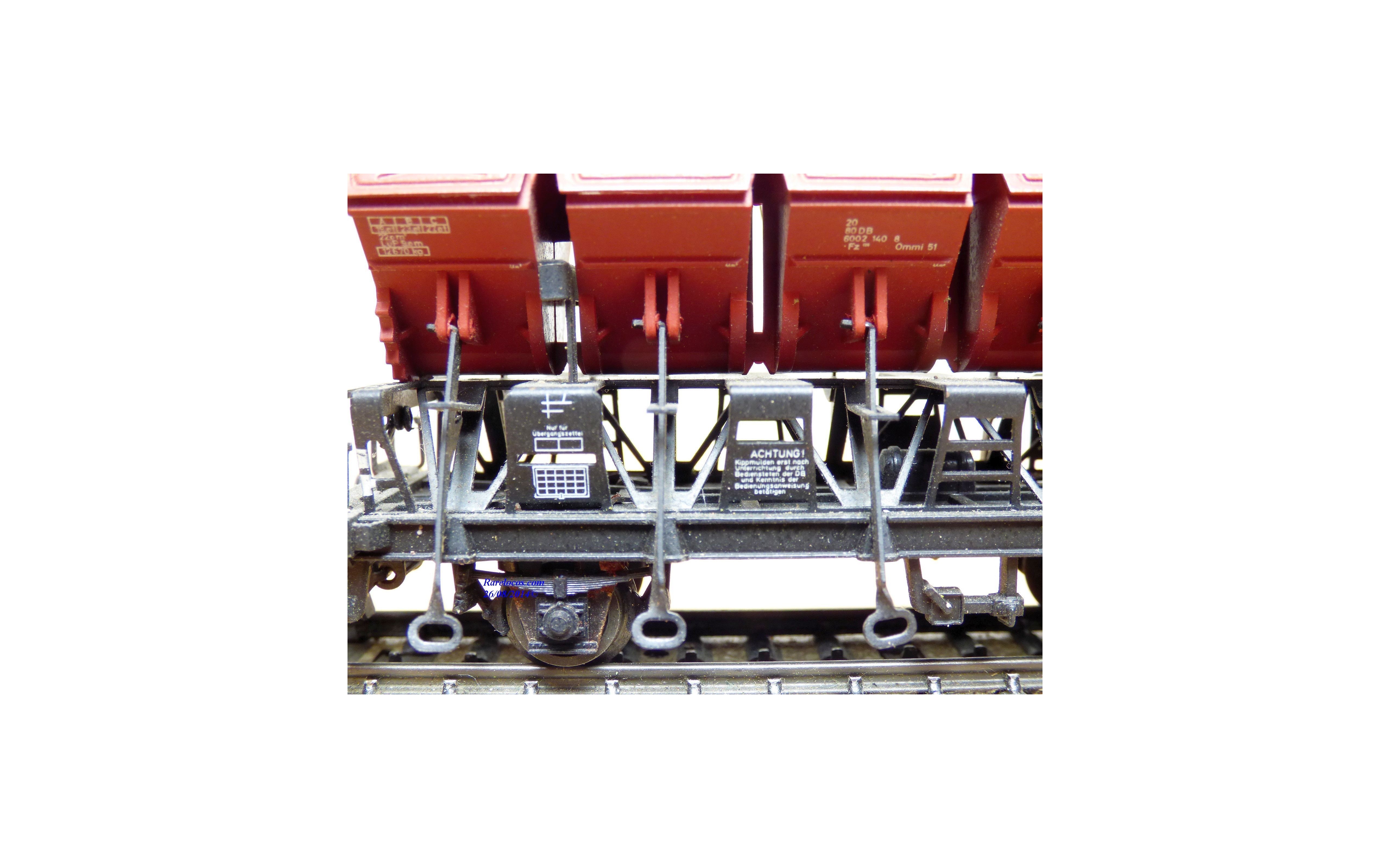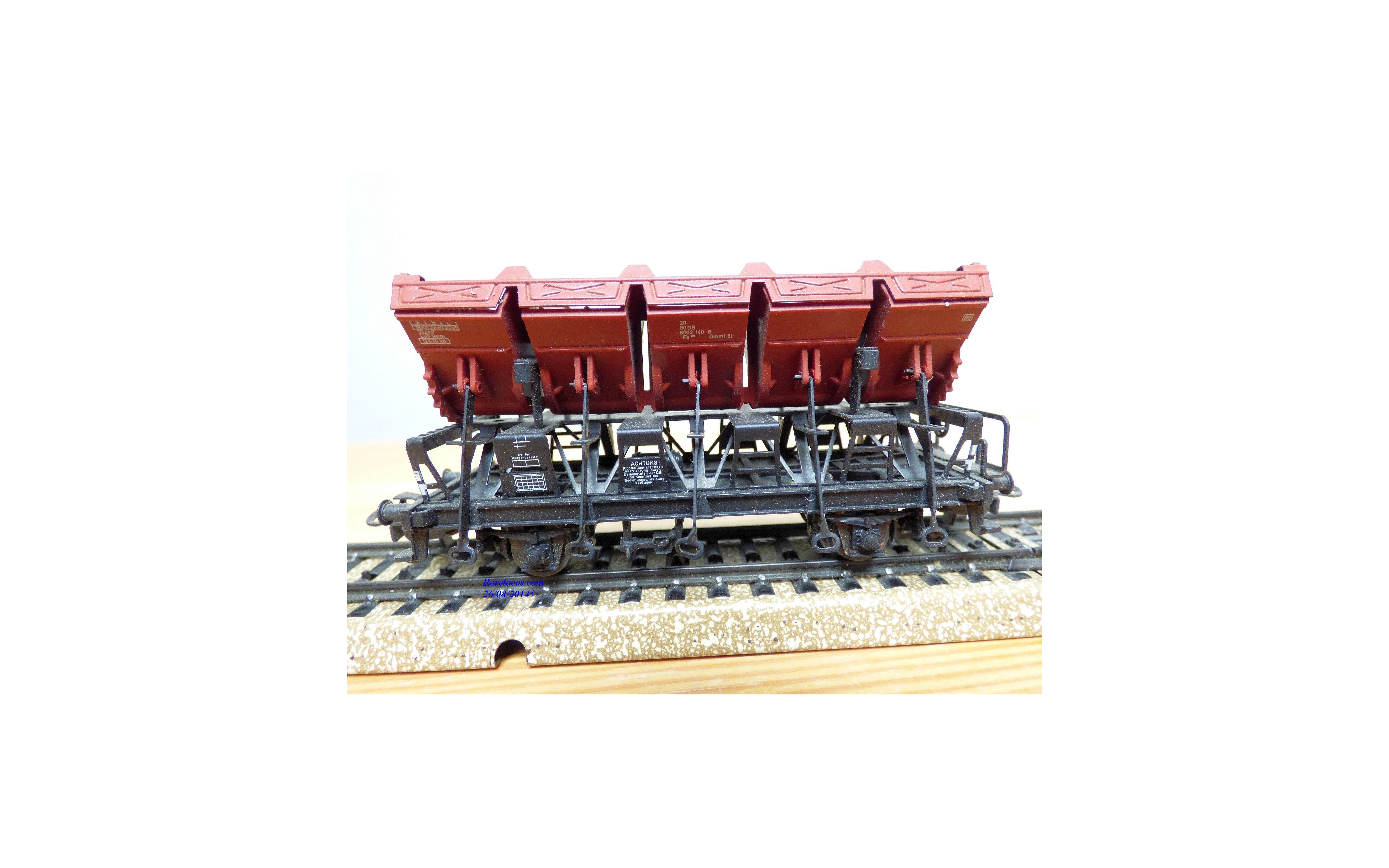 Wagon à bennes basculantes fonctionnelles ( Muldenkippwagen) à 2 essieux type Ommi 51 des chemins de fer allemands ( DB ), livrée marron, chargé de sable aggloméré qui lui donne un air patiné très réussi, emballage d'origine complet en état neuf.
