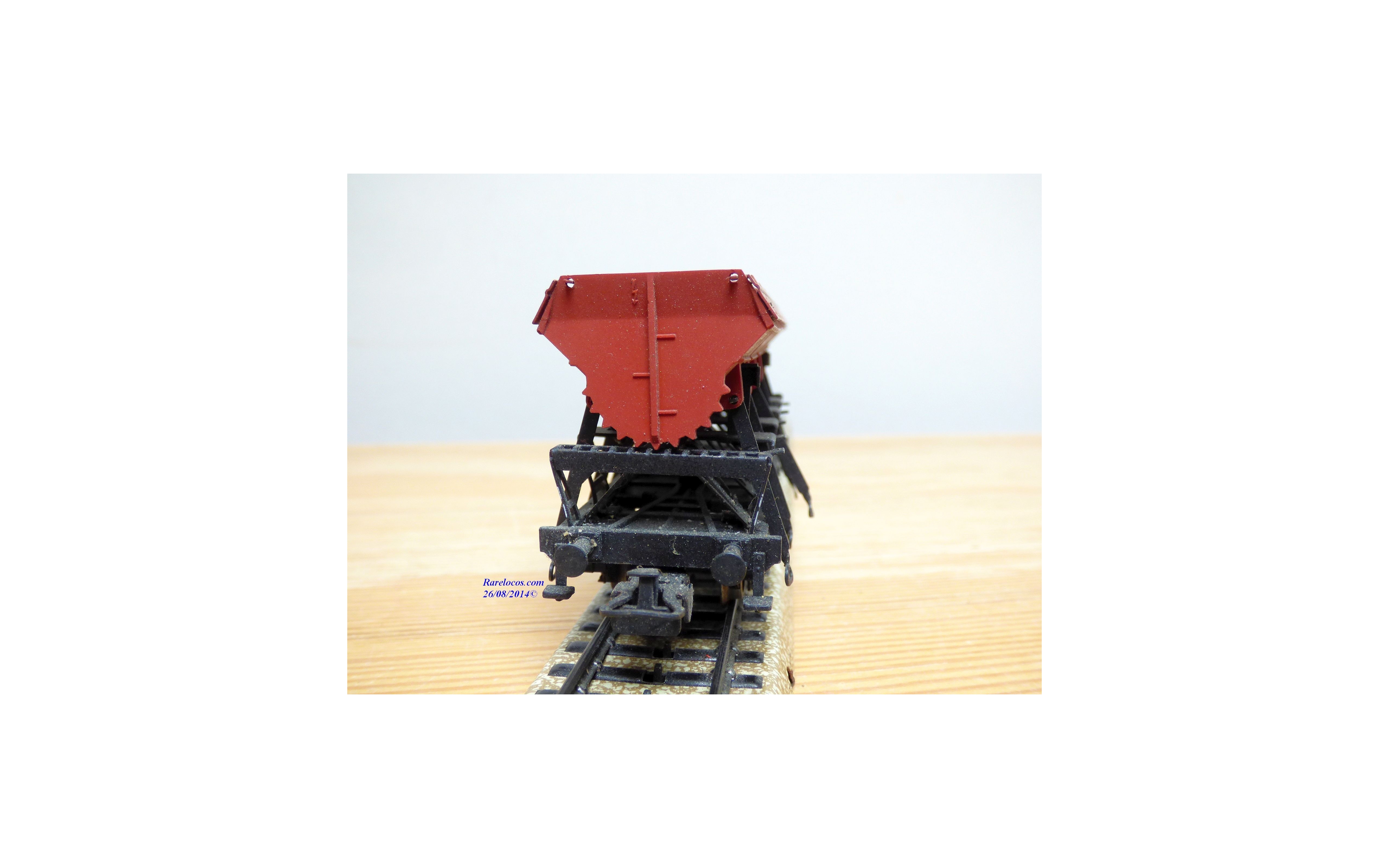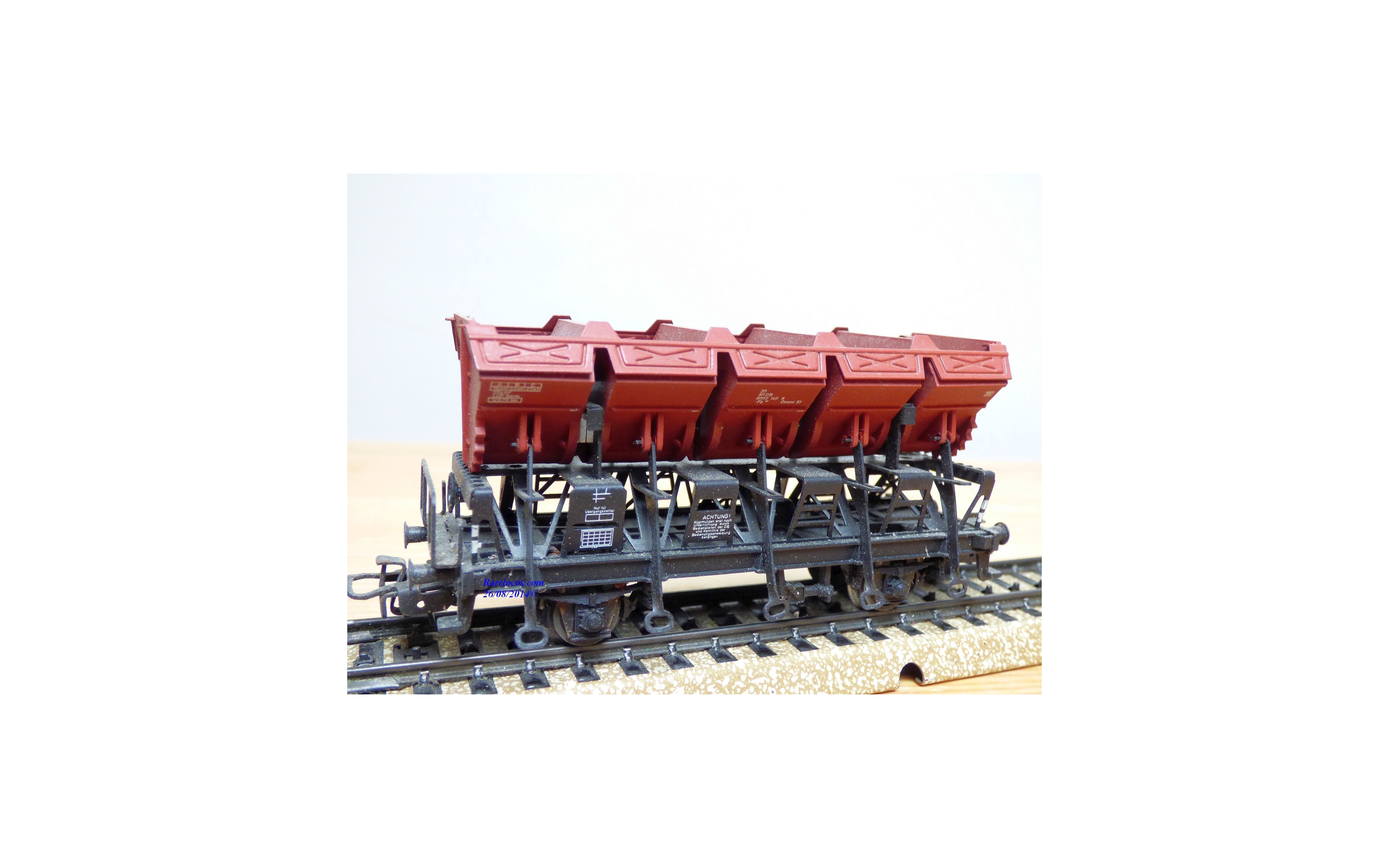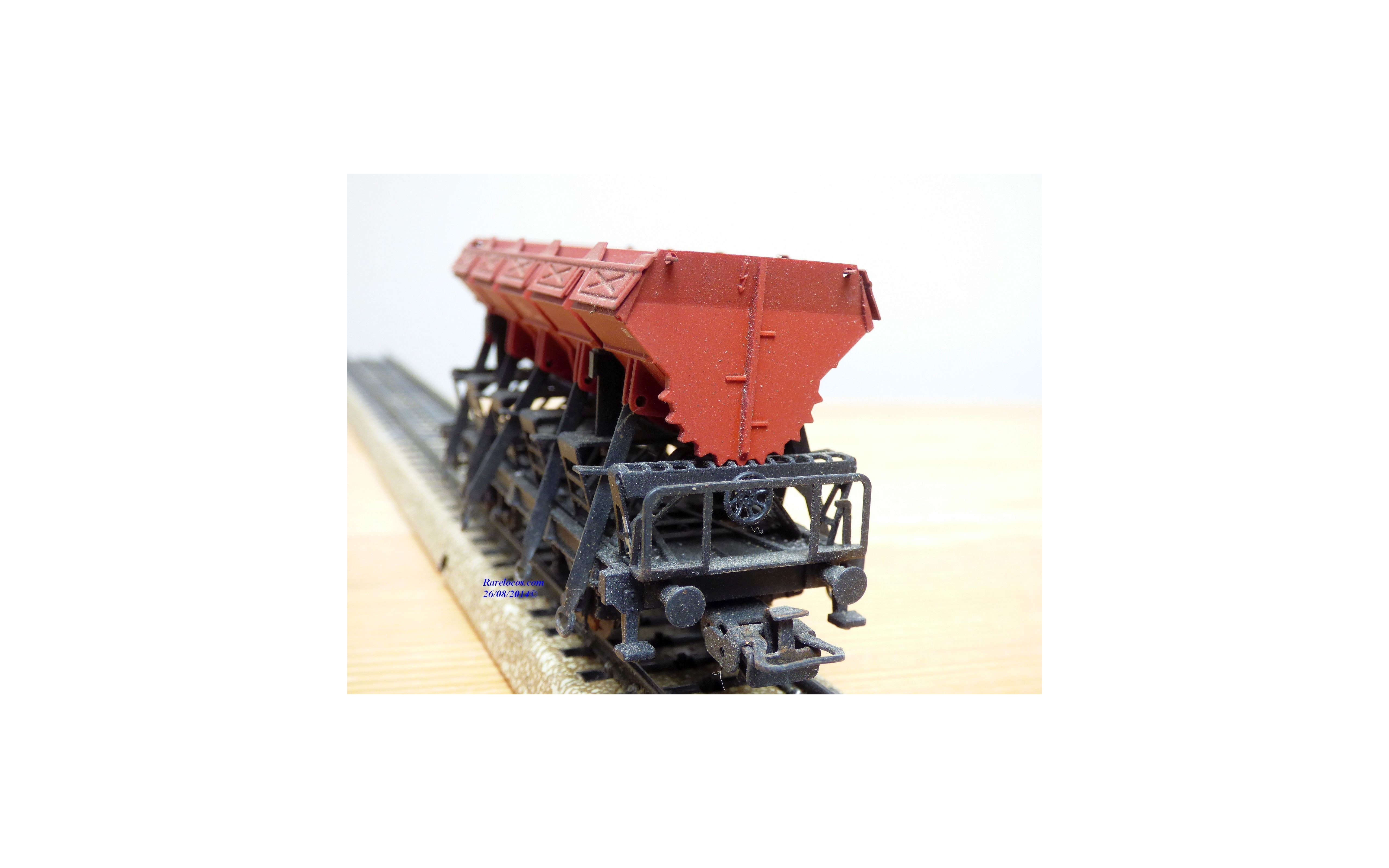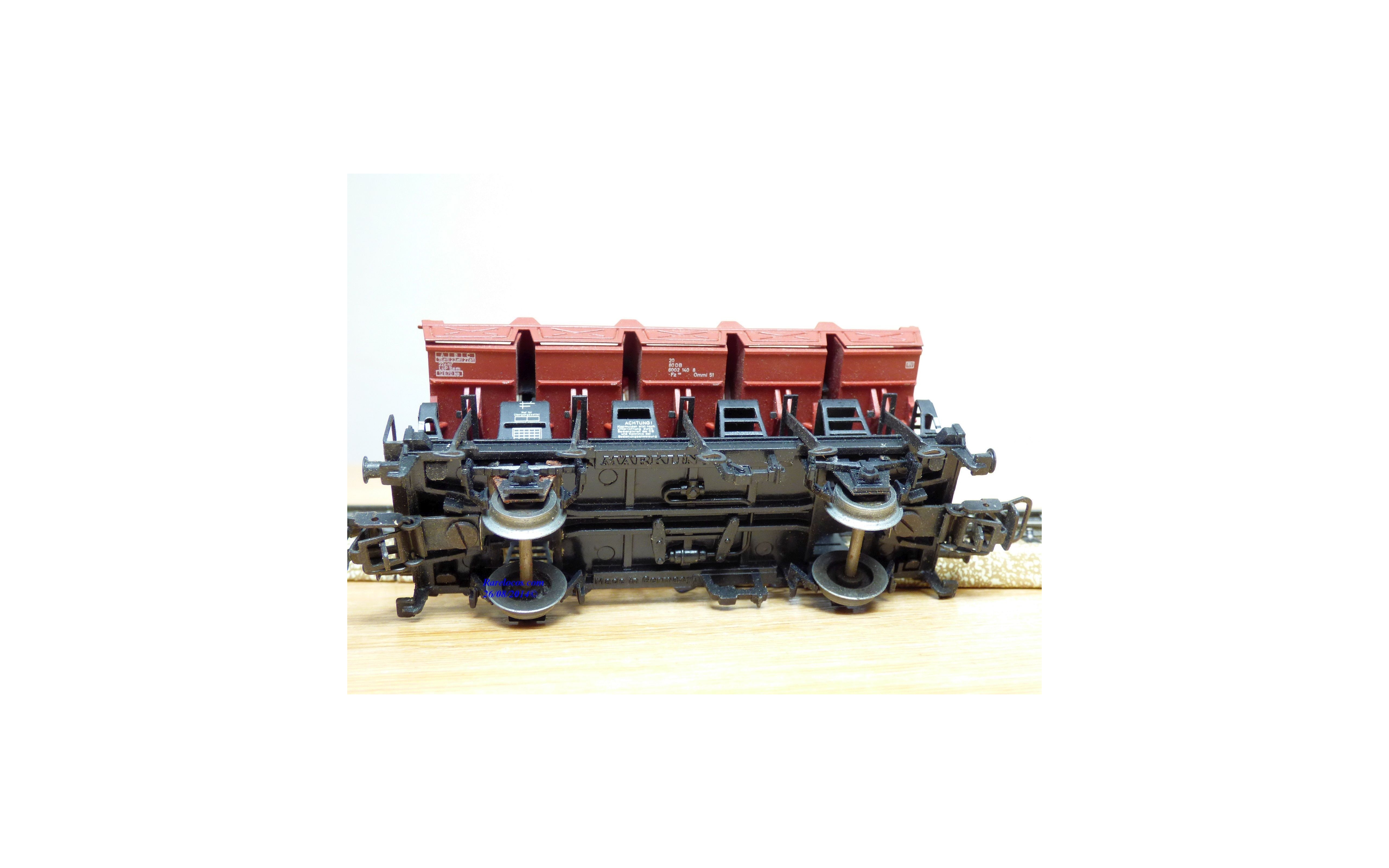 Wagon à bennes basculantes fonctionnelles ( Muldenkippwagen) à 2 essieux type Ommi 51 des chemins de fer allemands ( DB ), livrée marron, chargé de sable aggloméré qui lui donne un air patiné très réussi, emballage d'origine complet en état neuf.