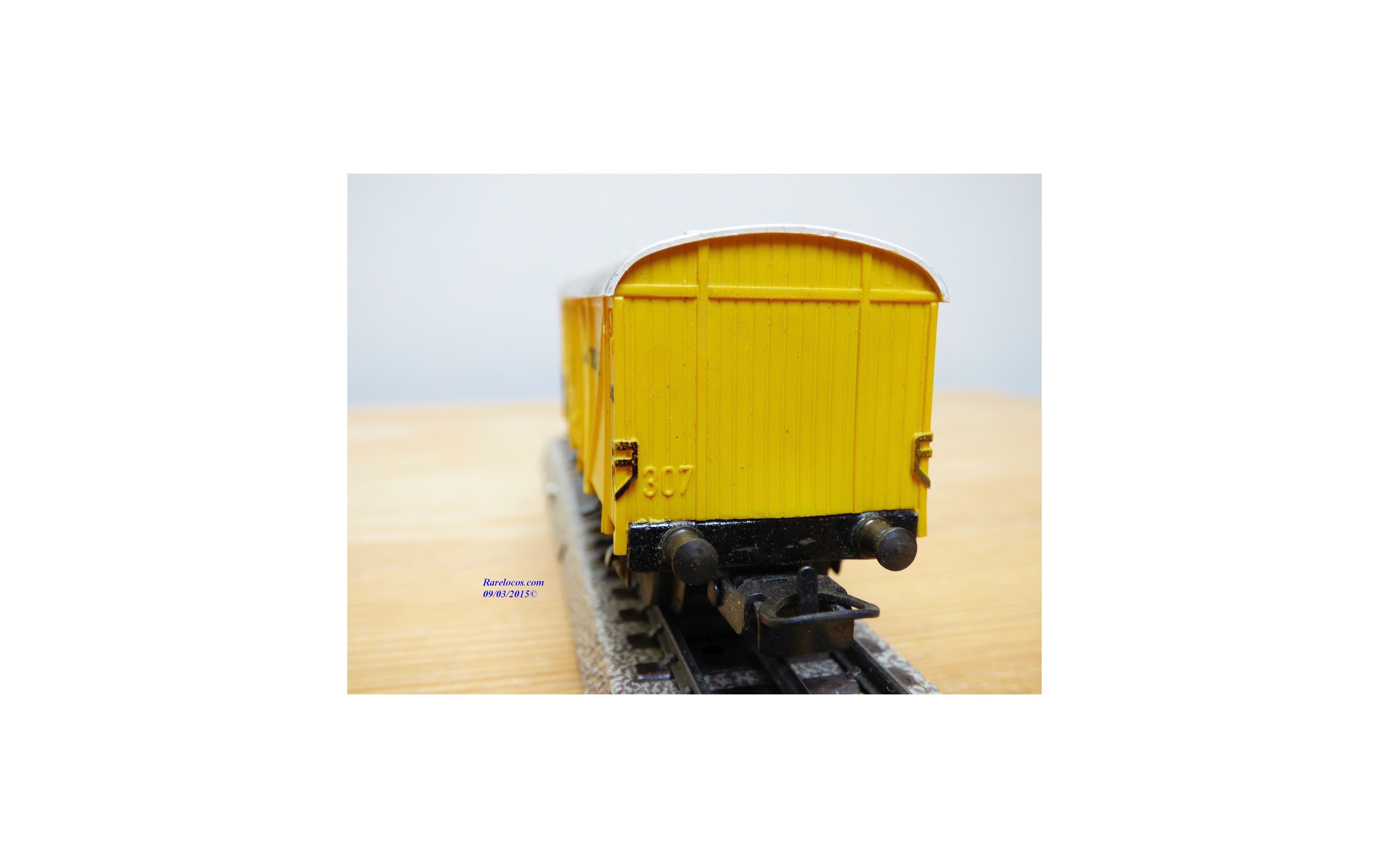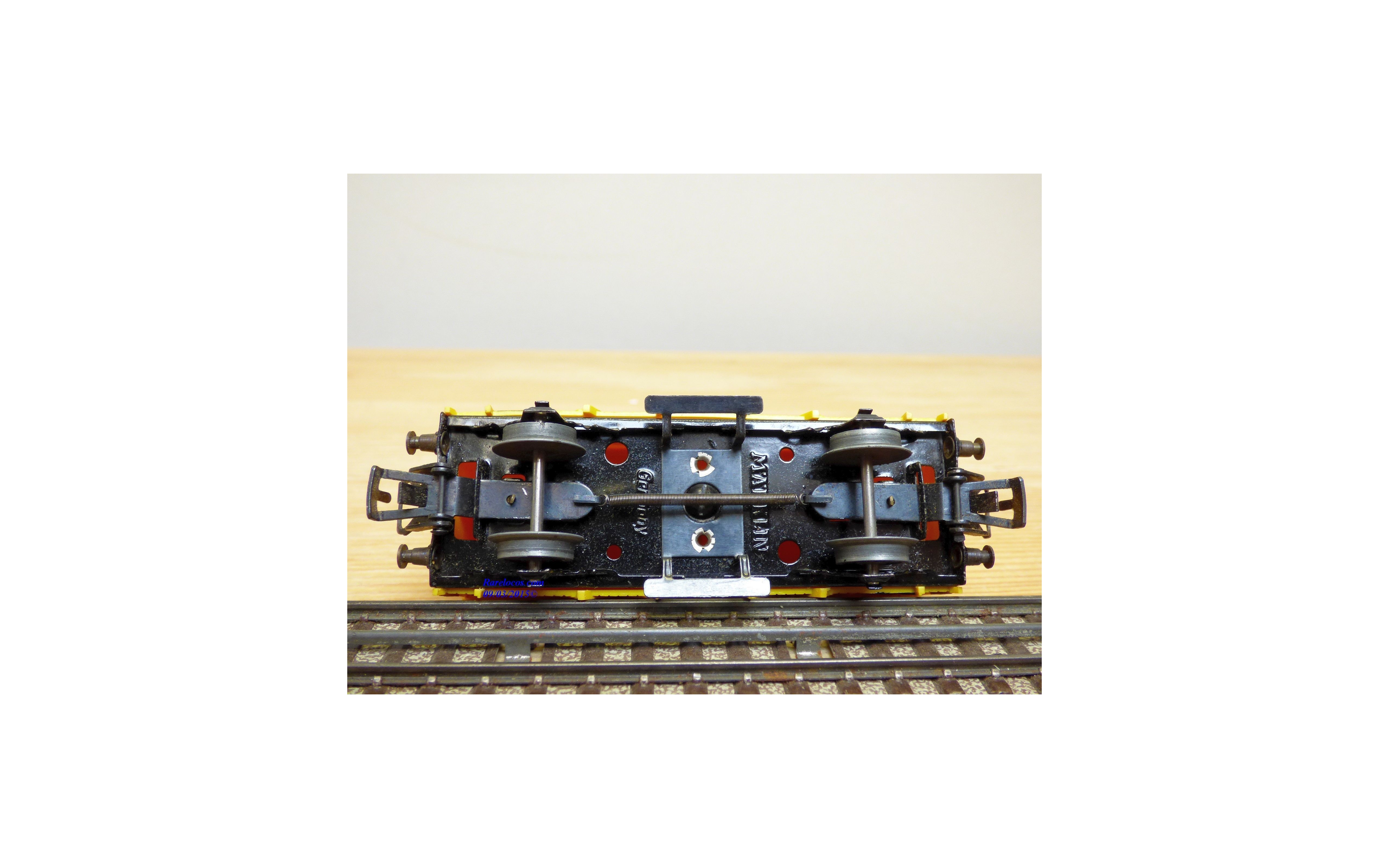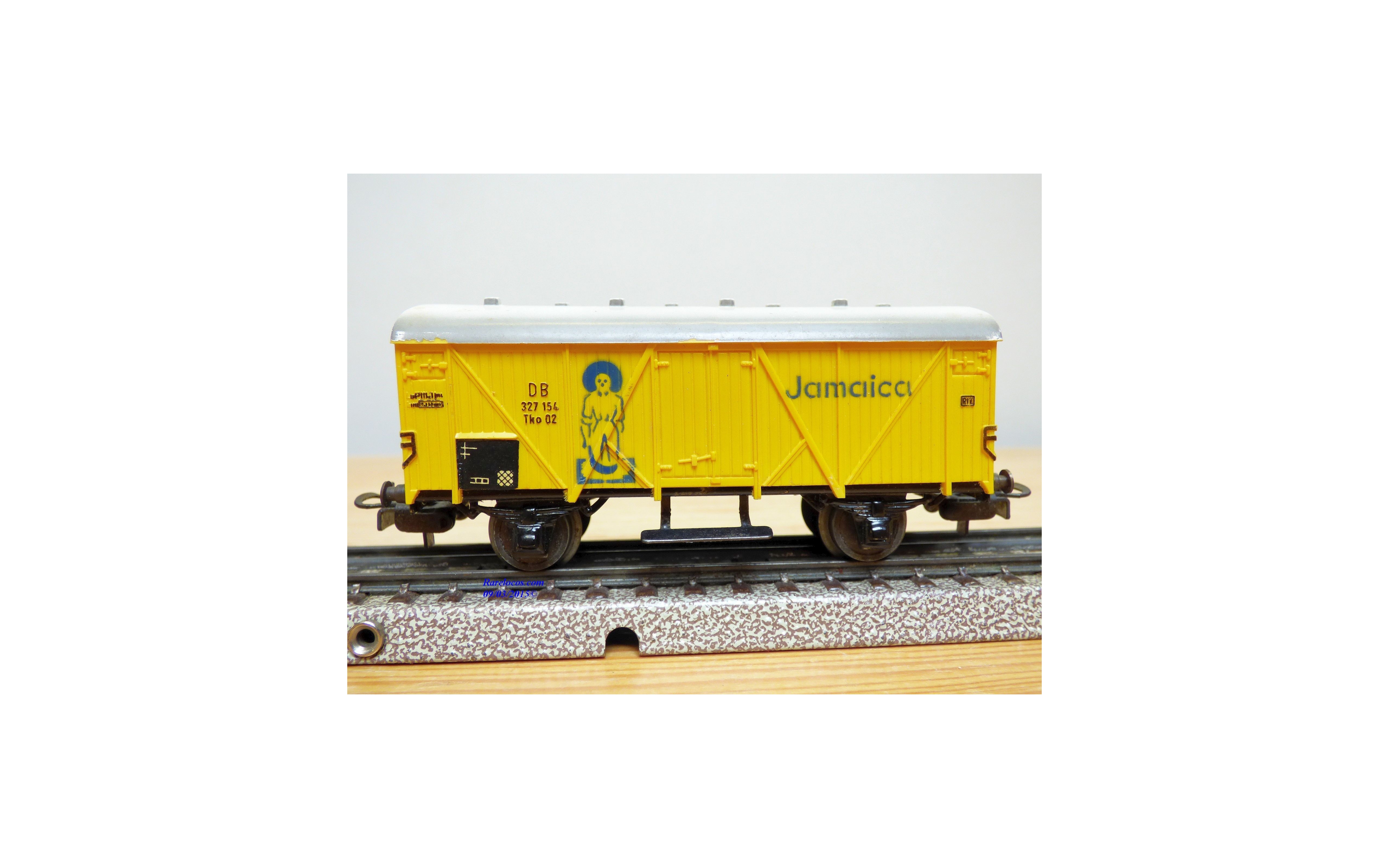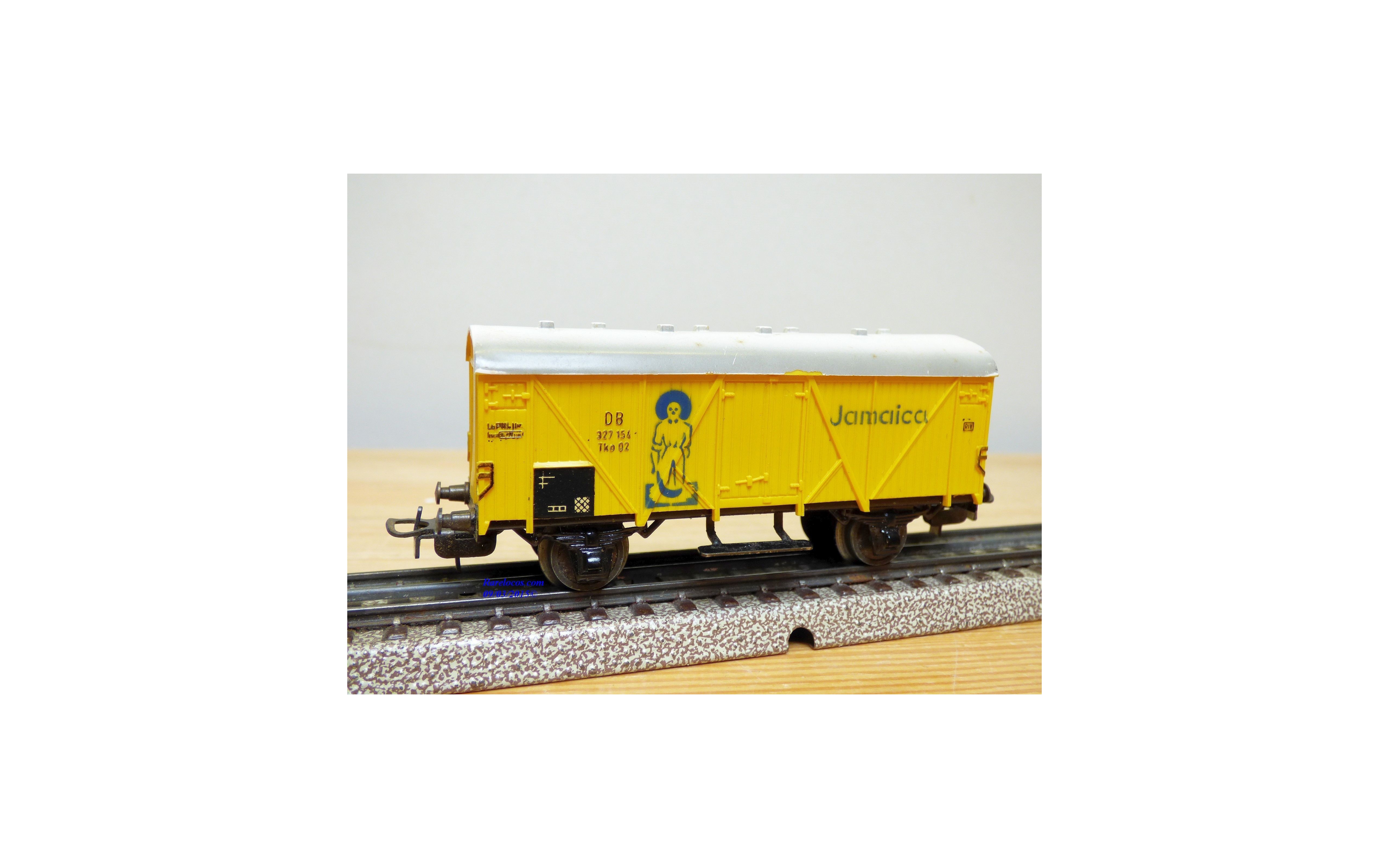 Wagon couvert réfrigérant à 2 essieux type Tko 02 des chemins de fer allemands ( DB ), livrée jaune à toit blanc avec marquages JAMAICA et image d'un ceuilleur de bananes, pas d' emballage d'origine.