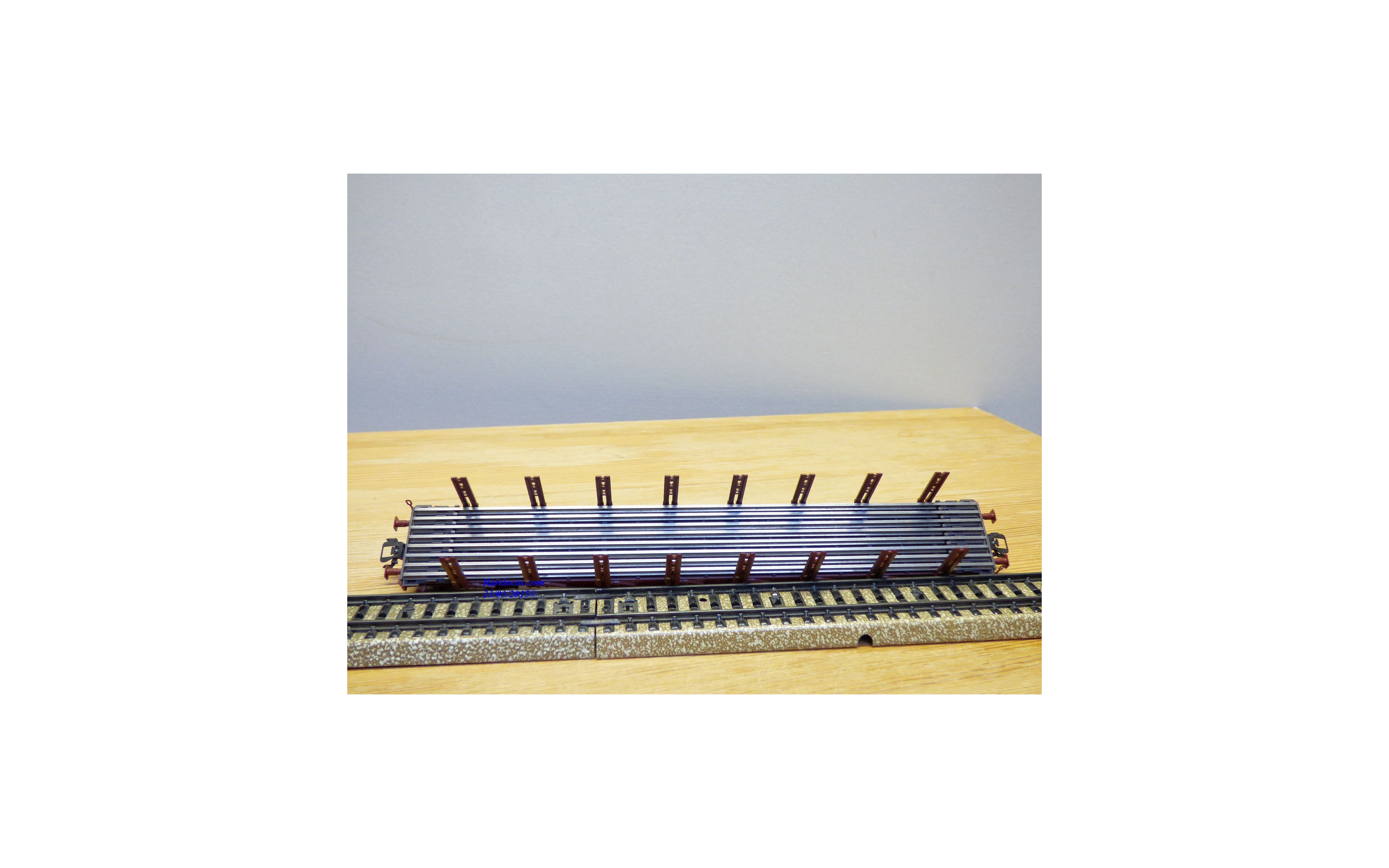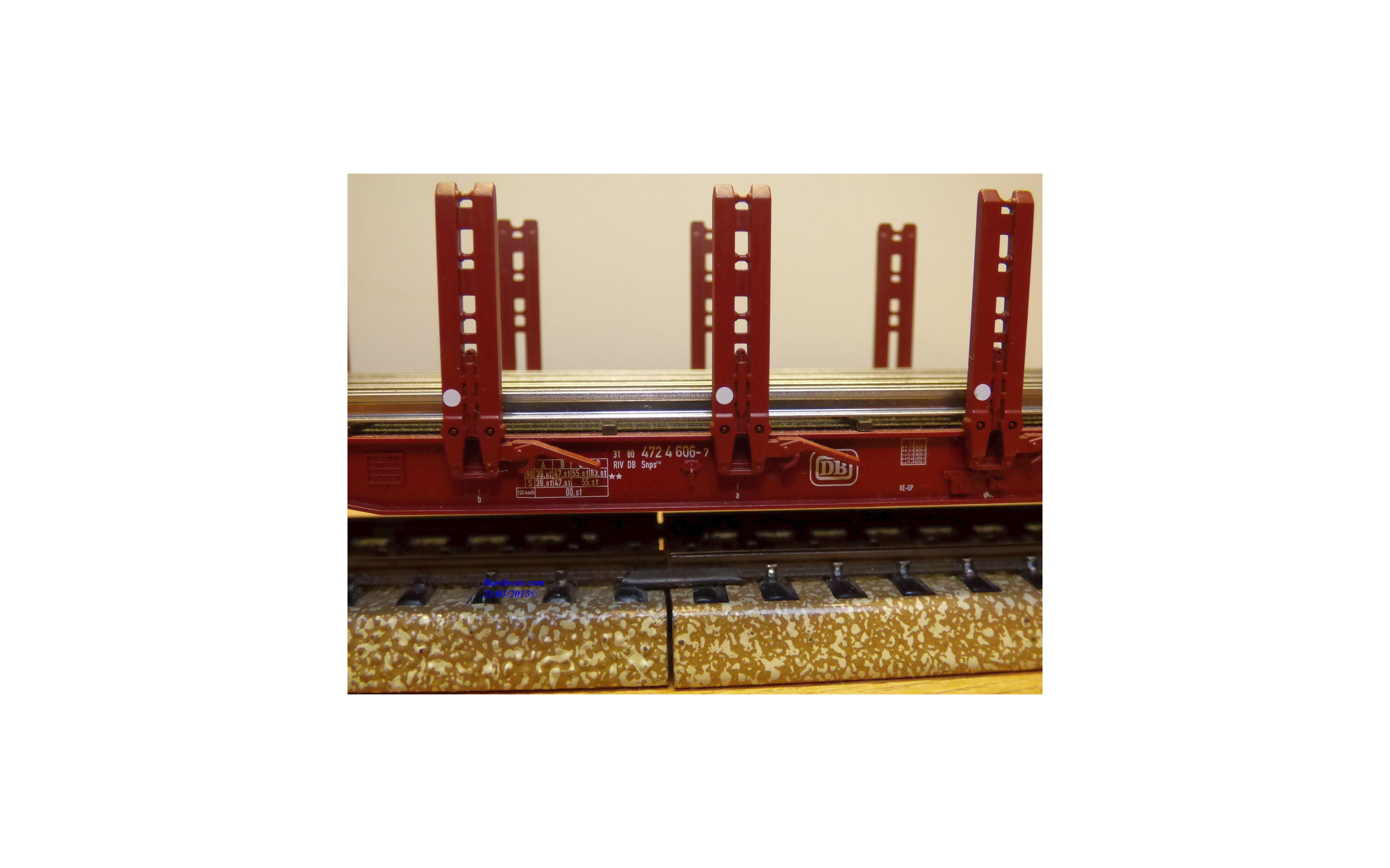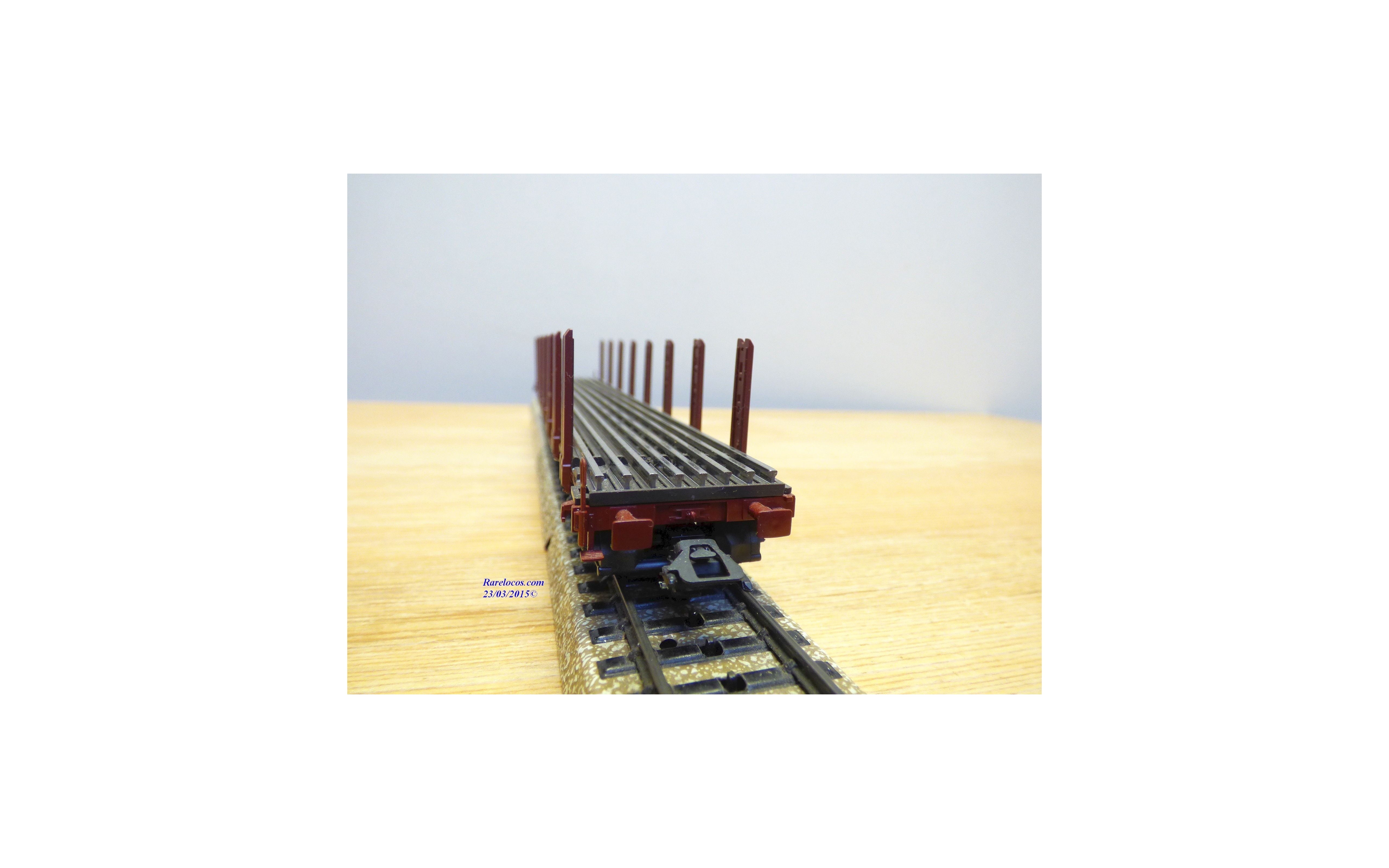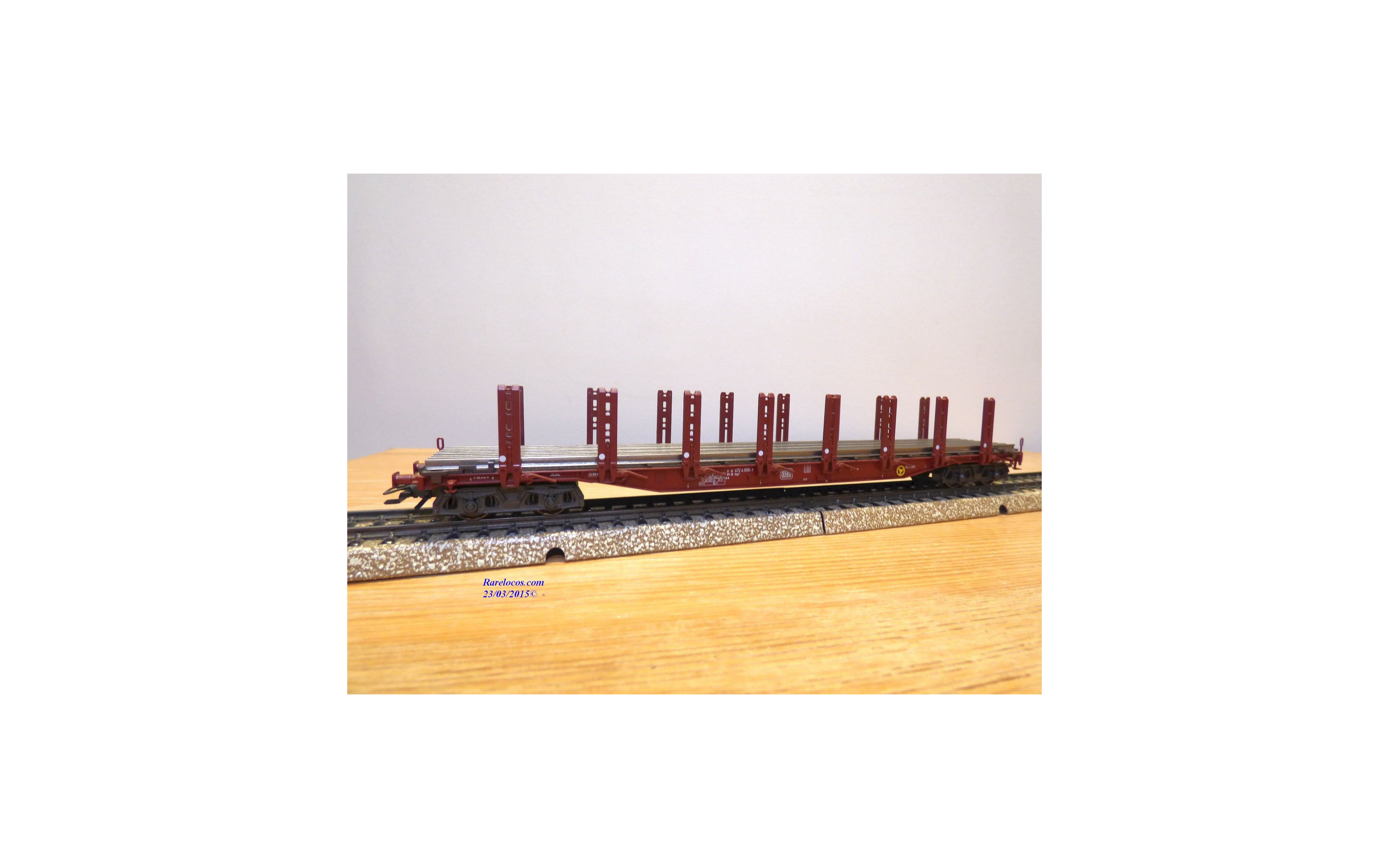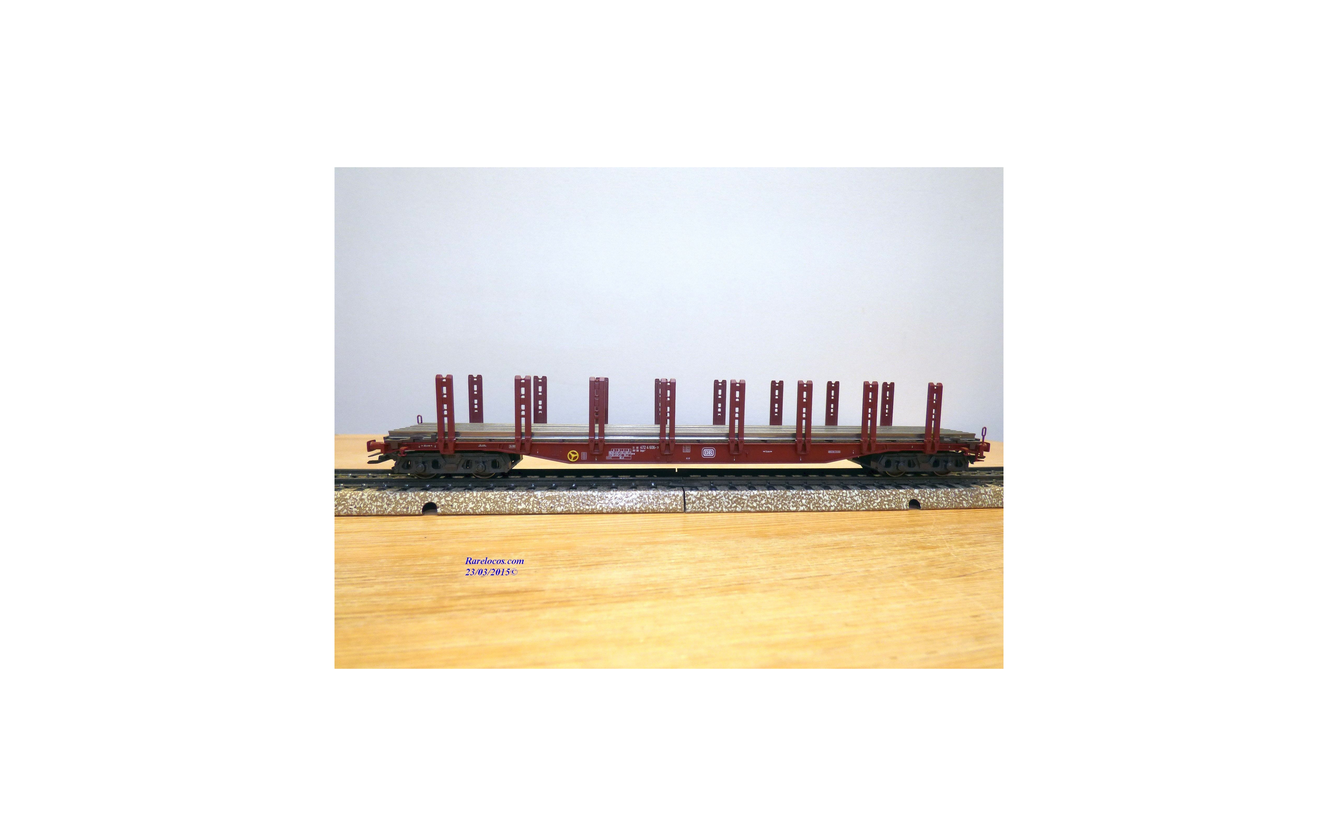 Wagon plat à ranchers à 2 bogies type Snps 719 des chemins de fer allemands ( DB ), chargé de rails, emballage d'origine en état neuf.
