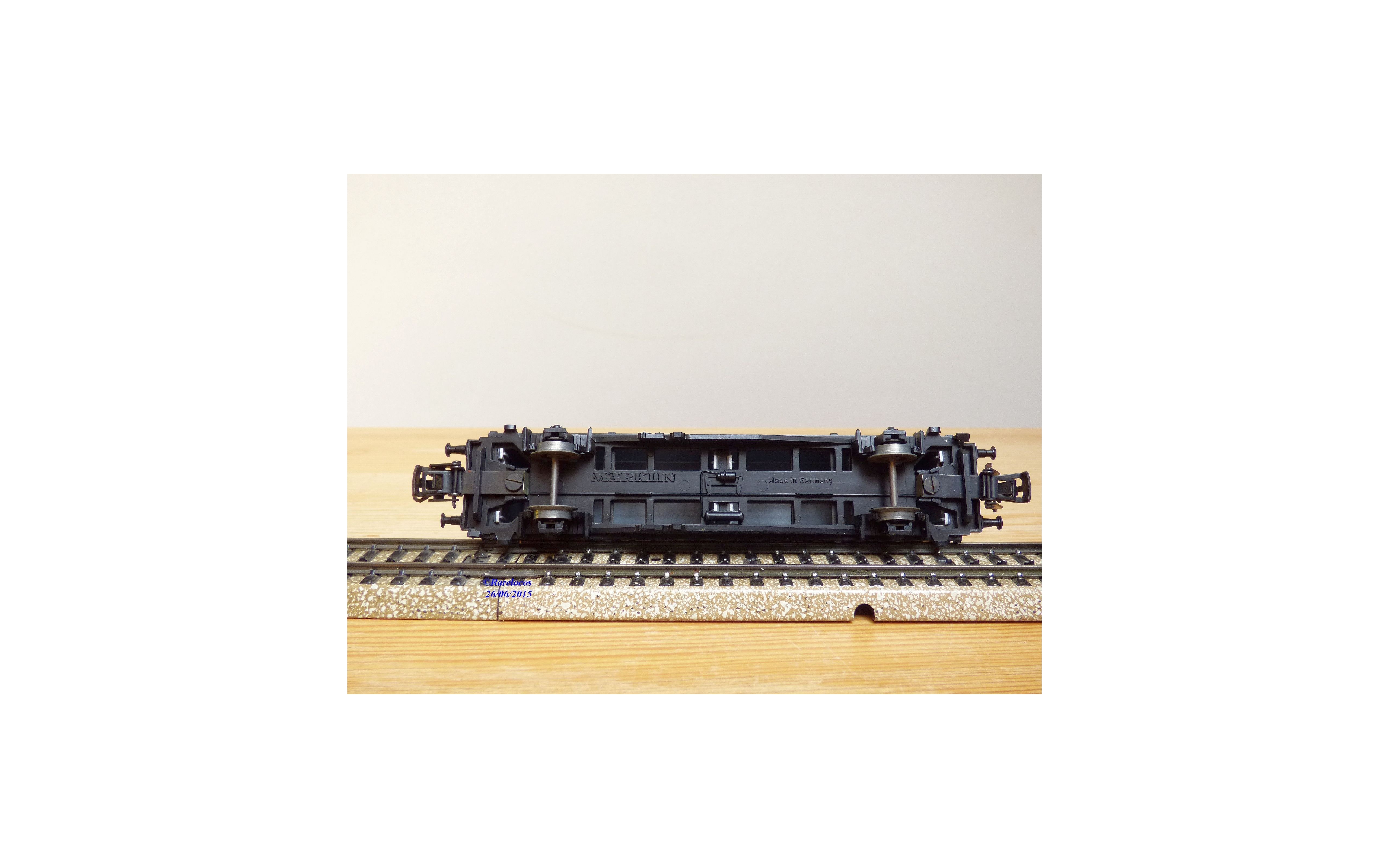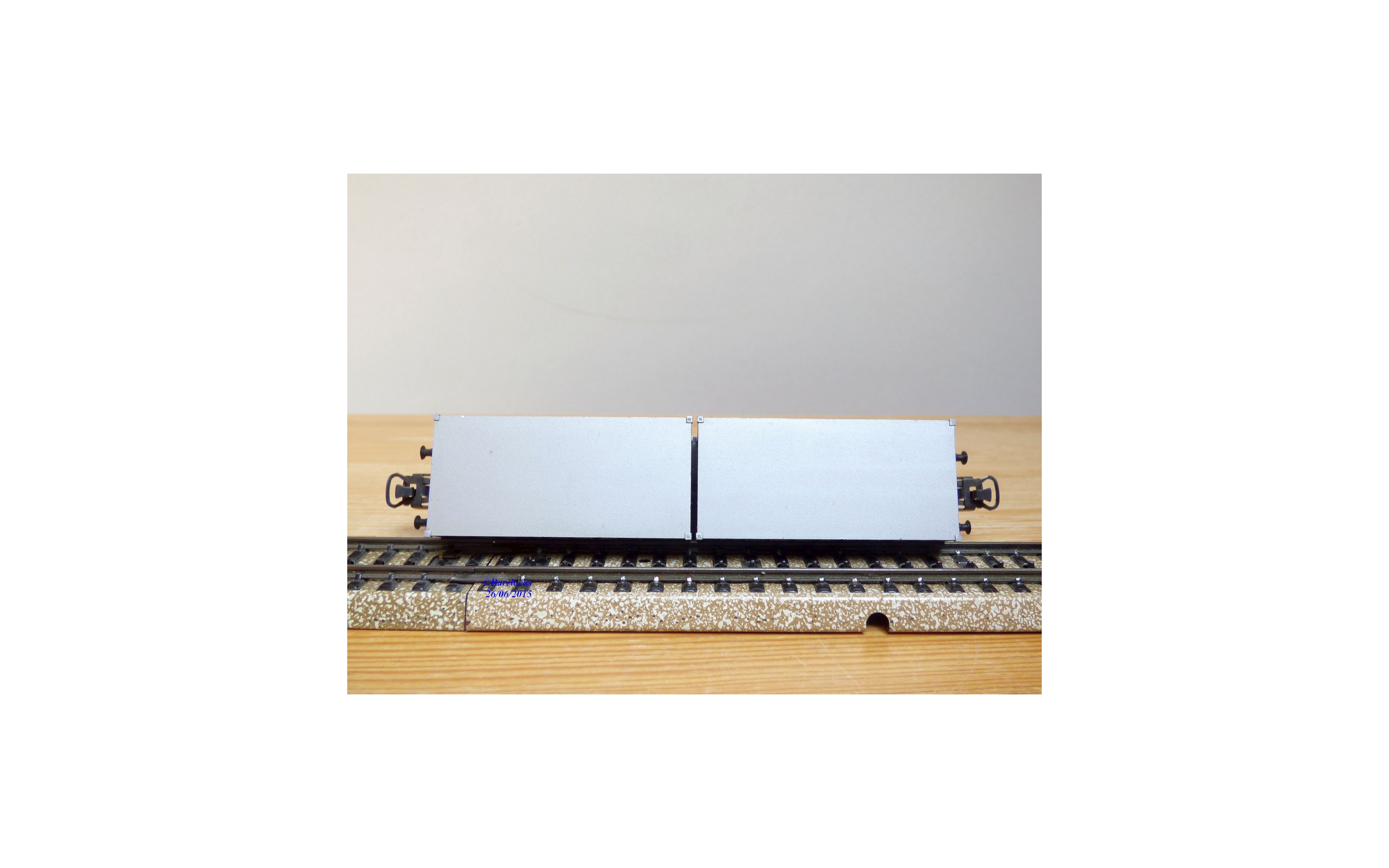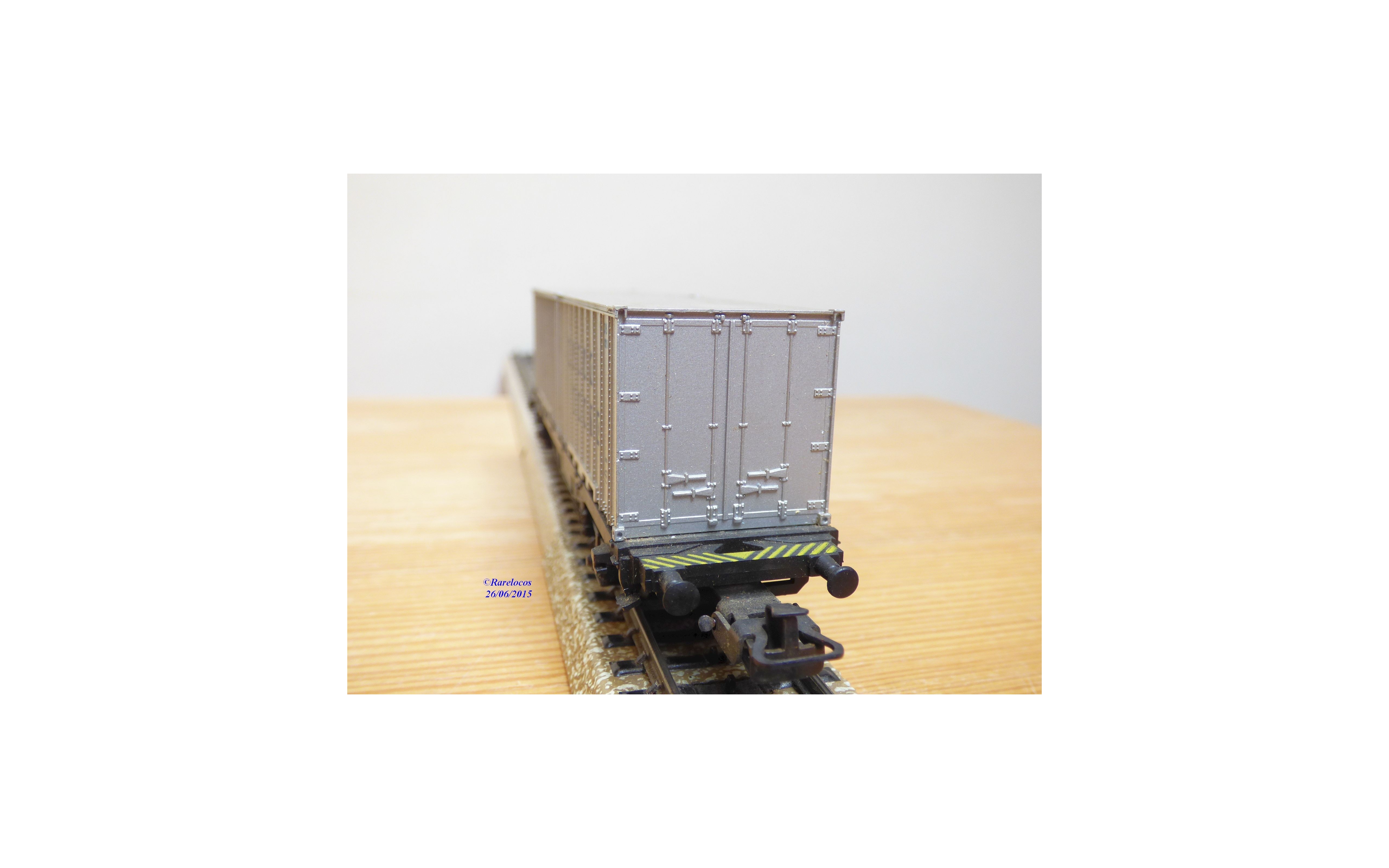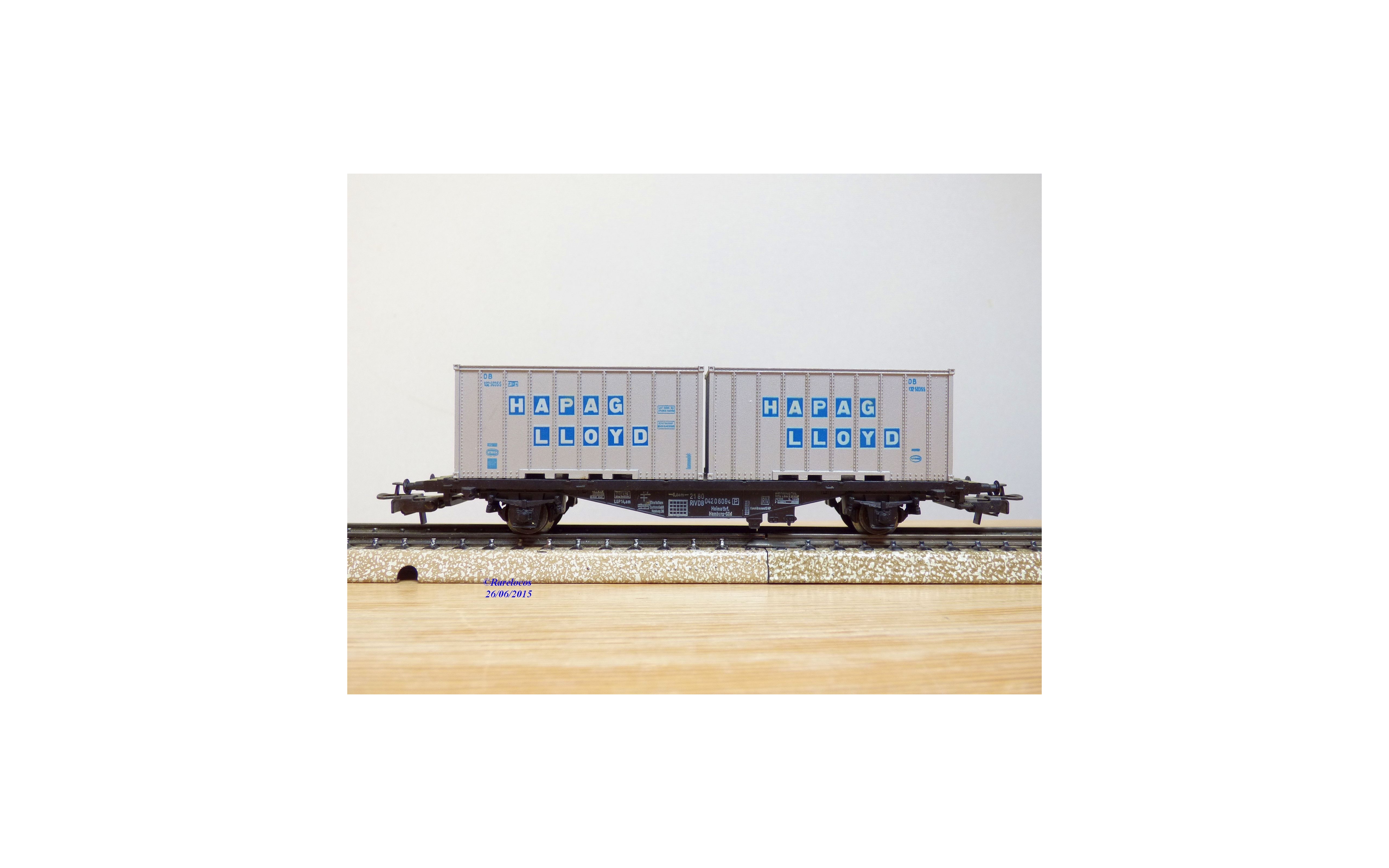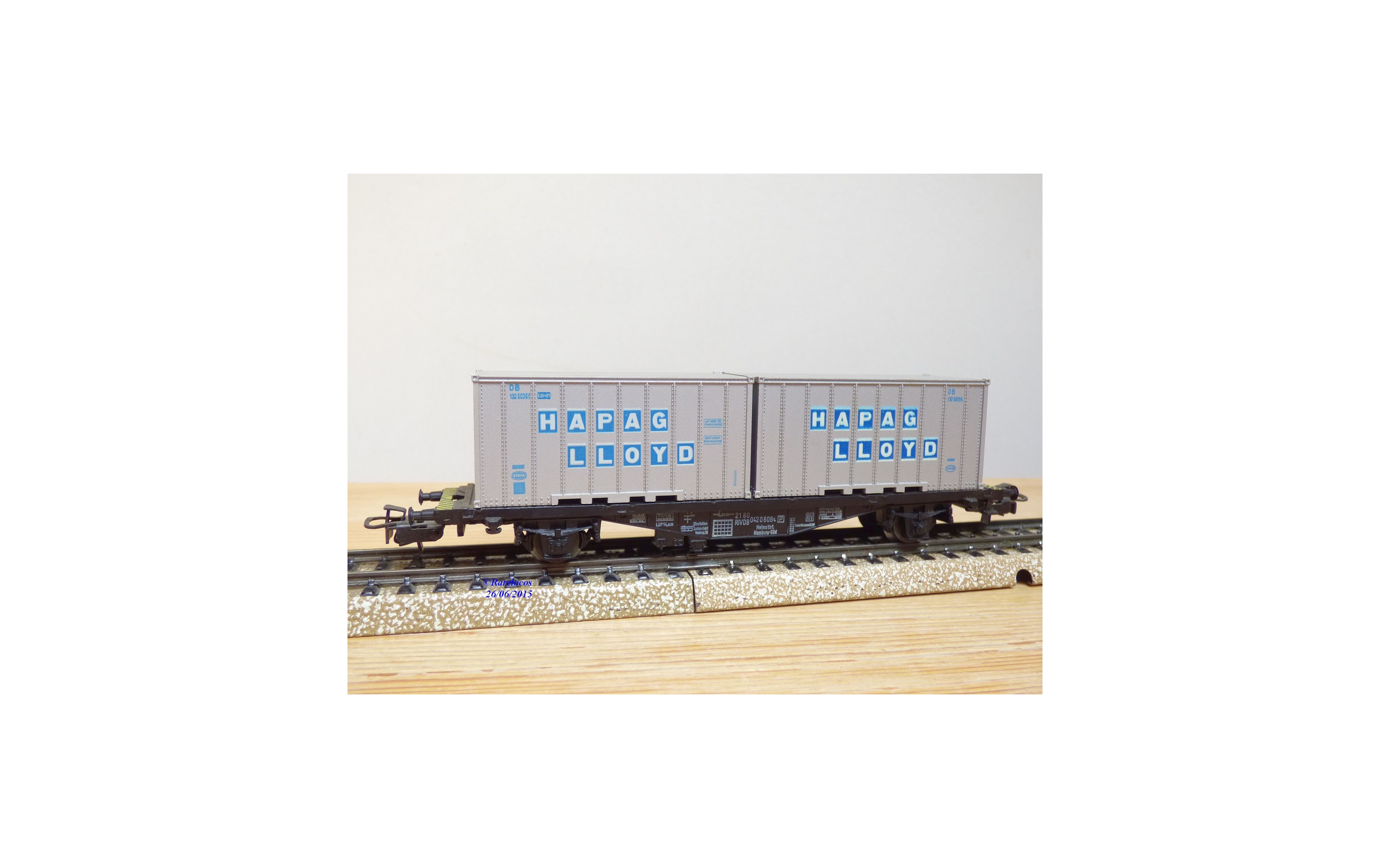 Wagon plat porte conteneurs à 2 essieux type Berlin des chemins de fer allemands ( DB ), livrée noire, conteneurs gris argent, chargé de 2 conteneurs amovibles de 20 ' aux couleurs de HAPAG LLOYD, emballage d'origine complet en état neuf.