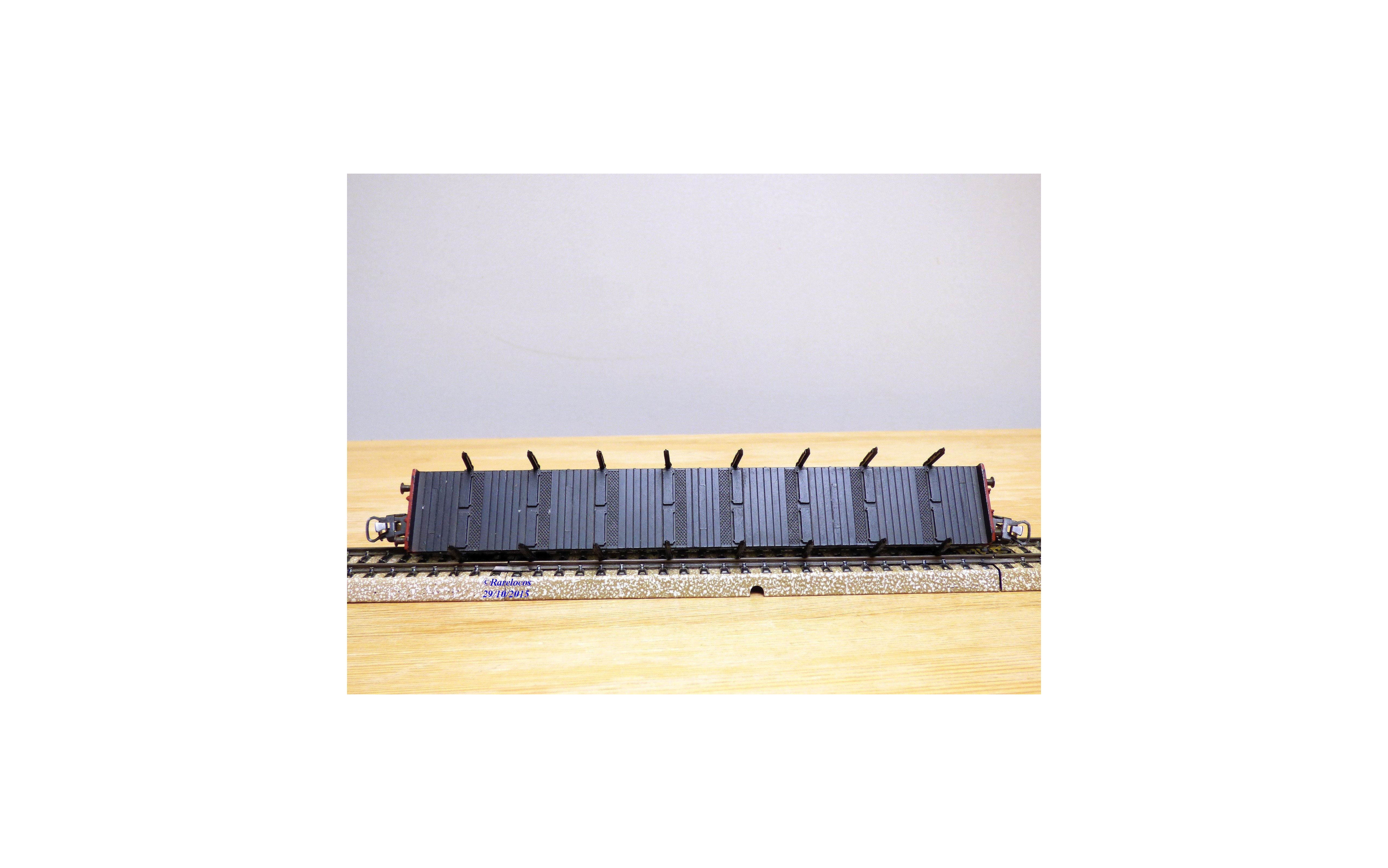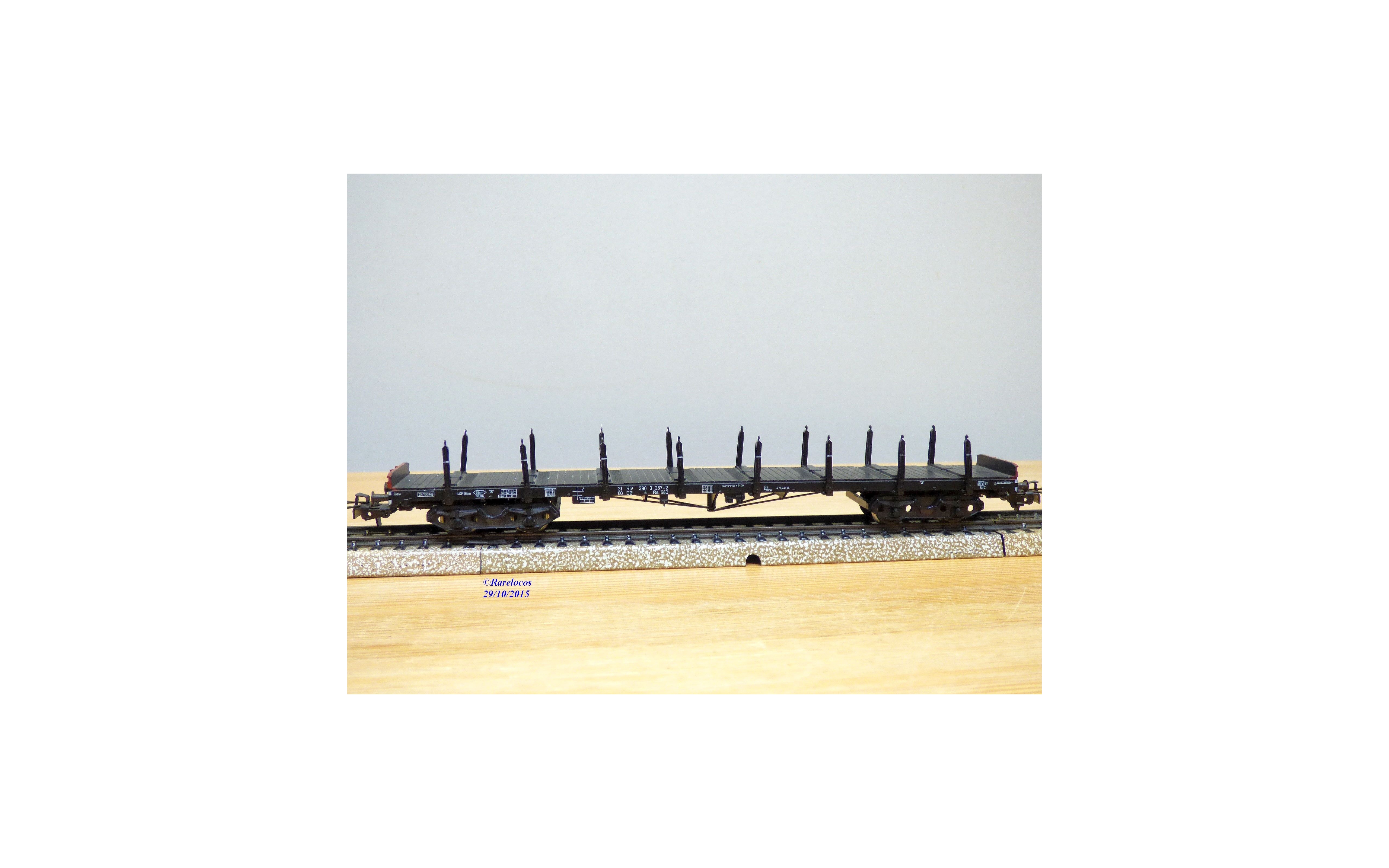 Wagon plat à ranchers ( articulés,voir photos ) à 2 bogies type Rs 680 des chemins de fer allemands ( DB ), livrée noire, wagon en métal et ranchers en plastique, emballage d'origine en état neuf .