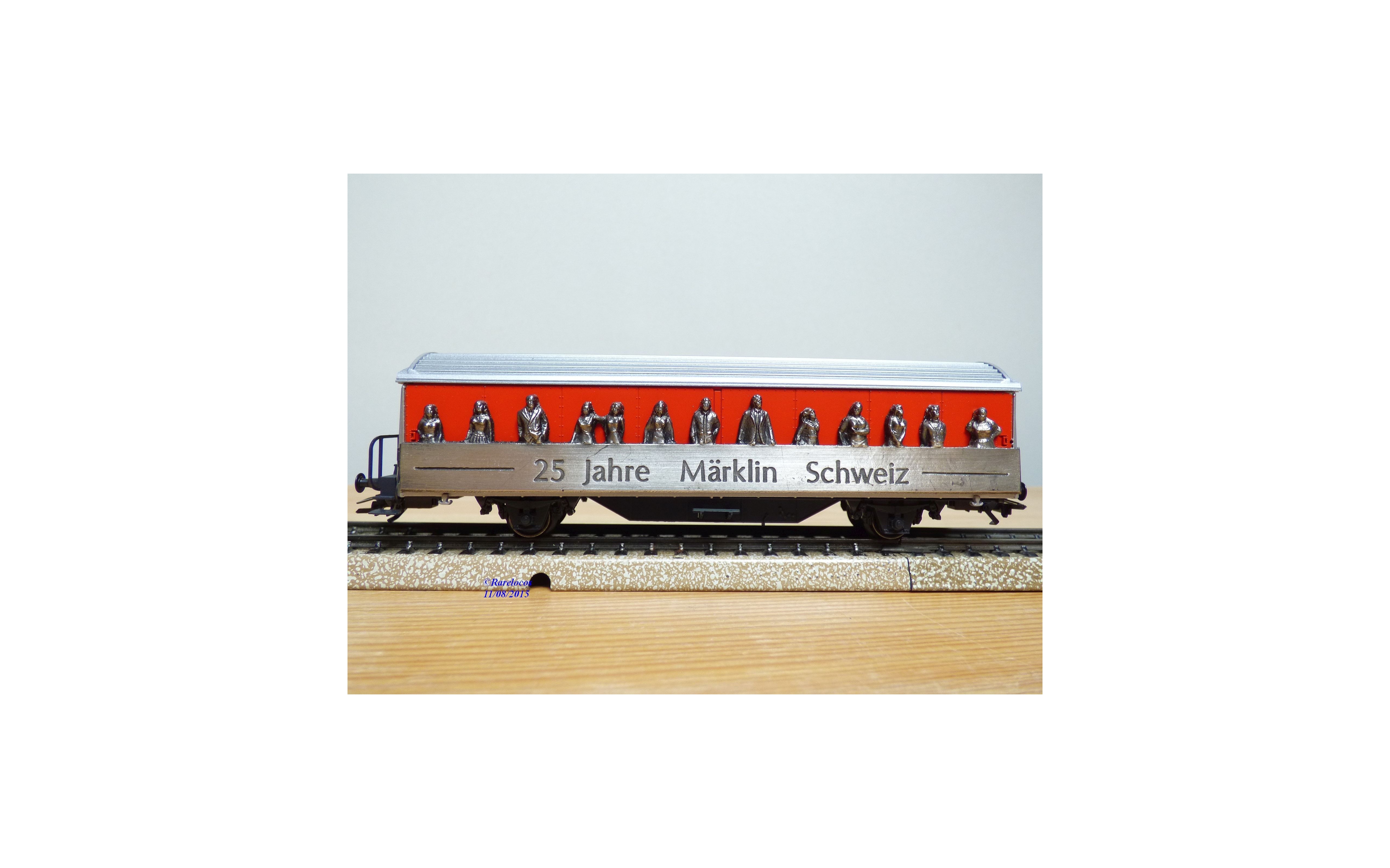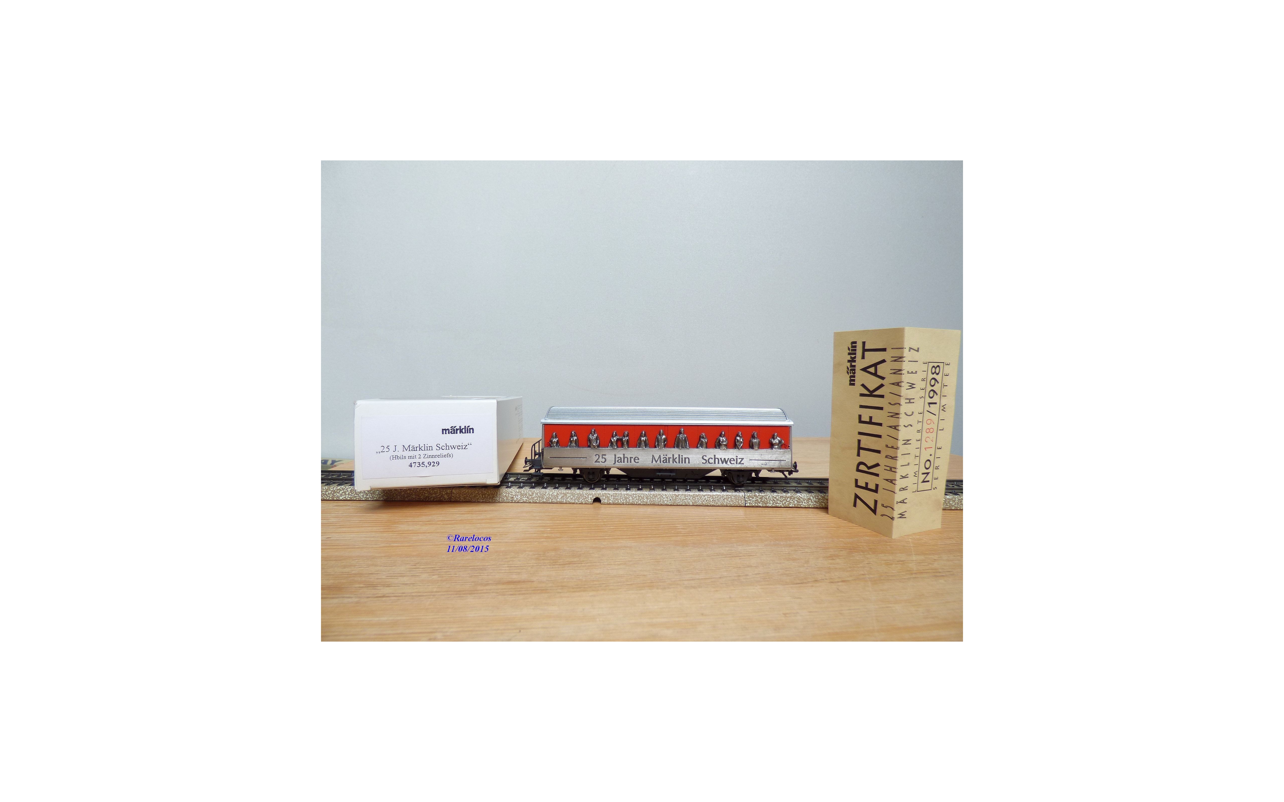 Rare, série limitée et numérotée de 1998 exemplaires ( celui ci est le 1289) en 1998 pour commémorer les 25 ans de Märklin Suisse, les personnages sur les parements de caisse sont les employés de Märklin Suisse à l'époque.