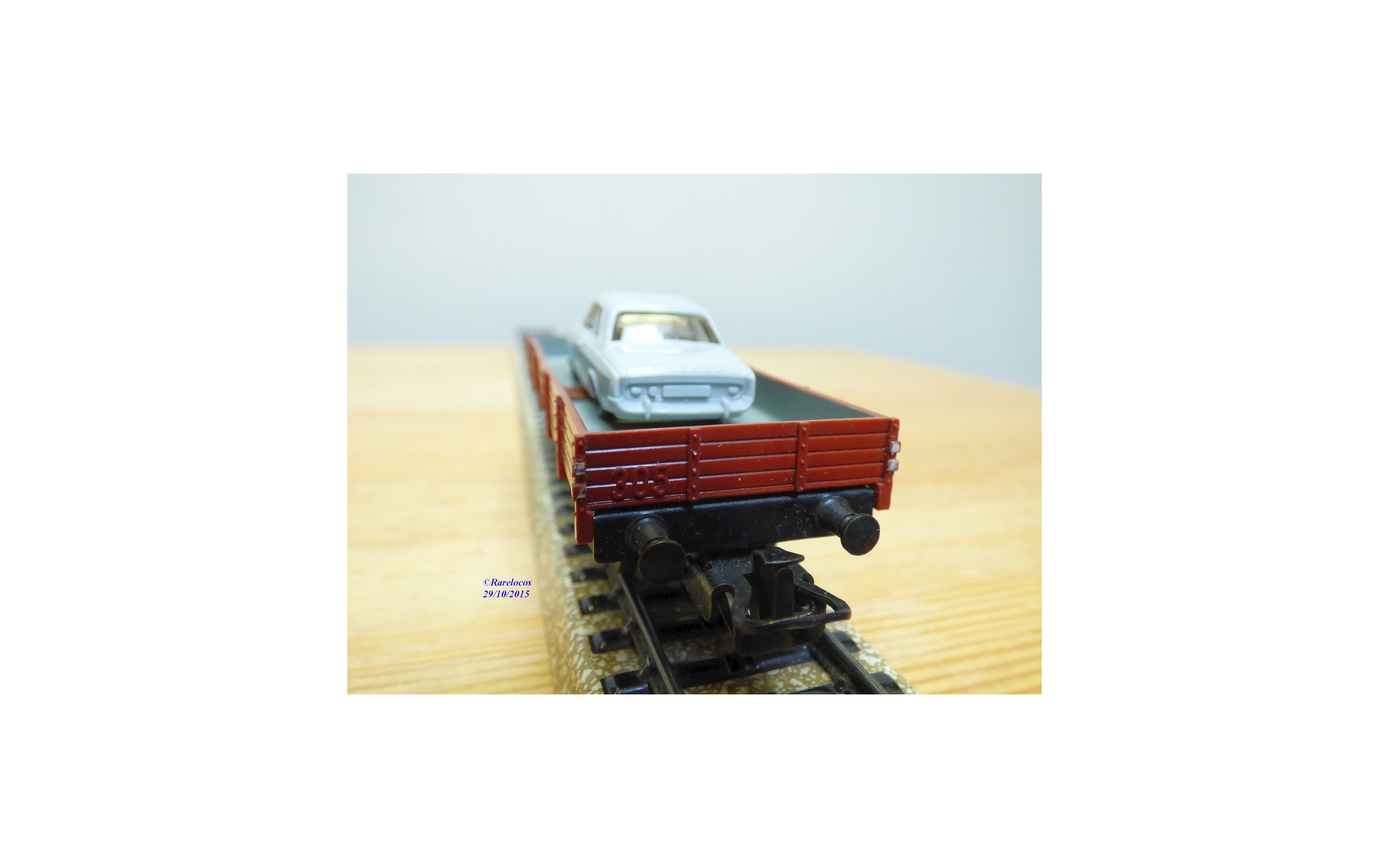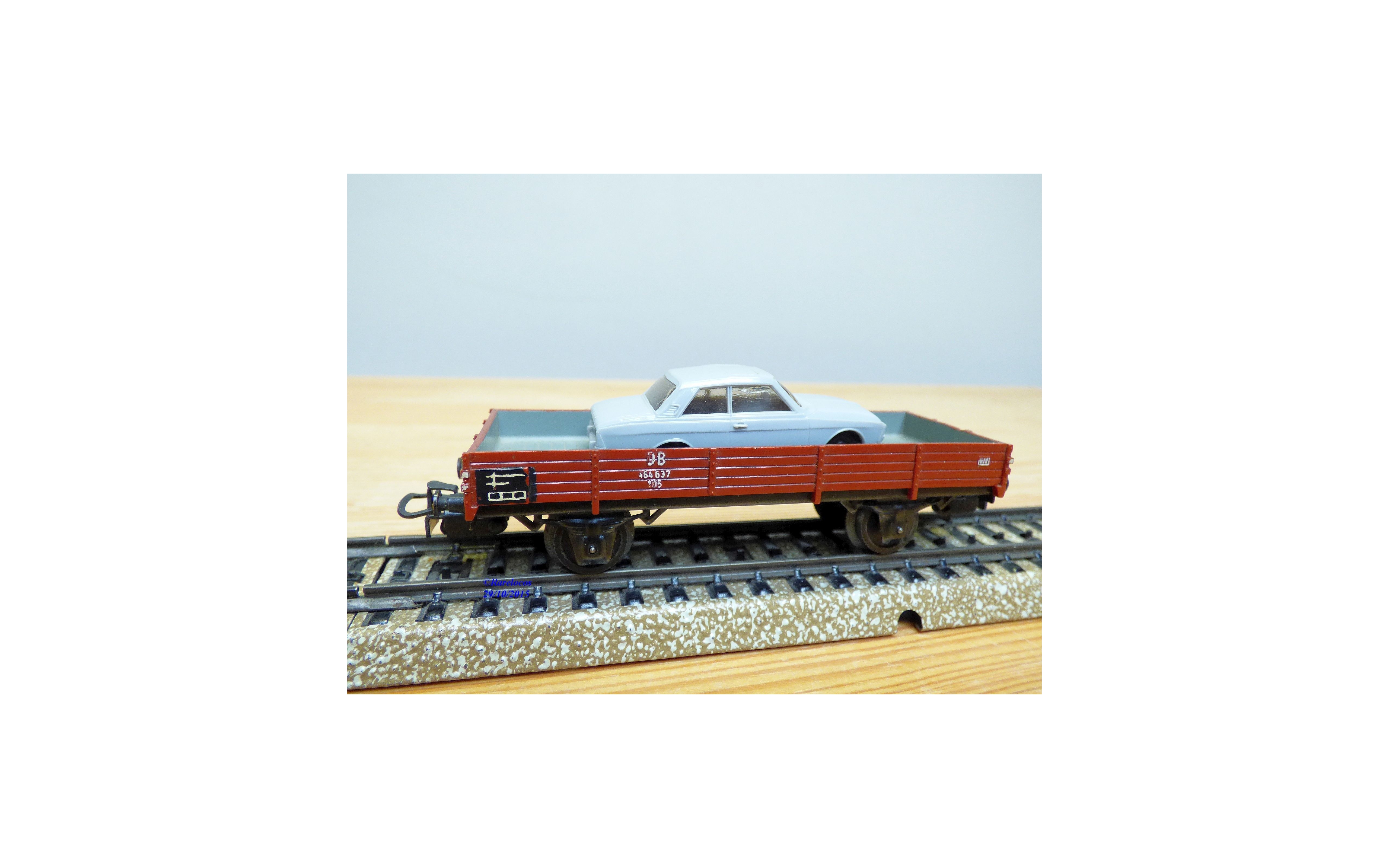 Wagon plat à 2 essieux type X 05 des chemins de fer allemands (DB ), chargé d'une FORD Taunus 17 M grise ( Märklin), emballage d'origine en état neuf.