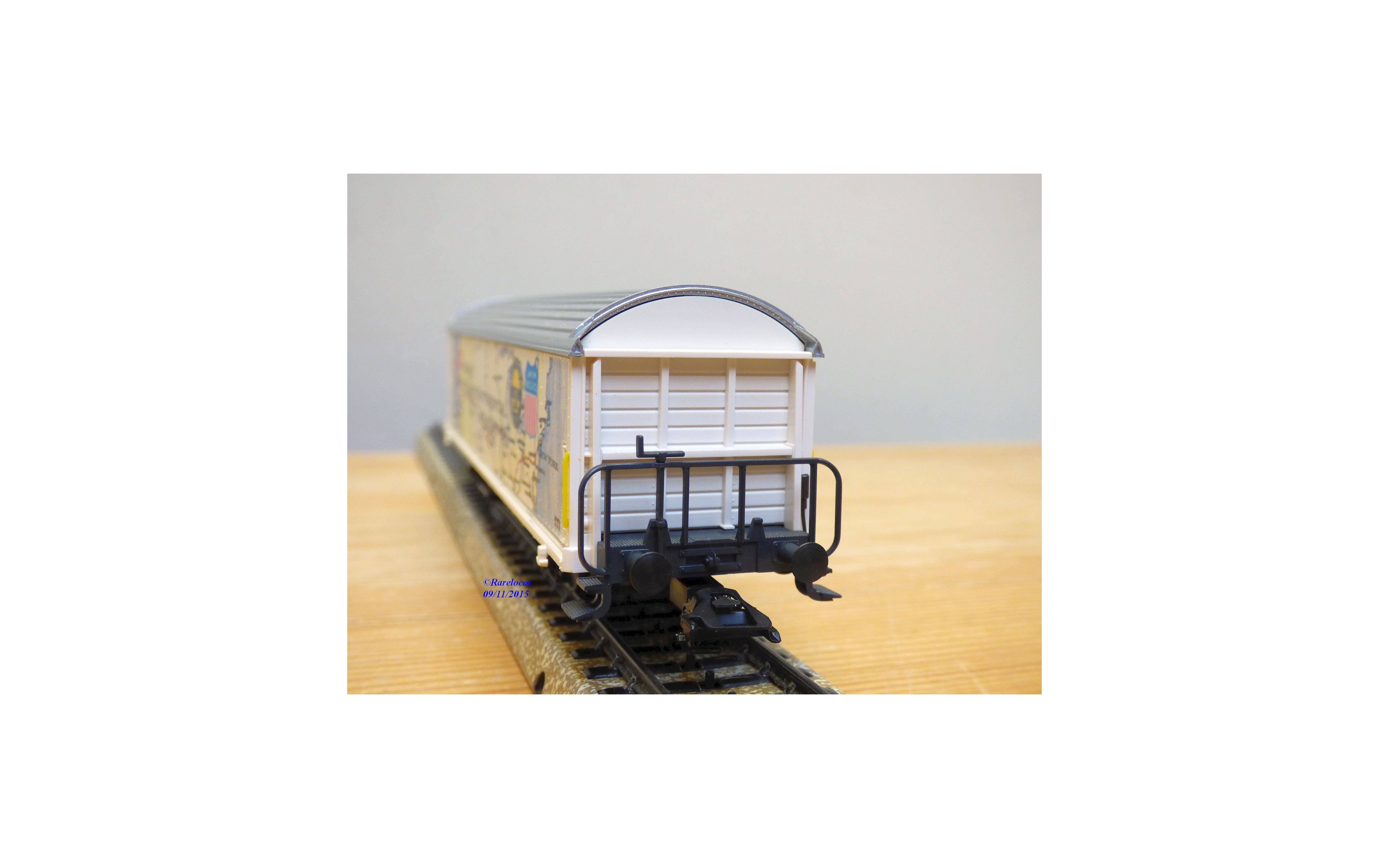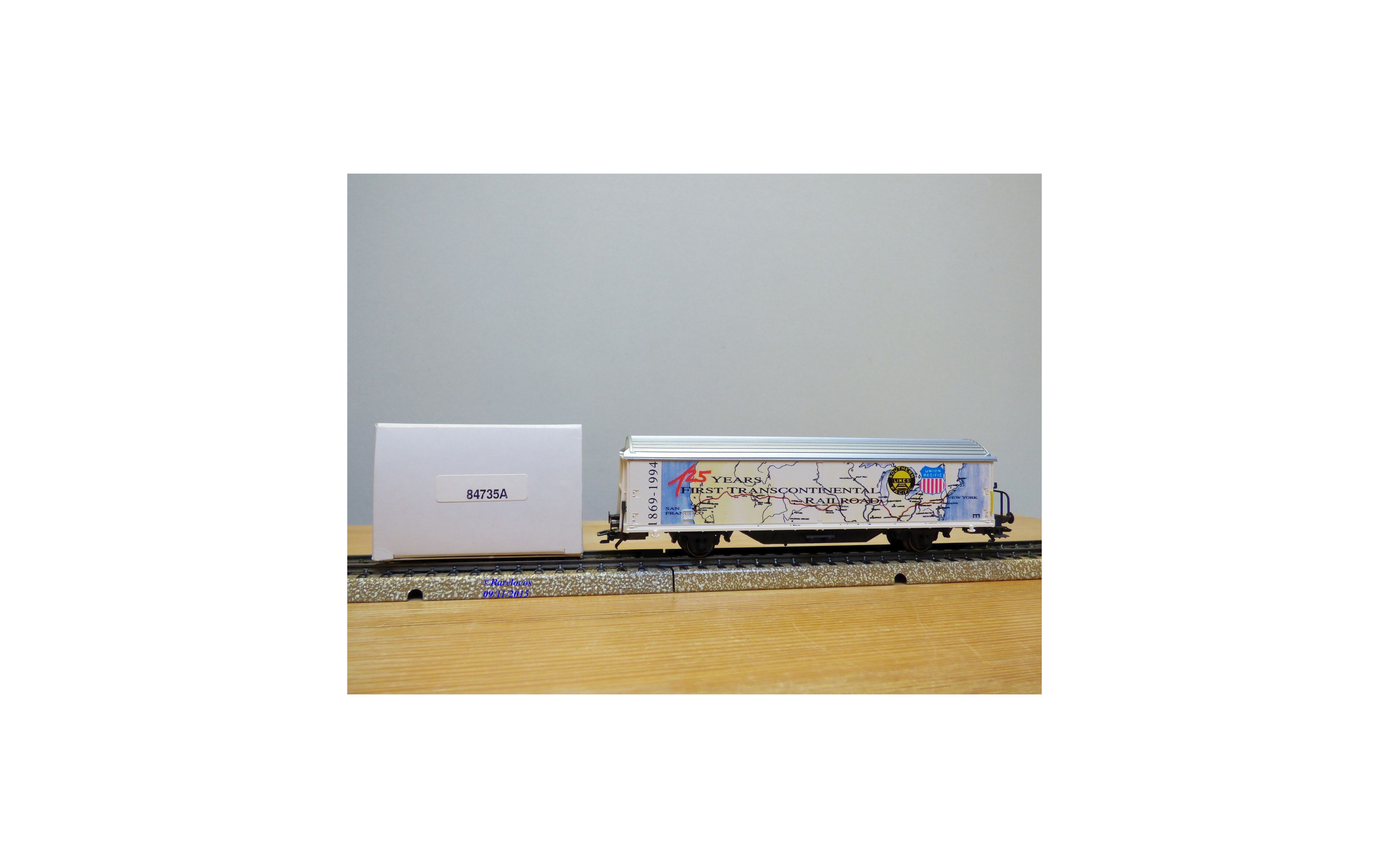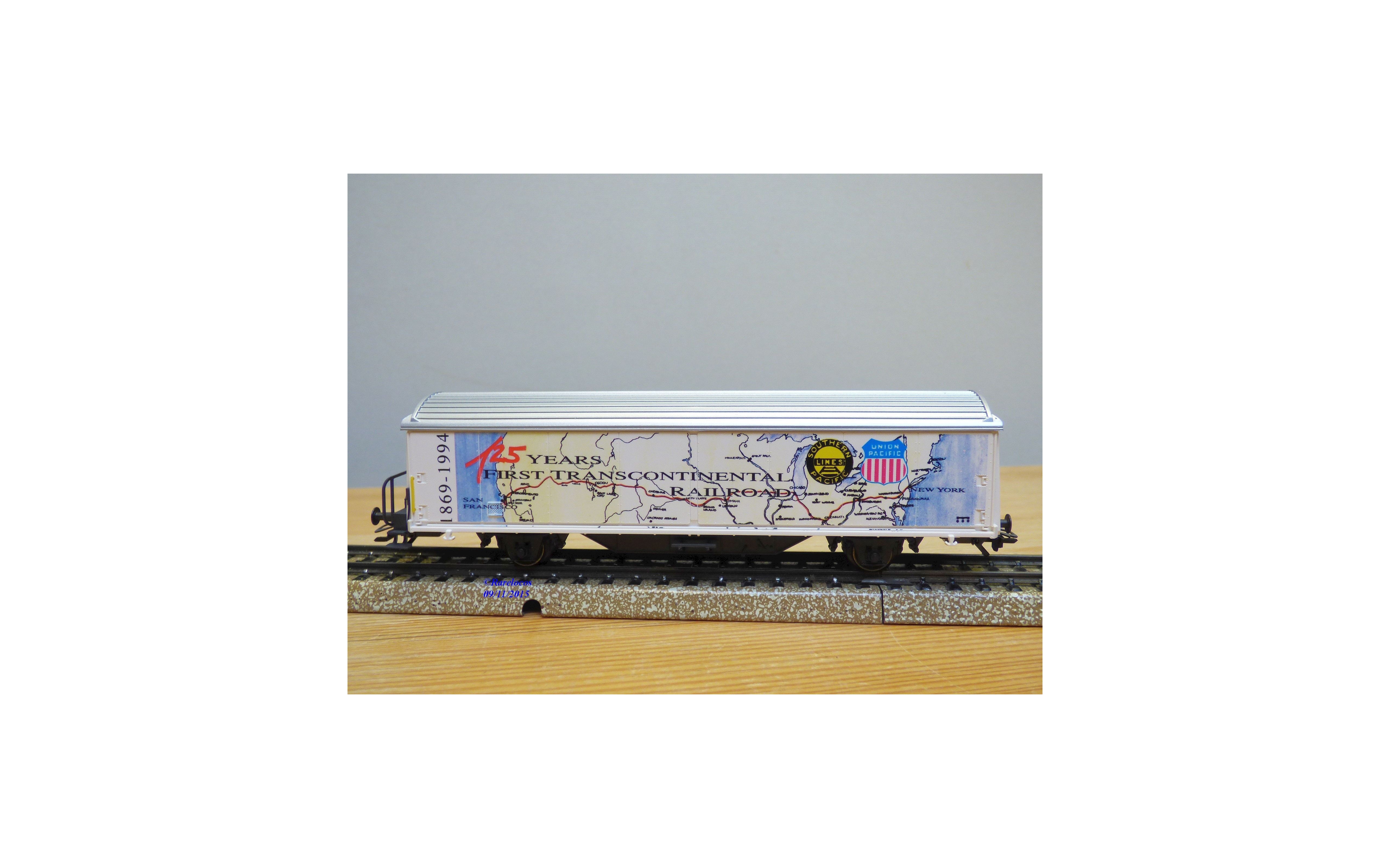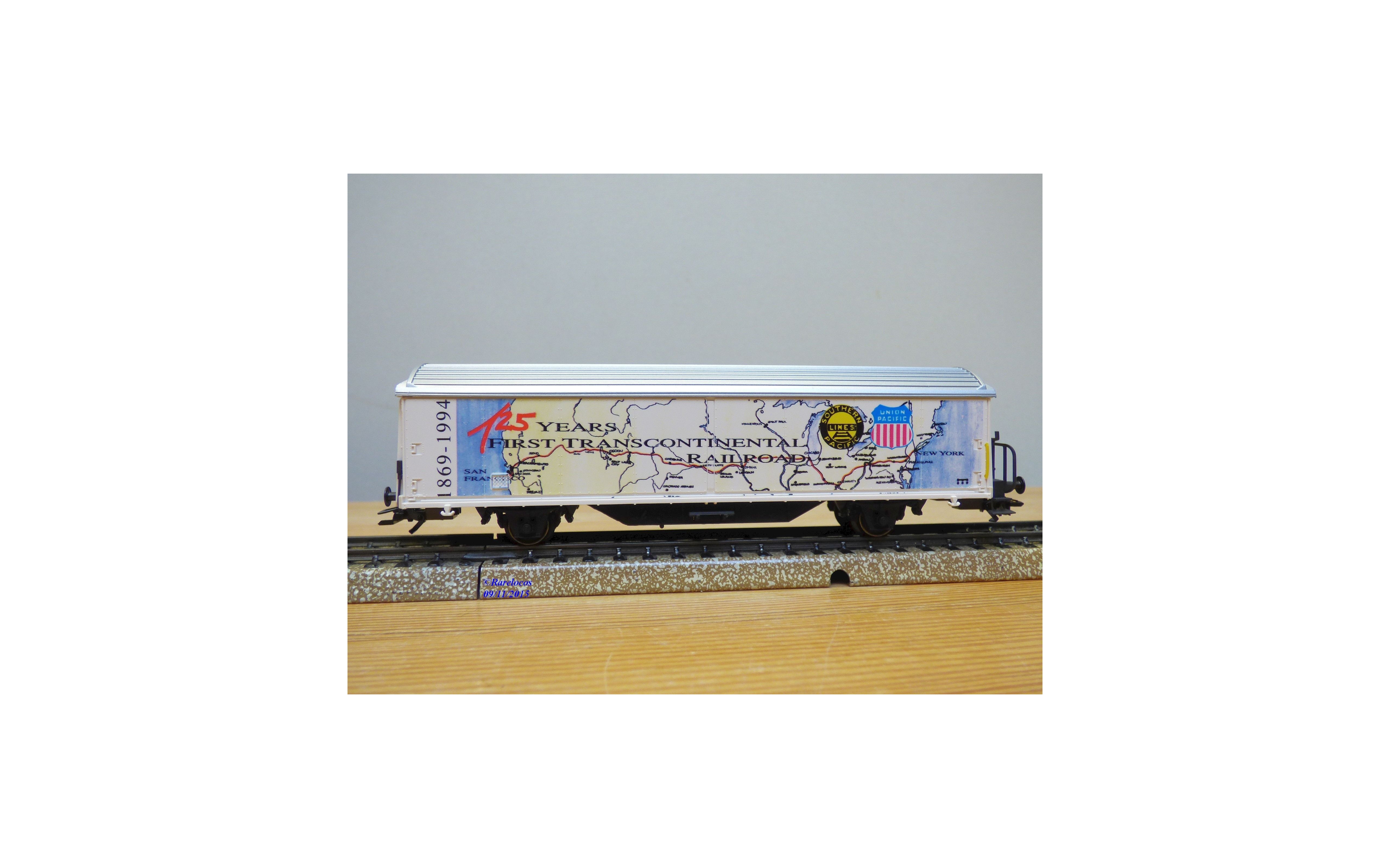 Wagon couvert à 2 essieux type Hbis, décoré sur les flancs de caisse d' une carte du réseau américain New York San Francisco , marquages 125 YEARS FIRST TRANSCONTINENTAL RAILROAD, sigle Southern Pacific Lines, boîte d'origine en état neuf.