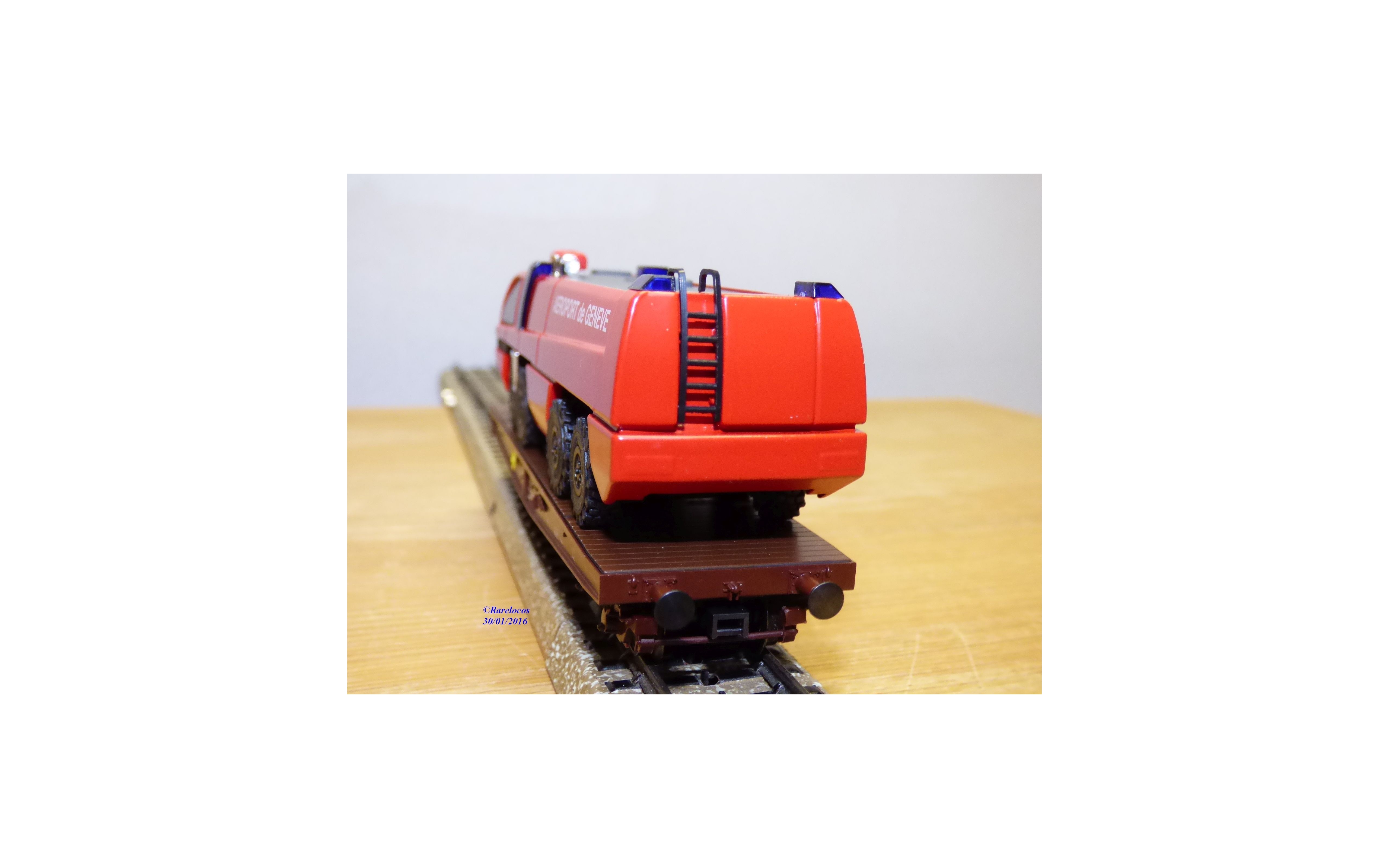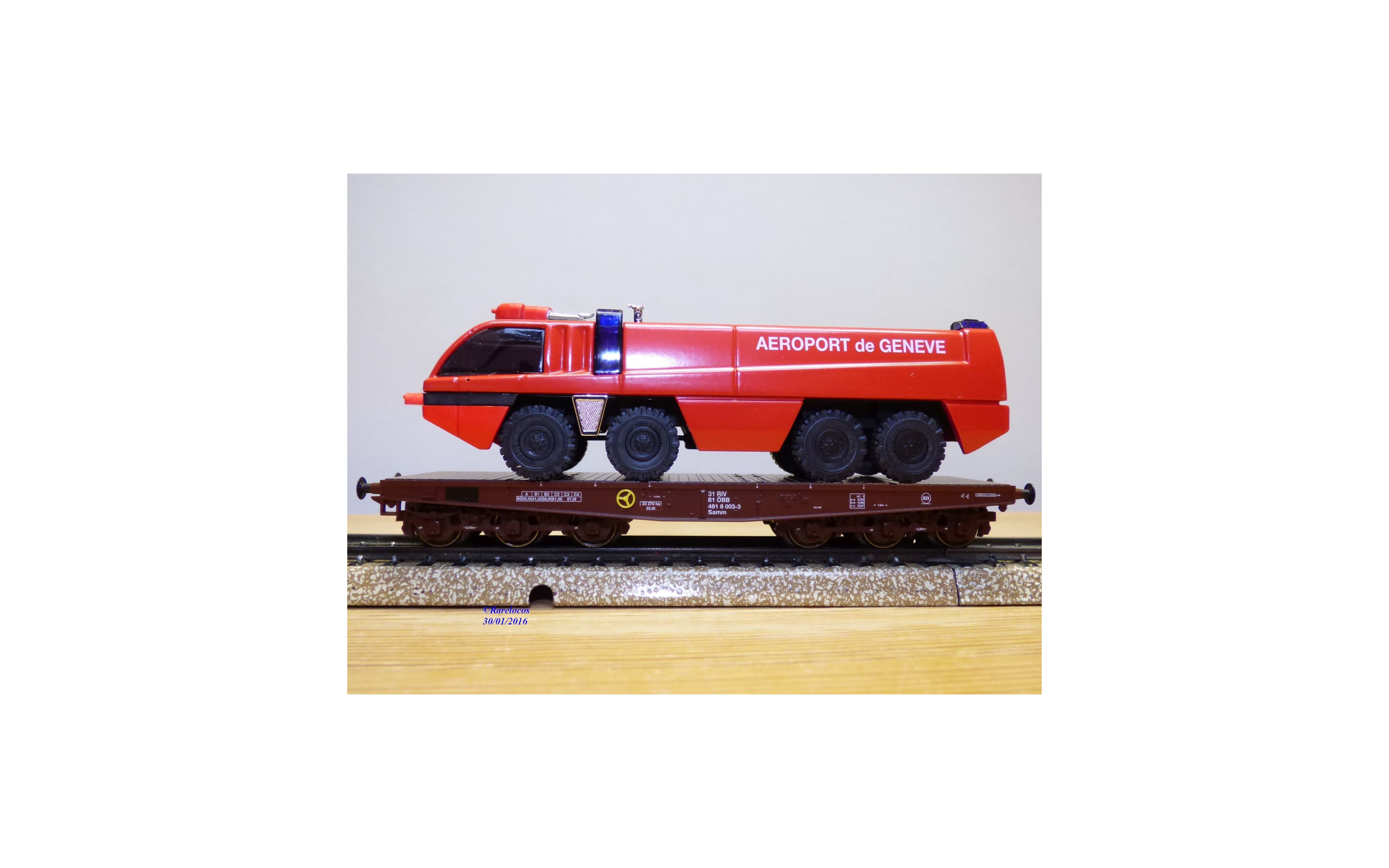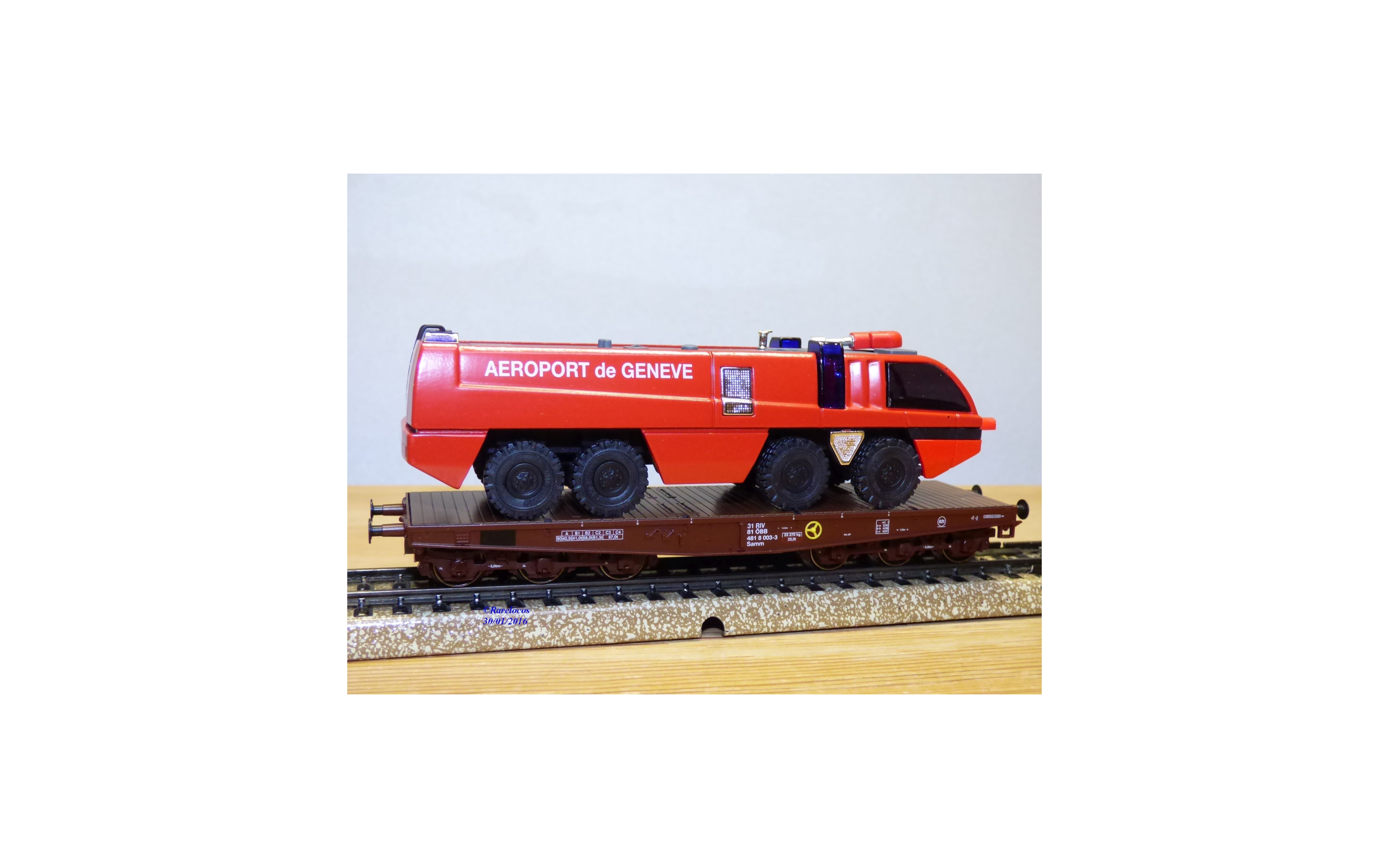 Wagon plat à ranchers pour charges lourdes à 2 bogies de 3 essieux type Samm des chemins de fer autrichiens (ÖBB), wagon en métal, chargement d' un camion de pompiers ( Cursor ) aux couleurs de l' aéroport de Genève, attelages et pièces de détaillage encore scellés, notice présente, boîte d'origine en état neuf.