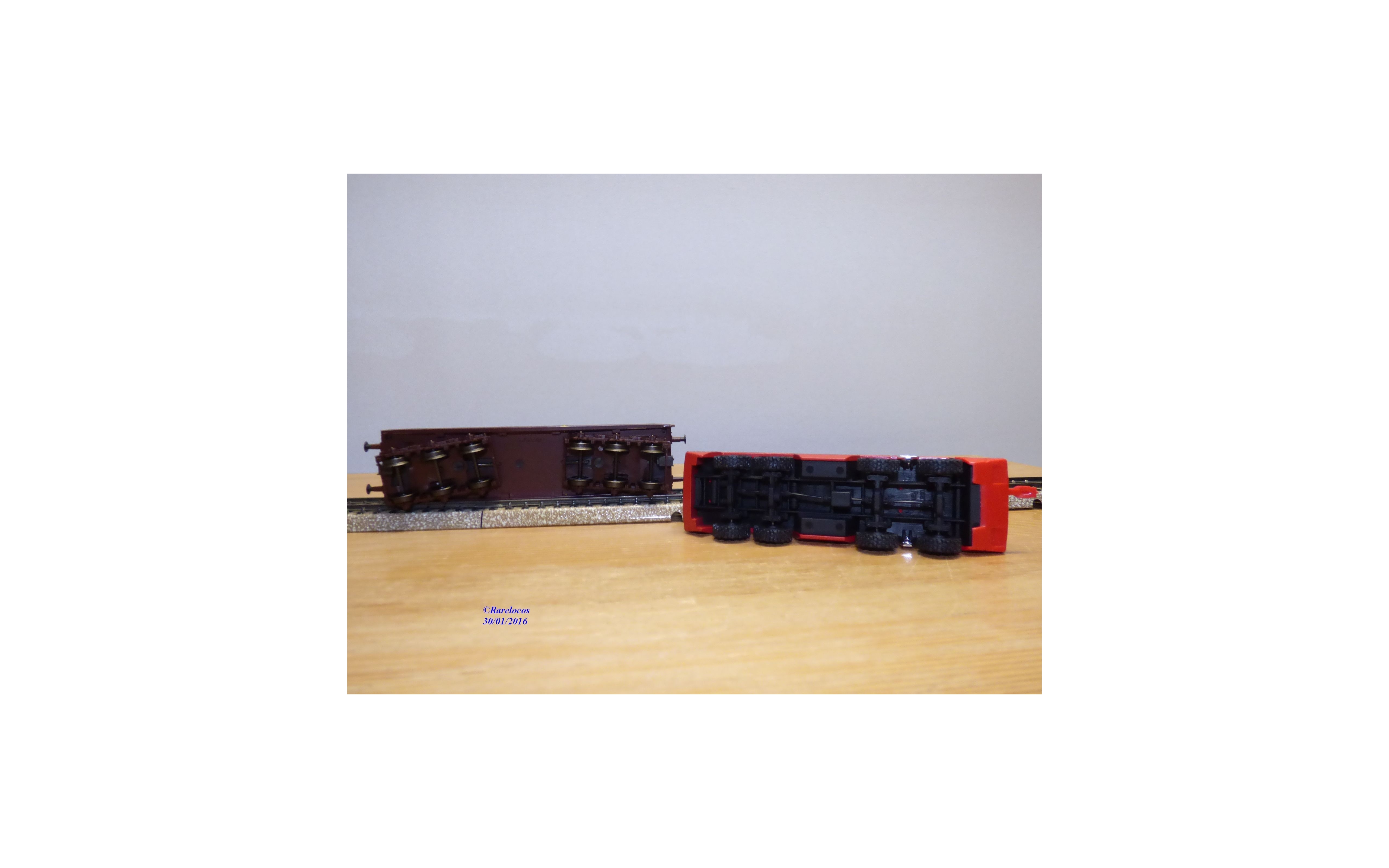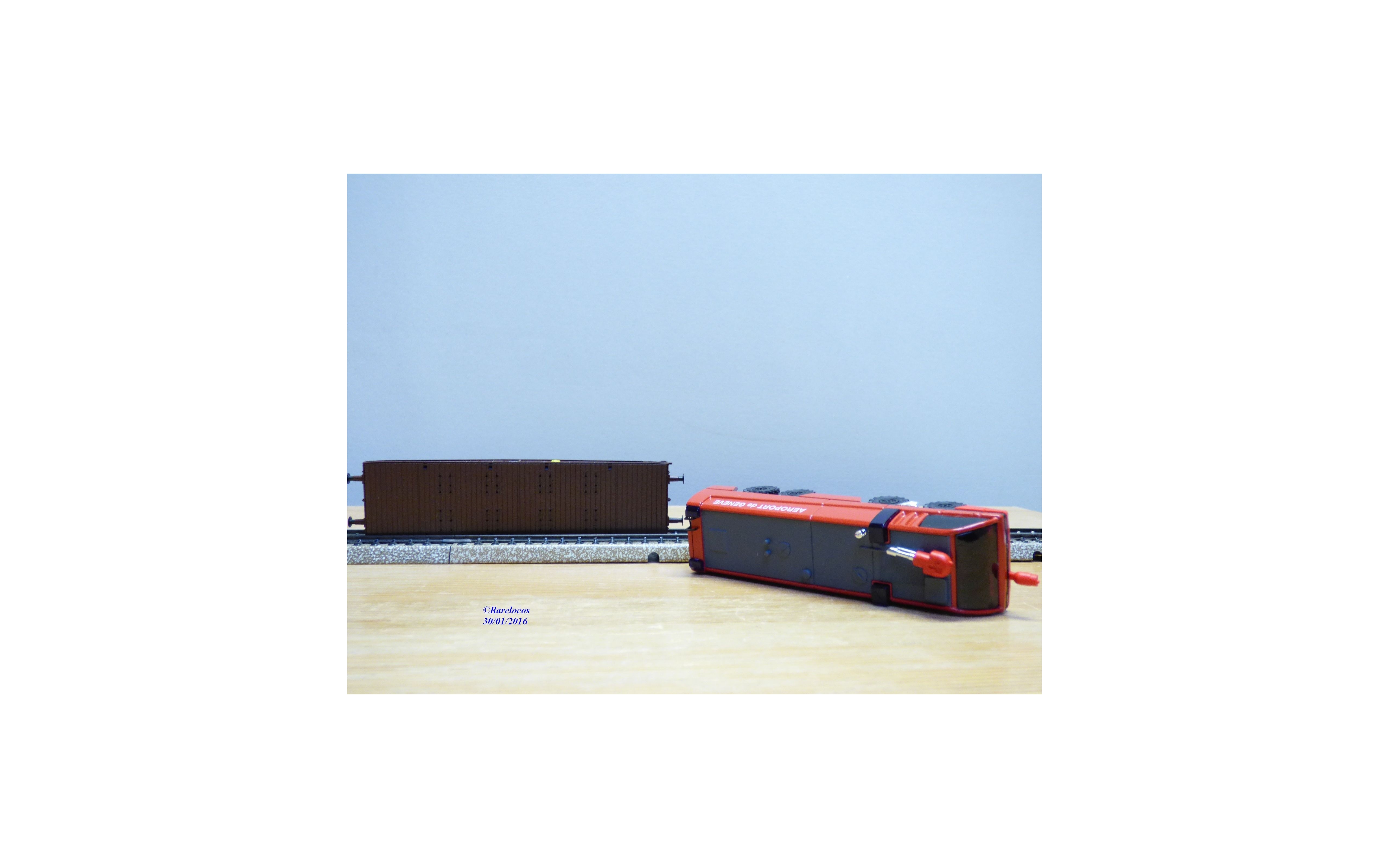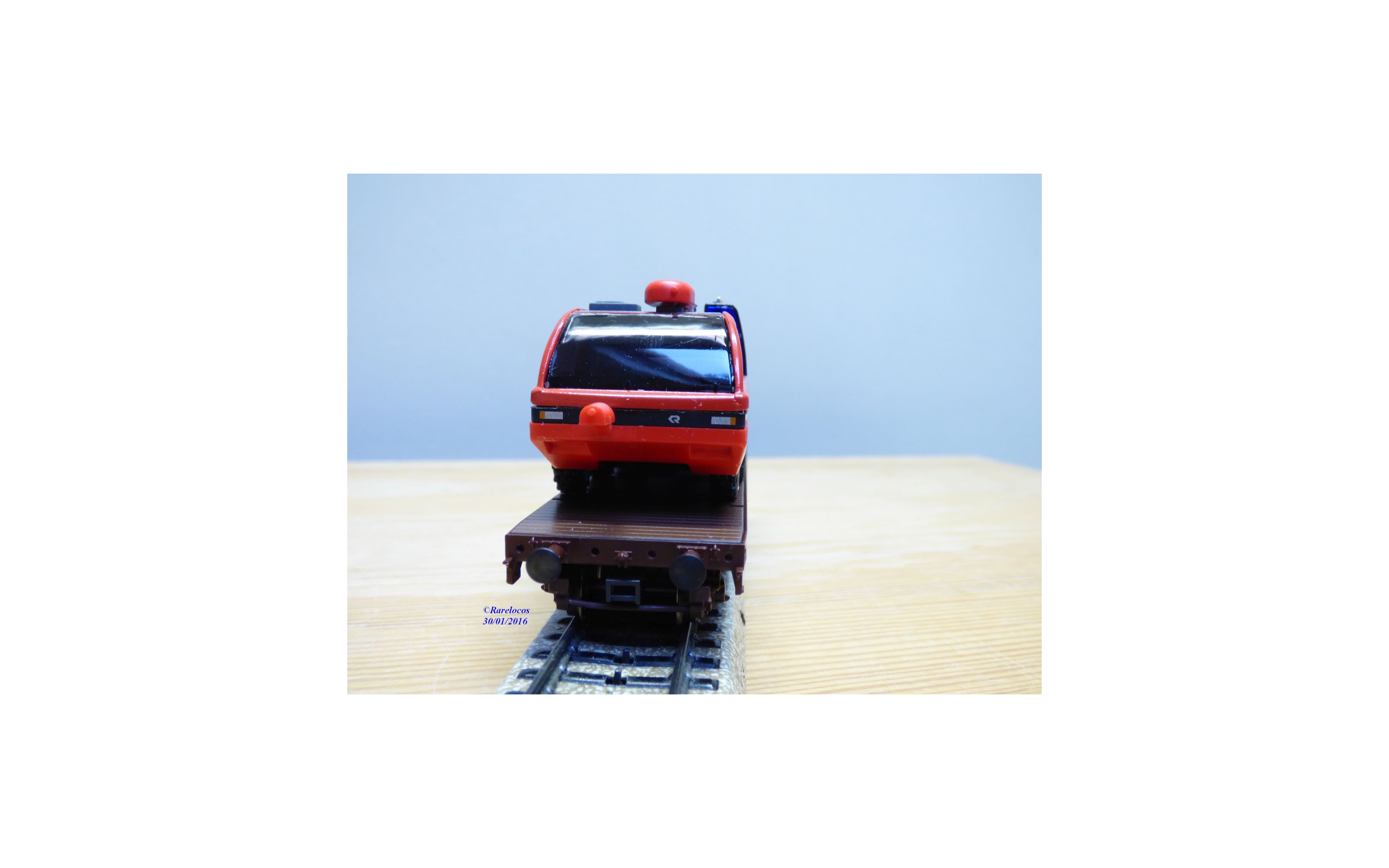 Wagon plat à ranchers pour charges lourdes à 2 bogies de 3 essieux type Samm des chemins de fer autrichiens (ÖBB), wagon en métal, chargement d' un camion de pompiers ( Cursor ) aux couleurs de l' aéroport de Genève, attelages et pièces de détaillage encore scellés, notice présente, boîte d'origine en état neuf.