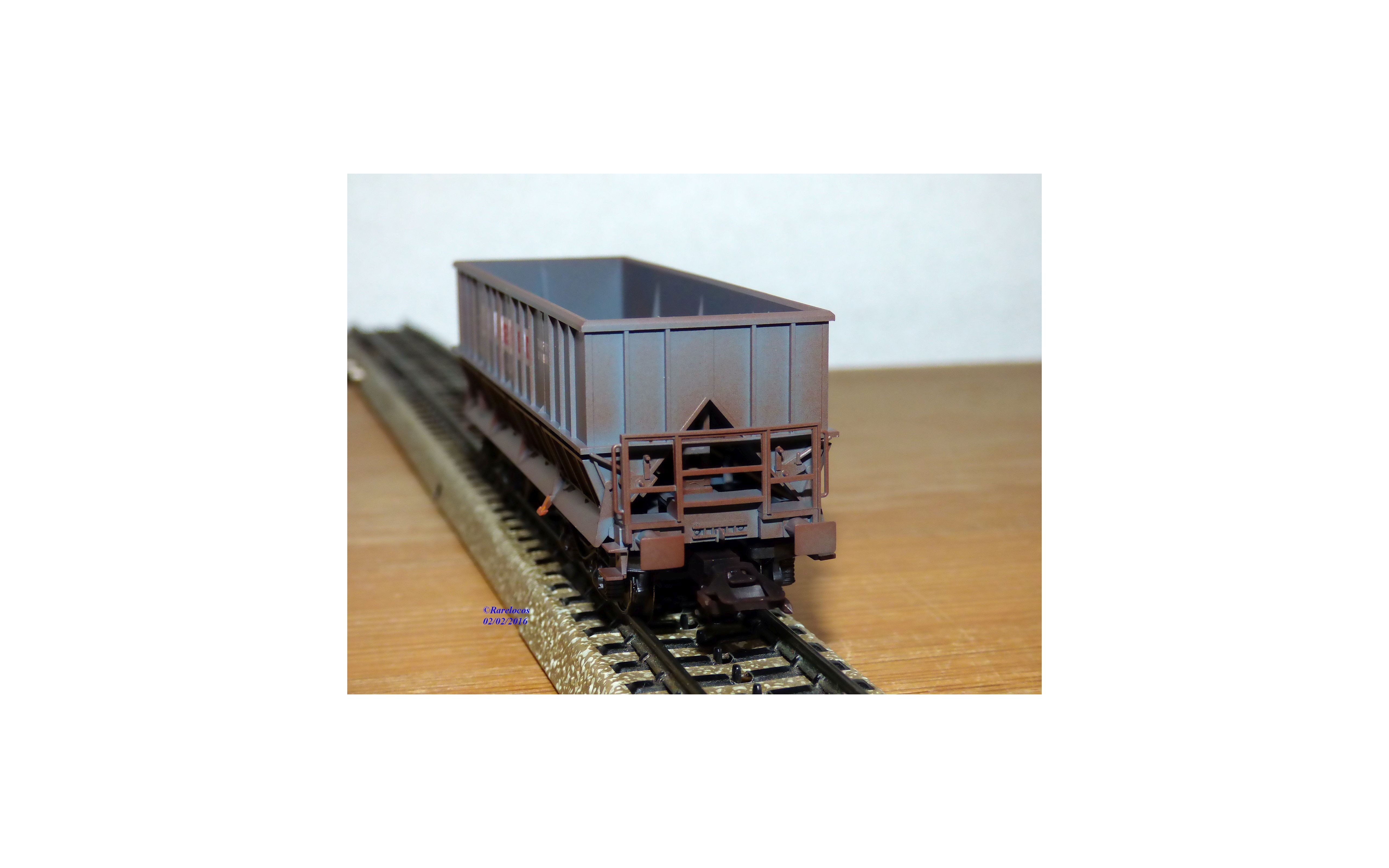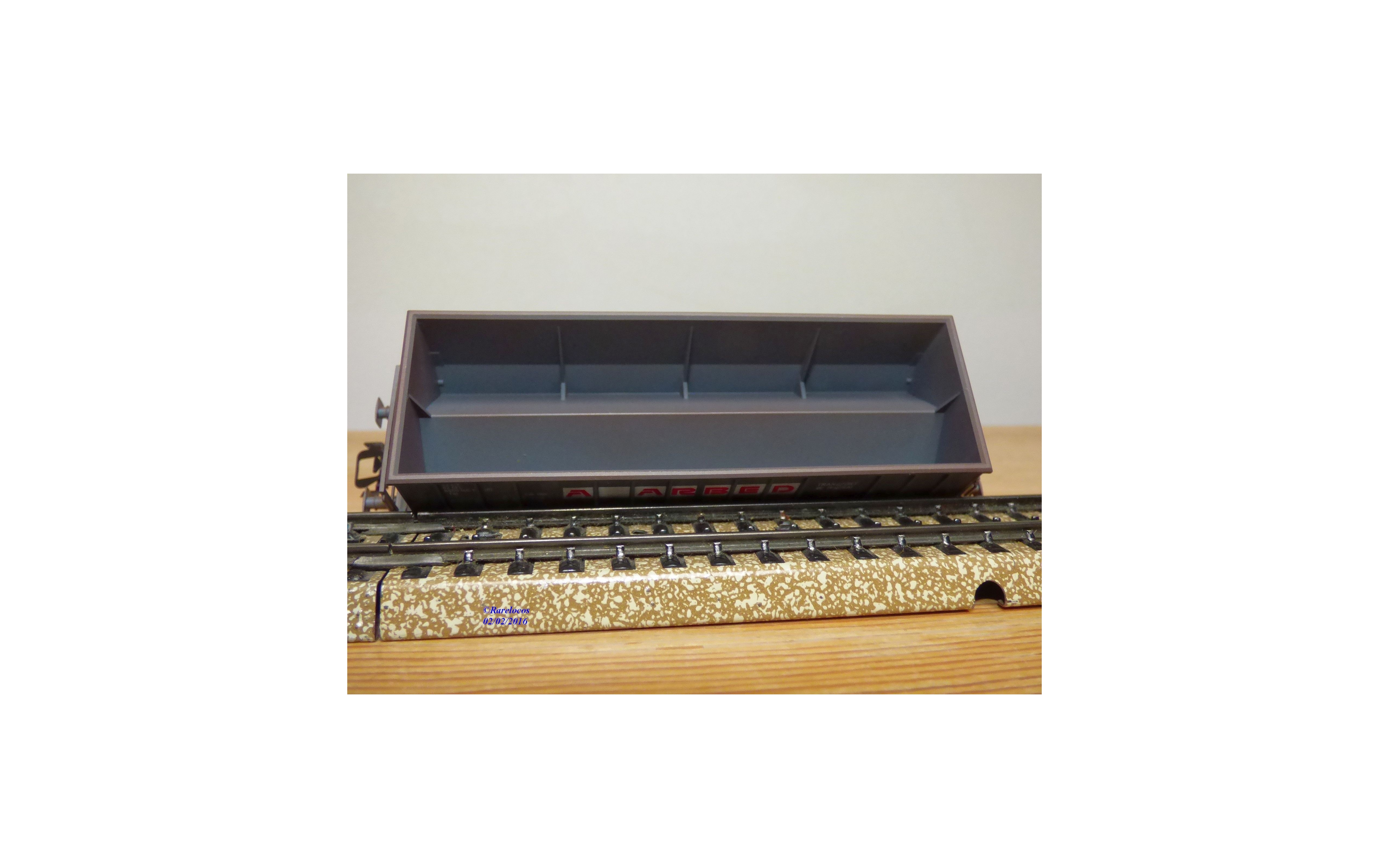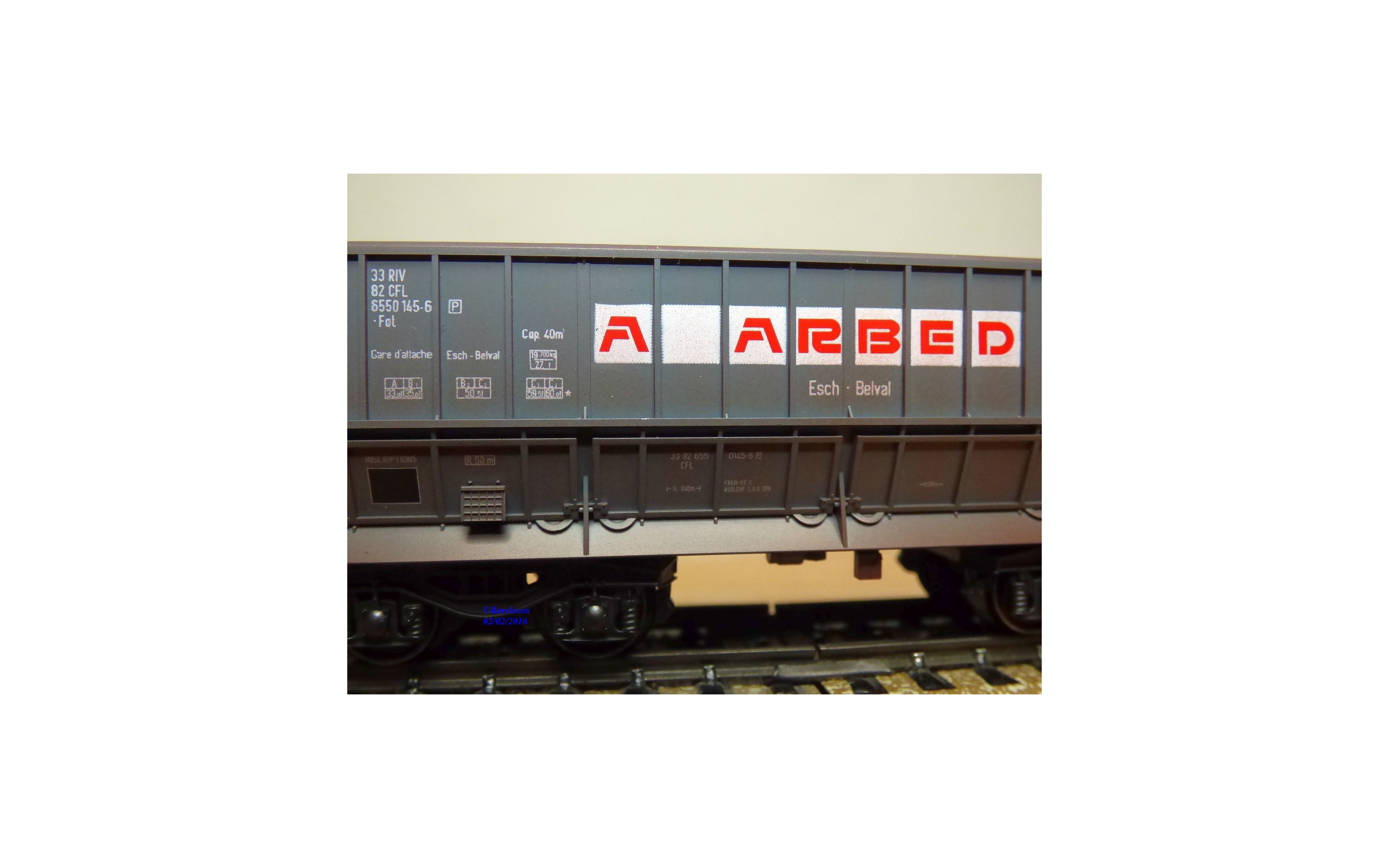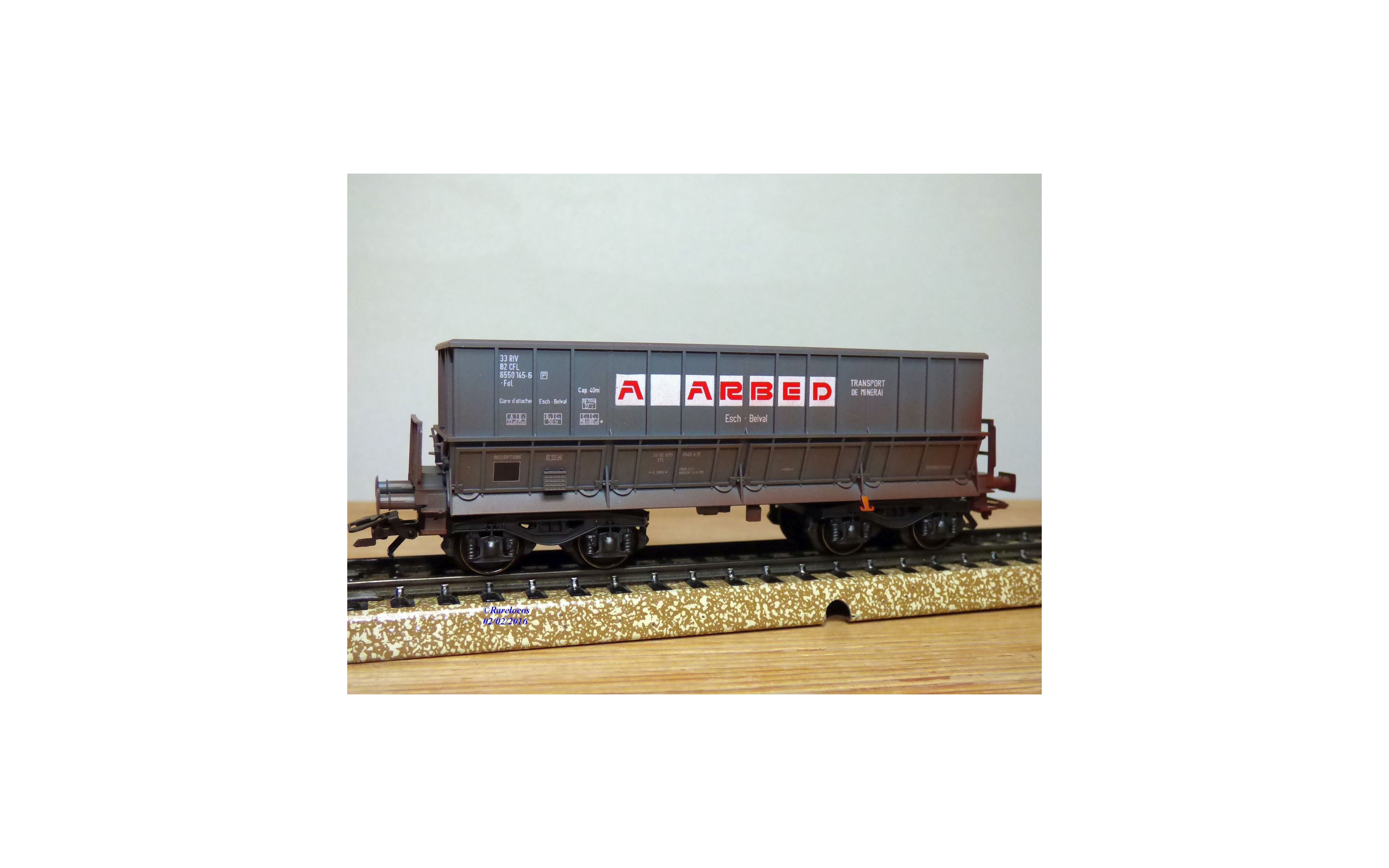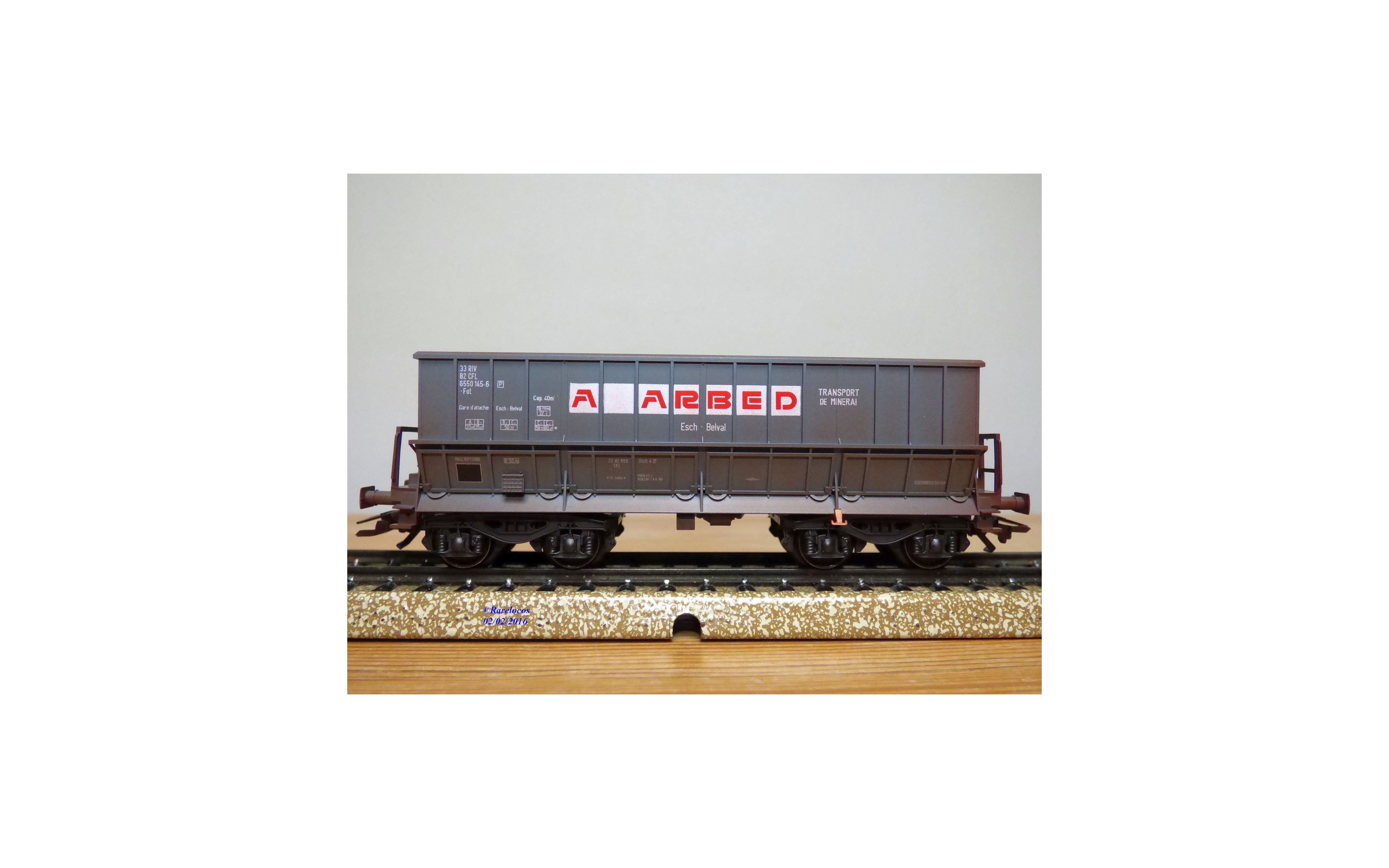 Wagon trémie à déchargement latéral pour transport de minerai type Fal des chemins de fer luxembourgeois ( CFL ), livrée grise patinée avec marquages A ARBED, immatriculation : 33 82 8550 145-6, boîte d'origine en état neuf.