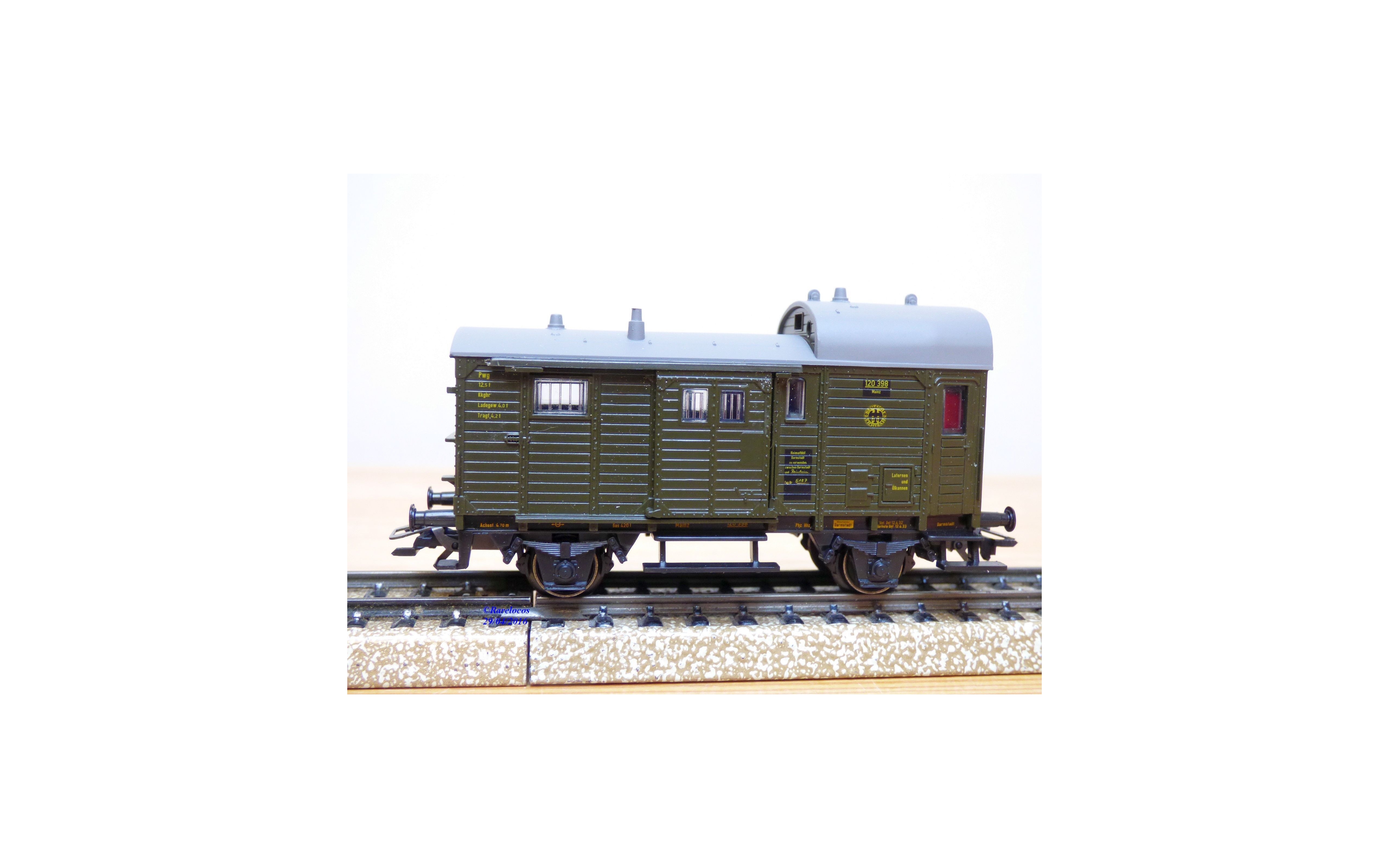 Fourgon à bagages pour train de marchandises à 2 essieux type Pr 14 des chemins de fer allemands ( DRG ), livrée vert olive à toit gris, portes coulissantes fonctionnelles, attelages à élongation, immatriculation : 120 398 du dépôt de Mainz, pas de boîte d'origine car provient du coffret # 2995.