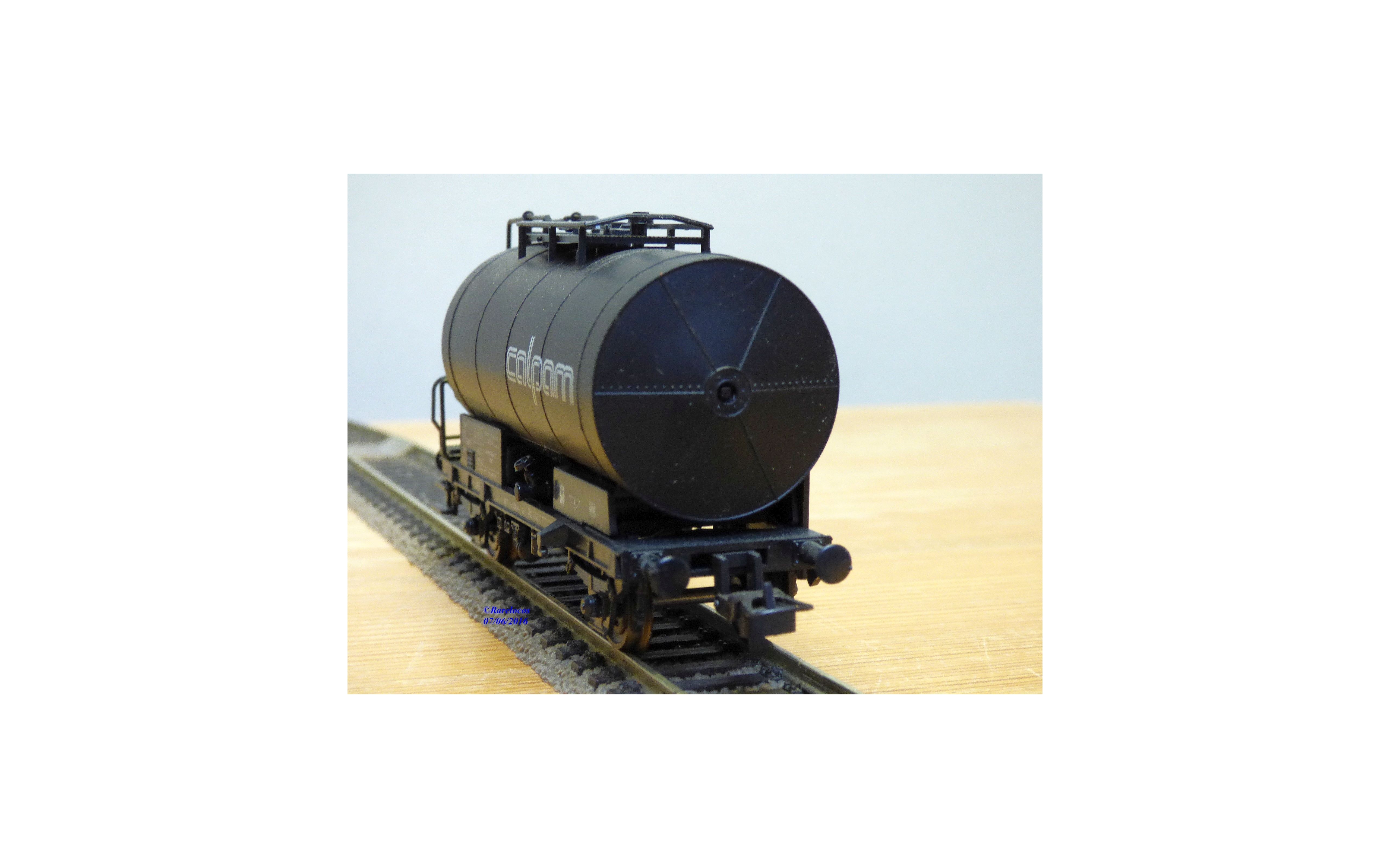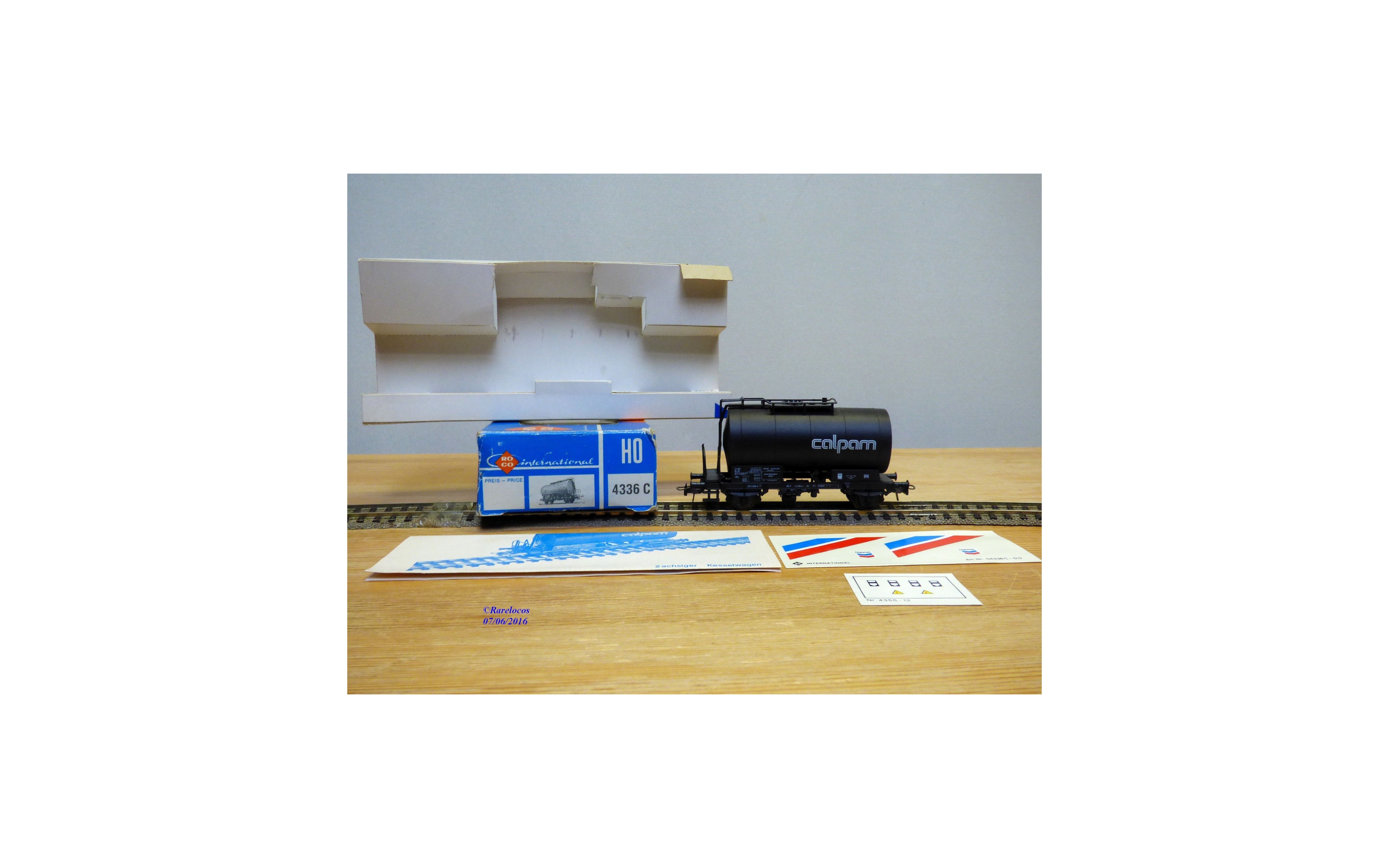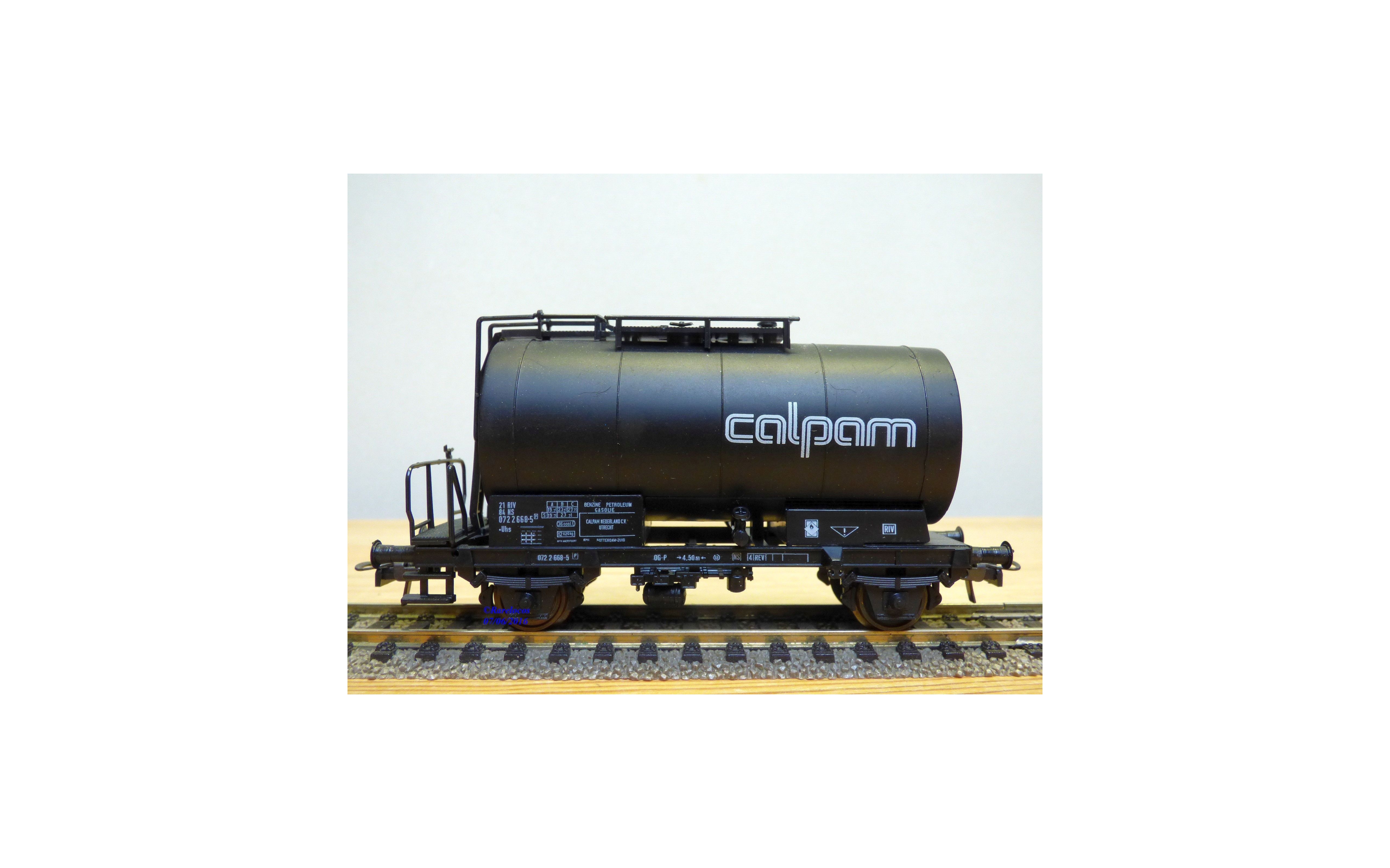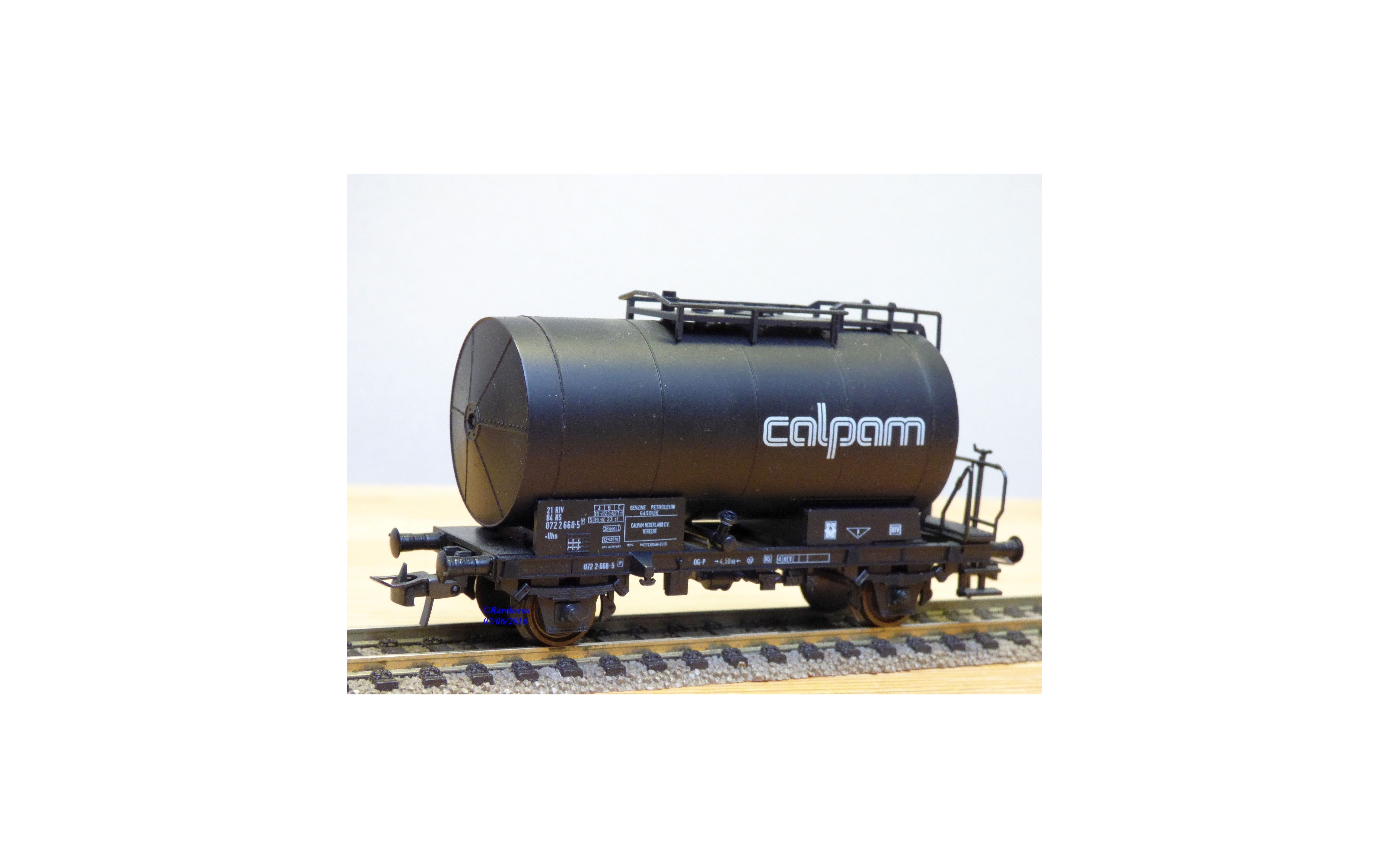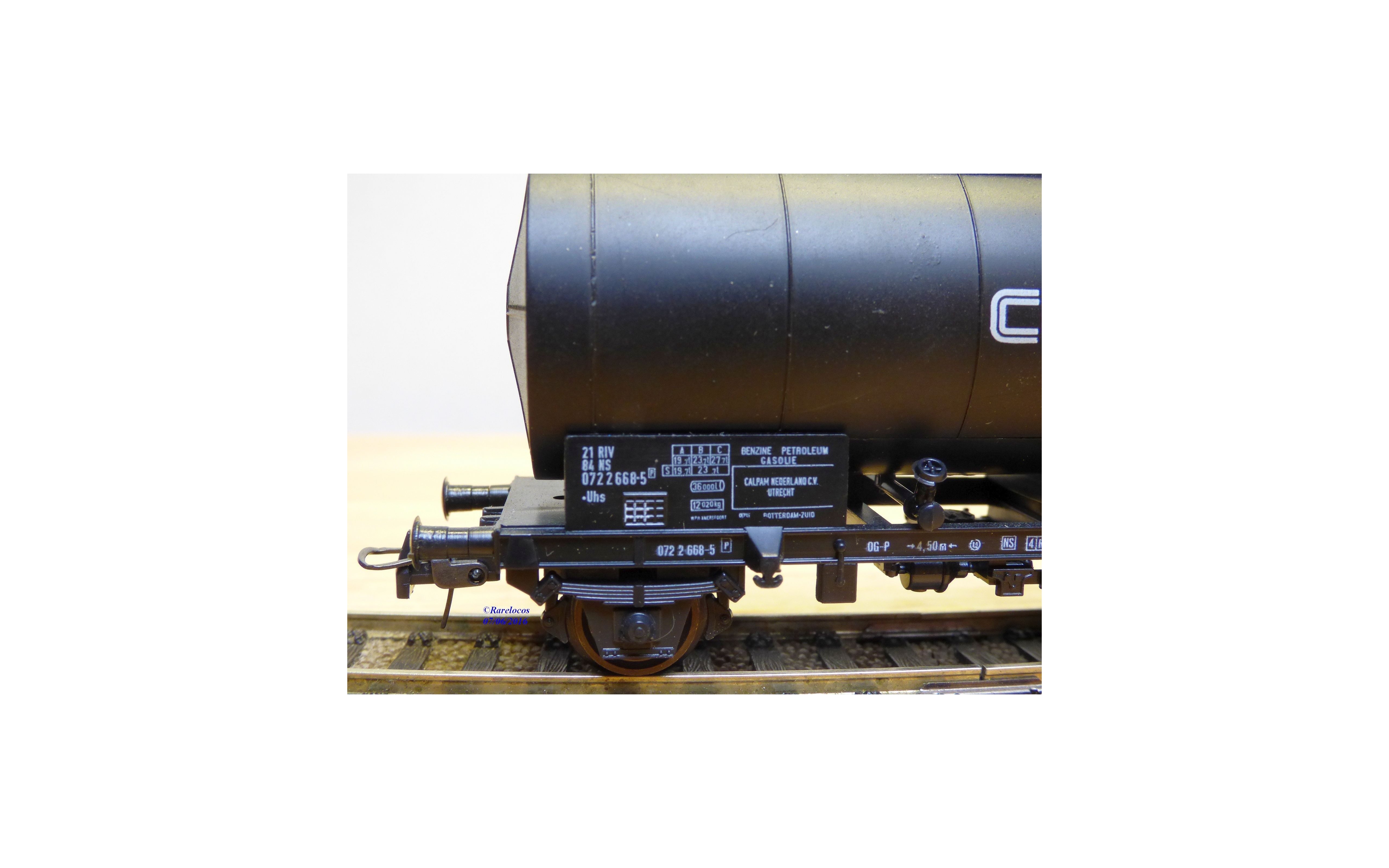 Wagon citerne à plate forme de serre freins à 2 essieux type Uhs des chemins de fer hollandais ( NS ), livrée noir mat avec logo et marquages CALPAM, attelages à élongation, notice et décalcomanies CHEVRON présentes, boîte d'origine en excellent état .