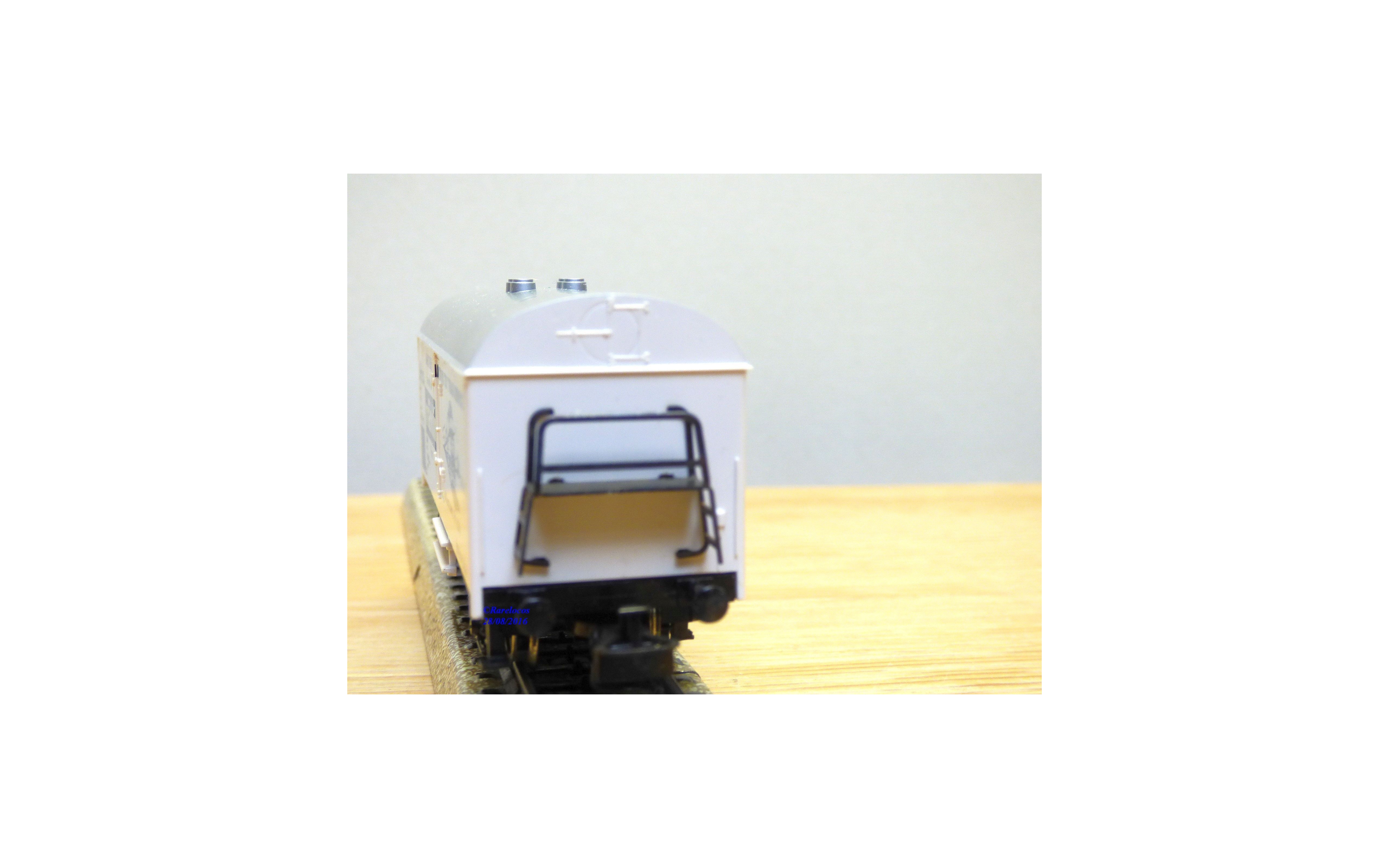 Wagon couvert réfrigérant à 2 essieux , livrée blanche à toit gris argent , silhouette de loco diesel et marquages Allentown Toy Train Service sur les flancs de caisse, boîte d'origine " coins piquants " .