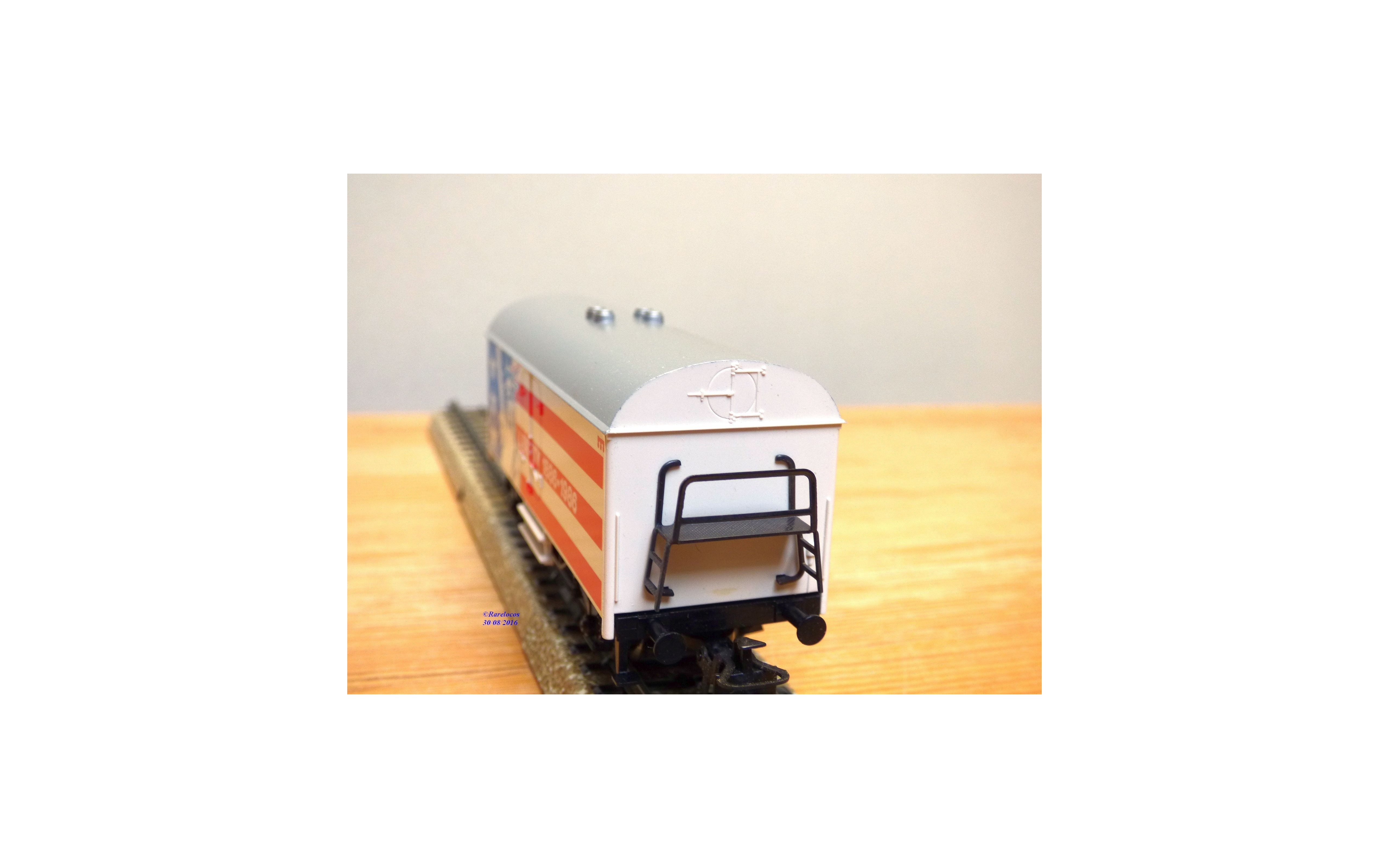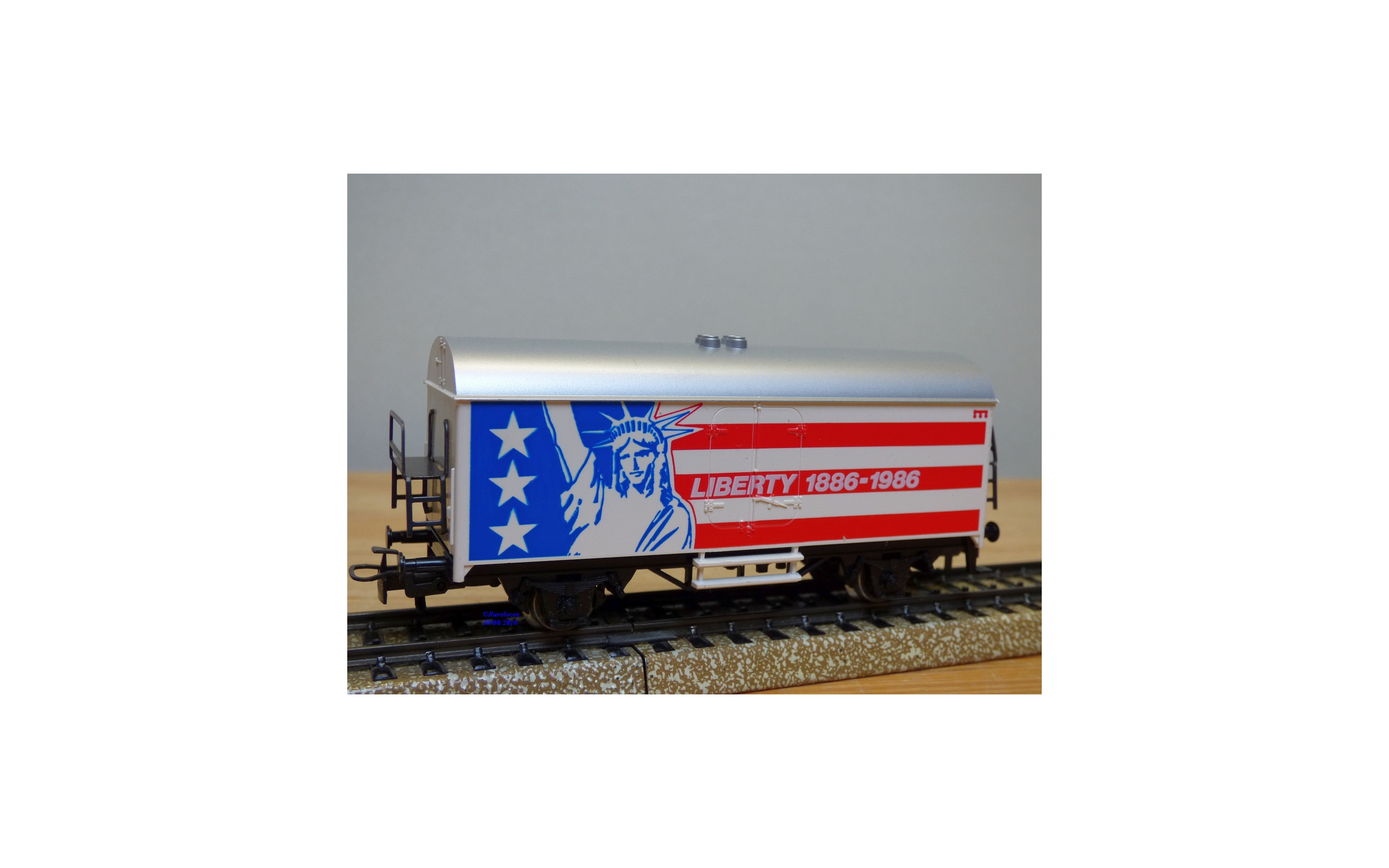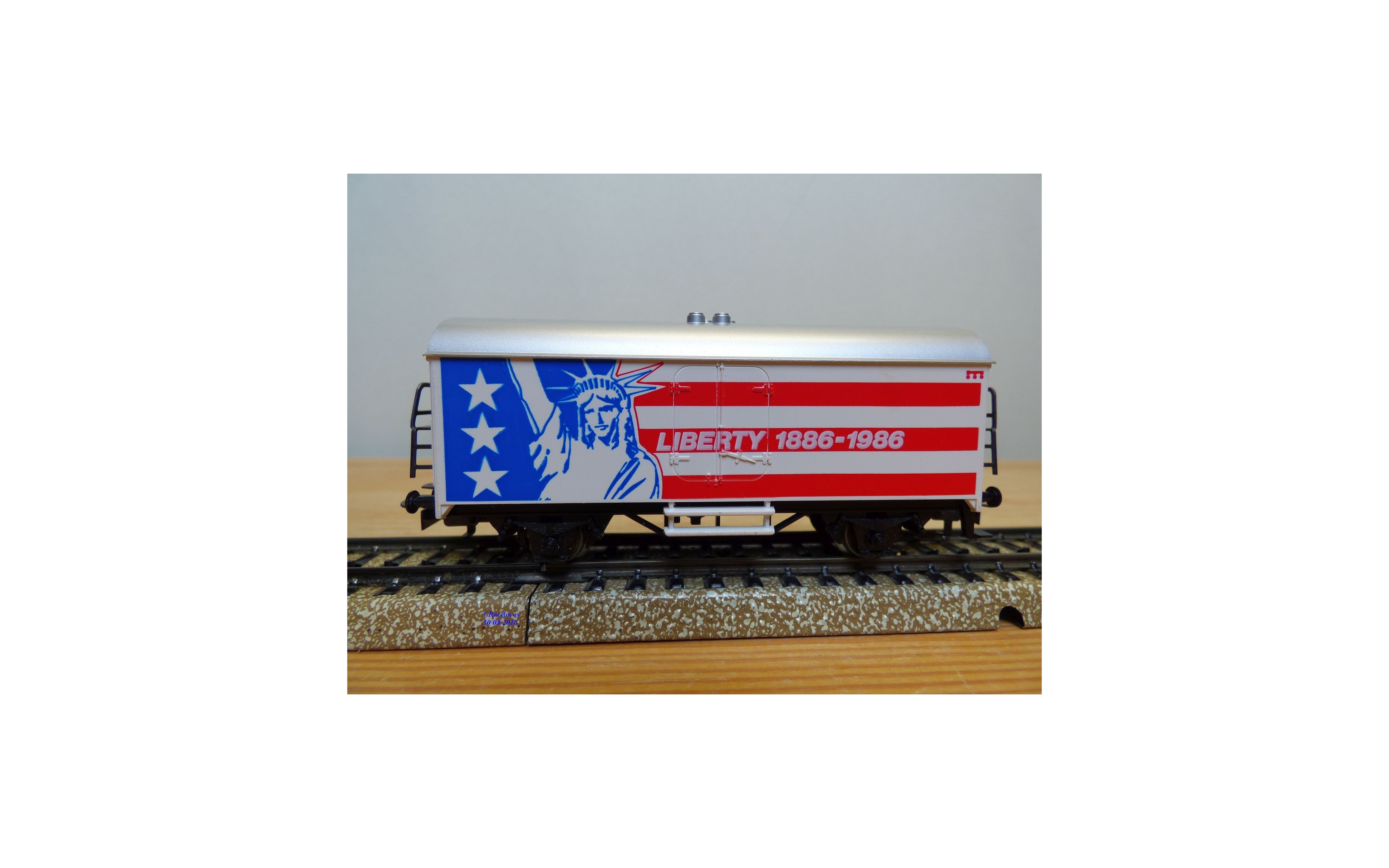 Wagon couvert réfrigérant à 2 essieux , livrée blanche, rouge et bleue à toit gris argent , silhouette de la statue de la Liberté et marquages LIBERTY 1886 - 1986 sur les flancs de caisse, boîte d'origine " coins piquants " .