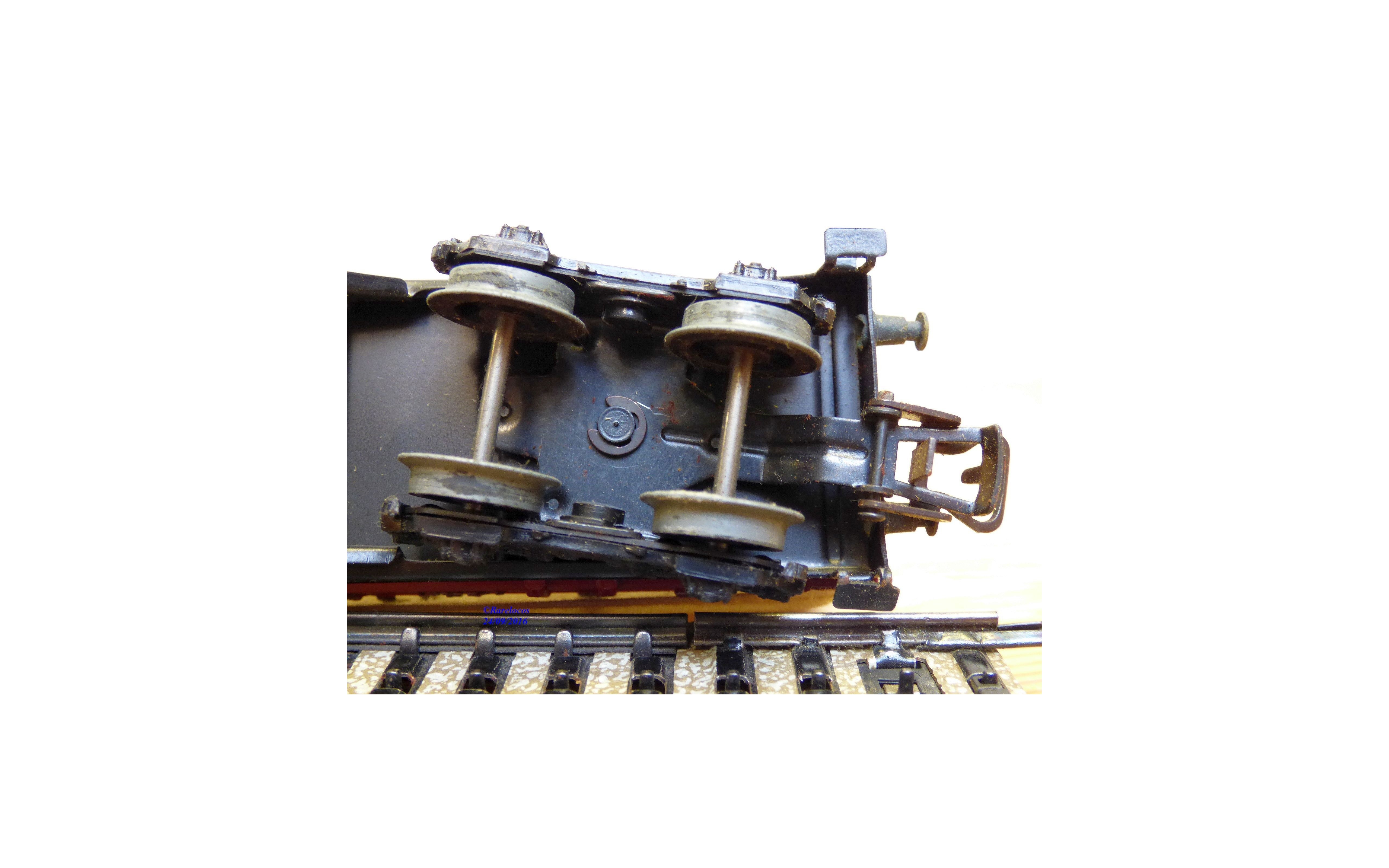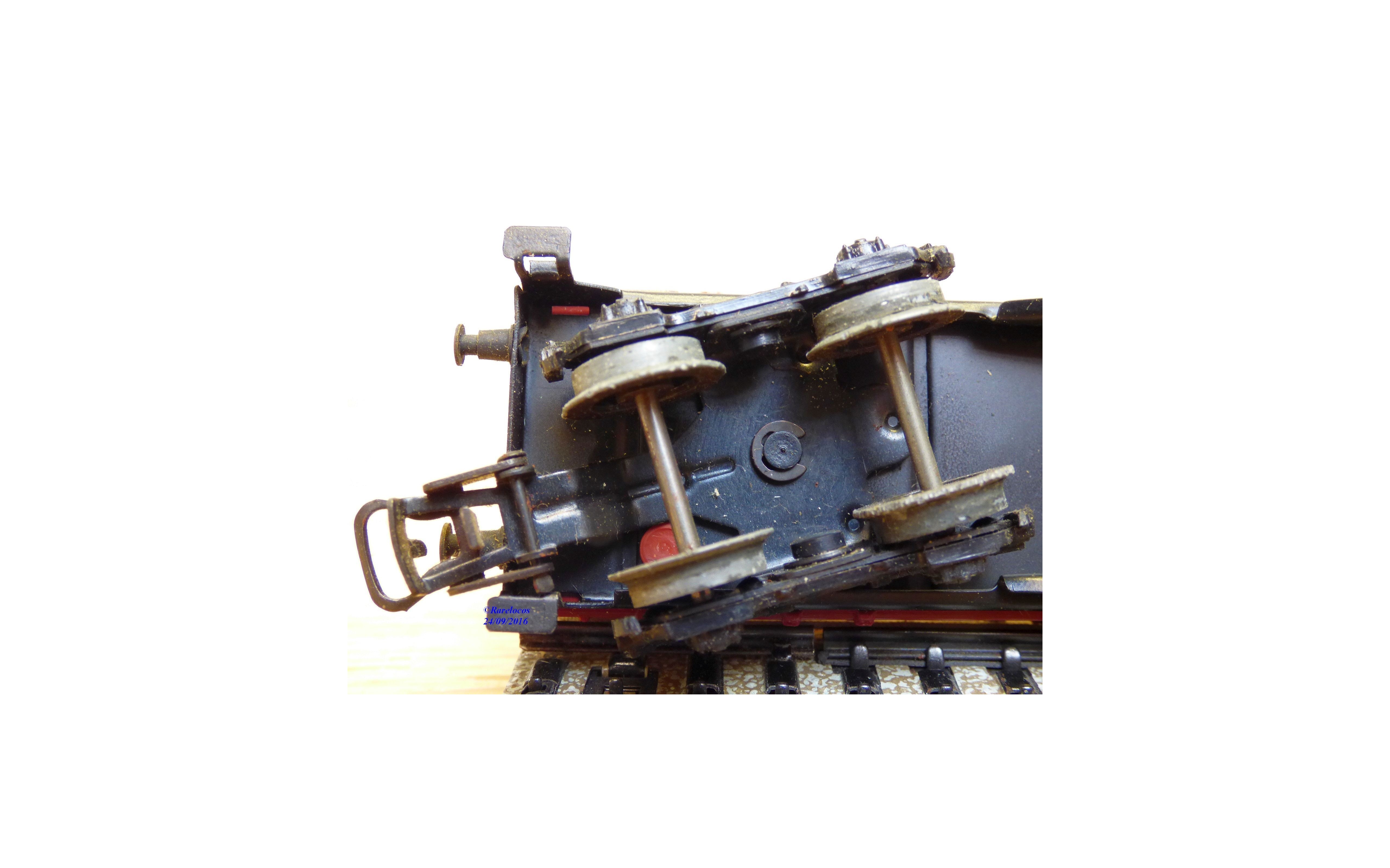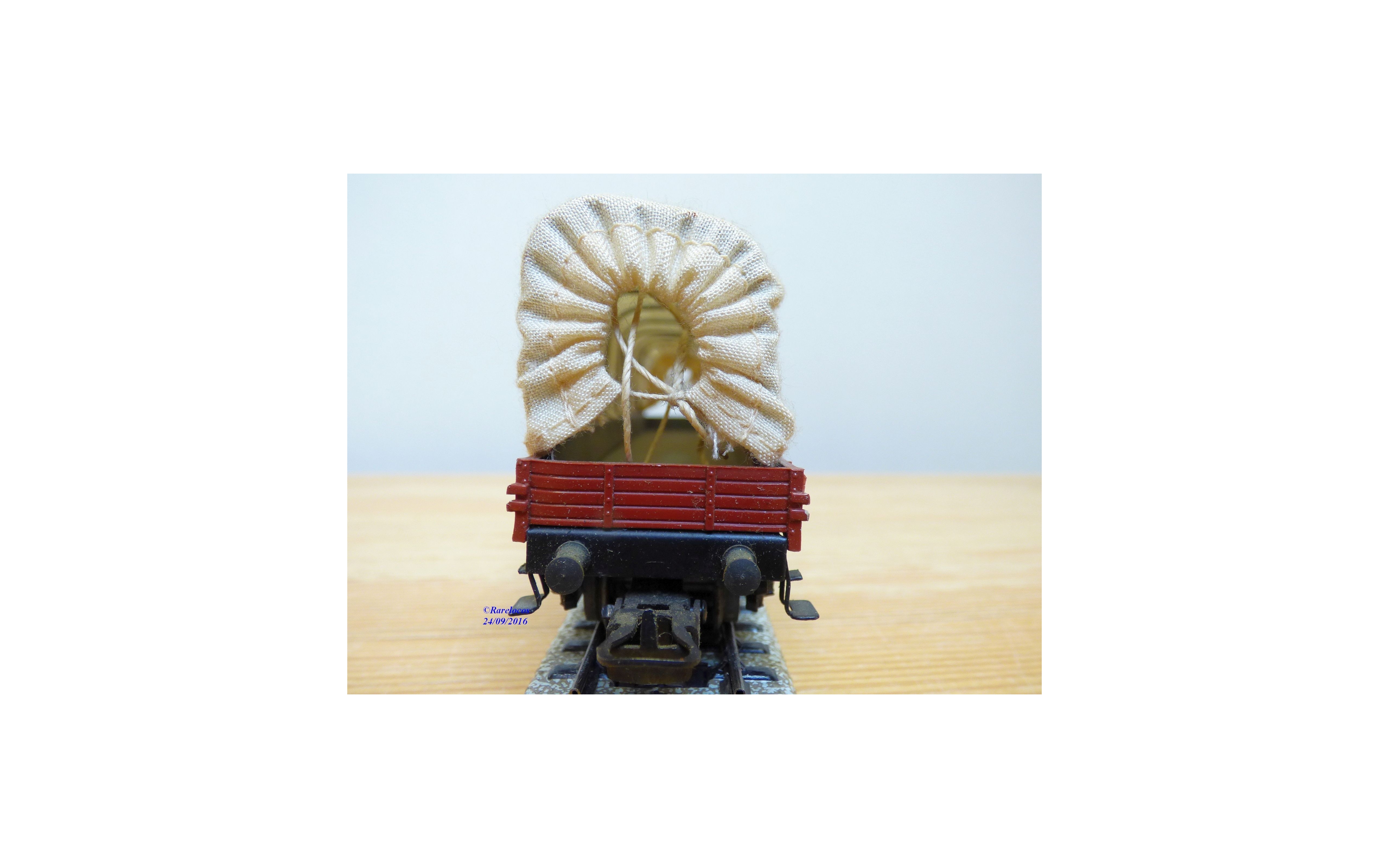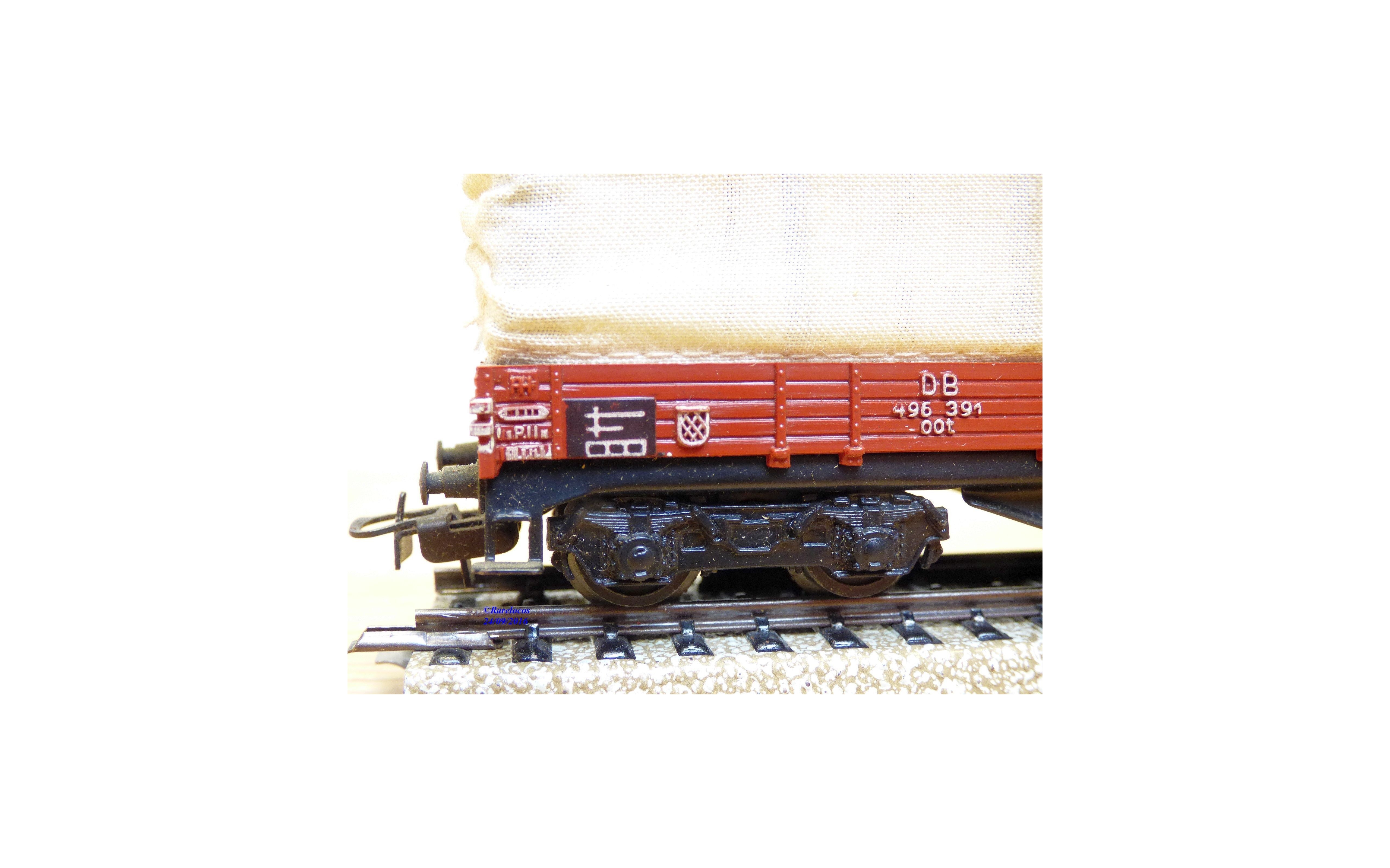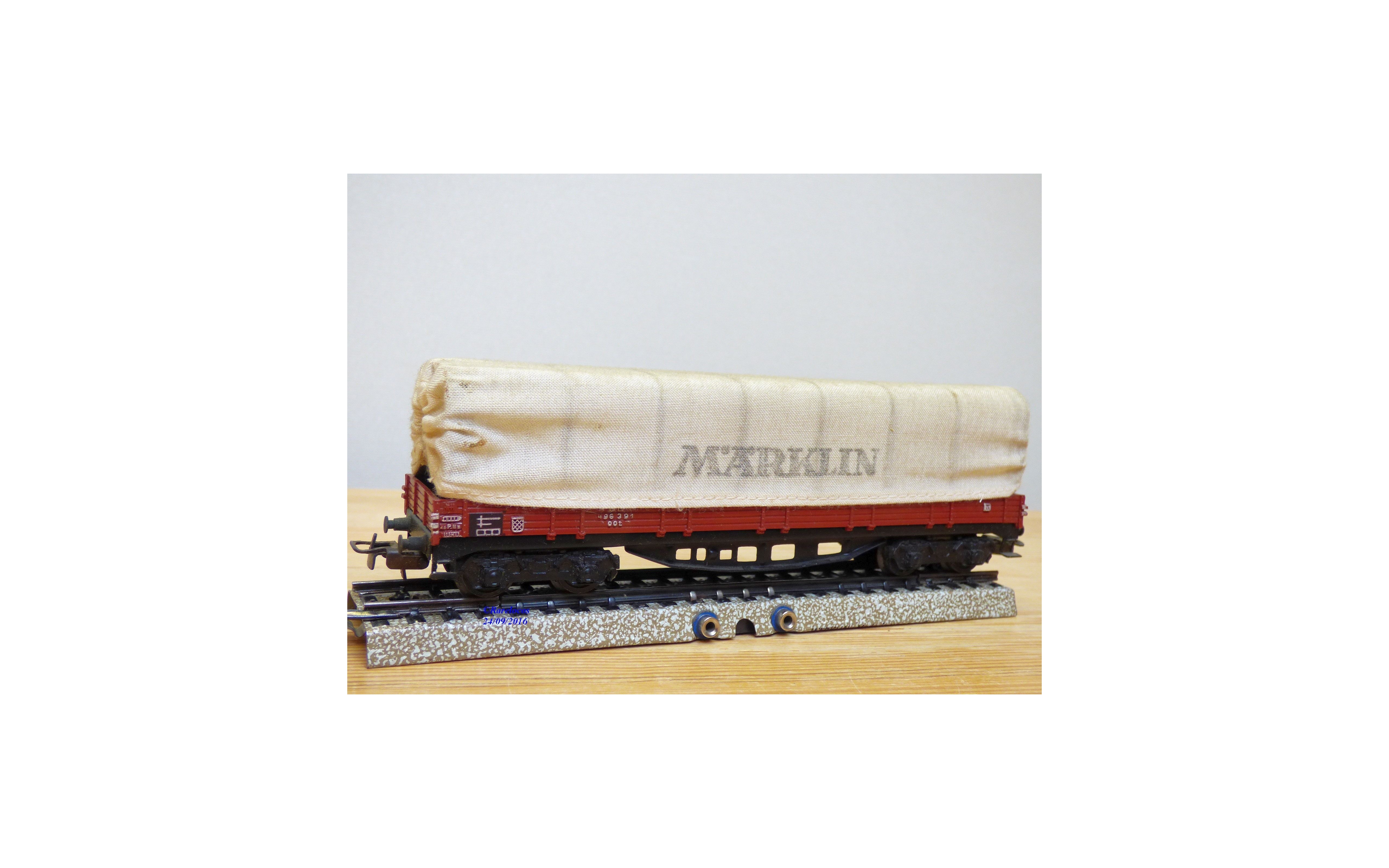Wagon plat bâché à 2 bogies des chemins de fer allemands ( DB ), tout en métal et toile, bâche marquée Märklin posée sur des arceaux métalliques ( un peu déformés ), boîte d'origine en très bon état .